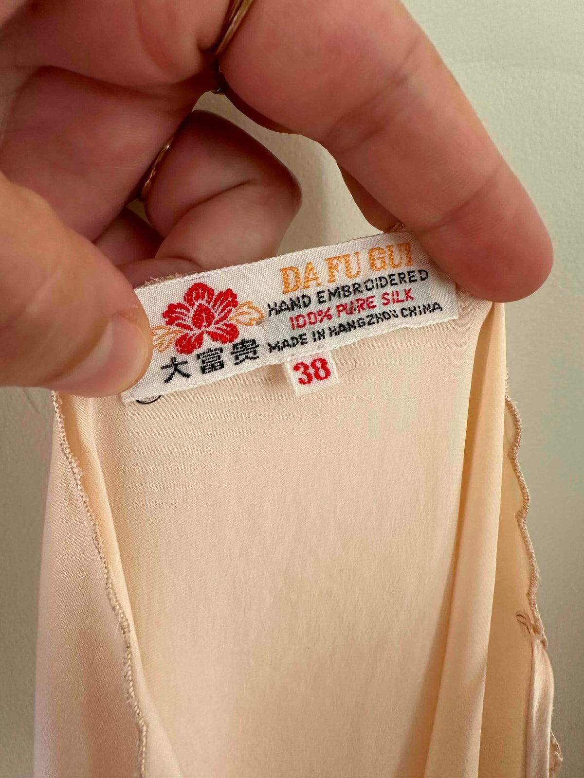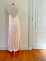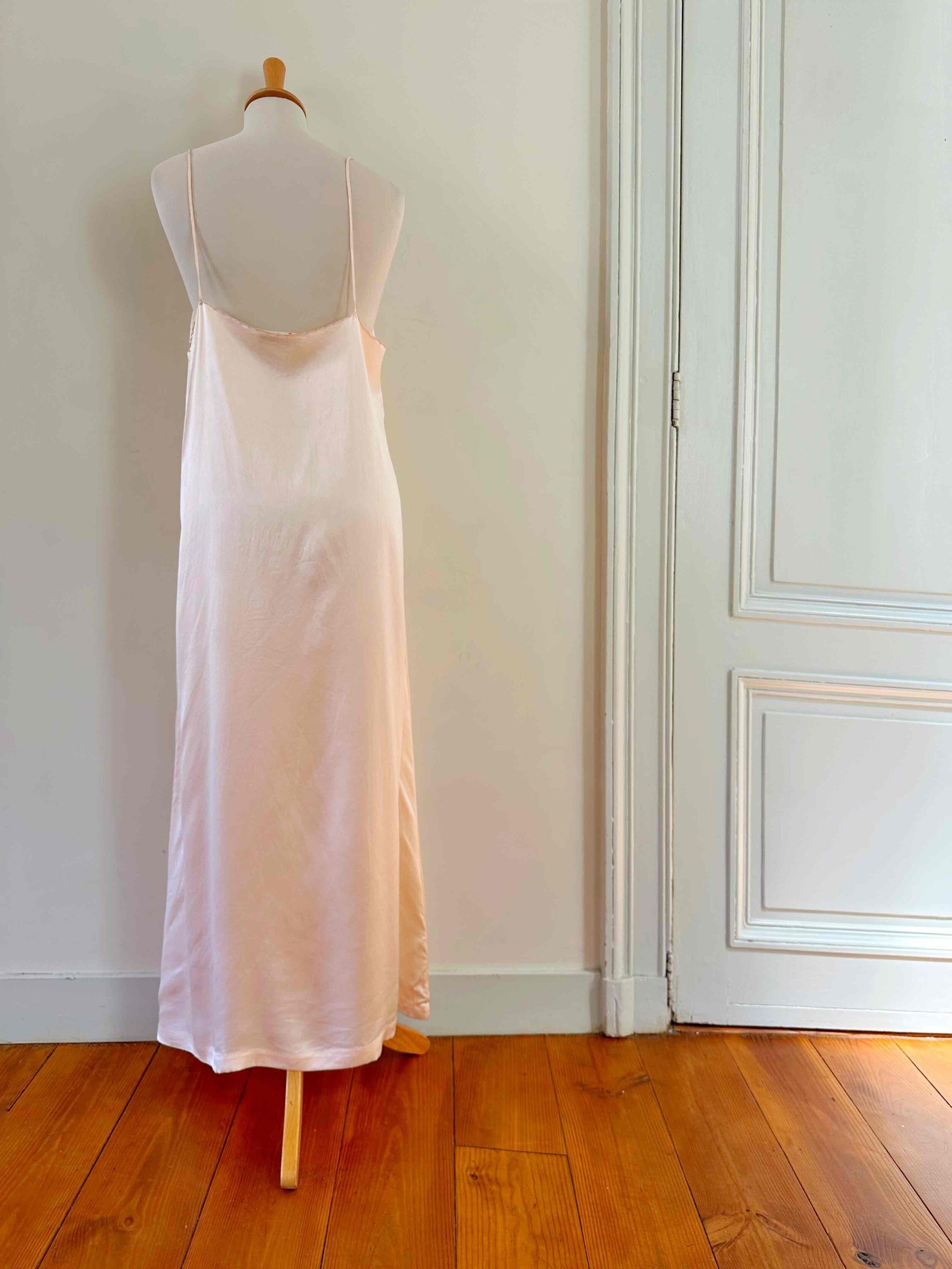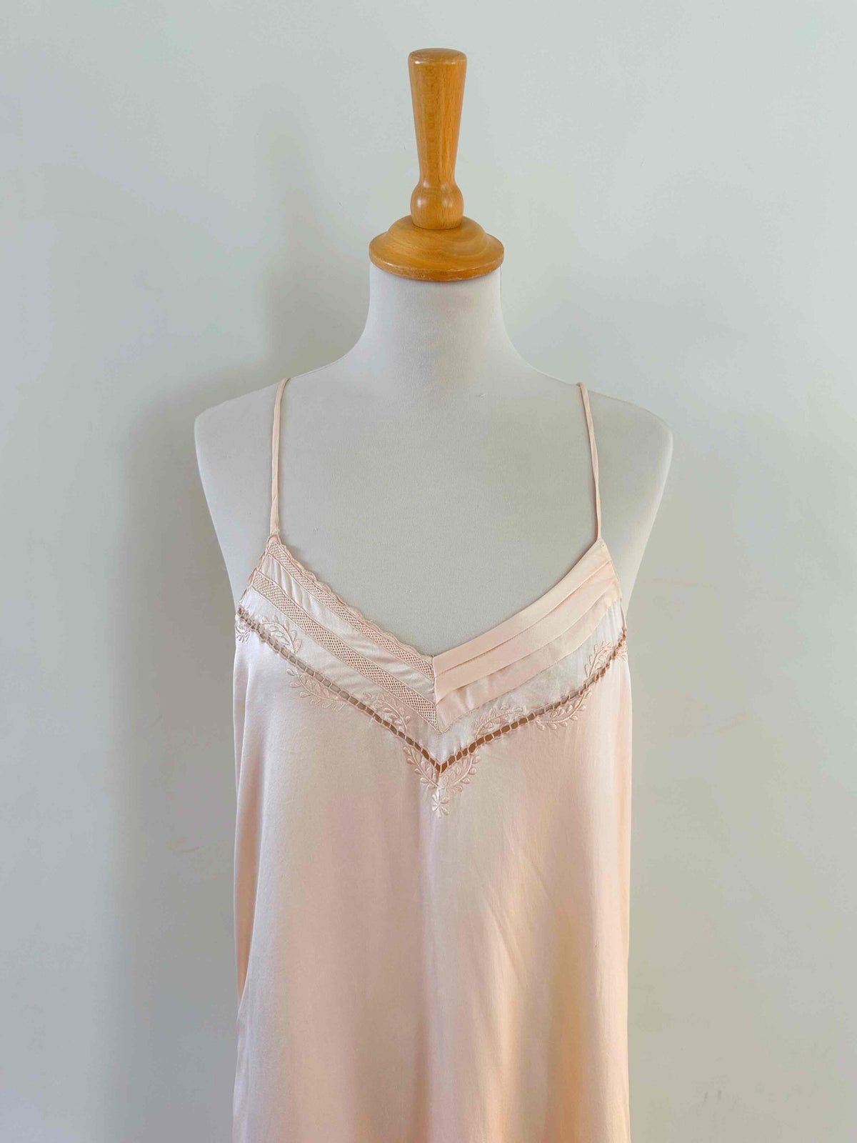 Robe nuisette en satin de soie rose peche, bretelles spaghettis, emmanchures échancrées, encolure brodée et ajourées de fleurs, bords festonnés, années 80s, convient aux tailles 36 porté ample et 38 portée ici sur un mannequin T36, aisselles 45cm.