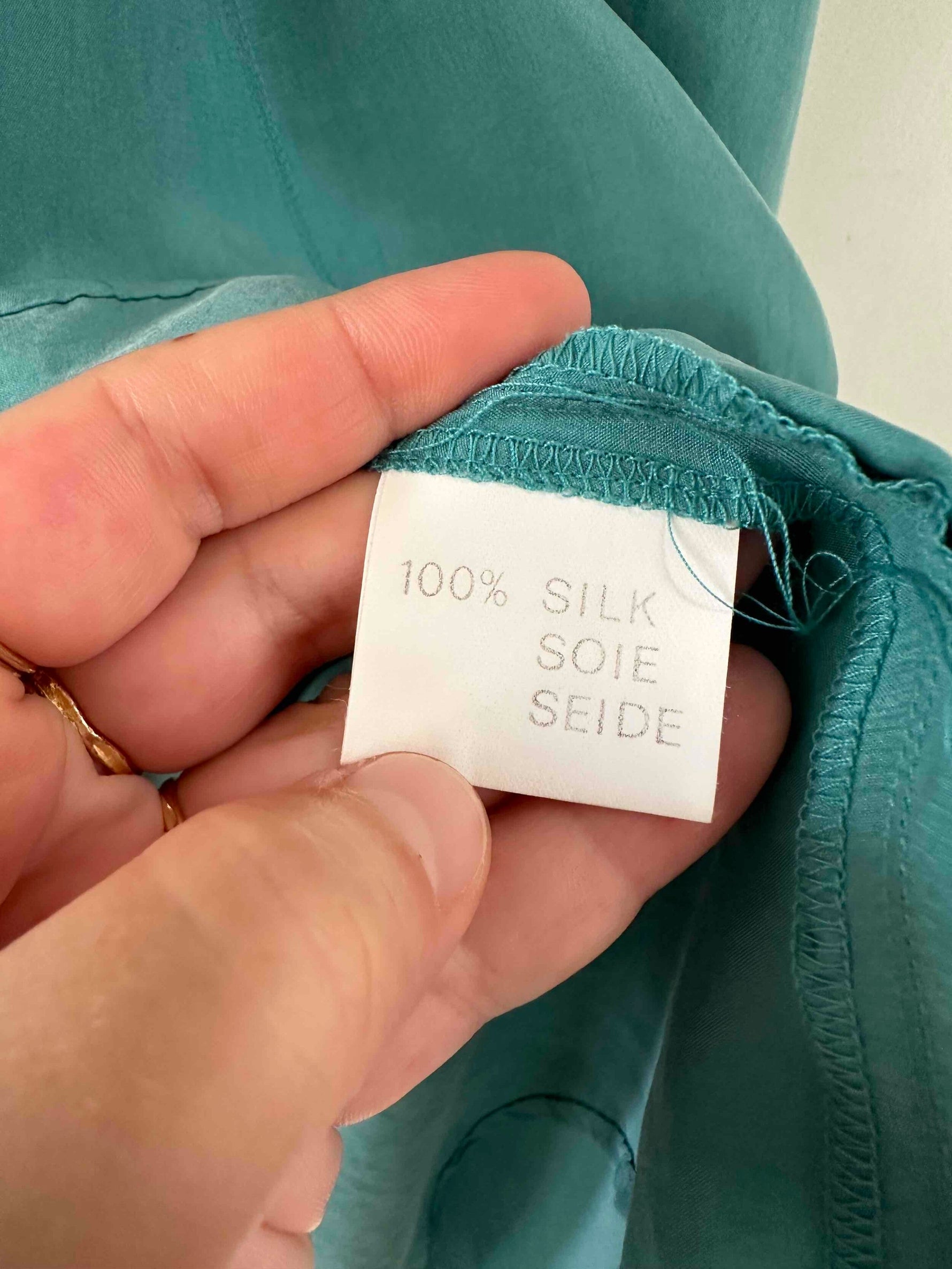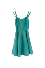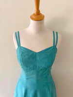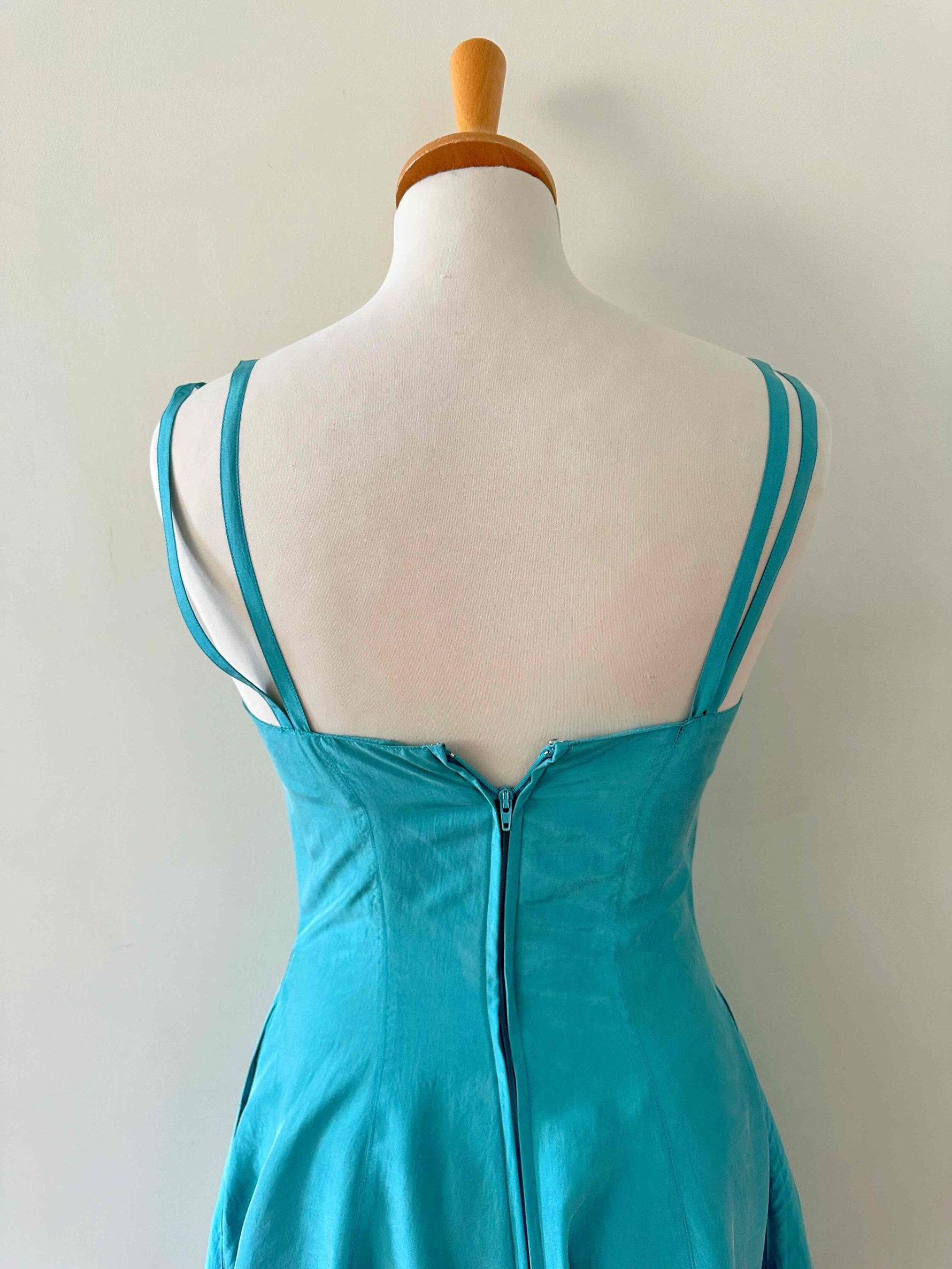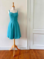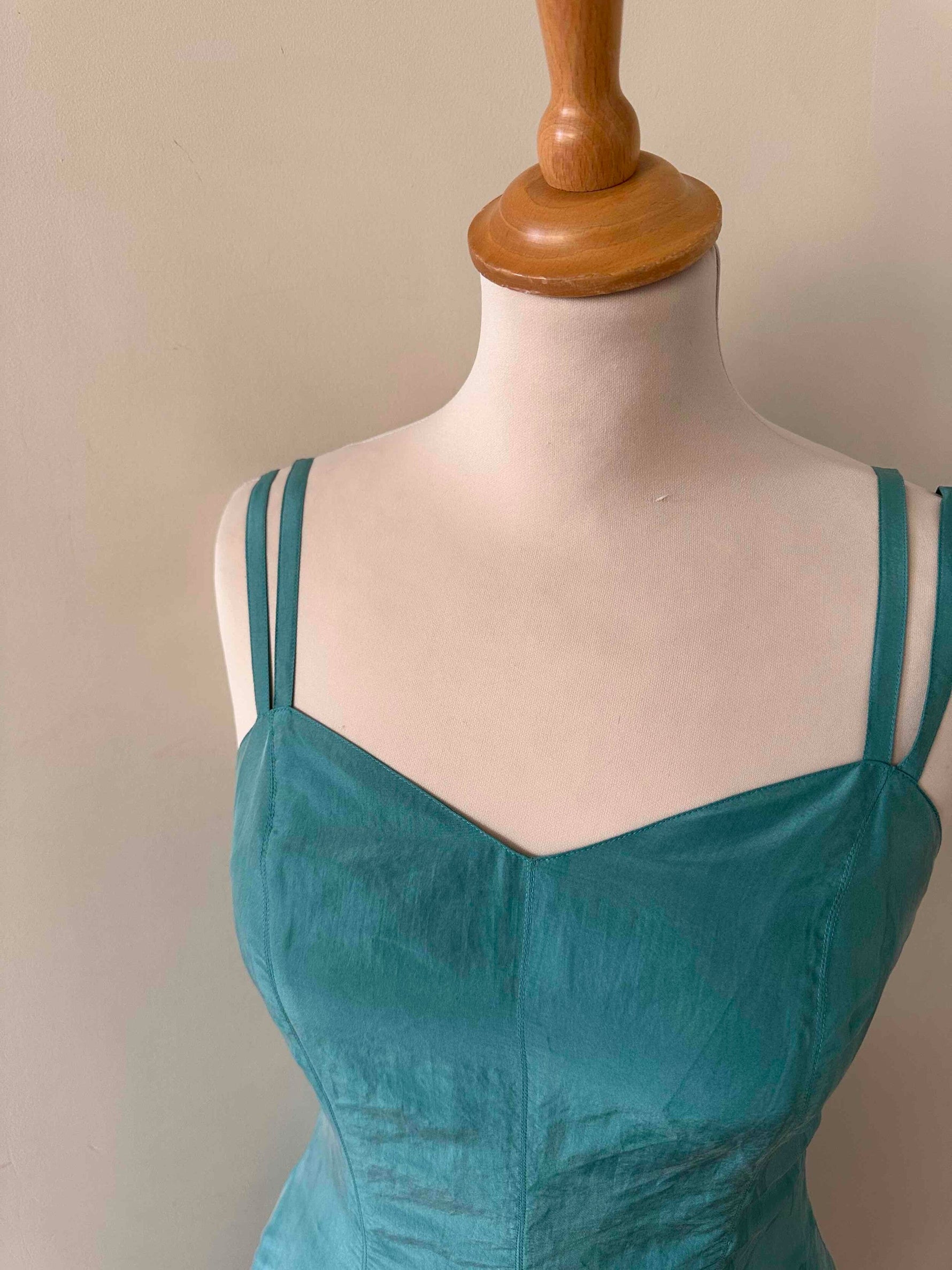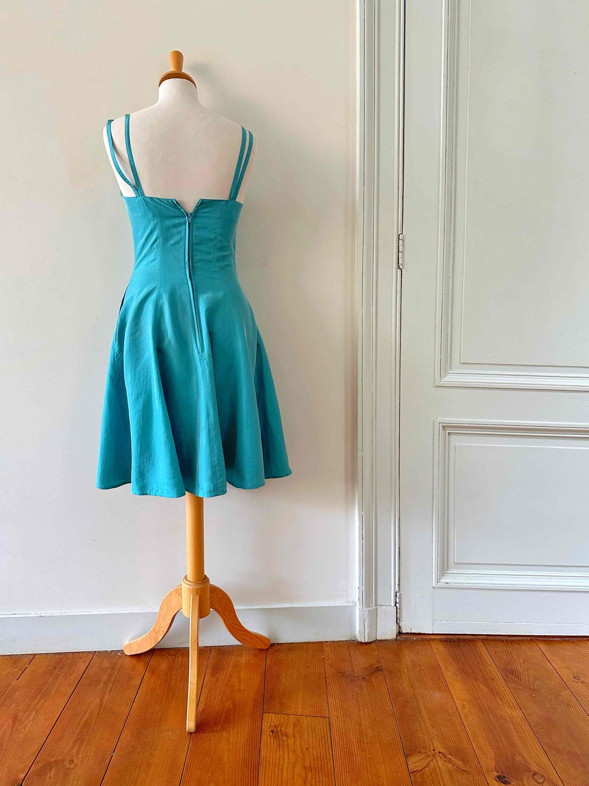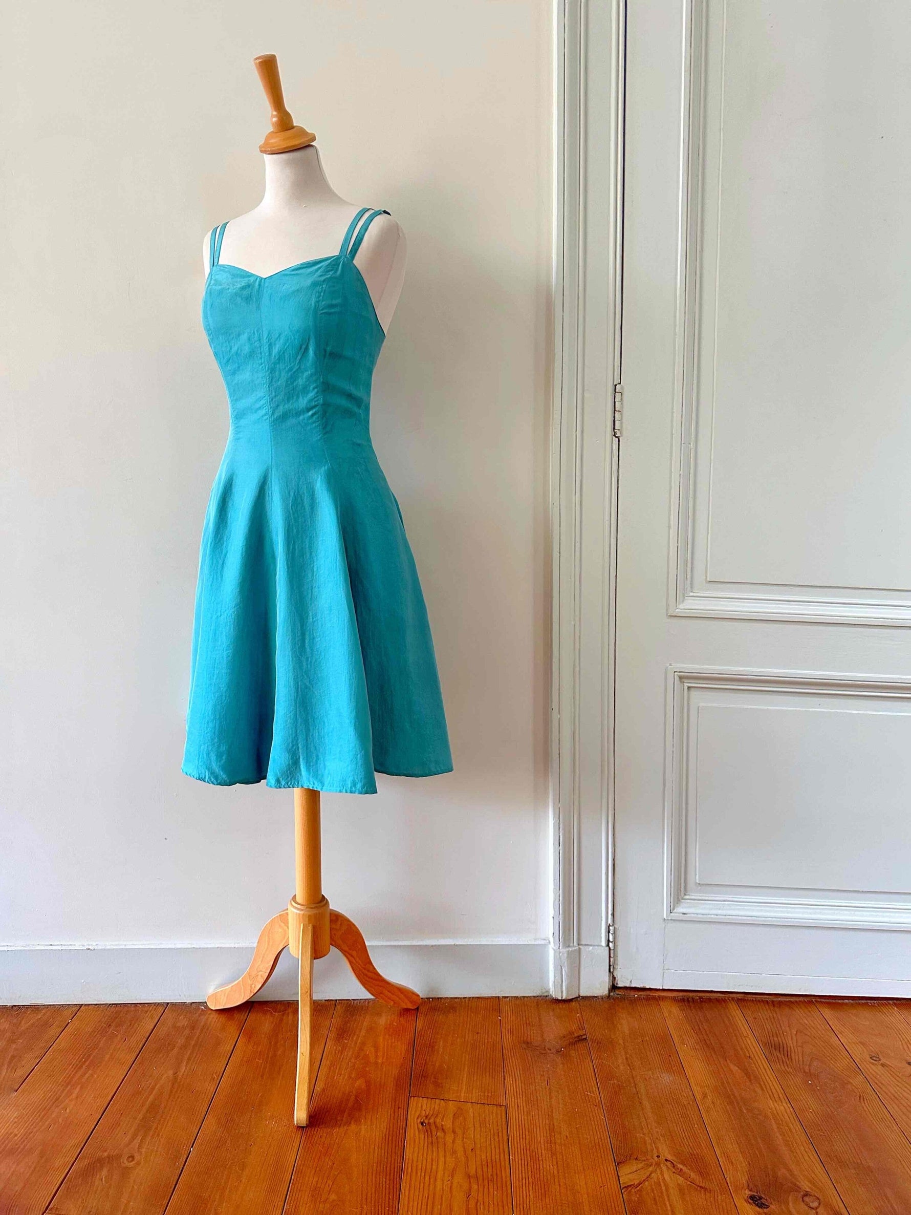 Prix unitaire parMini robe en soie, 100% soie vert émeraude, doubles bretelles spaghettis, haut forme bustier corsage, bas évasé, taille 34 portée ici ouverte sur un mannequin T36, aisselles 43cm.