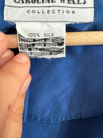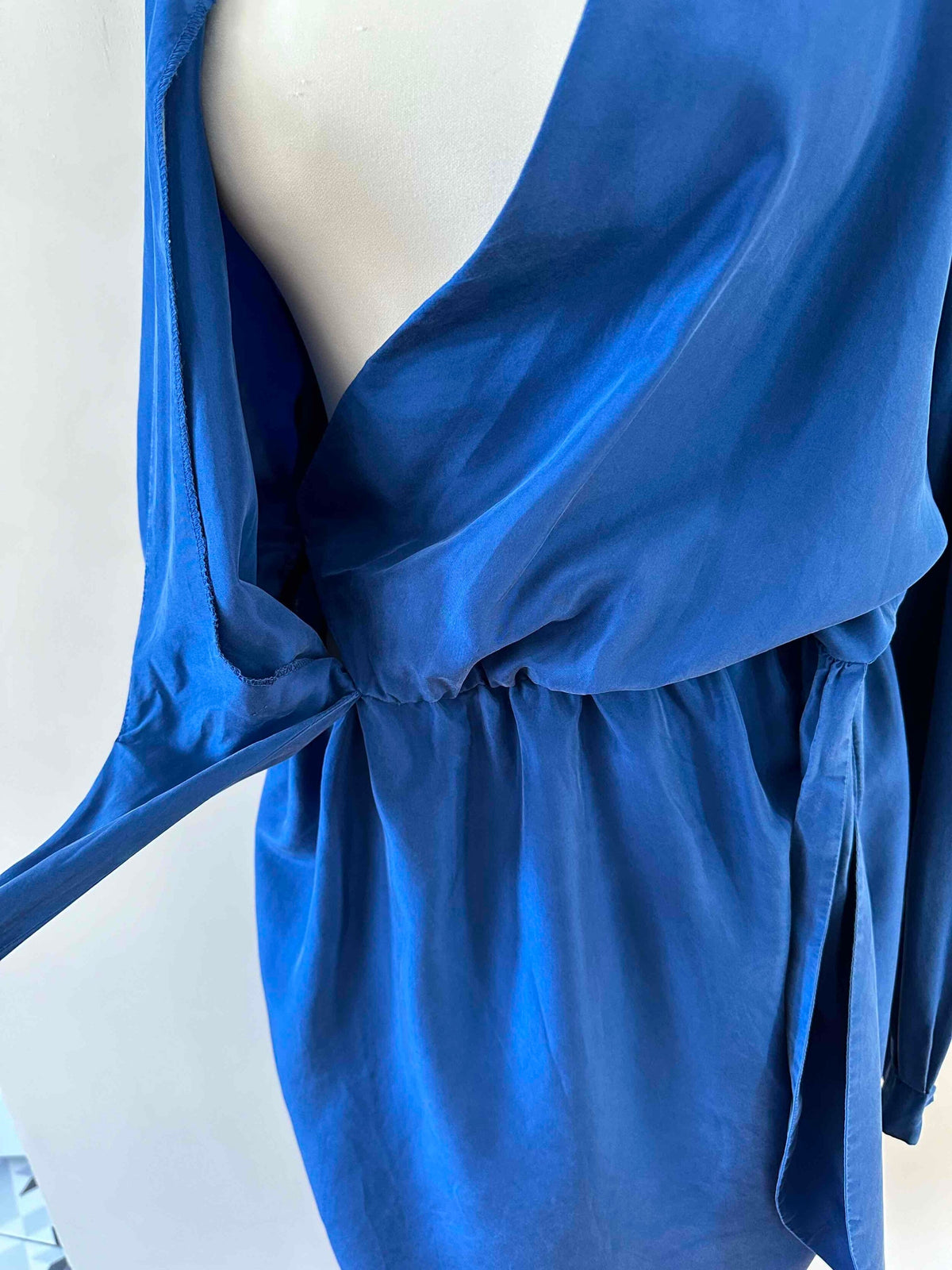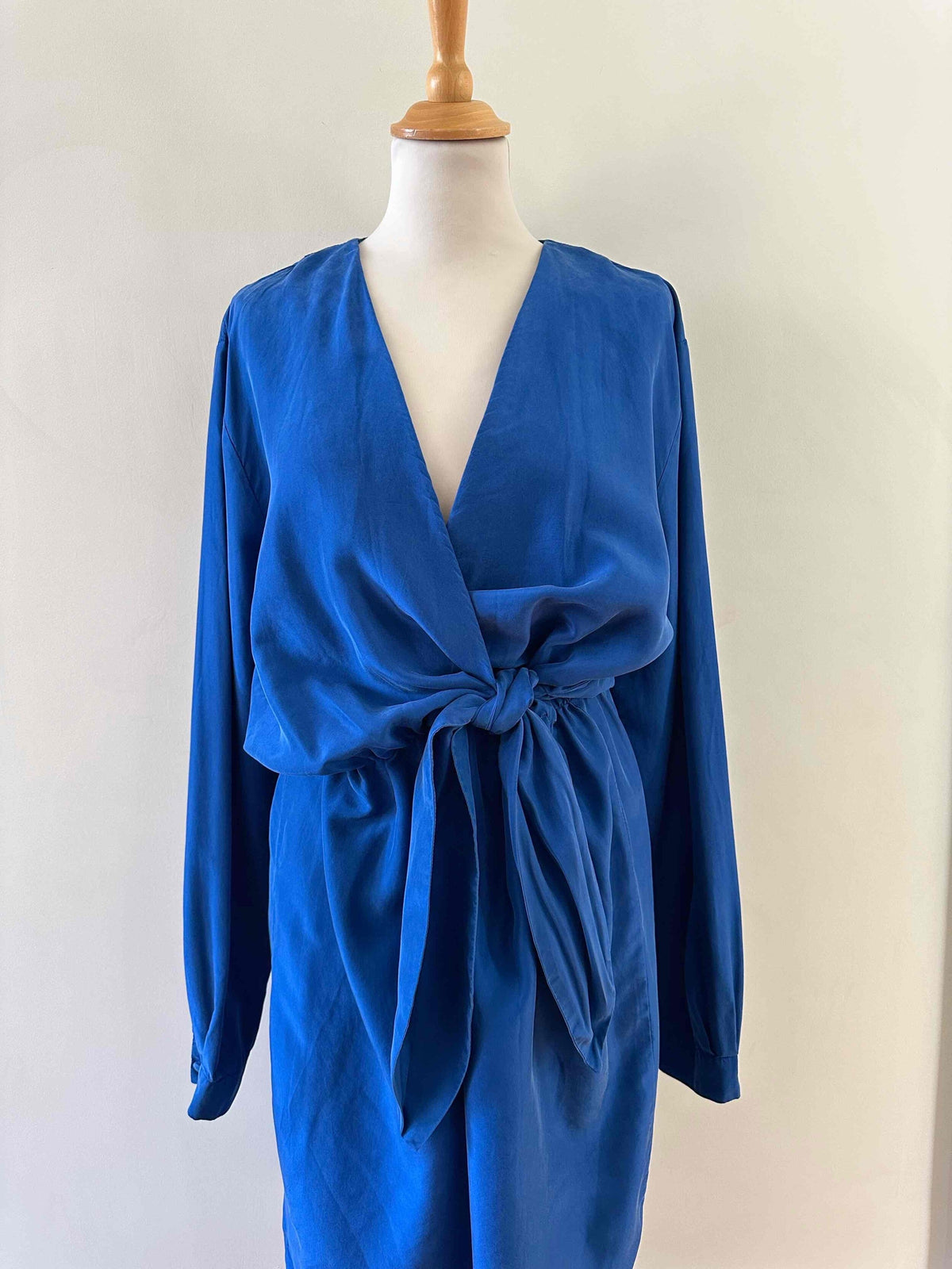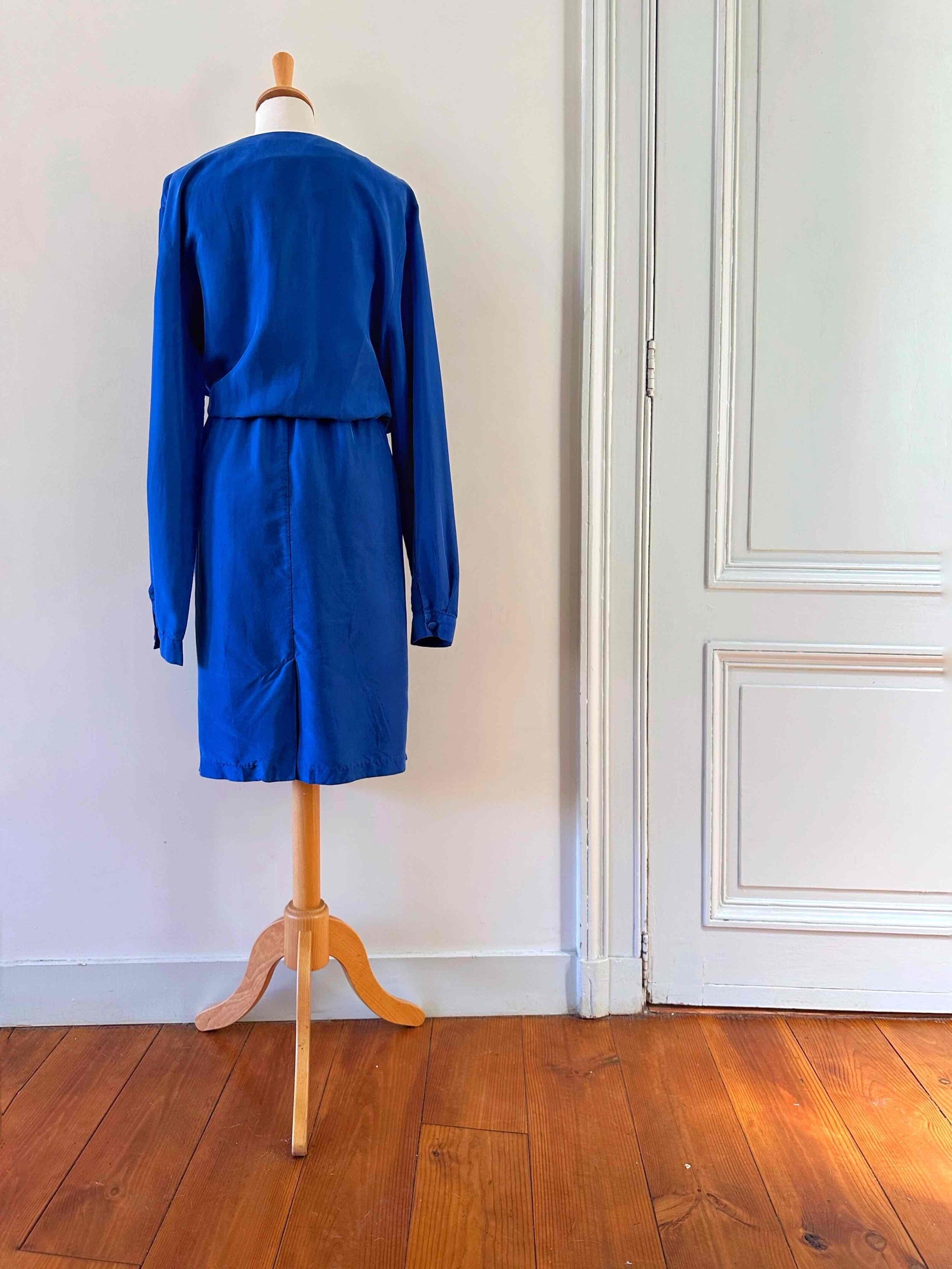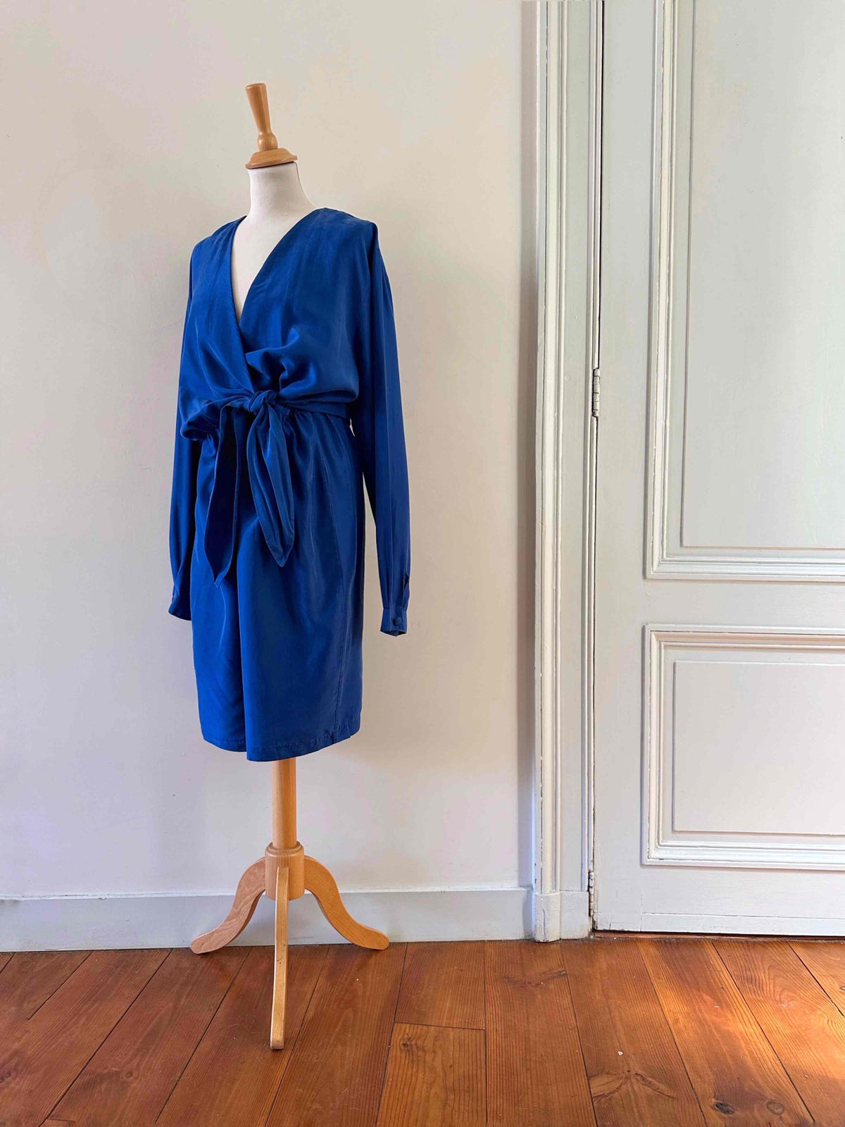 Robe portefeuille en soie, 100% soie bleue outremer, manches longues ballons, haut croisé à nouer sur le côté, taille élastique, années 80s, taille 38 portée ici sur un mannequin T36.