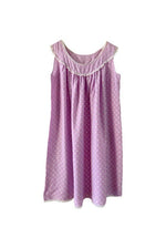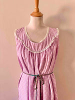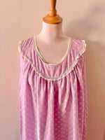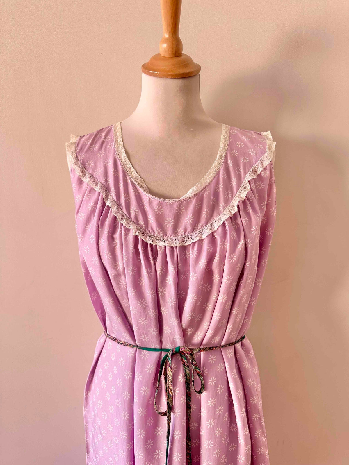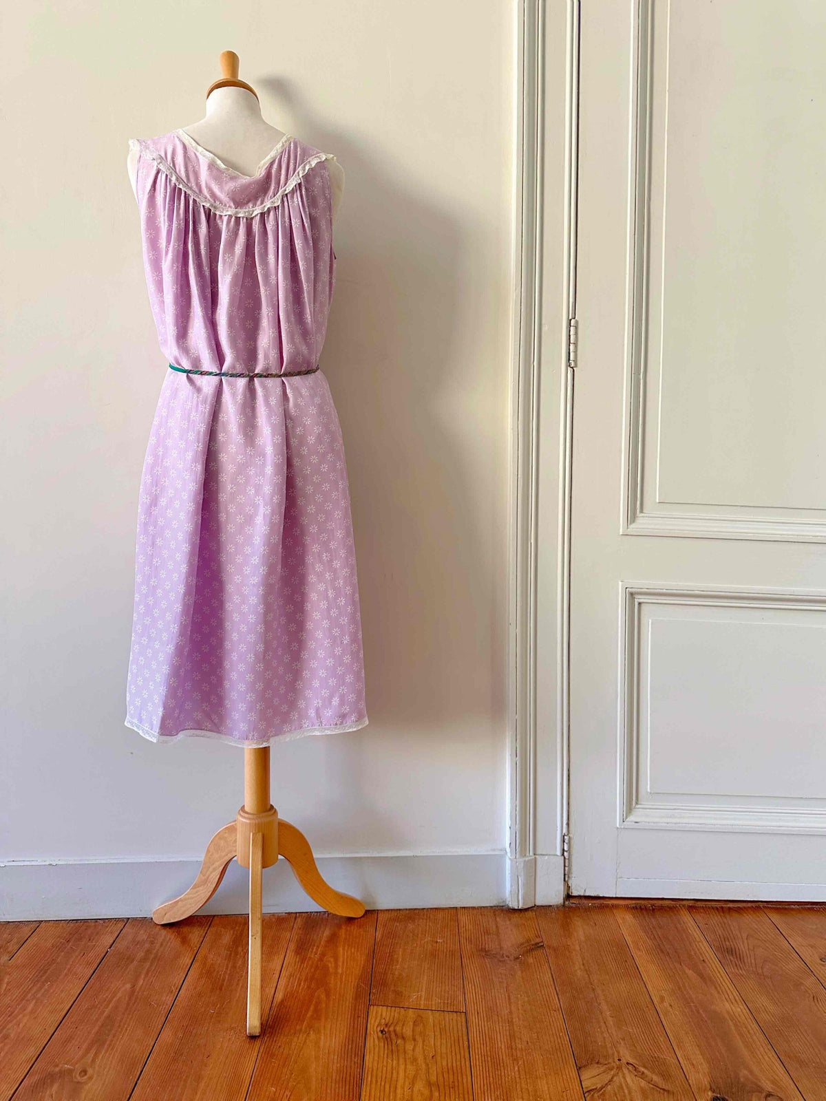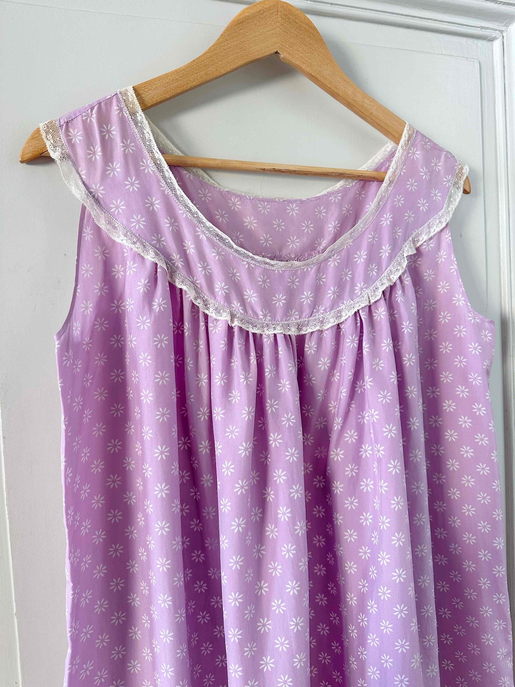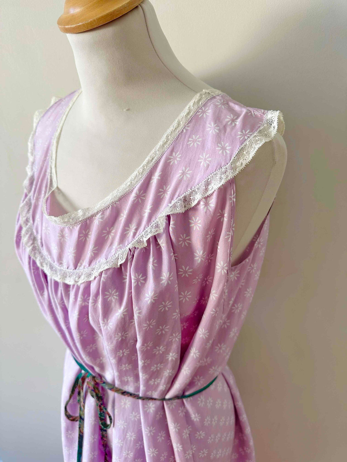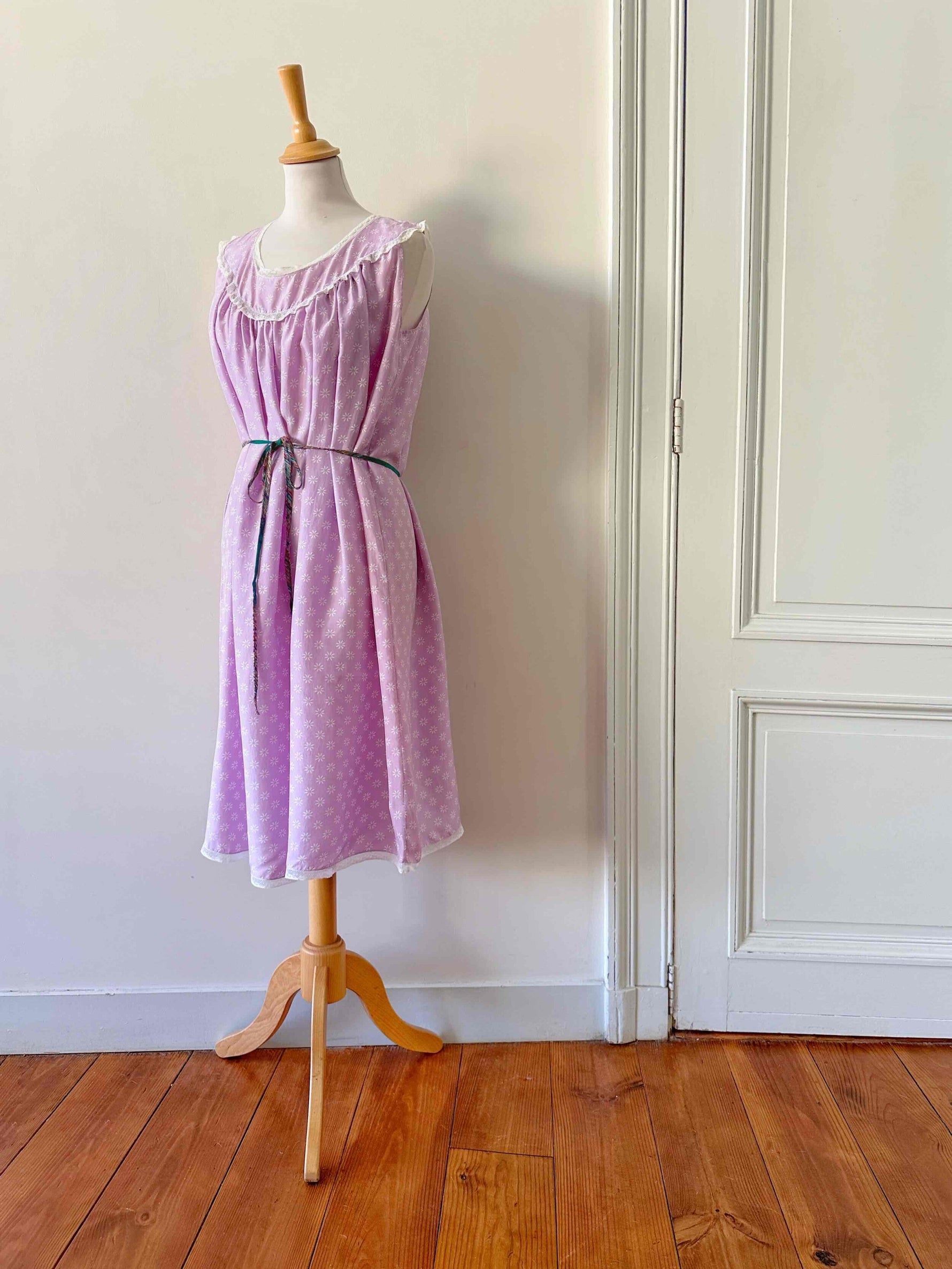 Prix unitaire parRobe nuisette en soie 60s, soie lilas parme imprimée de fleurs blanches, encolure ronde brodée de dentelle fine ajourée, bas bordé de dentelle, formé évasée, froncée et babdydoll.