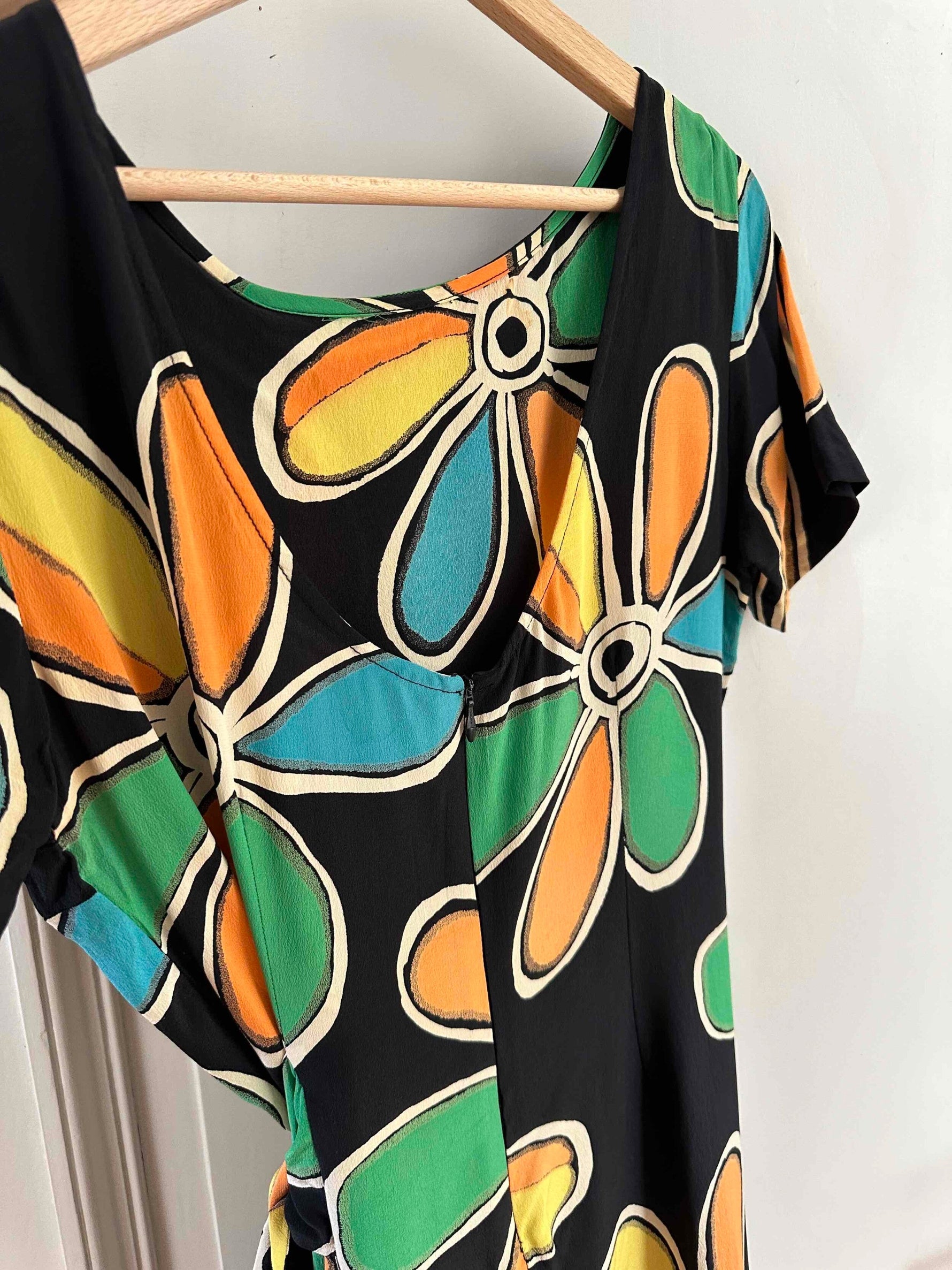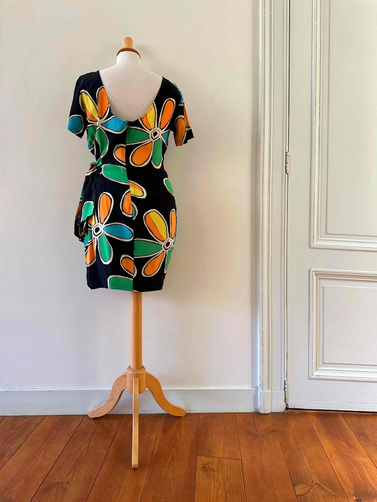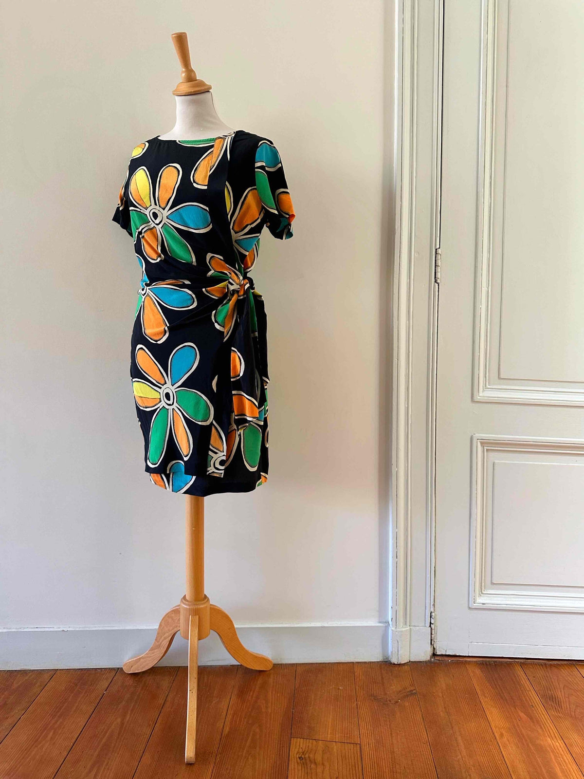 Prix unitaire parRobe portefeuille en soie, 100% soie noire imprimée fleurs arty multicolores oranges, bleues, jaunes, vertes et blanches, devant croisé à nouer sur le côté façon pagne, dos nu danseuse échancré, fermeture Éclair au dos, fabriquée en Italie, taille 38 portée ici sur un mannequin T36, aisselles 45 cm.