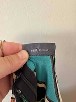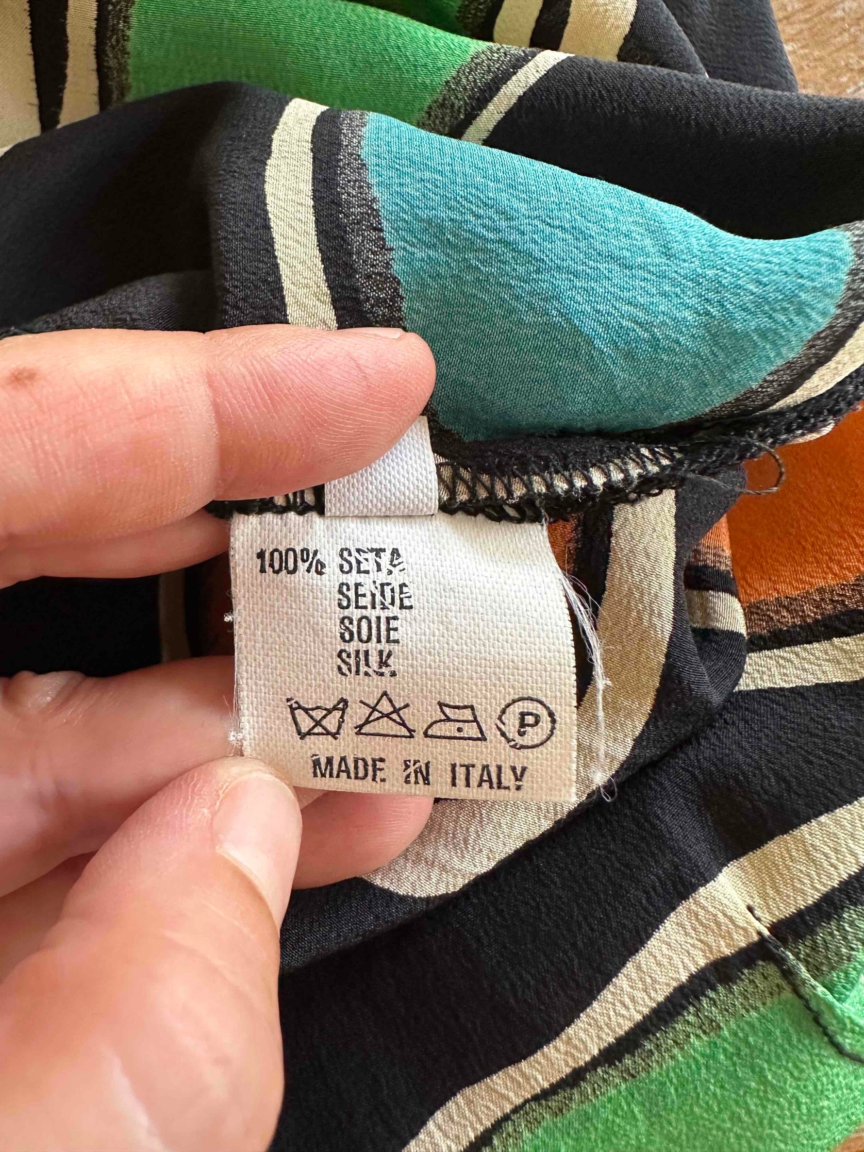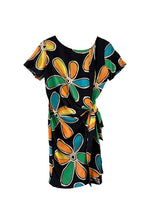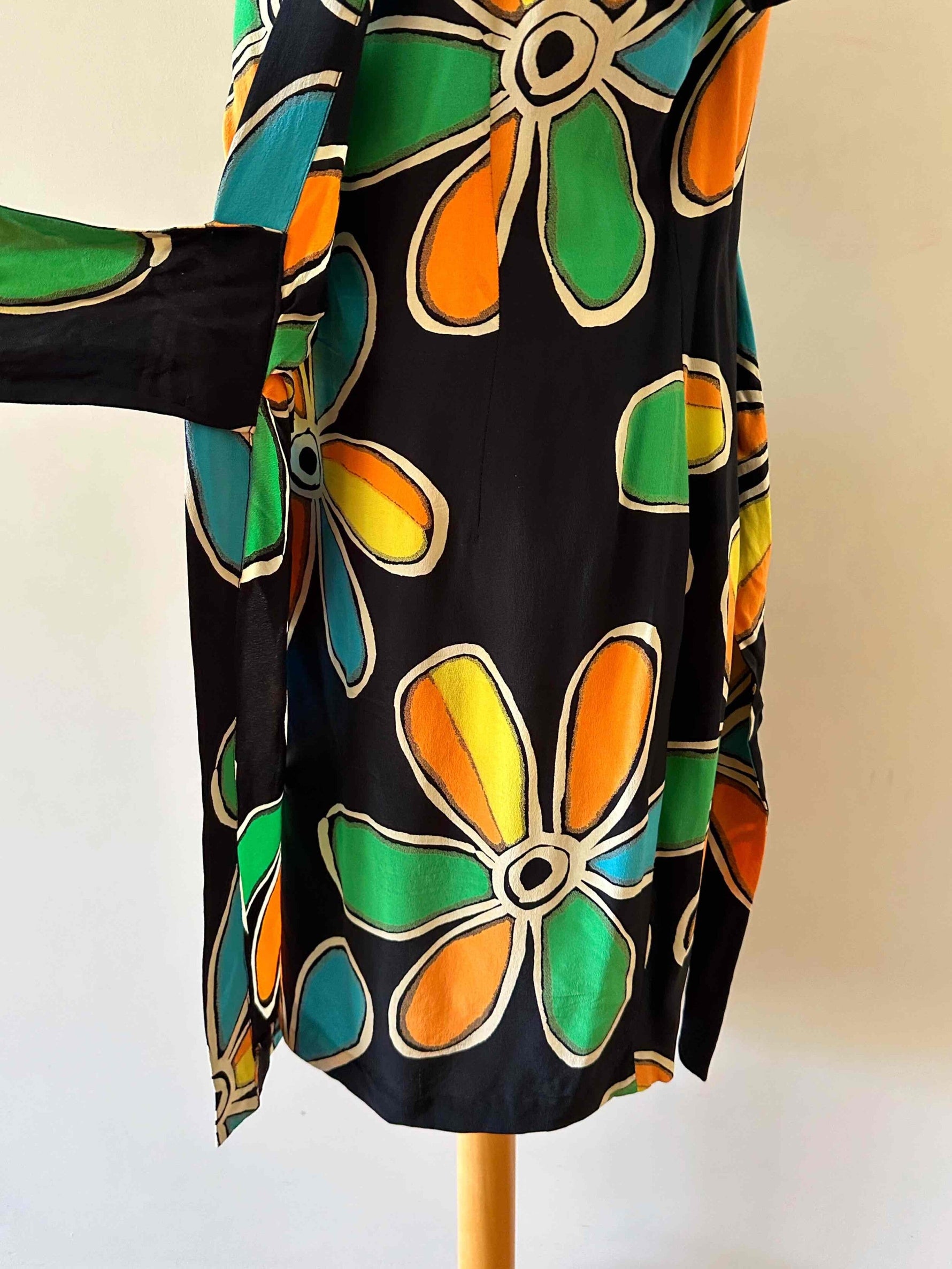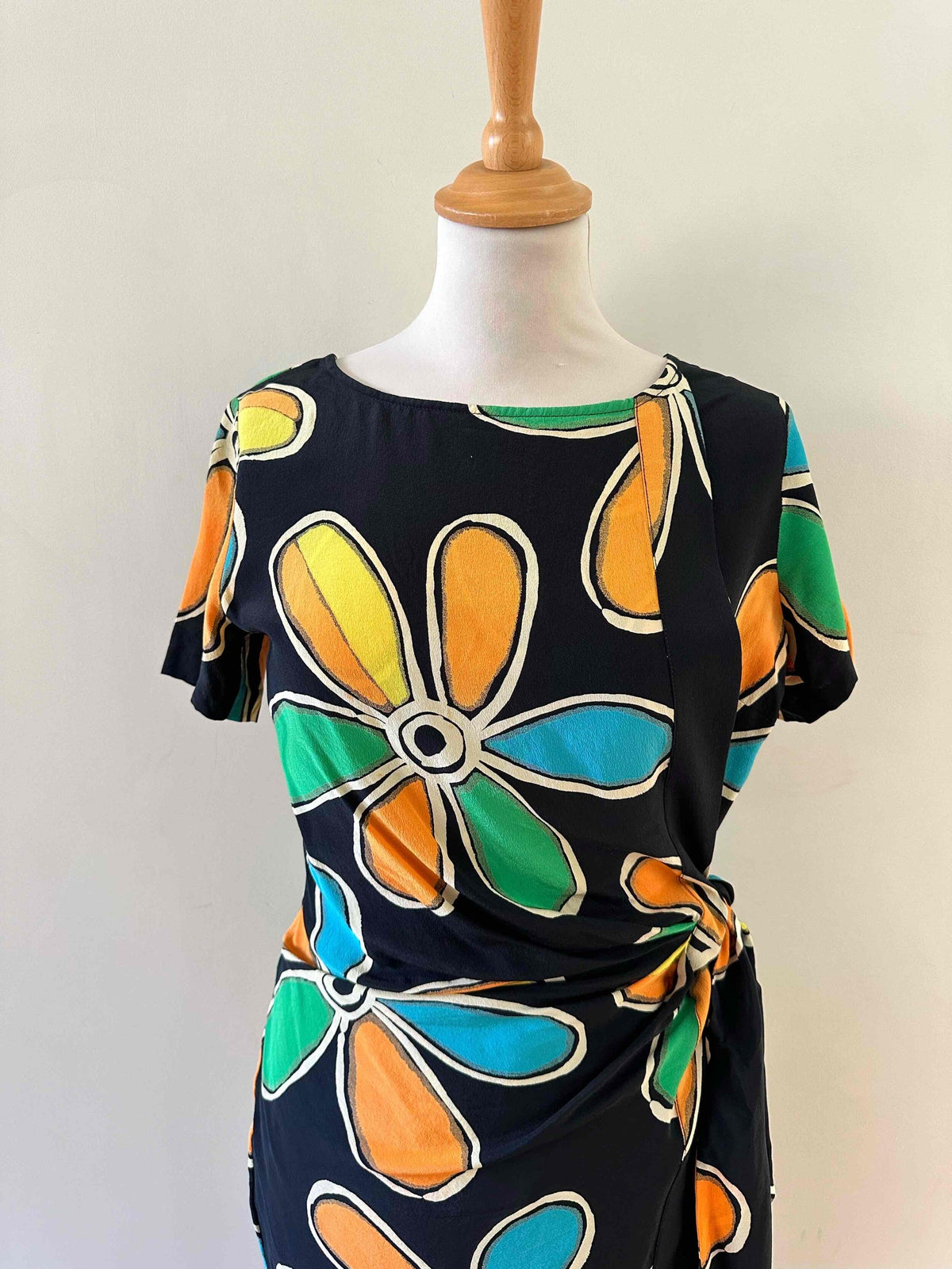 Prix unitaire parRobe portefeuille en soie, 100% soie noire imprimée fleurs arty multicolores oranges, bleues, jaunes, vertes et blanches, devant croisé à nouer sur le côté façon pagne, dos nu danseuse échancré, fermeture Éclair au dos, fabriquée en Italie, taille 38 portée ici sur un mannequin T36, aisselles 45 cm.