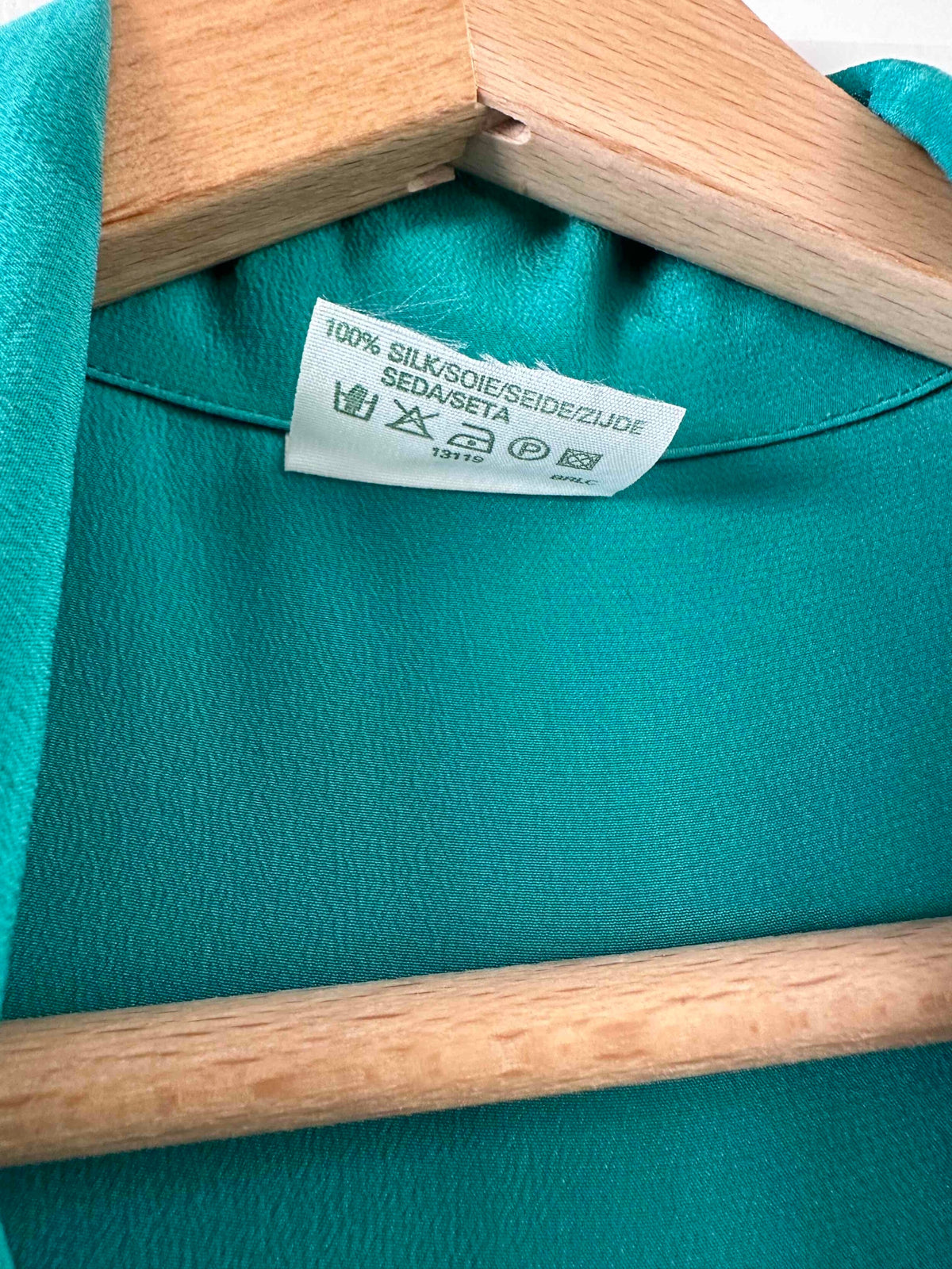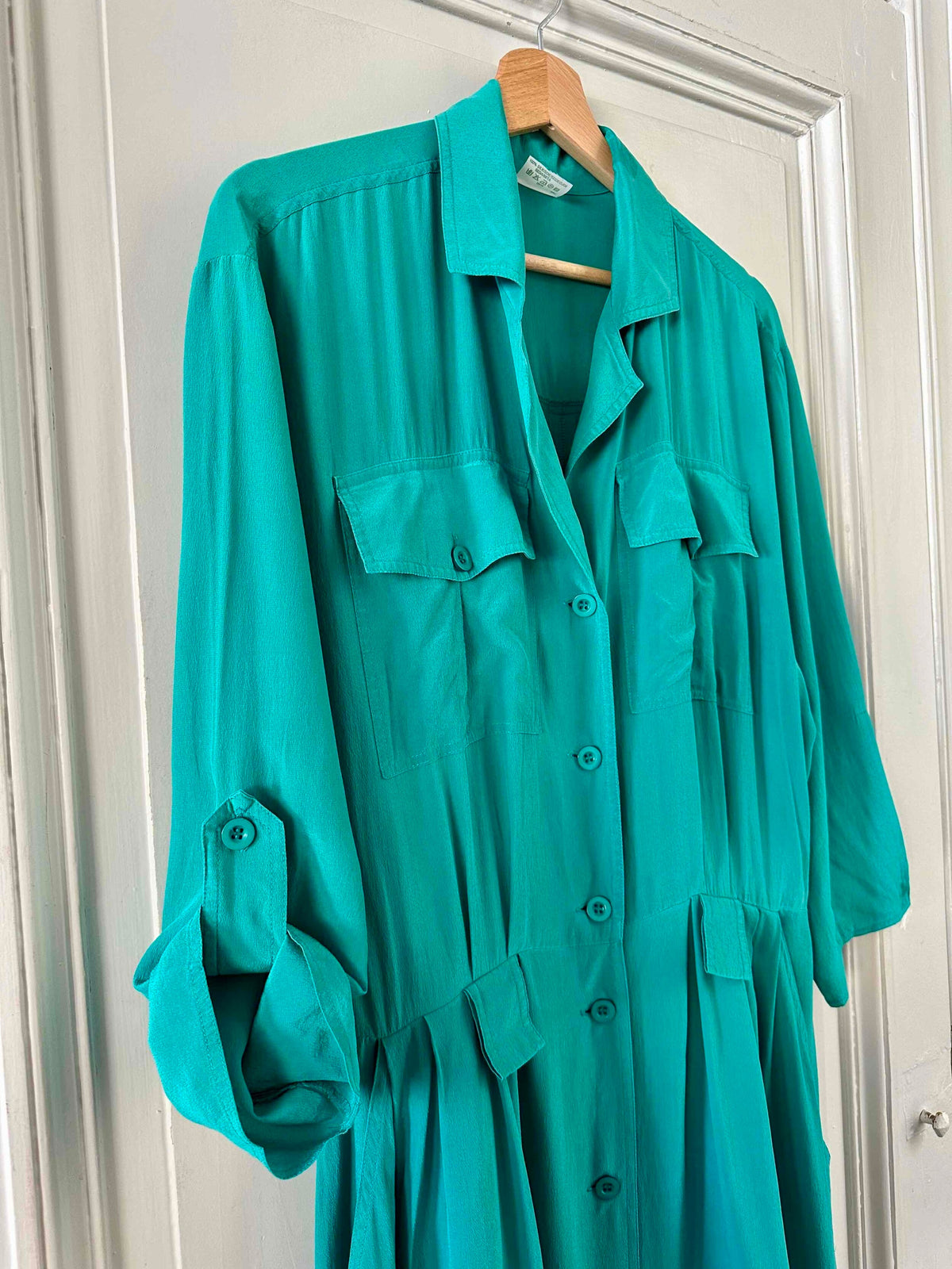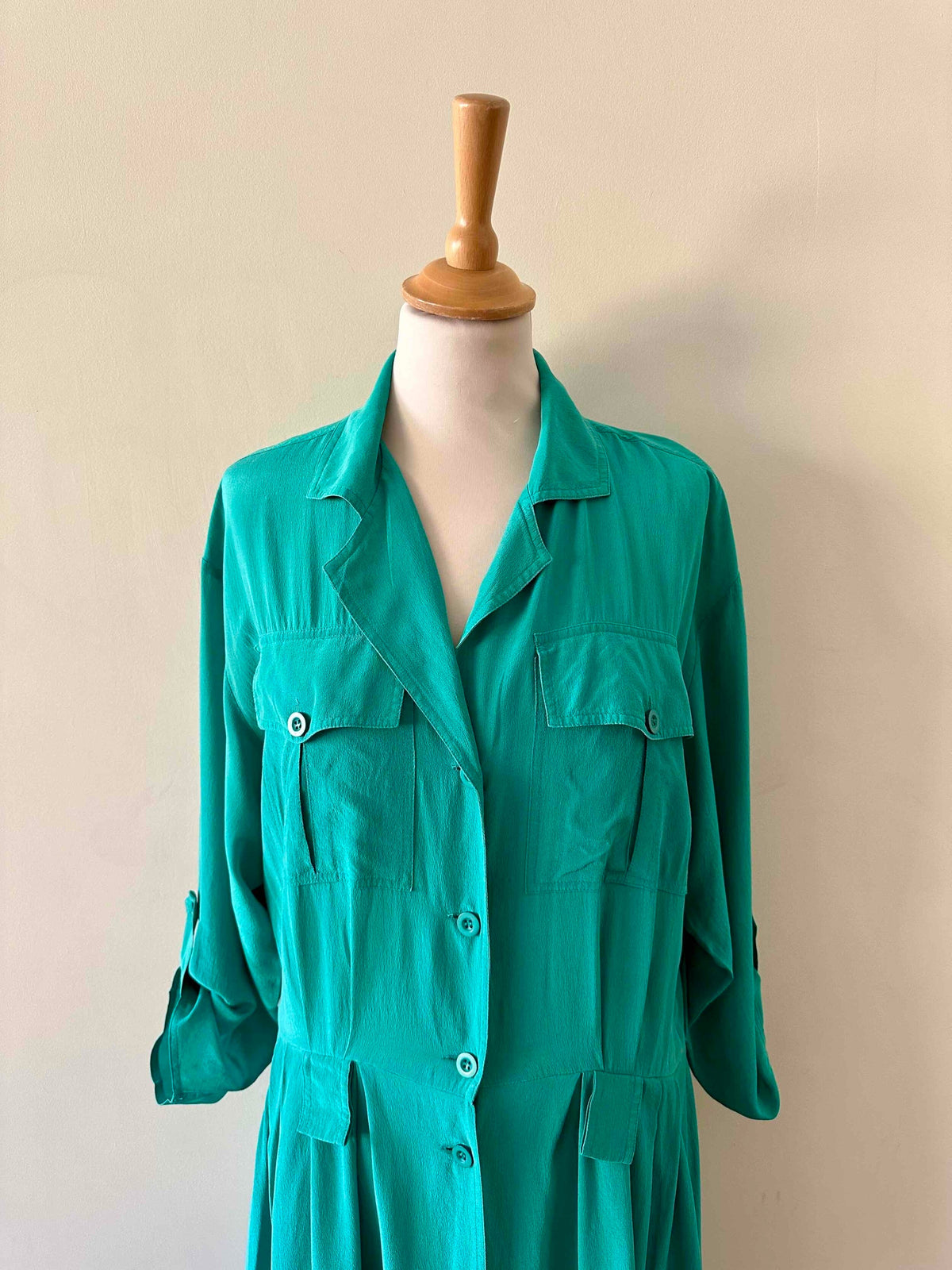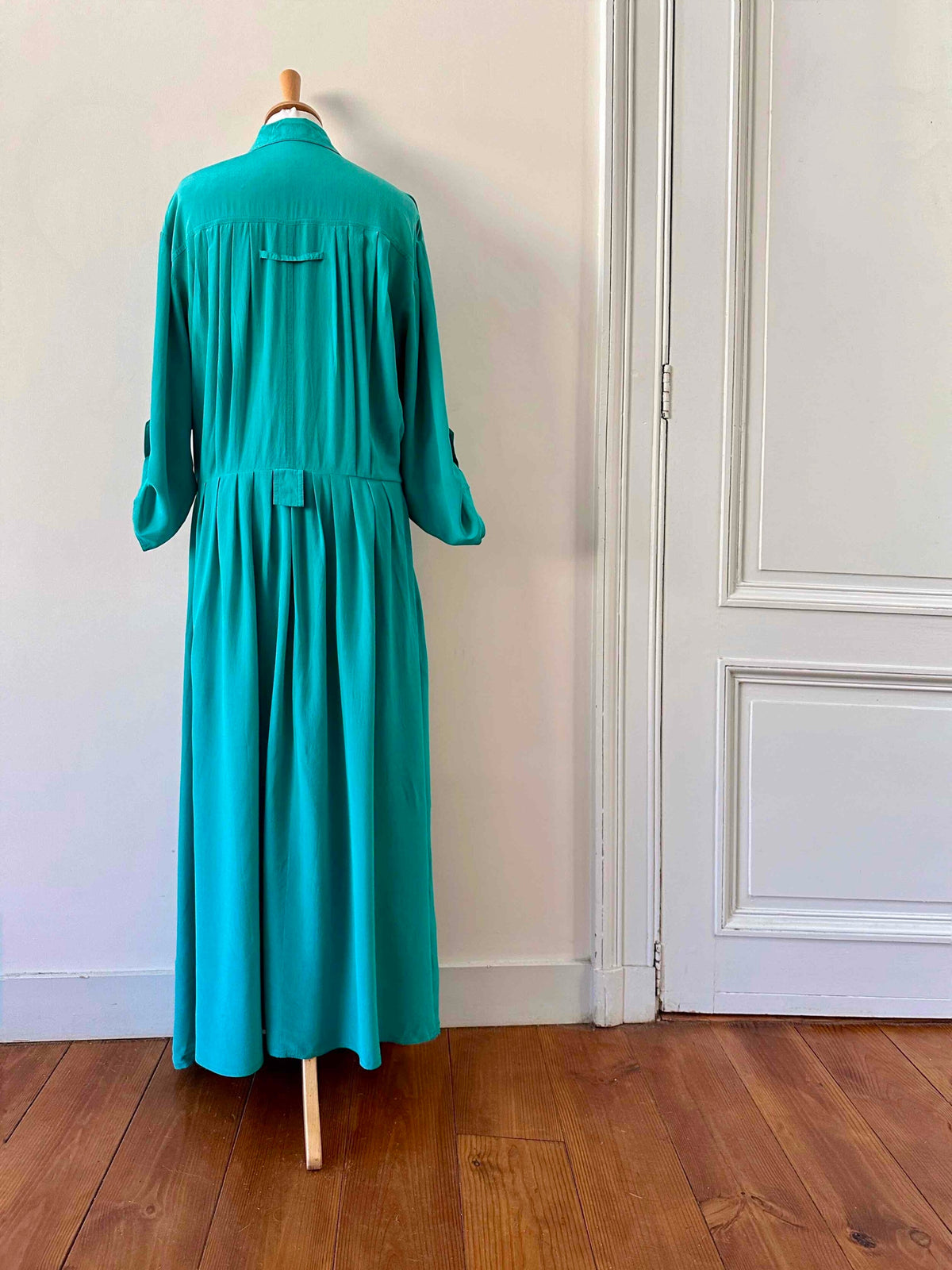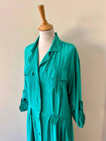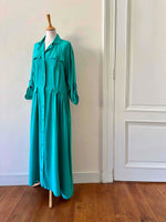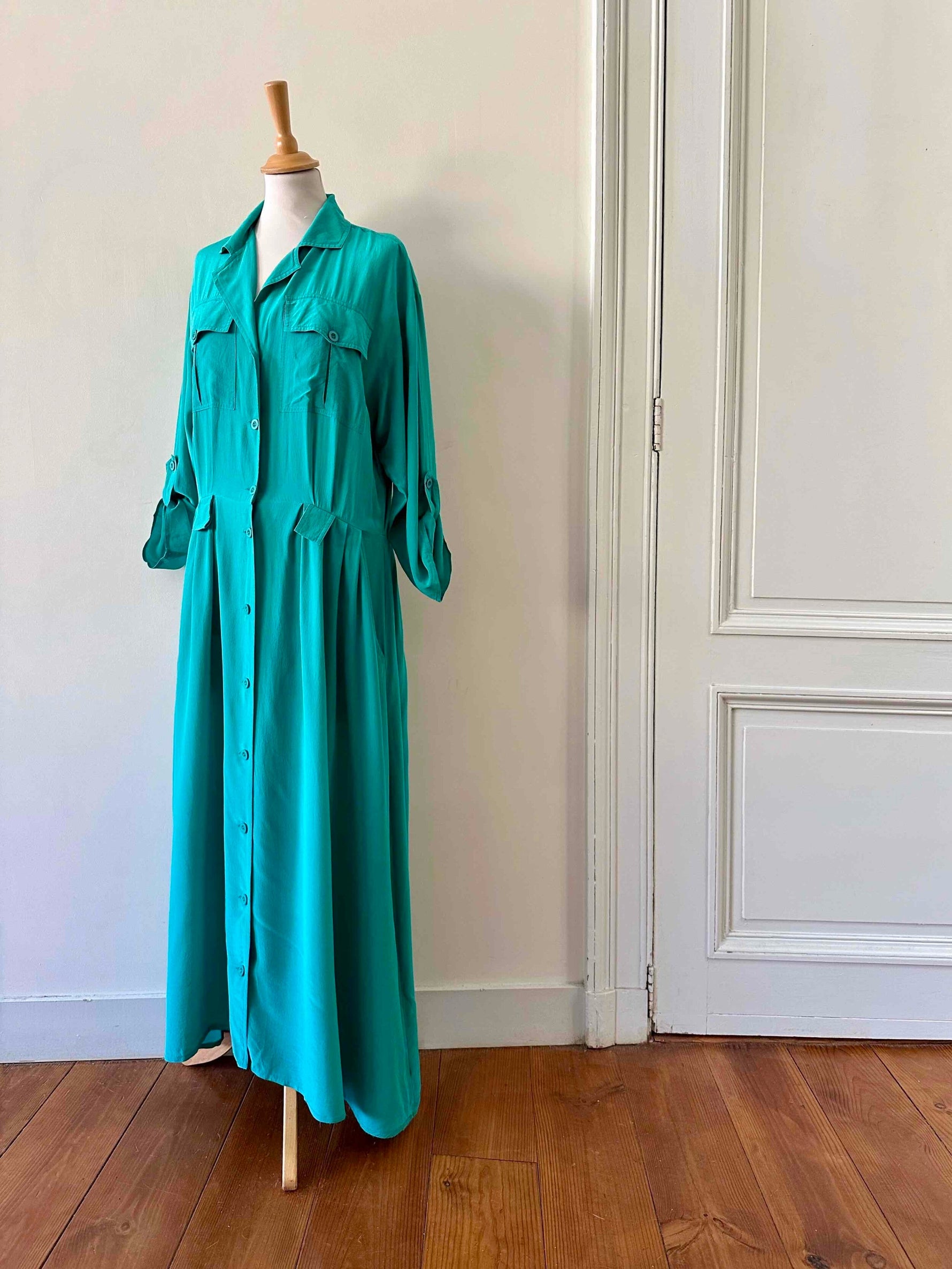 Robe chemise en soie, soie lavée vert emeraude turquoise, détails saharienne, longueur maxi, passant pour ceinture, manches a retrousser par un bouton, années 90s, taille 38 portée ici sur un mannequin T36.