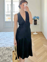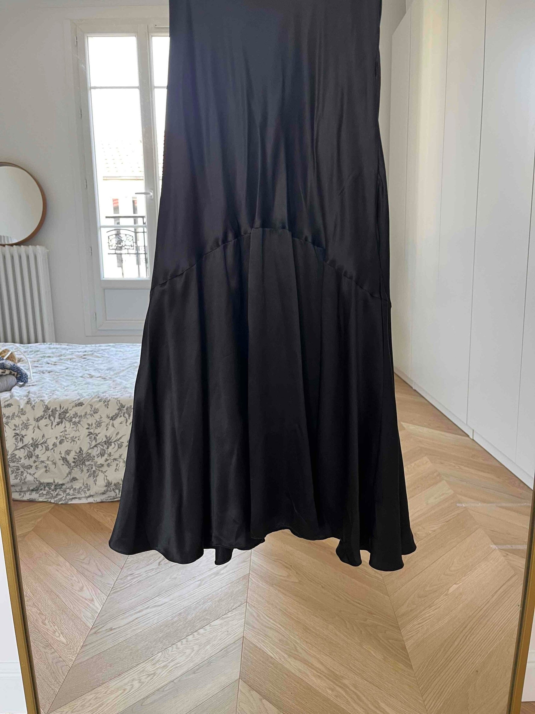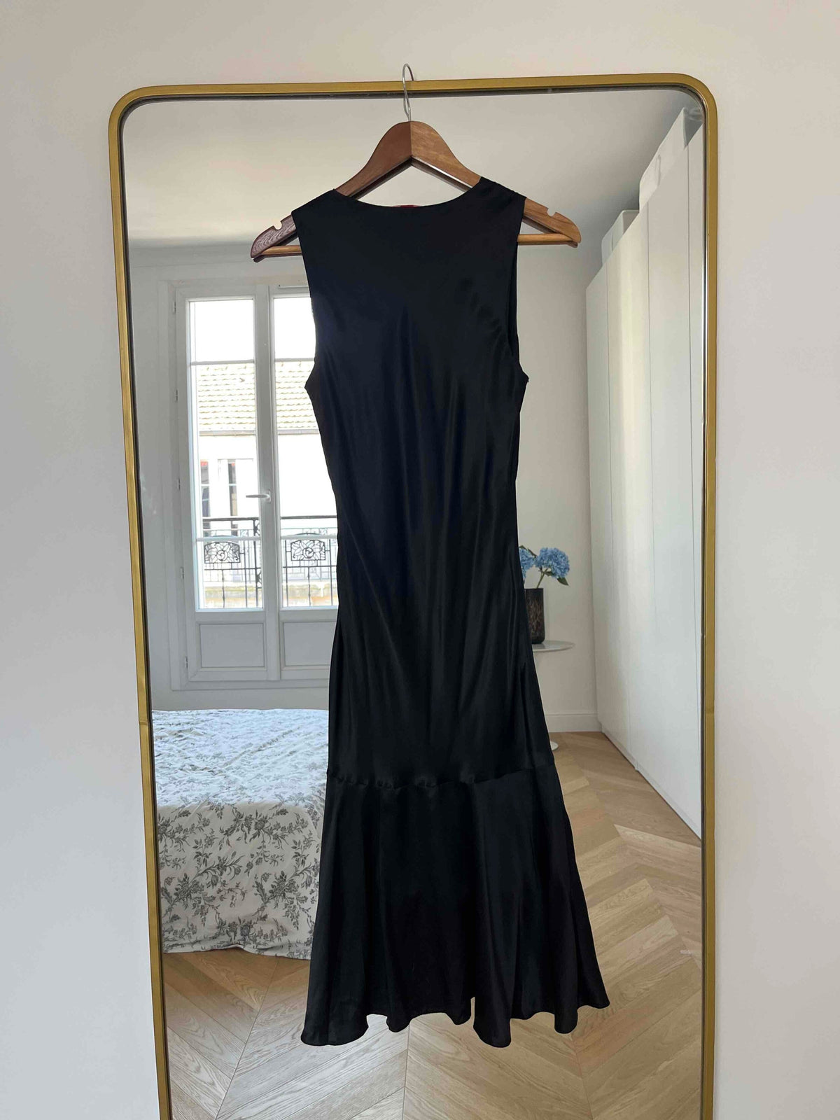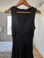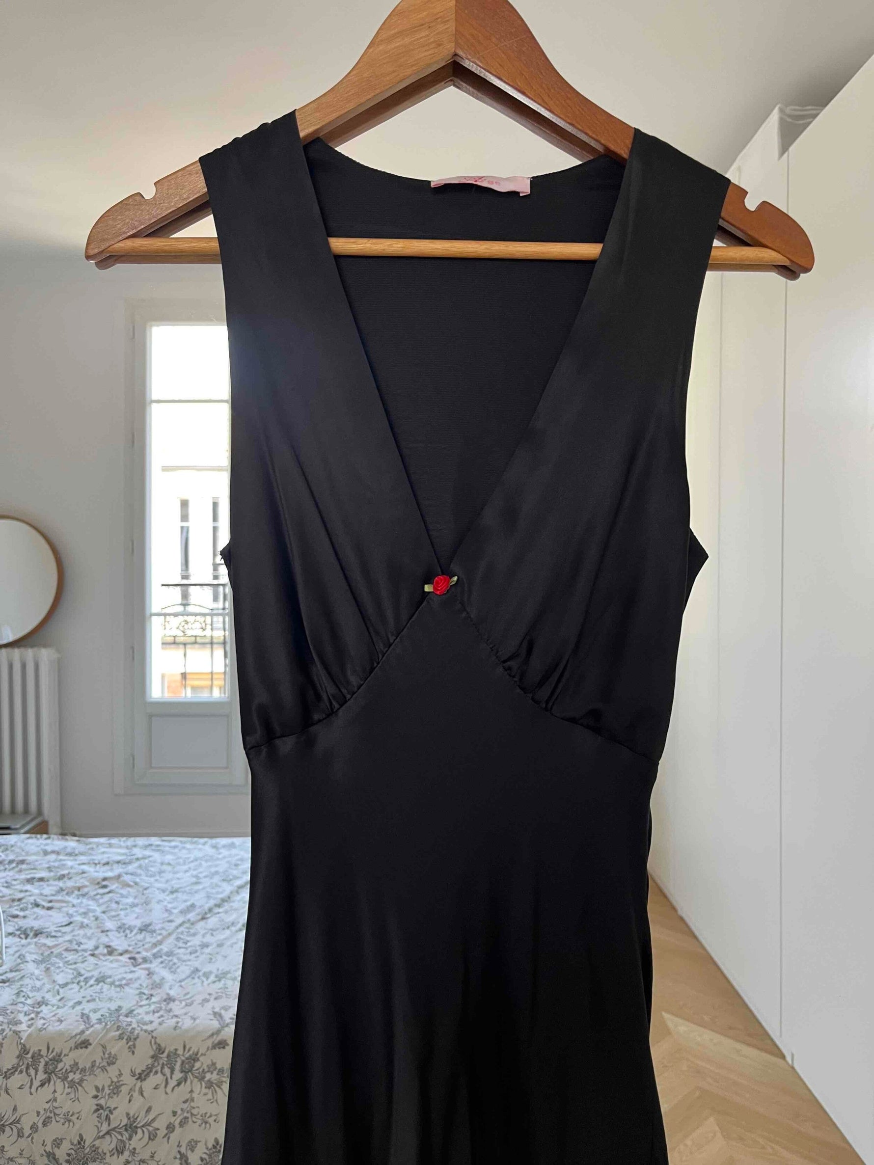 Robe en soie noire, made in France, décolleté en V ornée d’une petite rose rouge, fluide et légère, cintrée à la taille, portée ici sur une T36 pour 1m64.