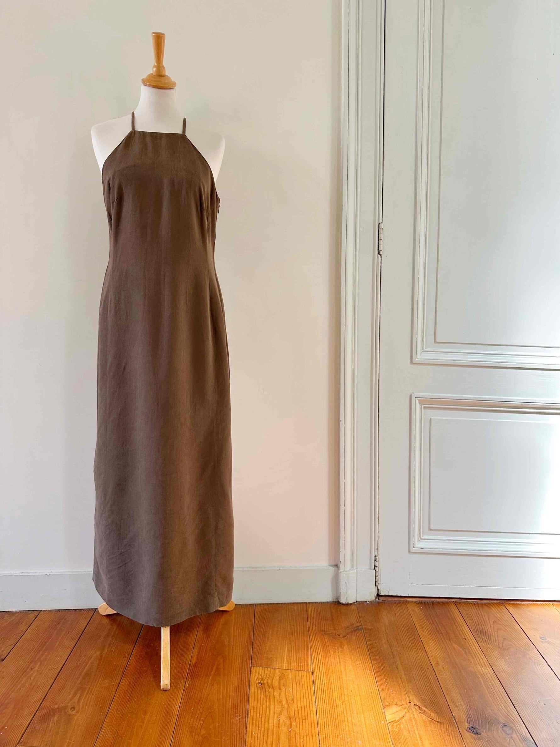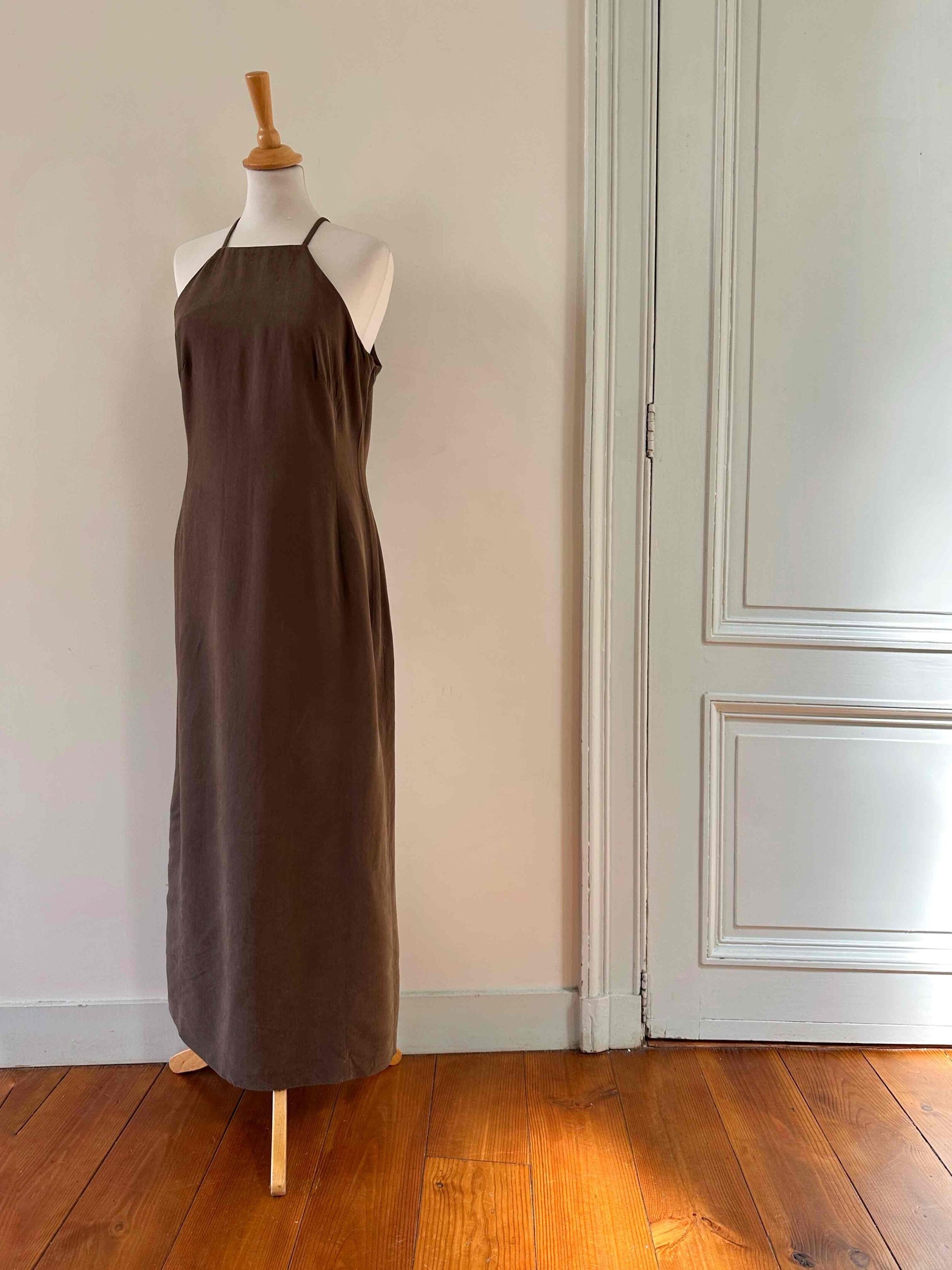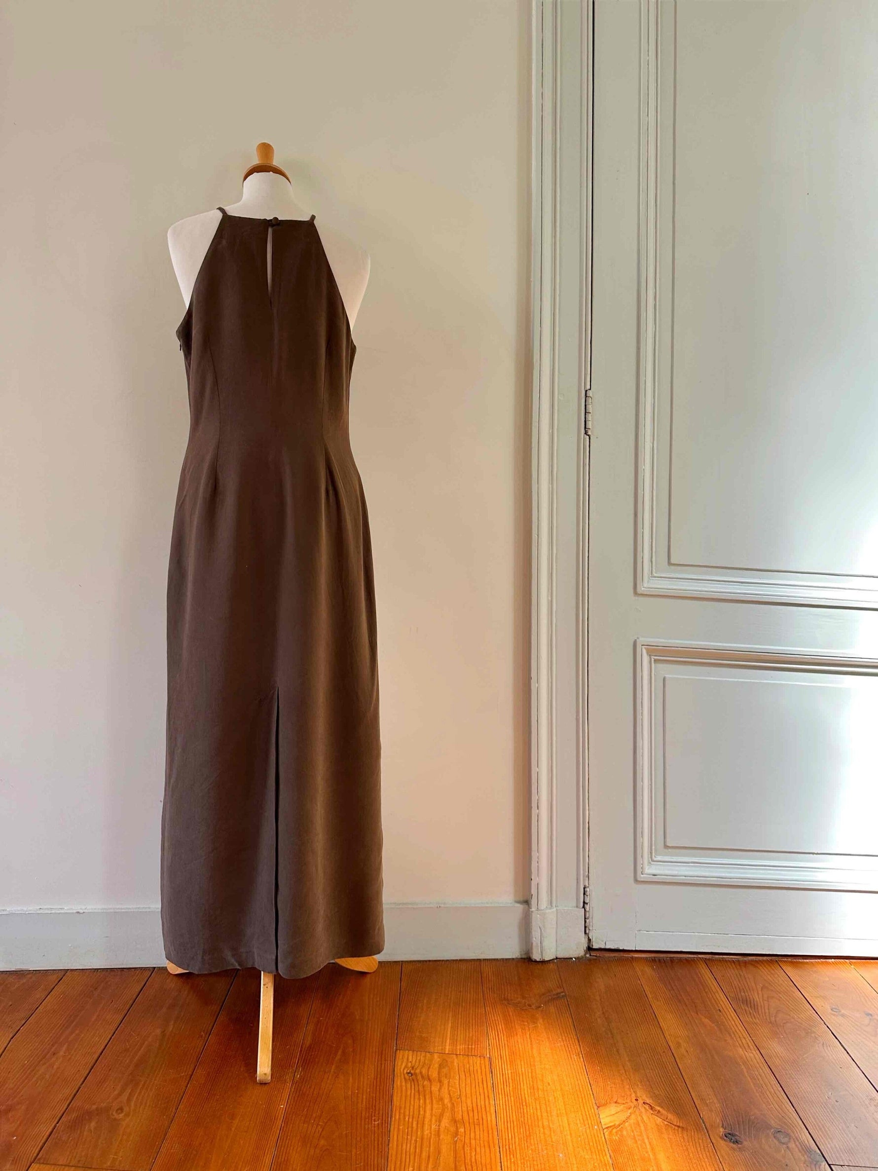 Prix unitaire parRobe longue en soie, en soie lavée et viscose brun chocolat, bretelles spaghettis en emmanchures américaines, goutte boutonnée au col dos, longueur maxi, fente au dos, fabriquée en France, taille 38 portée ici sur un mannequin T36, aisselles 47cm.