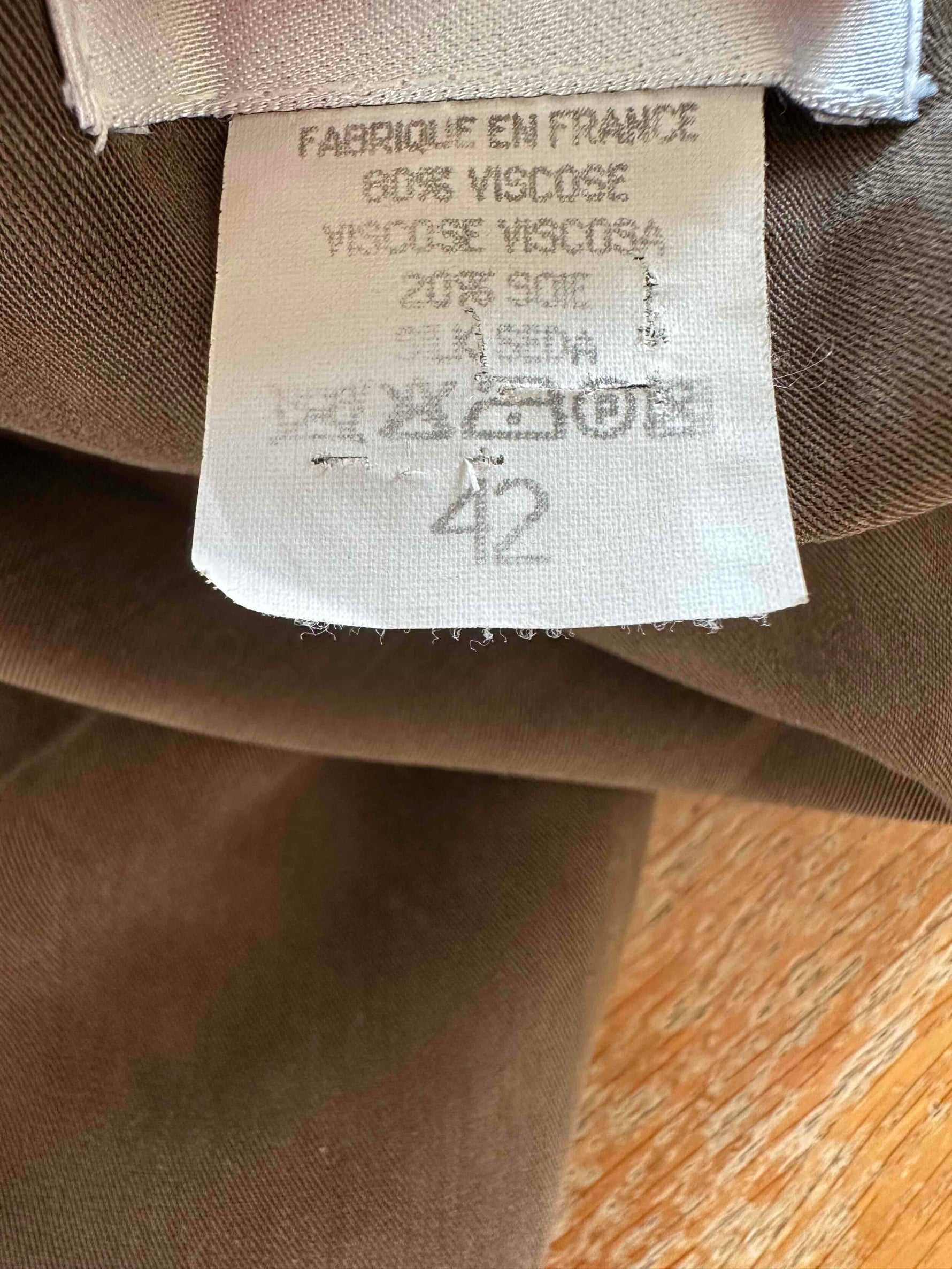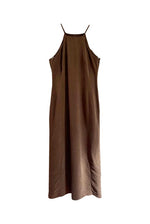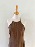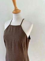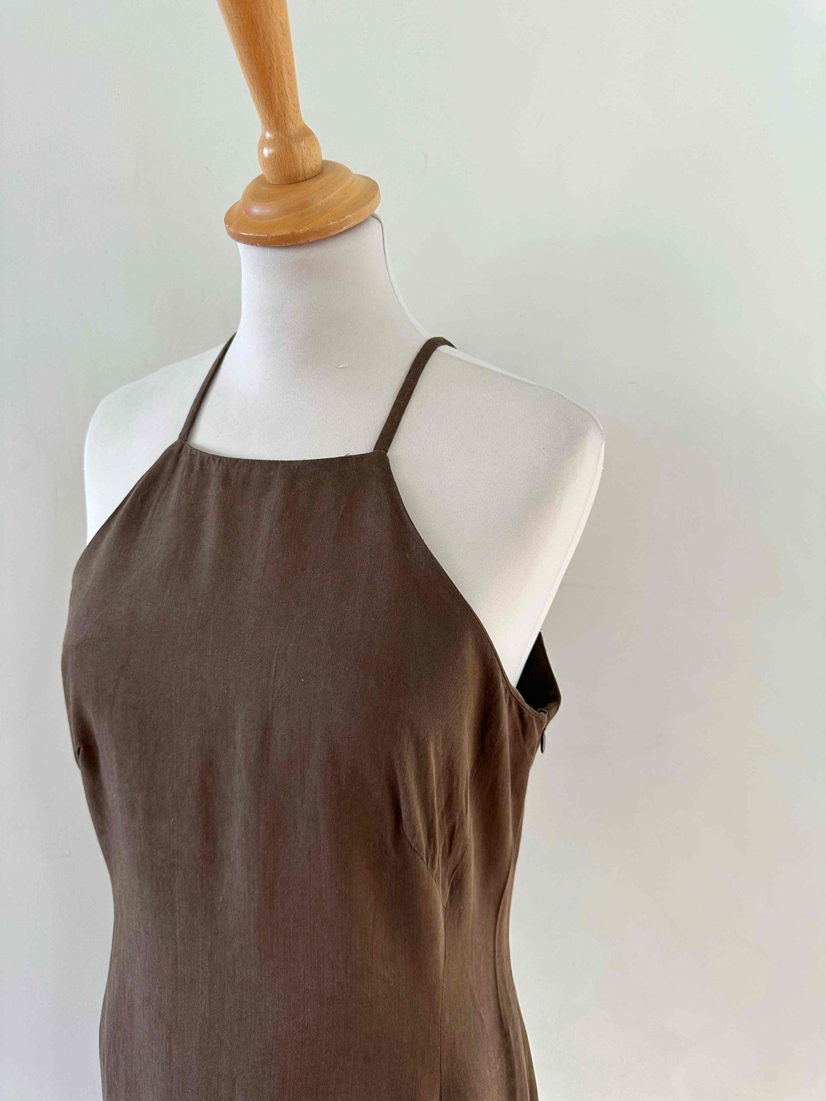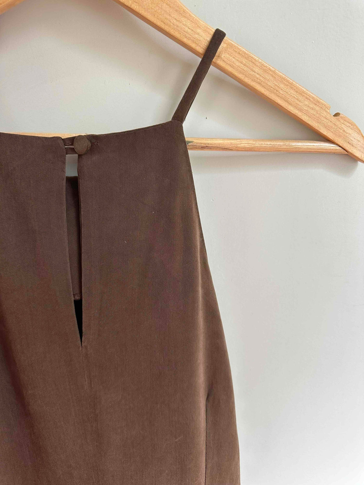 Prix unitaire parRobe longue en soie, en soie lavée et viscose brun chocolat, bretelles spaghettis en emmanchures américaines, goutte boutonnée au col dos, longueur maxi, fente au dos, fabriquée en France, taille 38 portée ici sur un mannequin T36, aisselles 47cm.