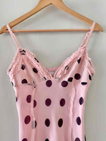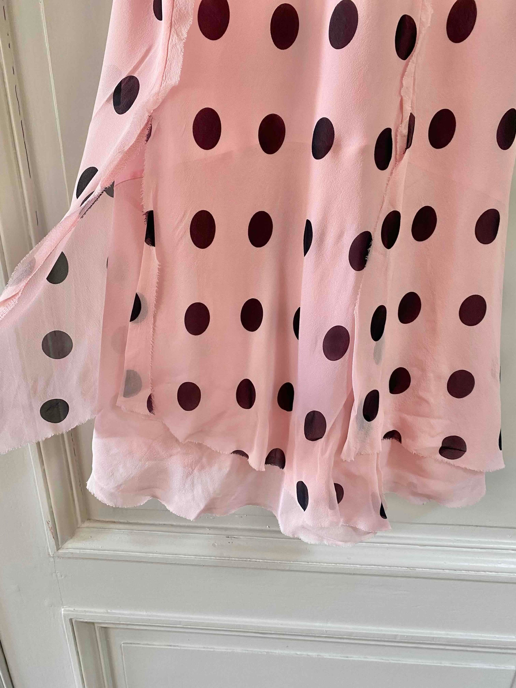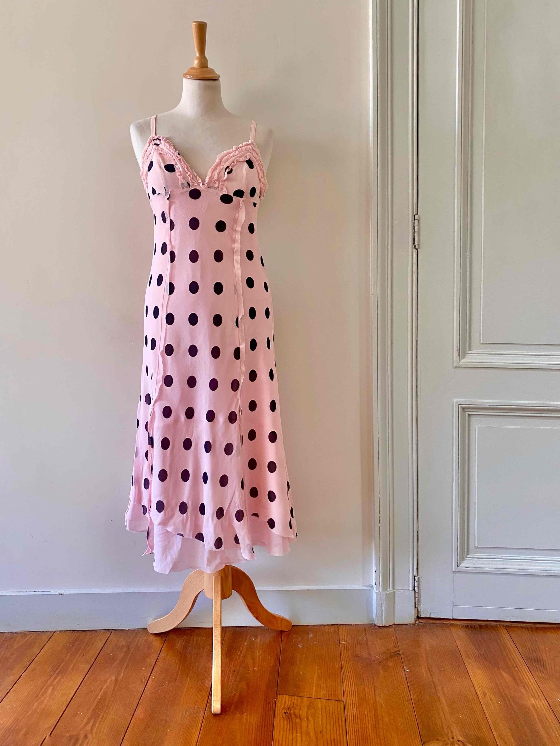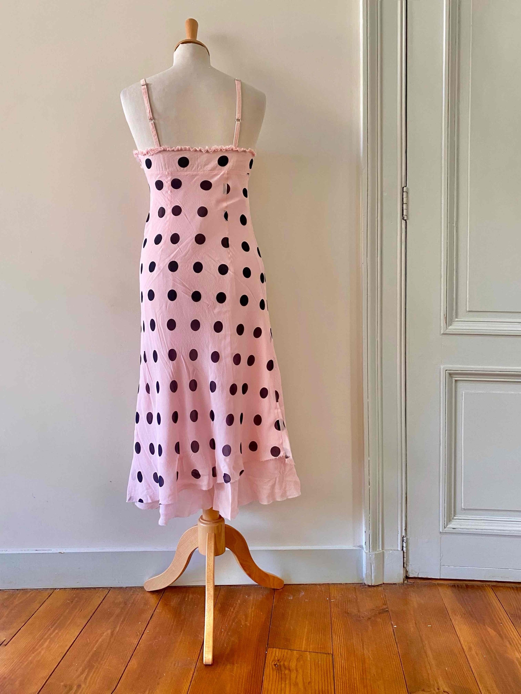 Prix unitaire parRobe en soie à pois, mousseline de soie rose pastel imprimée gros pois noirs, bretelles fines réglables, poitrine en triangles à frous-frous volantés, finitions bords francs frangés, fit and flare, fermeture éclaire sur le côté, fabriquée en Italie, taille 36 portée ici sur un mannequin T36, aisselles 43cm.