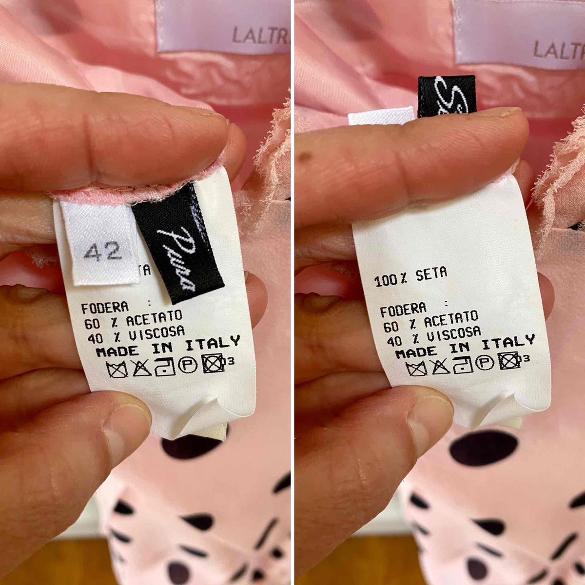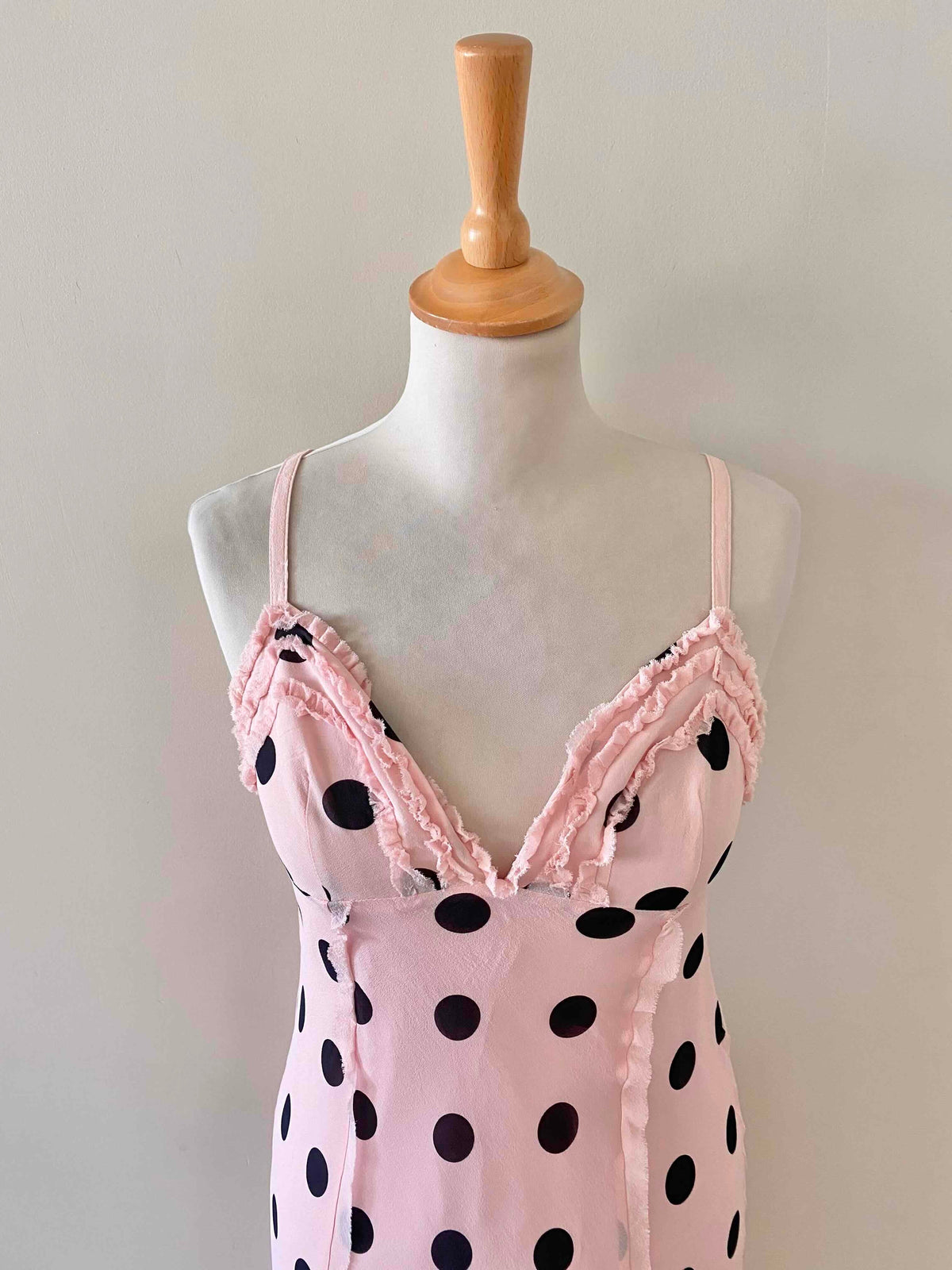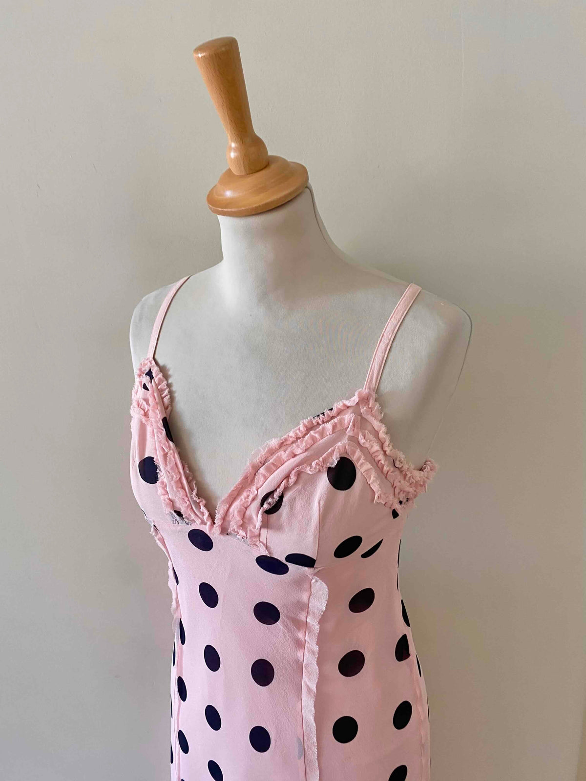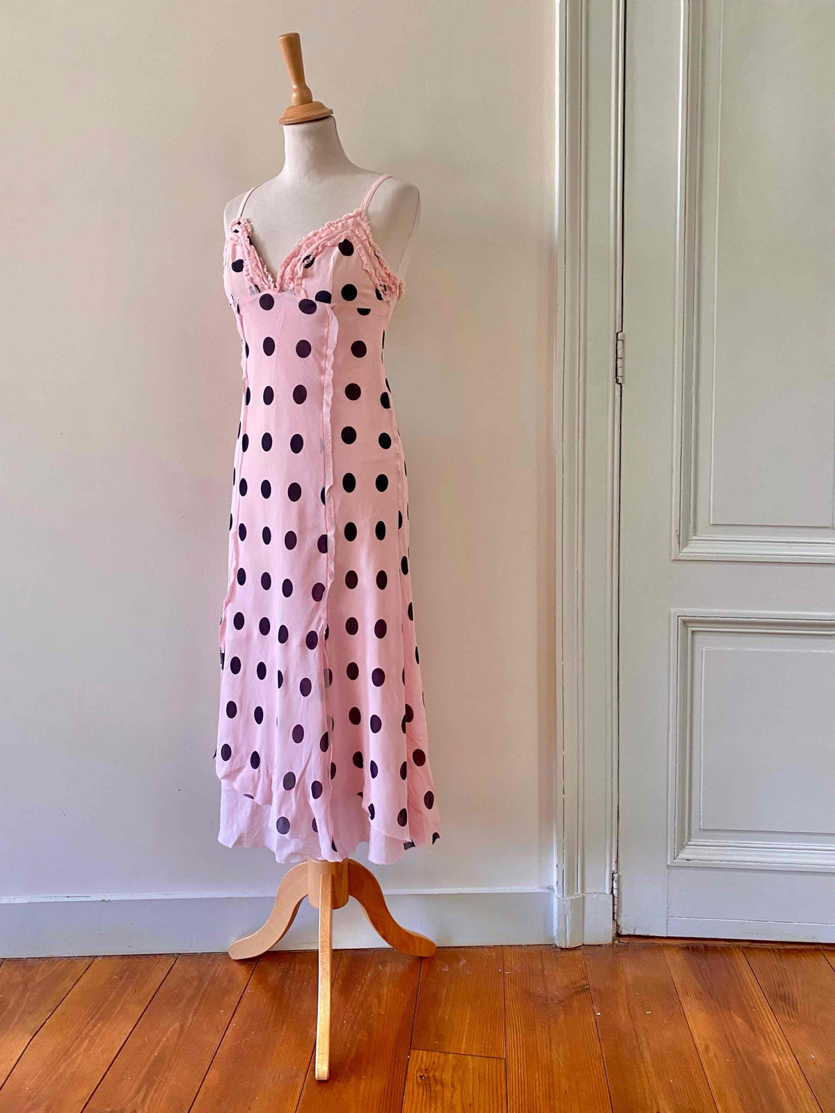 Prix unitaire parRobe en soie à pois, mousseline de soie rose pastel imprimée gros pois noirs, bretelles fines réglables, poitrine en triangles à frous-frous volantés, finitions bords francs frangés, fit and flare, fermeture éclaire sur le côté, fabriquée en Italie, taille 36 portée ici sur un mannequin T36, aisselles 43cm.