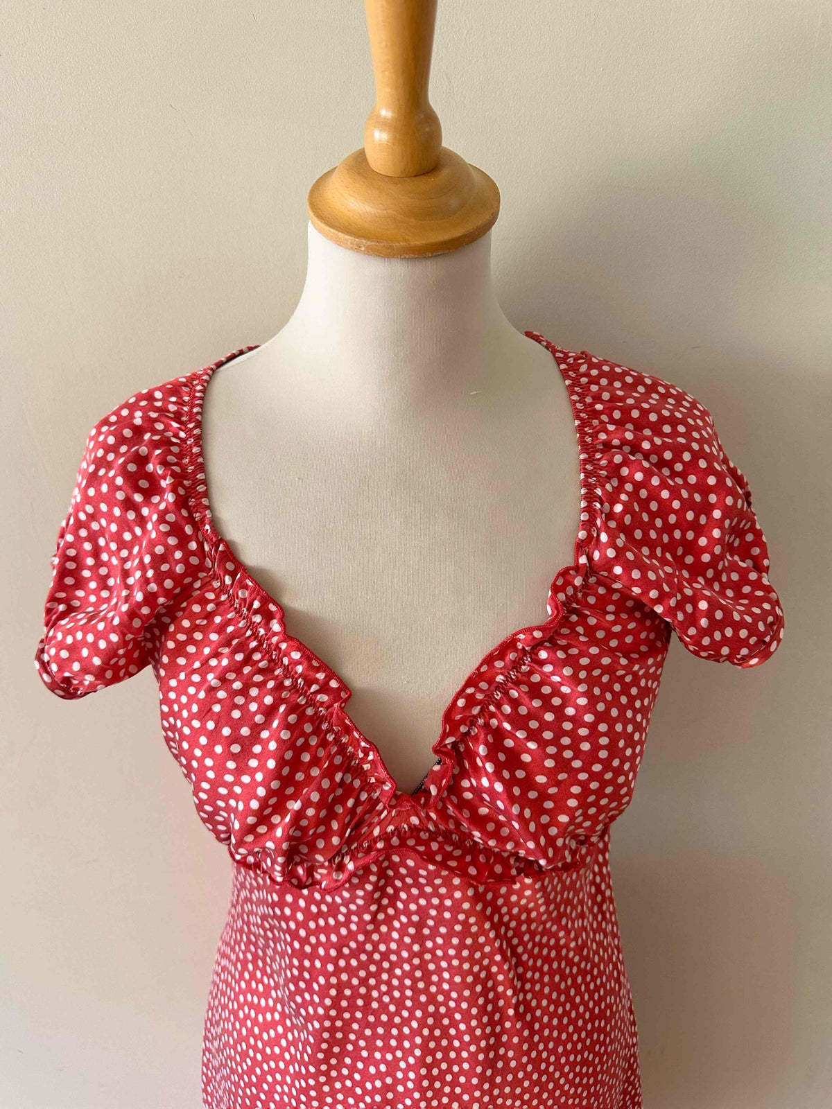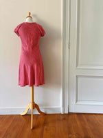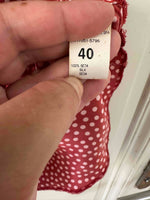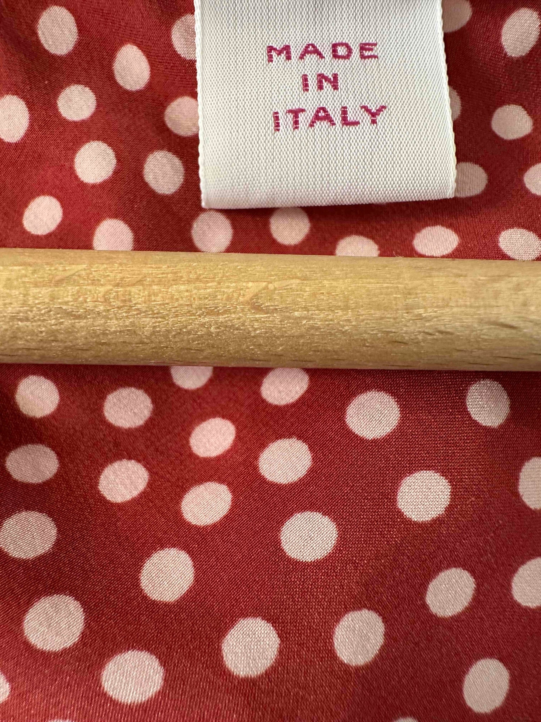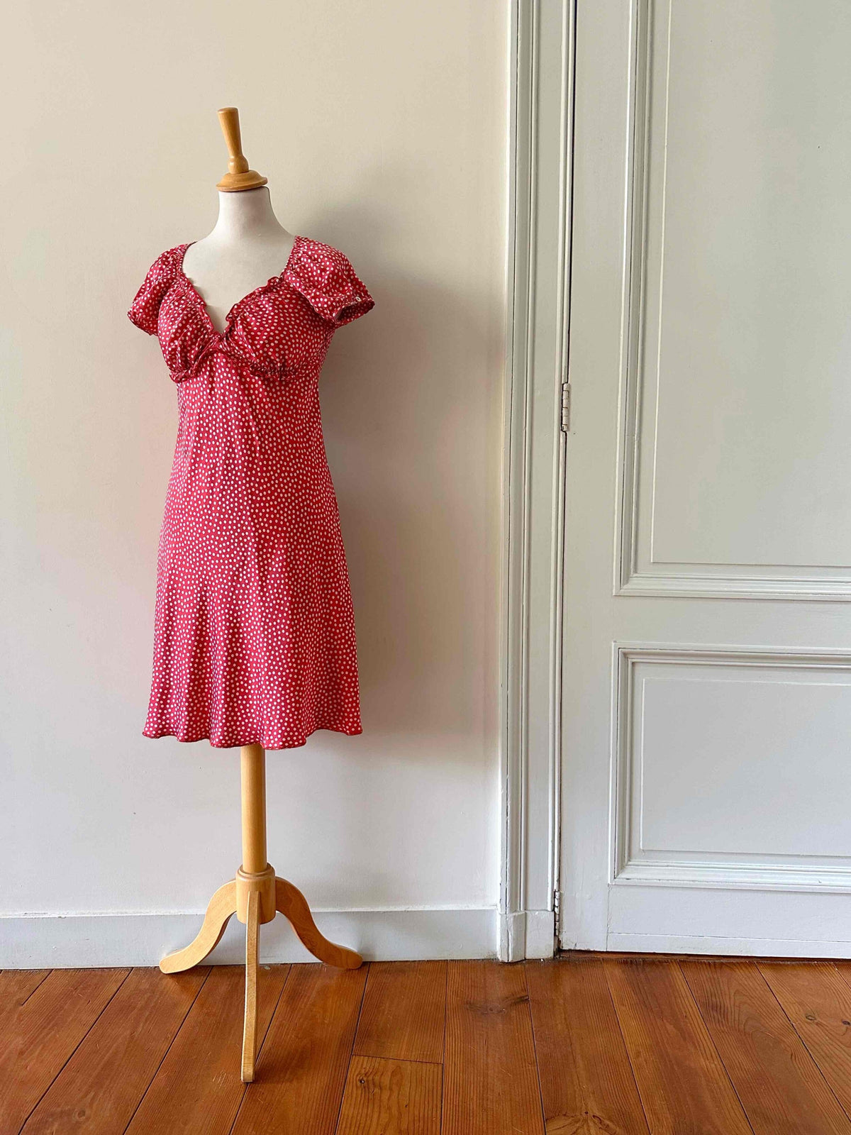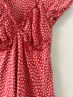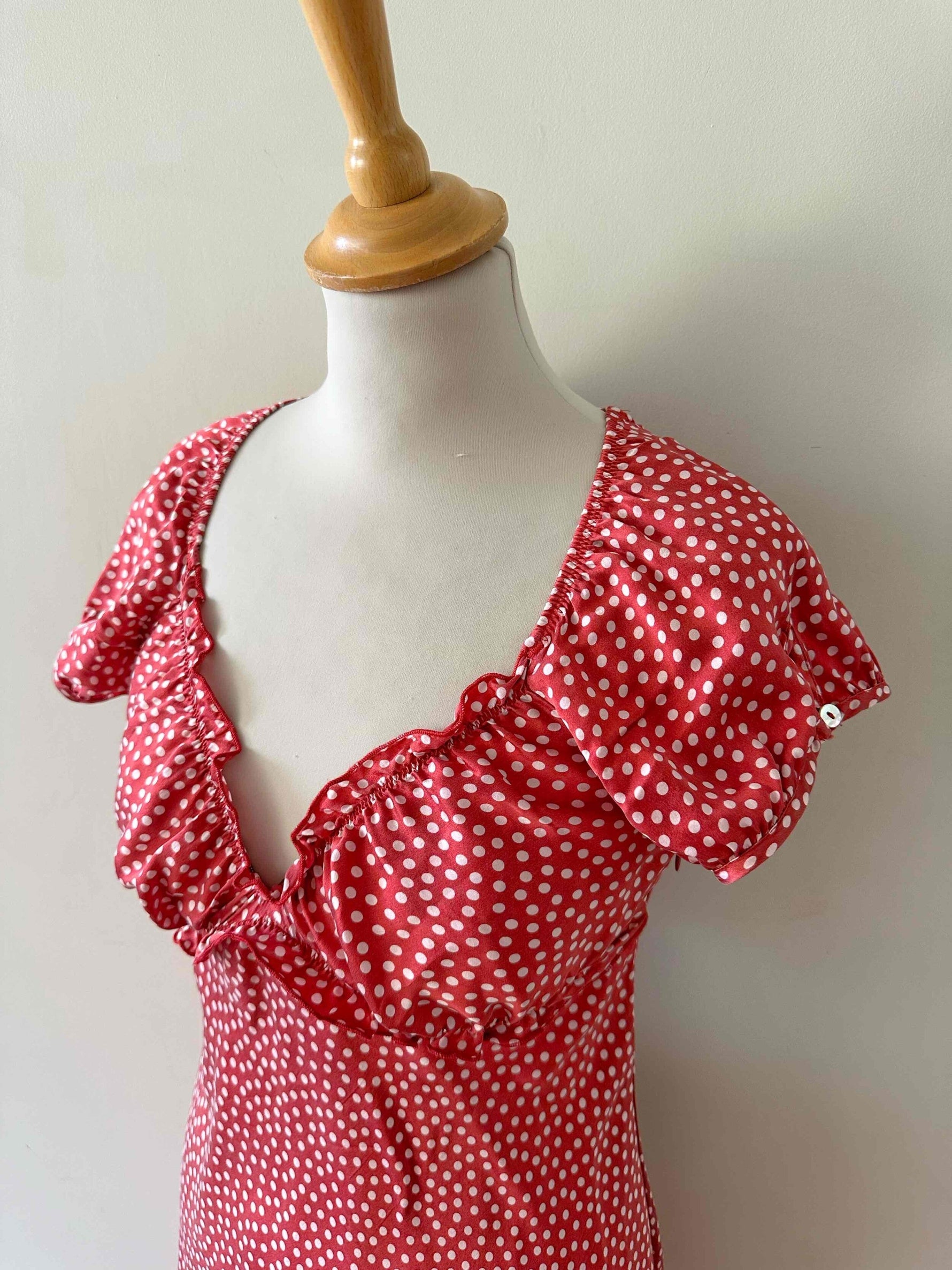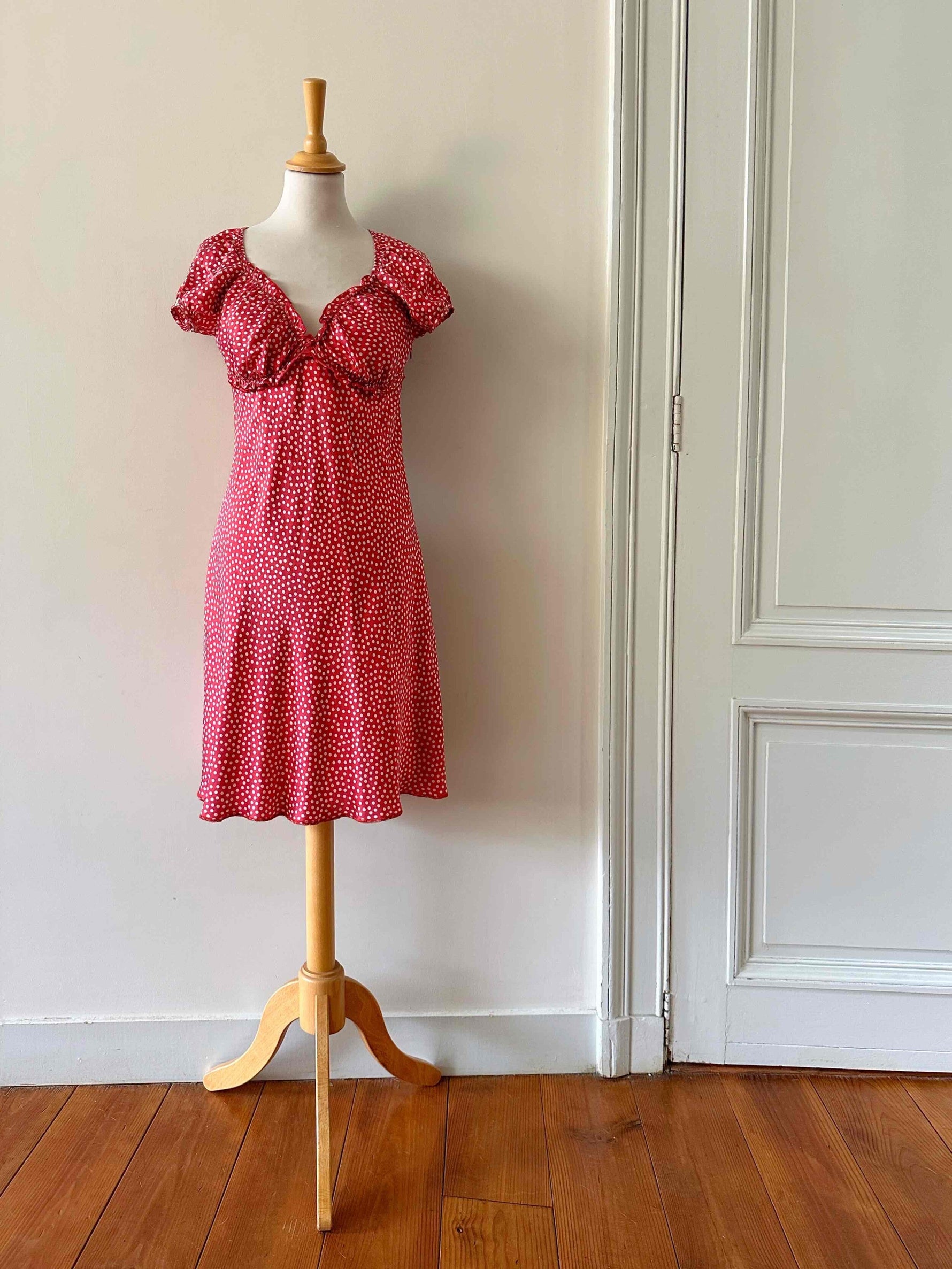Prix unitaire parRobe en soie à pois, en satin de soie rouge à pois roses, manches ballons, encolure et découpes sous poitrine à froufrous élastiques, fermeture éclair côté, fabriquée en Italie, taille 34 portée ici sur un mannequin T36, aisselles 42cm.