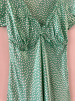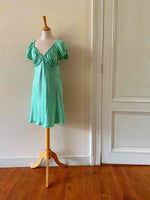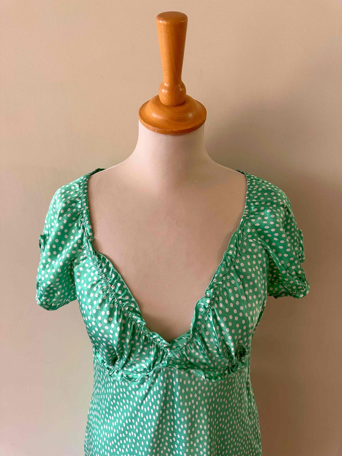 Prix unitaire parRobe en soie à pois, en satin de soie vert turquoise à pois blancs, manches ballons, encolure et découpes sous poitrine à froufrous élastiques, fermeture éclair côté, fabriquée en Italie, taille 36 portée ici sur un mannequin T36, aisselles 43cm.