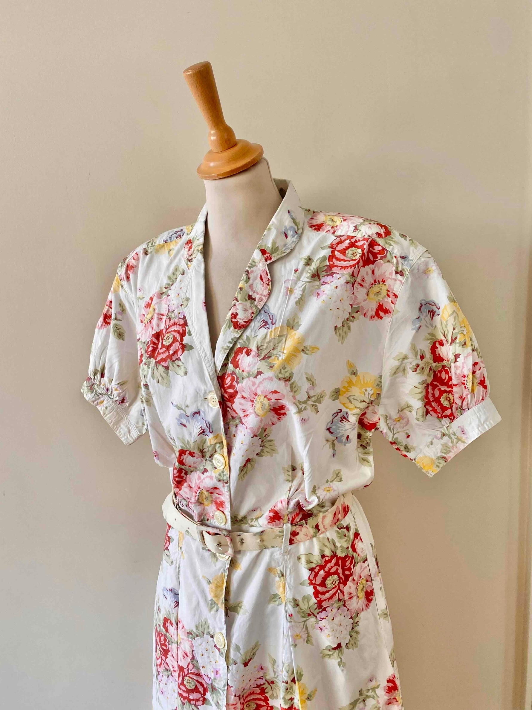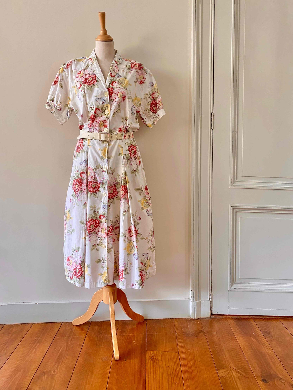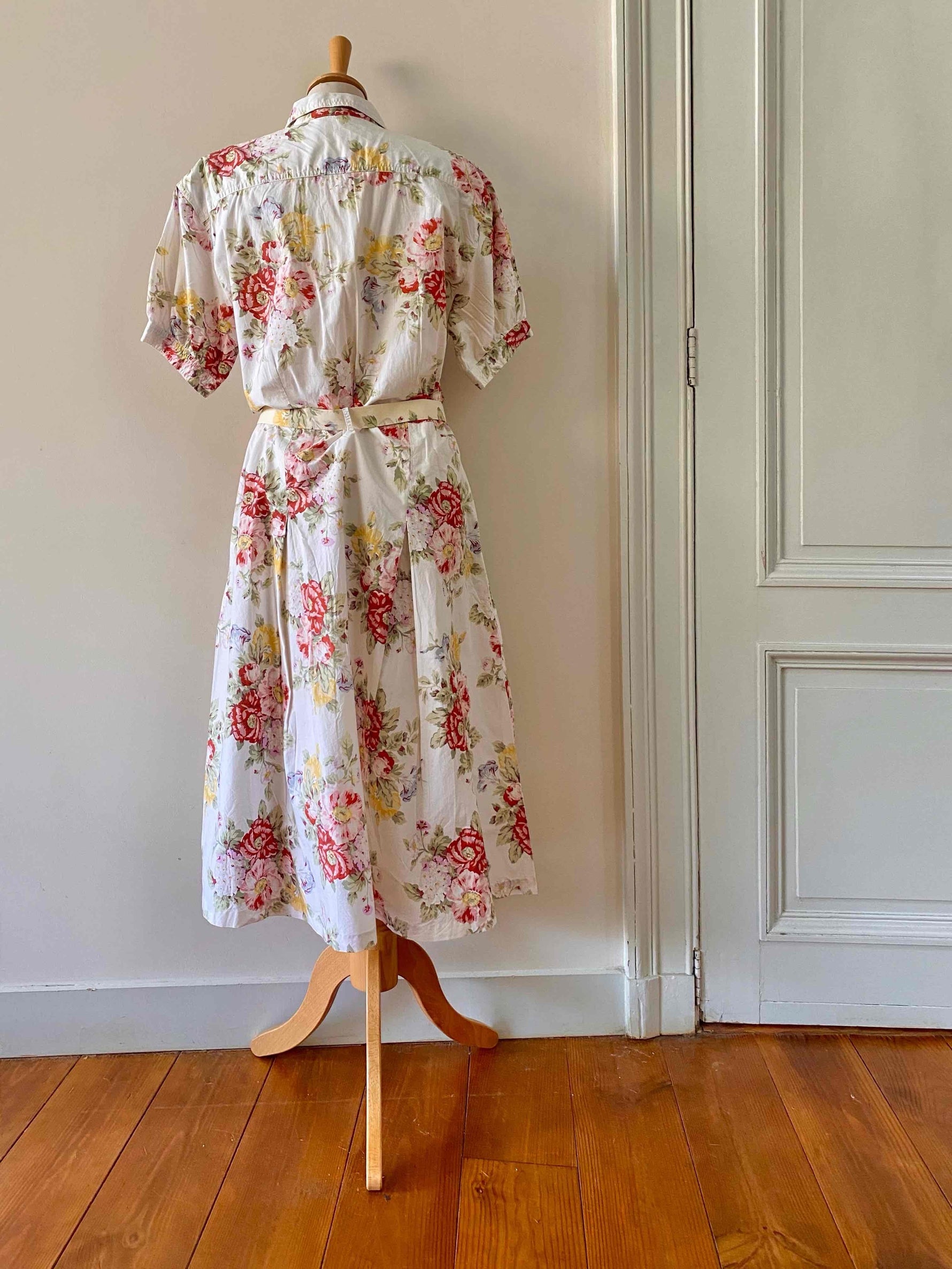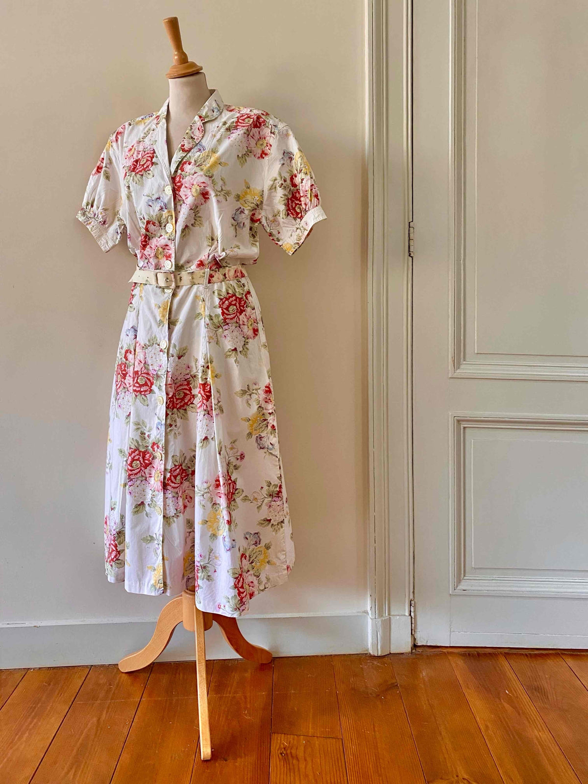 Prix unitaire parRobe fleurie en coton, forme robe chemise, avec ceinture taille, manches ballons épaulettes fines, 100% coton blanc imprimée fleurs tapissières multicolores pastelles, fabriquée en France, taille 38 portée ici sur un mannequin T36, aisselles 46cm.