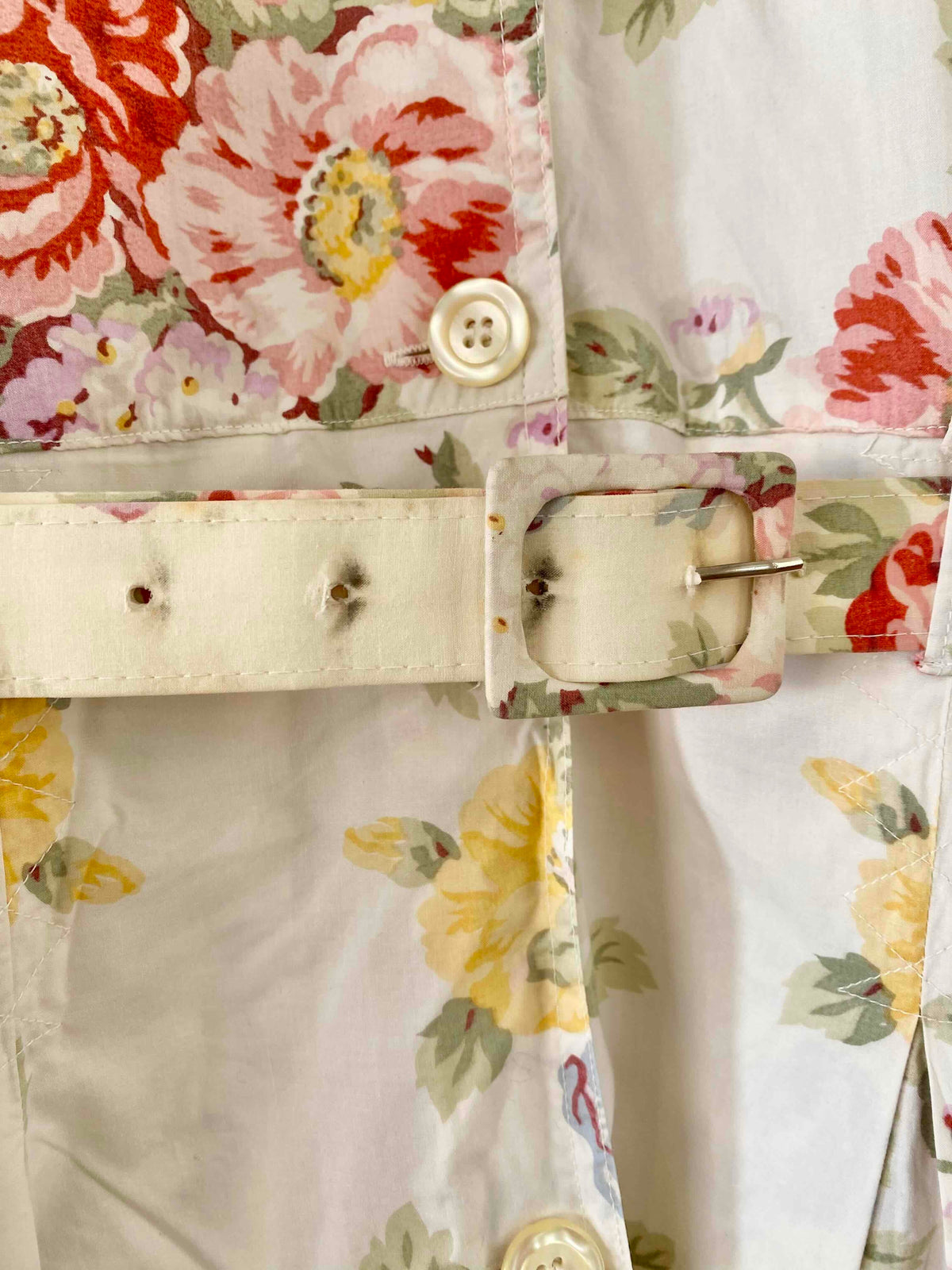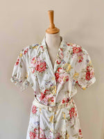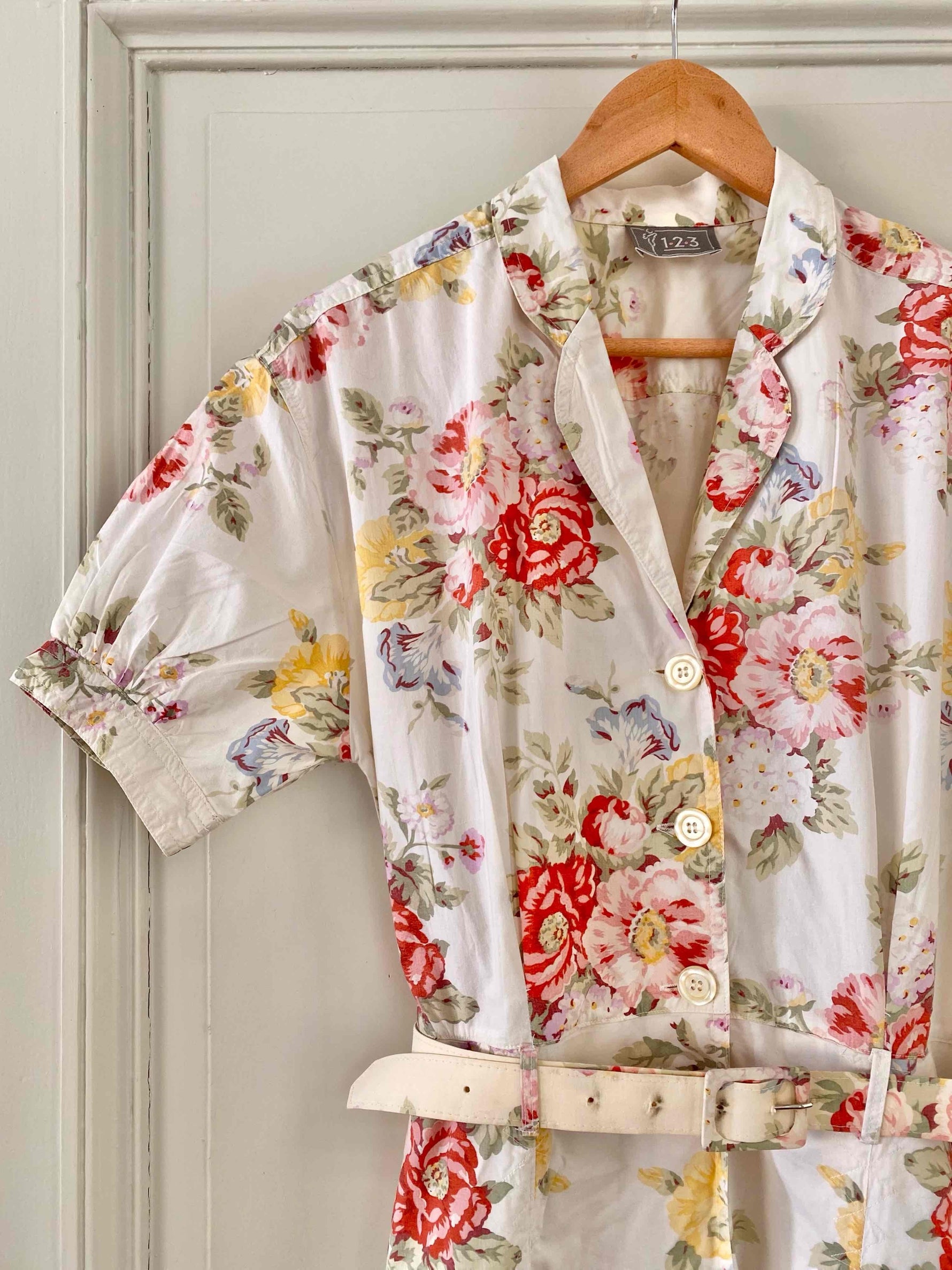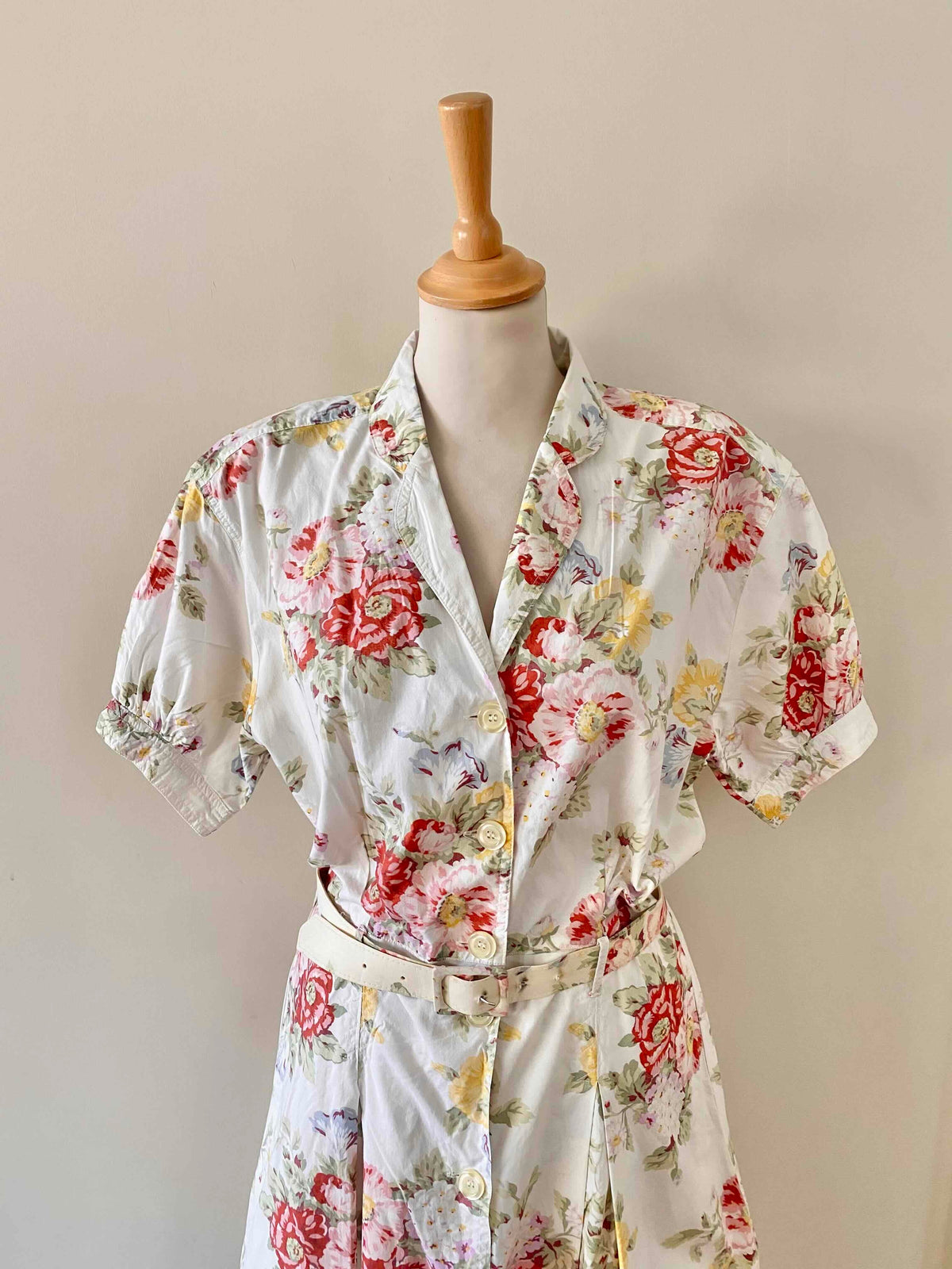 Prix unitaire parRobe fleurie en coton, forme robe chemise, avec ceinture taille, manches ballons épaulettes fines, 100% coton blanc imprimée fleurs tapissières multicolores pastelles, fabriquée en France, taille 38 portée ici sur un mannequin T36, aisselles 46cm.
