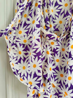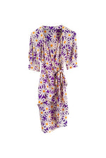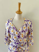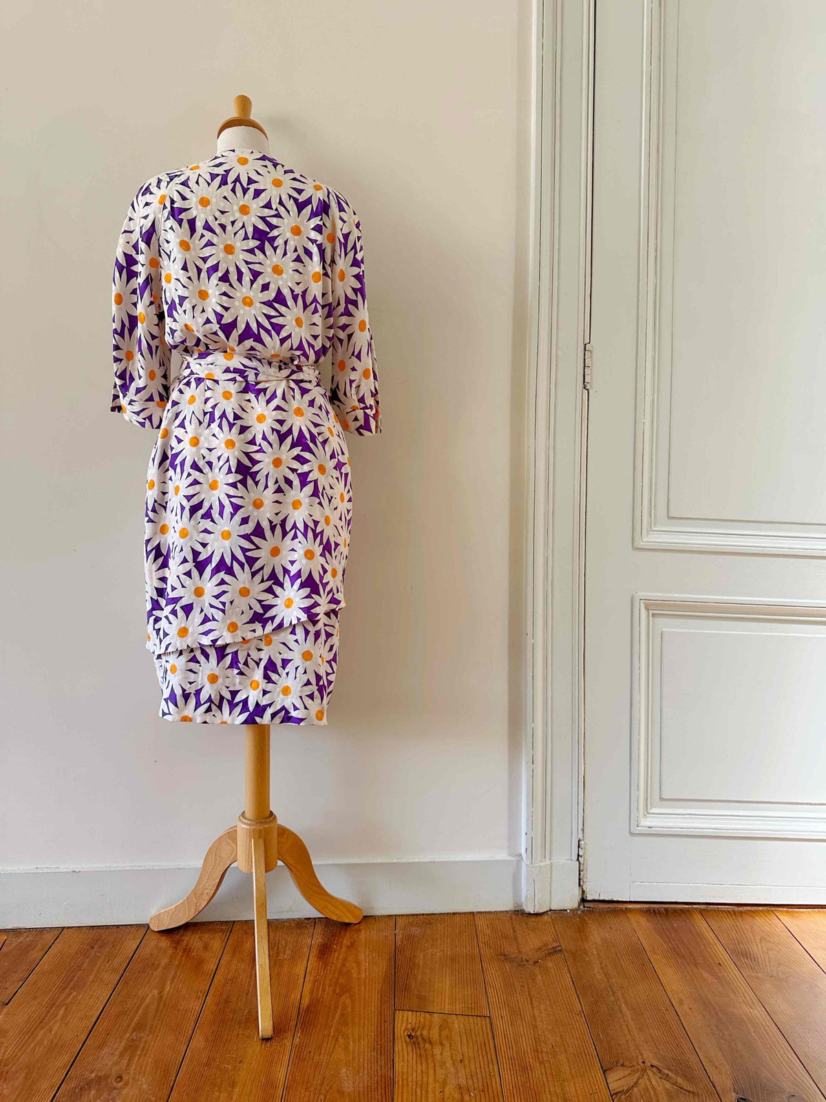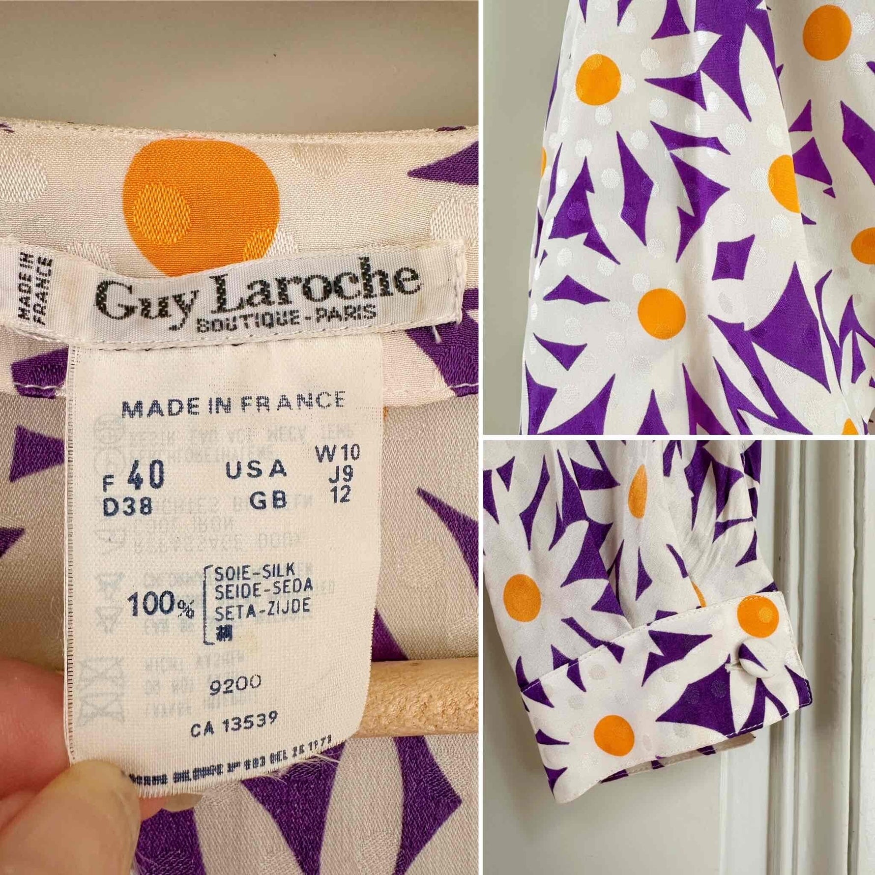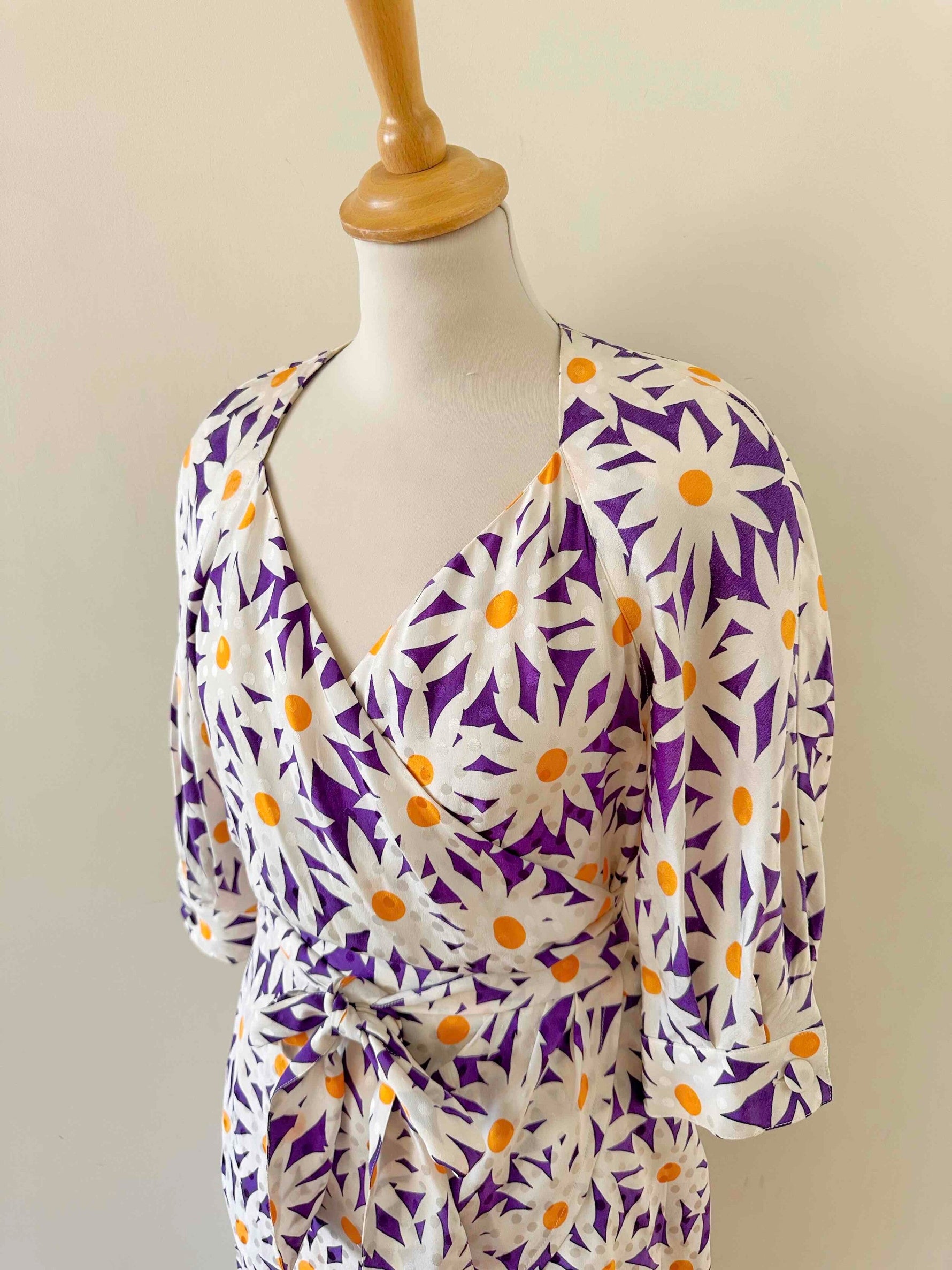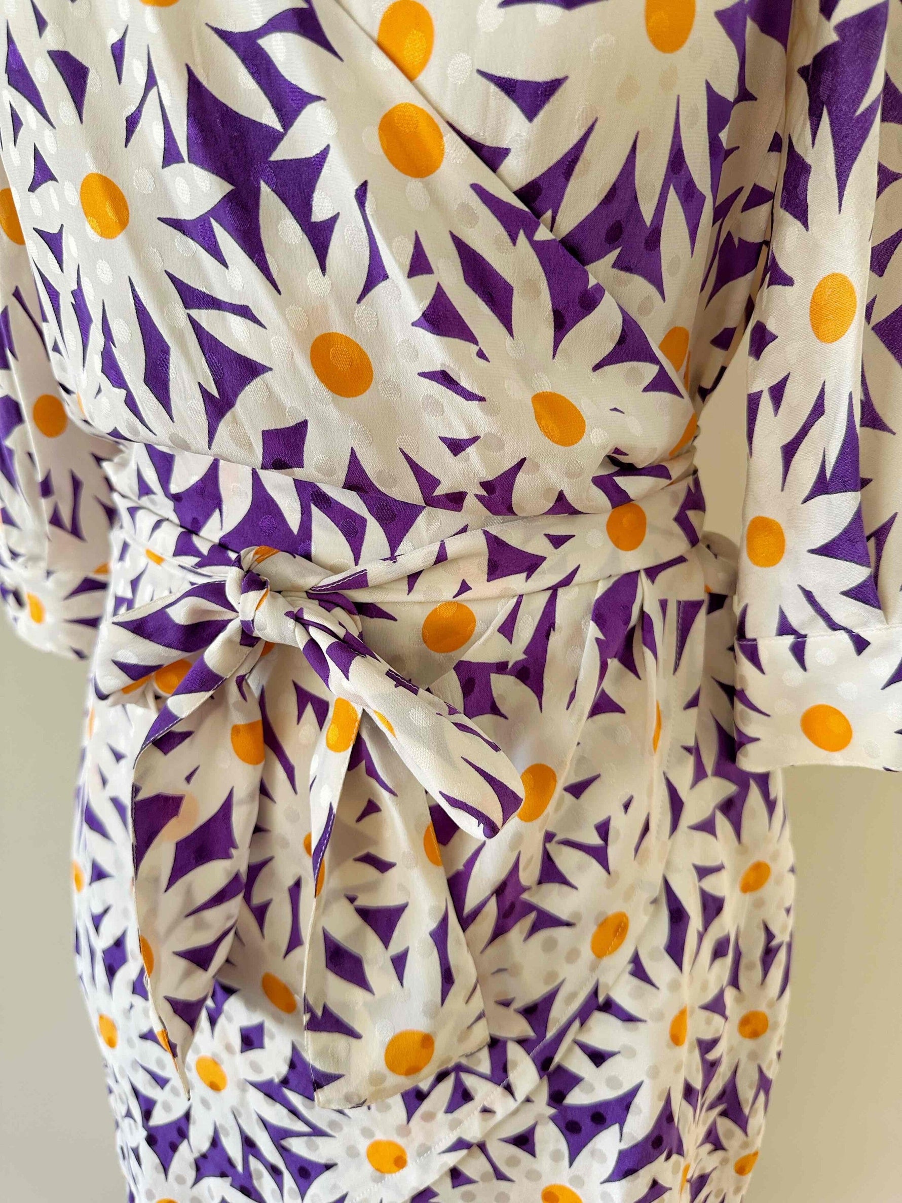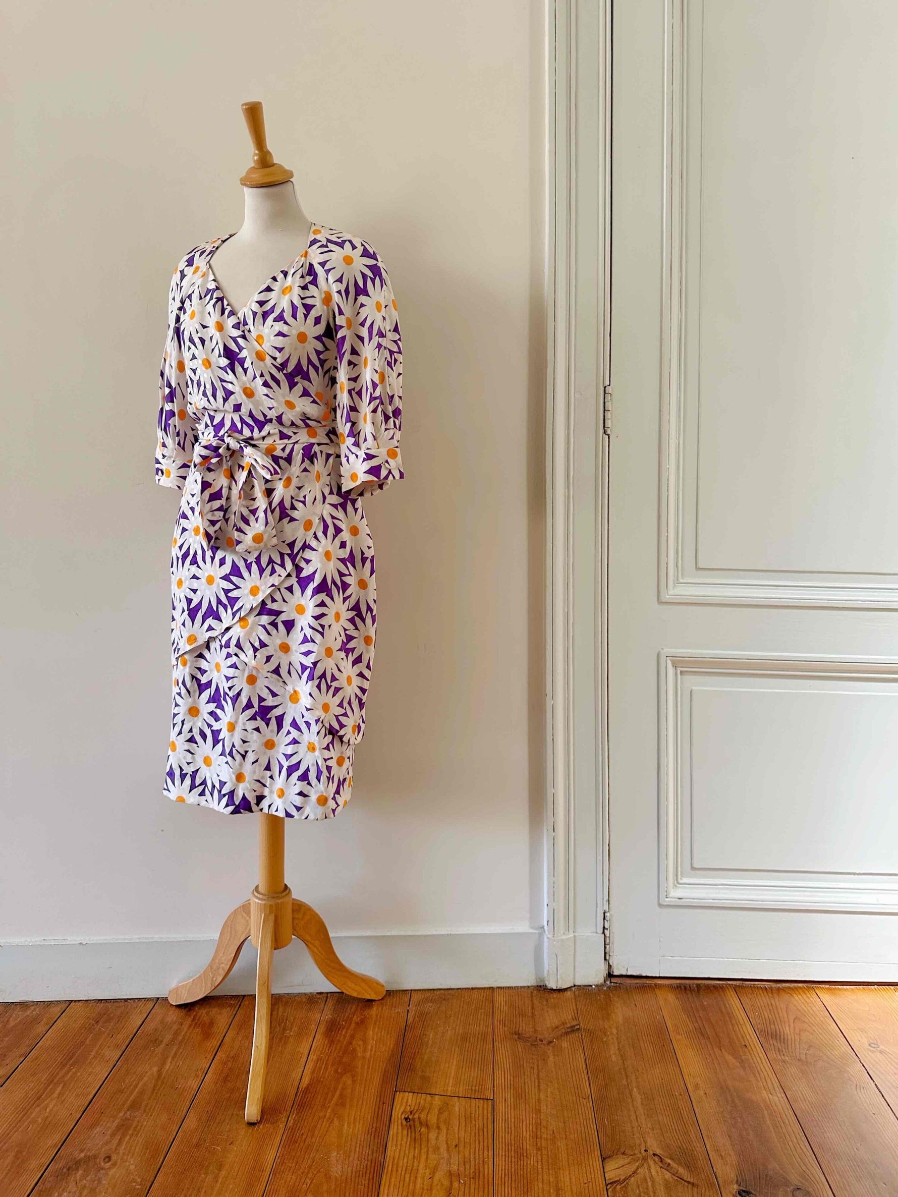 Prix unitaire parRobe portefeuille en soie Guy Laroche, en plumetis de soie pois blanc et imprimé motifs marguerites violettes, blanches et jaunes. Forme portefeuille cache coeur en haut à nouer par une longue ceinture, partie jupe à fermeture éclair à la taille. Manches ballons 3/4. Fabriquée en France, taille 36 portée ici sur un mannequin T36.