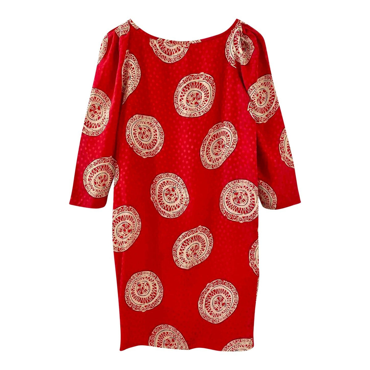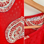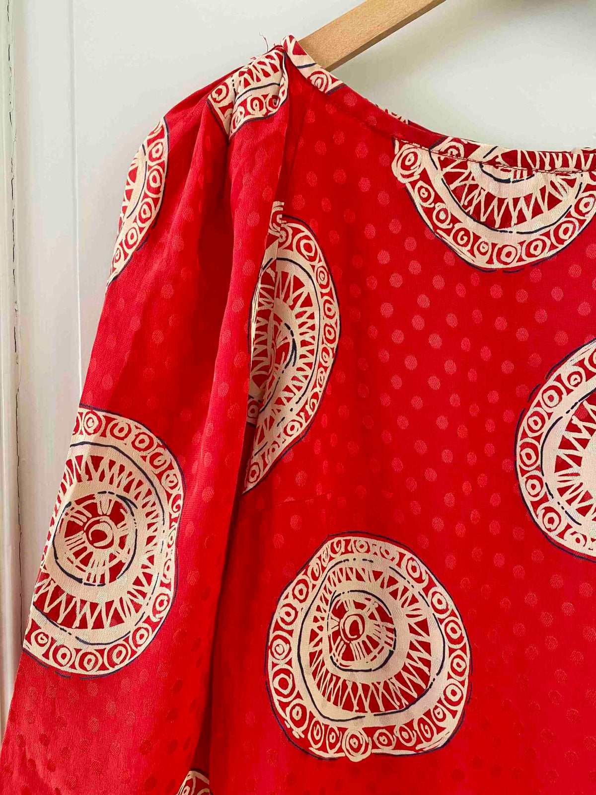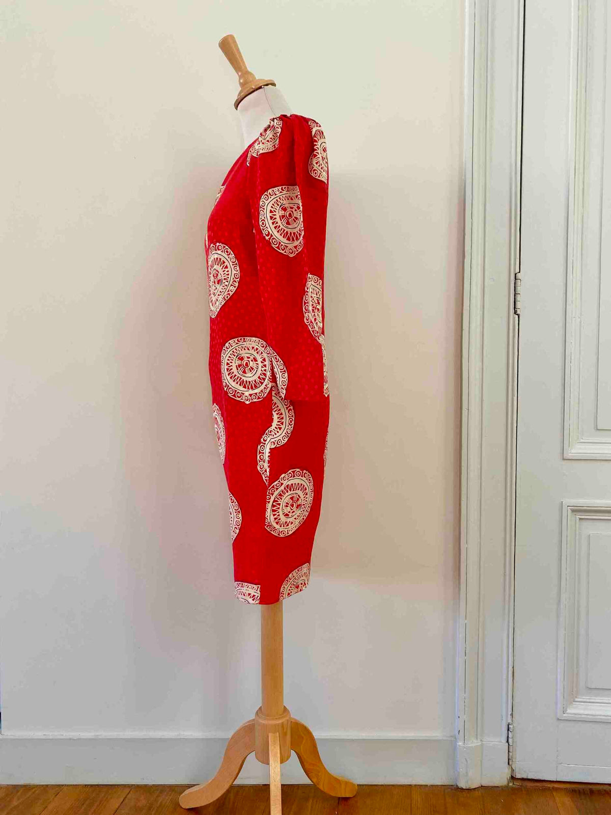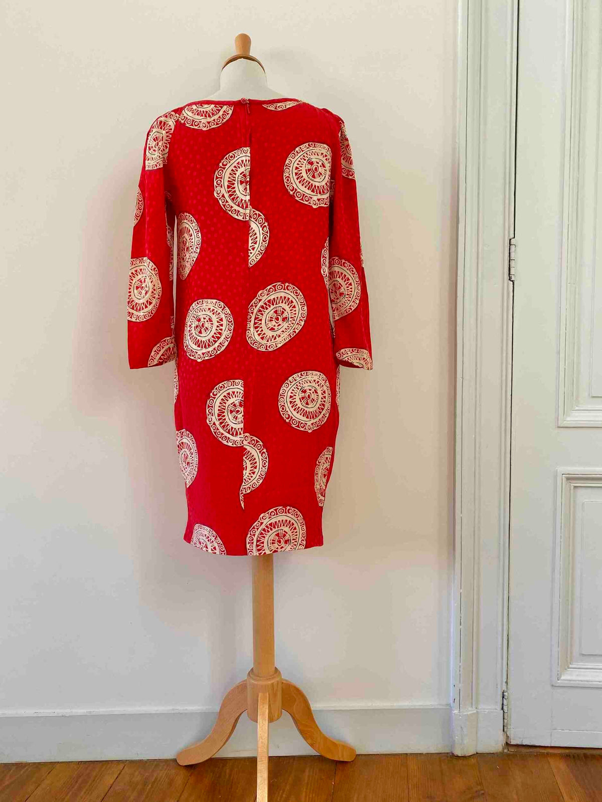 Prix unitaire parRobe en Soie Guy Laroche rouge vermillon plumetis de soie pois, motifs foulards roues, manches raglans, épaules ballons froncées, encolure bateau, fabriquée en France, aisselles 44cm