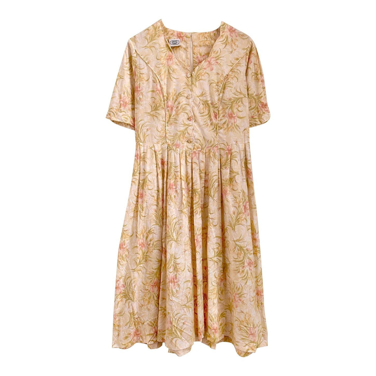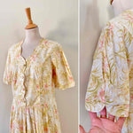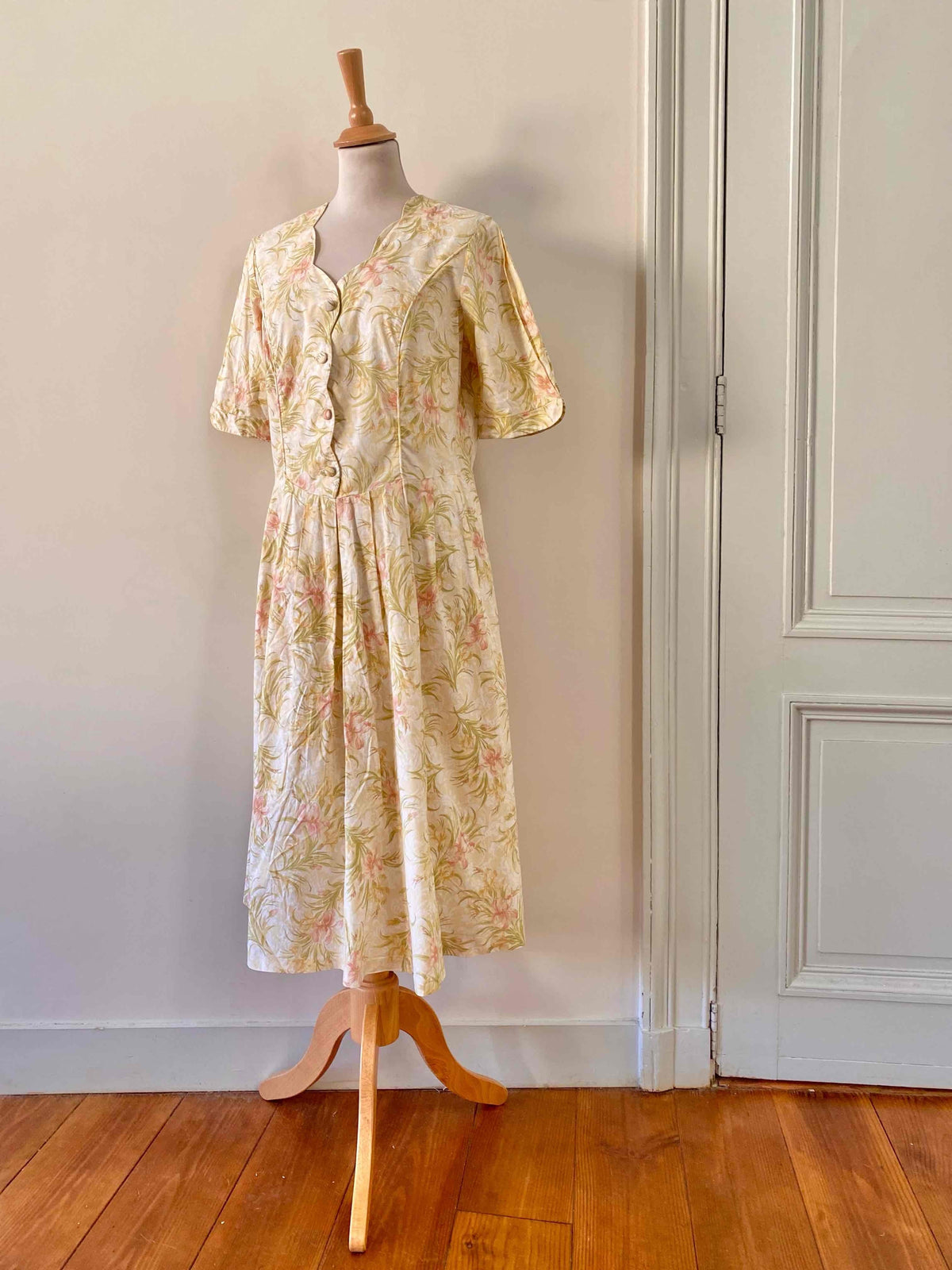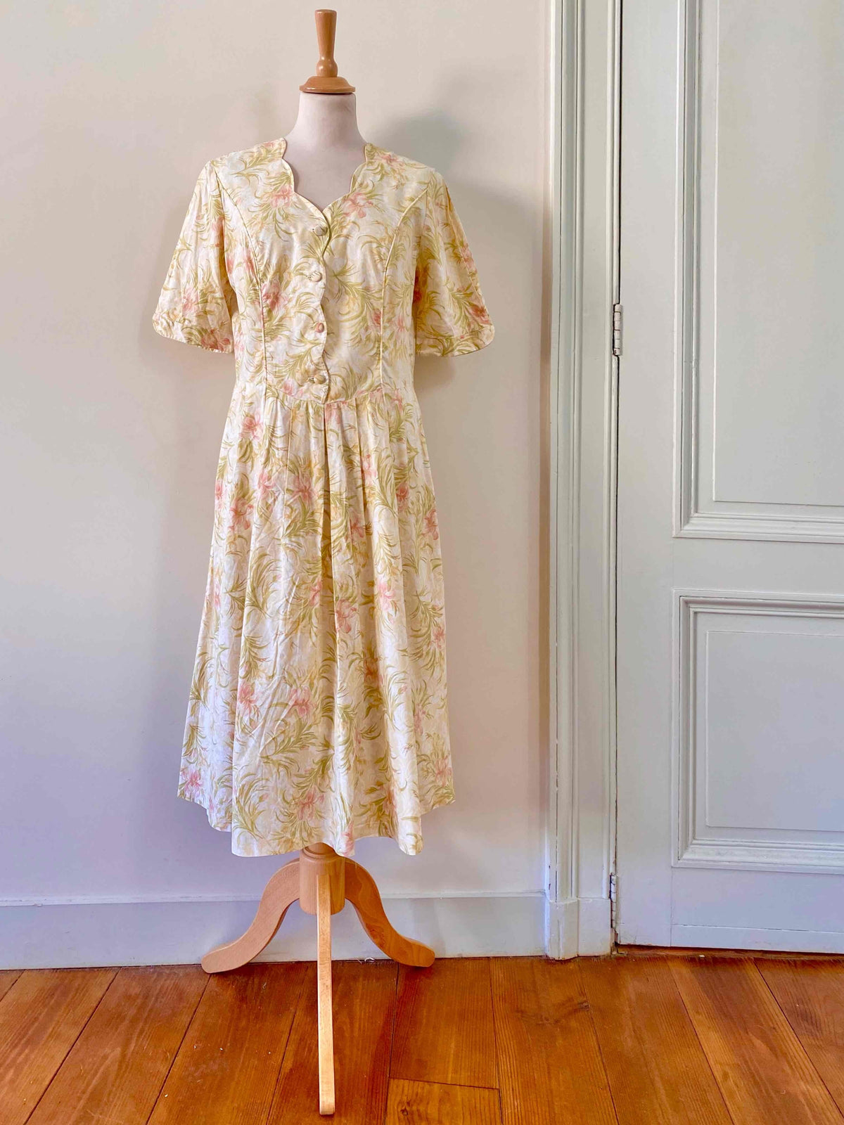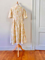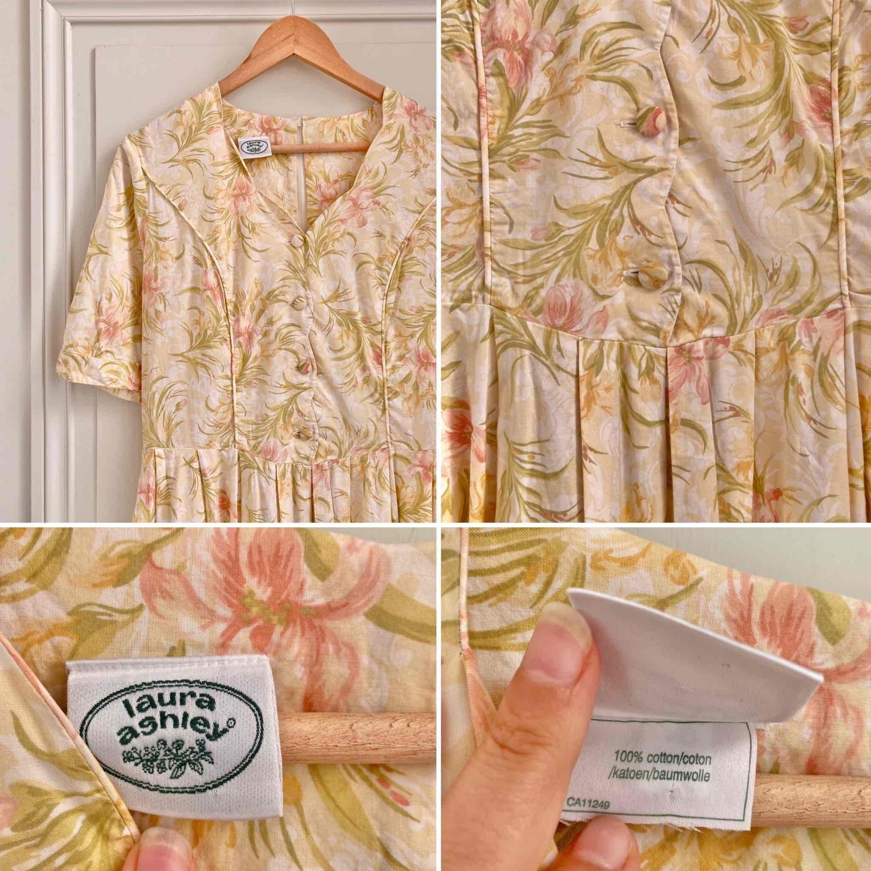 Prix unitaire parRobe Laura Ashley en 100% coton imprimée fleurs tapissières et tulipes rose pastel, jaune pastel, vert pastel, écru beige, encolure festonnée pétale, boutons recouverts devant, découpes princesses, manches ballon, taille froncée babydoll, fermeture éclair au dos, made in UK, taille 38 portée ici sur un mannequin T36, aisselles 48cm.
