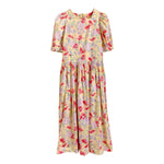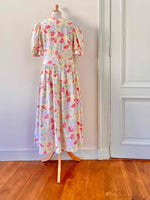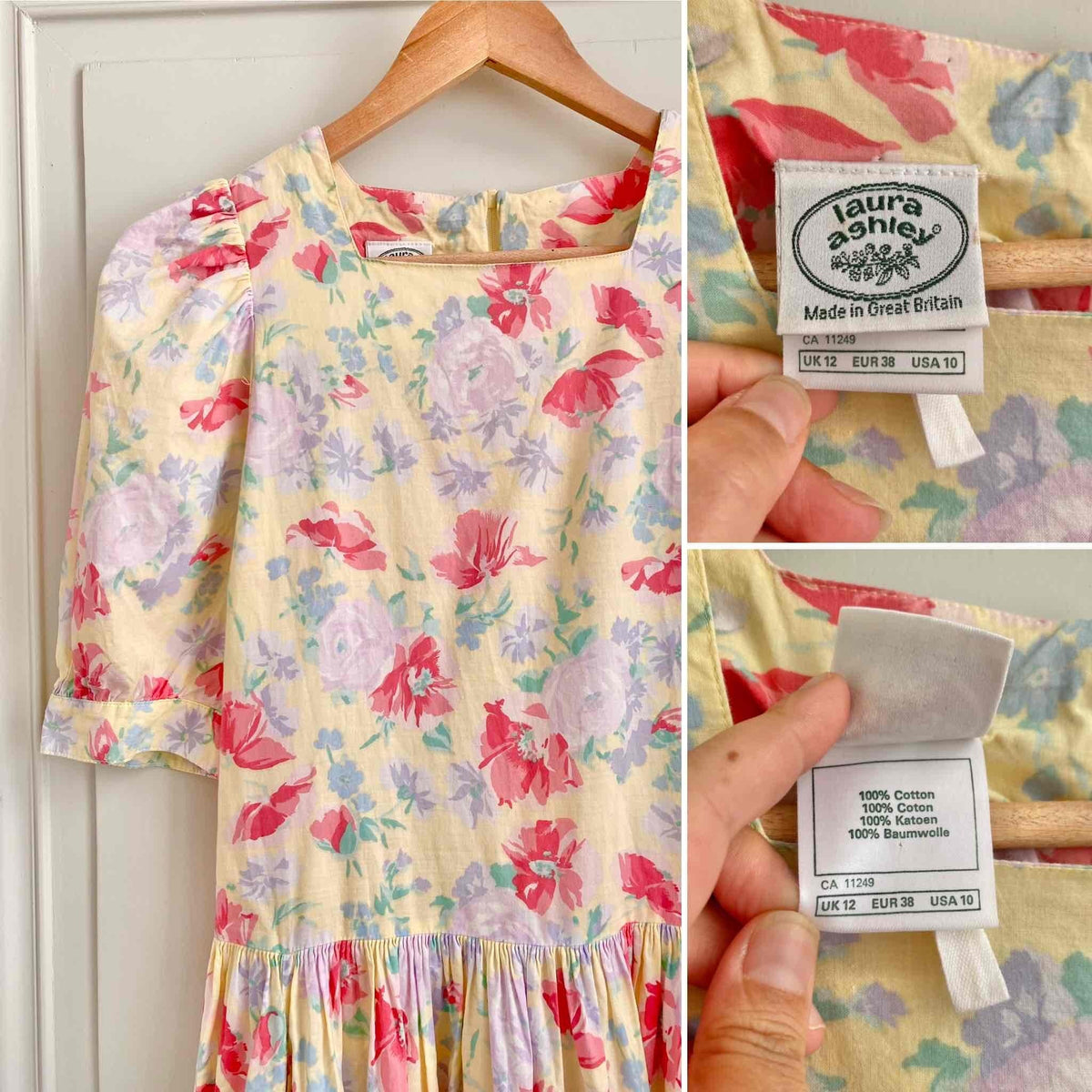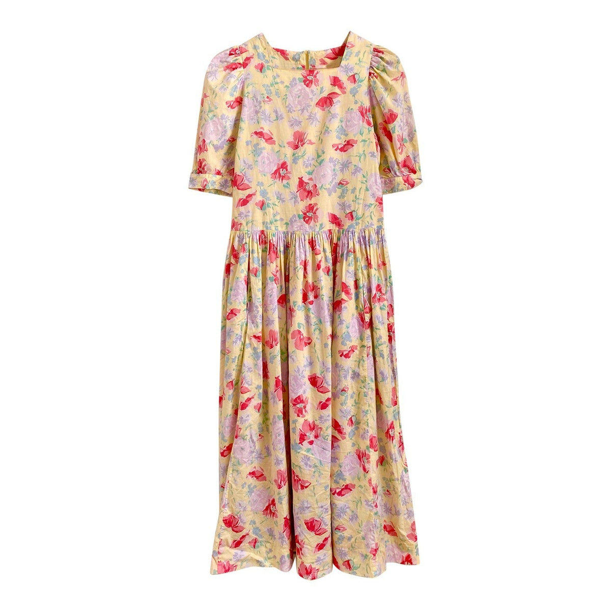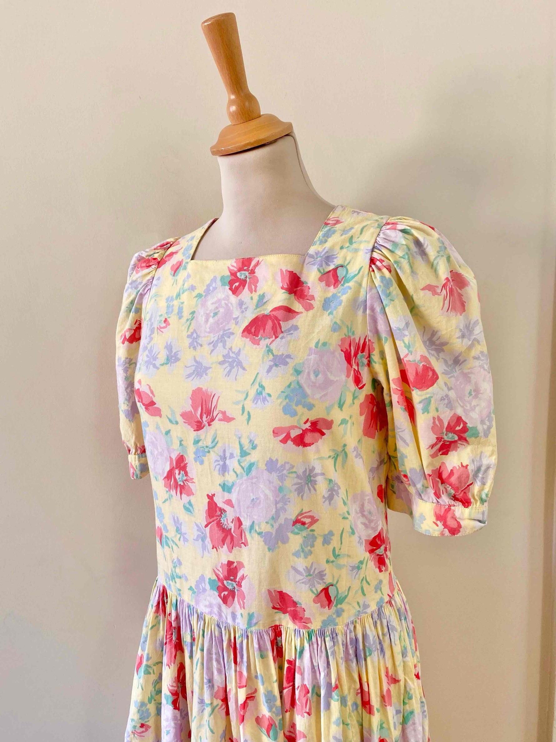 Prix unitaire parRobe longue Laura Ashley en 100% coton jaune pastel imprimée fleurs lilas, roses, et vertes, encolure carrée, manches ballons, taille babydoll jupon froncé, fabriquée au UK, taille actuelle 36 portée ici sur un mannequin T36, aisselles 44cm.