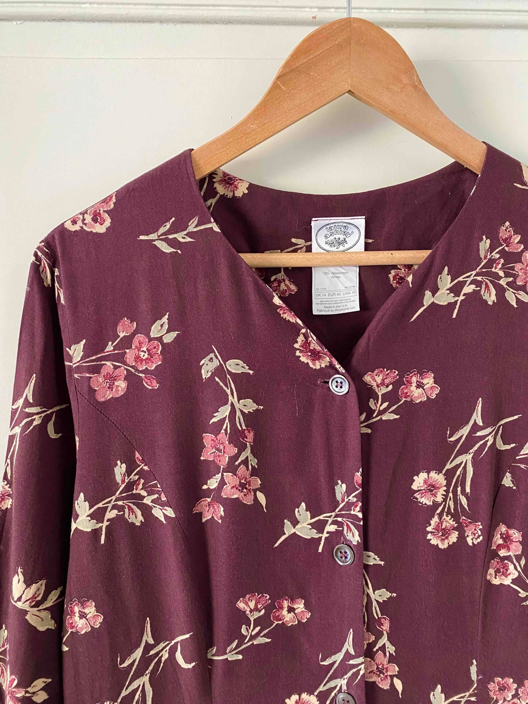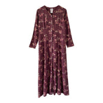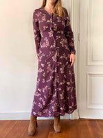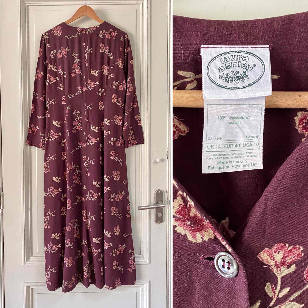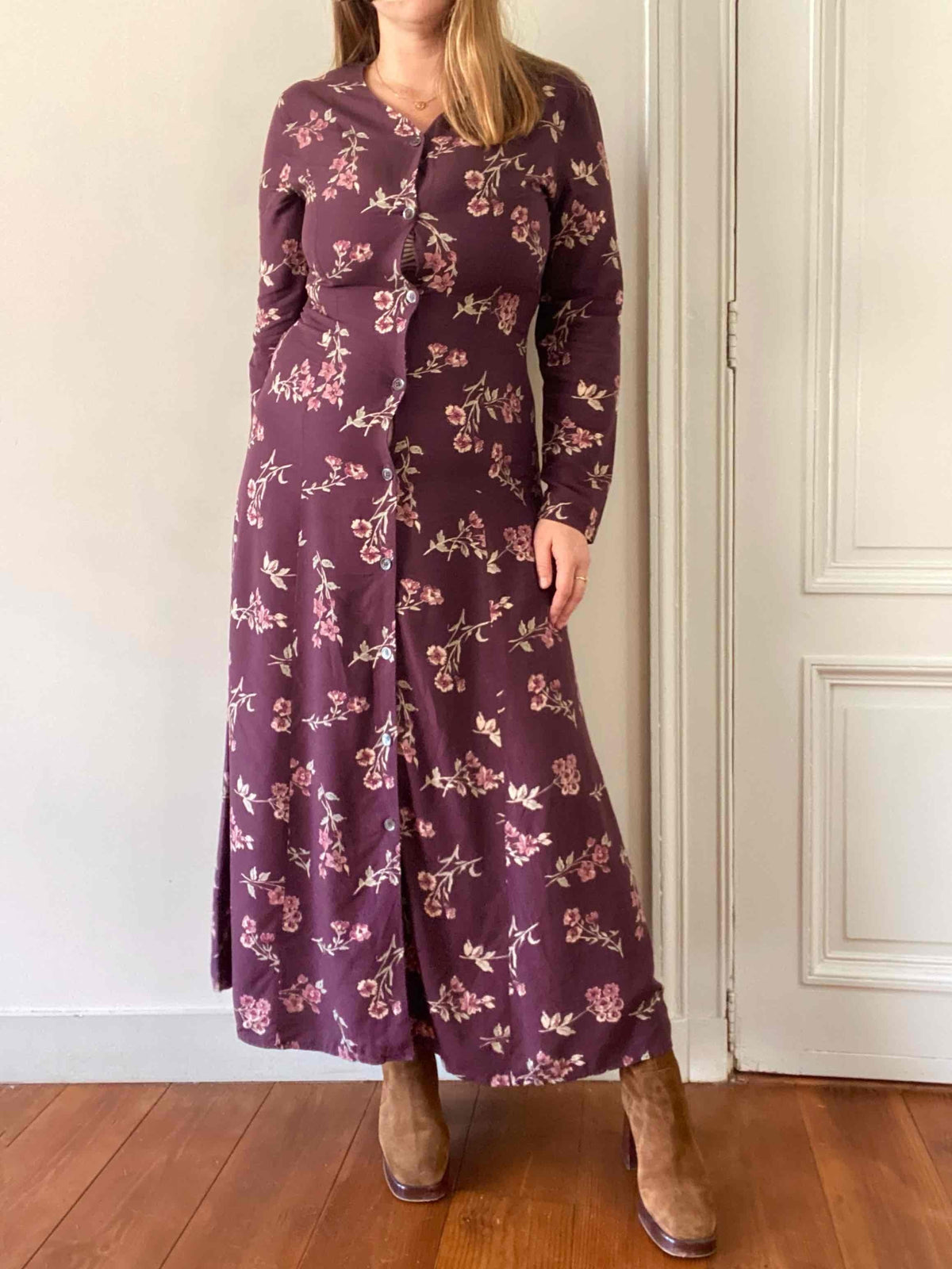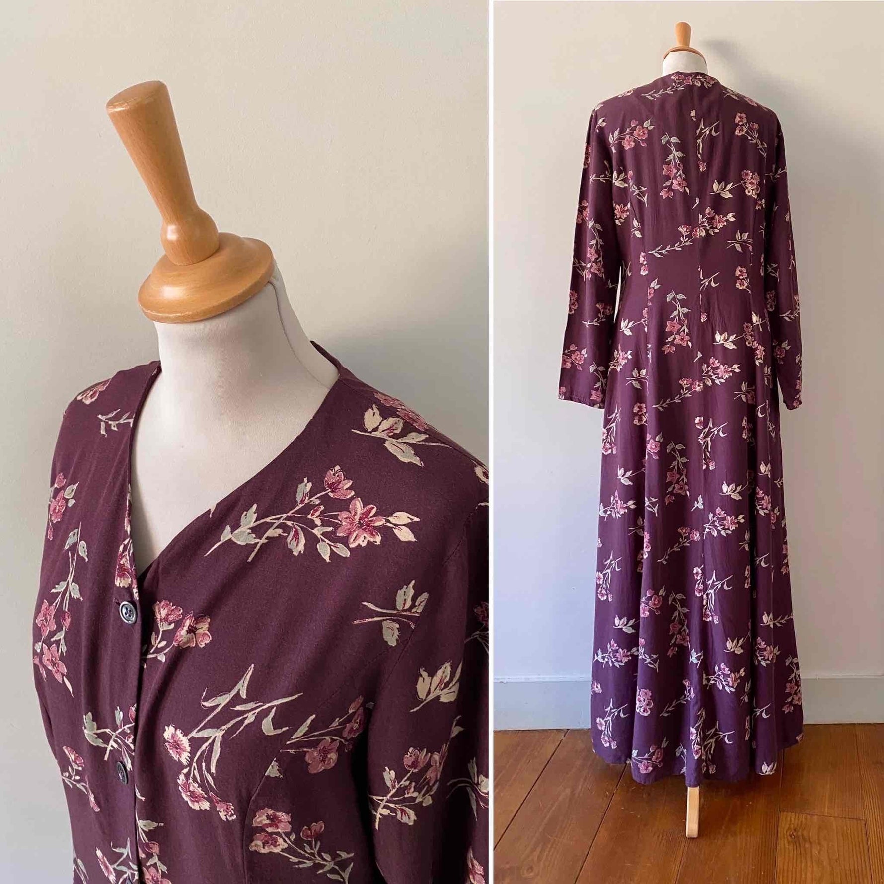Prix unitaire parRobe Laura Ashley, longue en viscose, à fleurs violet prune, roses et vert pastel, boutonnée, col V et manches longue, fabriquée en Angleterre, taille actuelle 38, portée ici sur un mannequin taille 36 et serrée sur une personne taille 40.