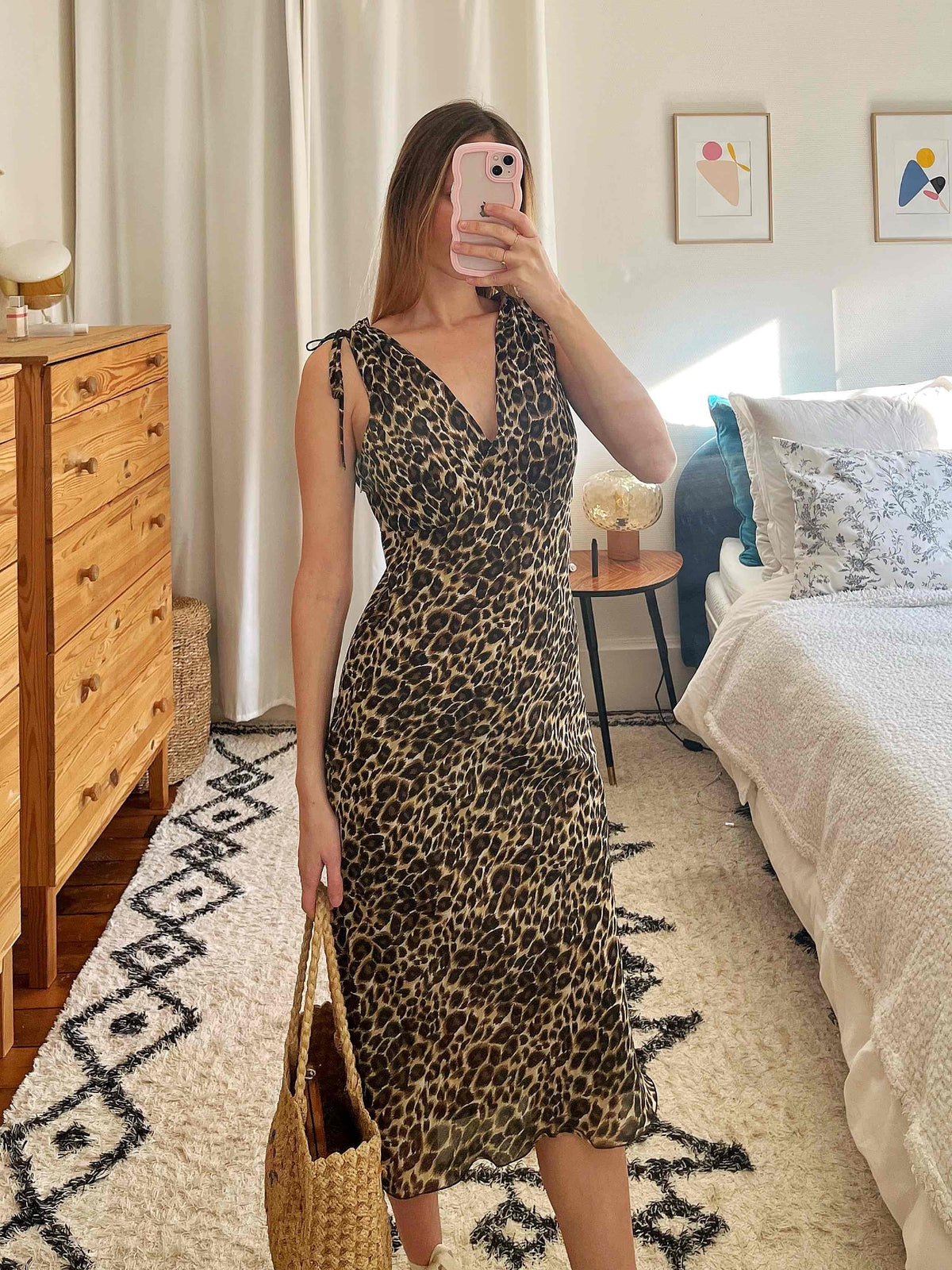 Prix unitaire parRobe imprimé léopard, longueur midi, noeuds au niveau des épaules, décolleté plongeant, tissu fluide qui suit les courbes, aucune transparence. Porté ici sur une T36 pour 1M64.