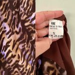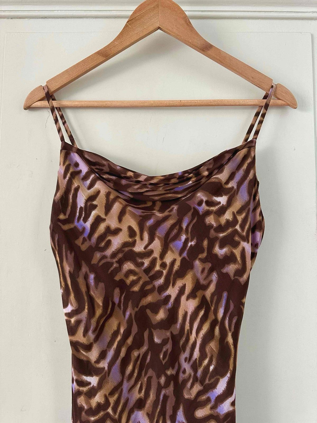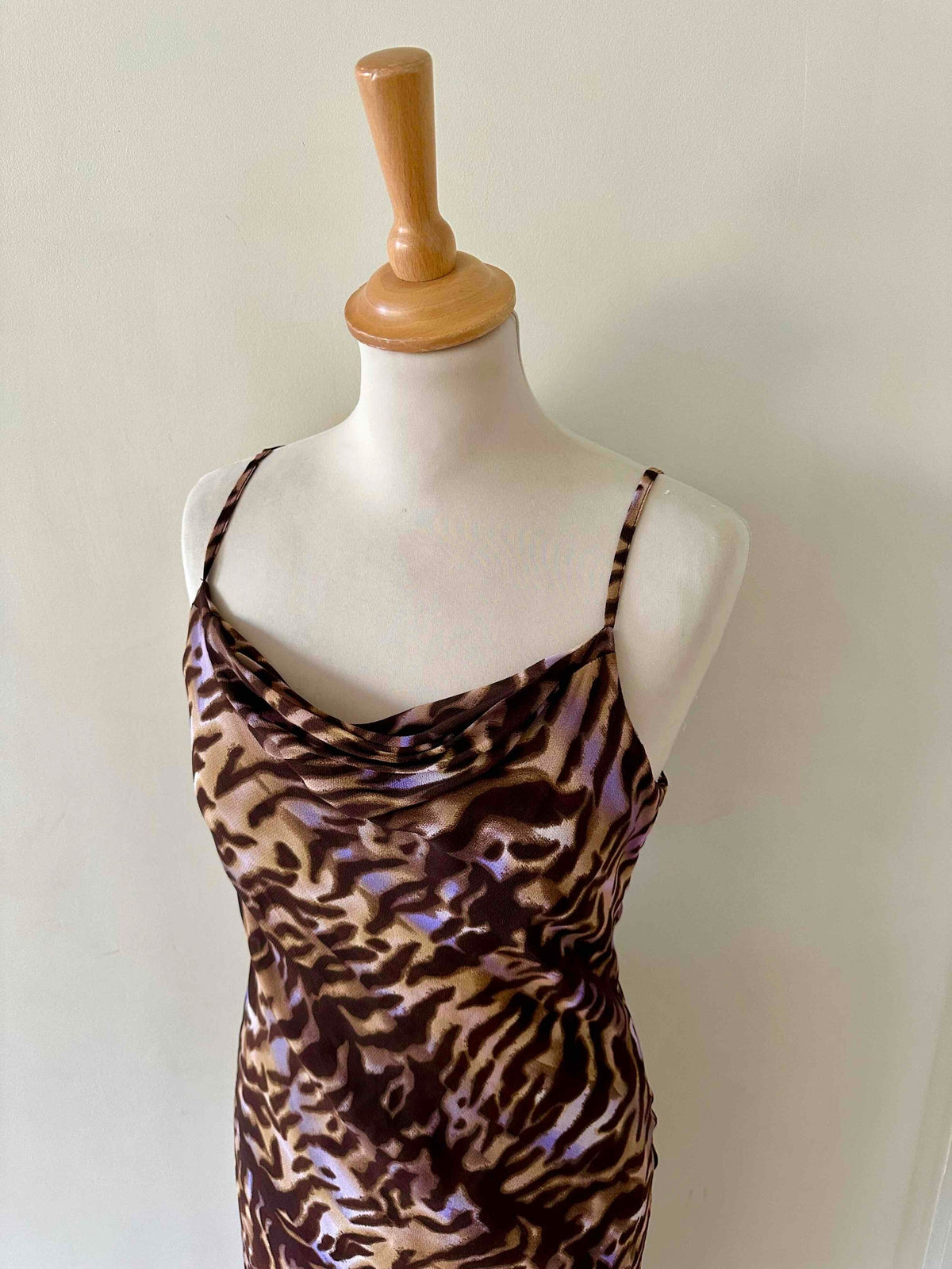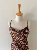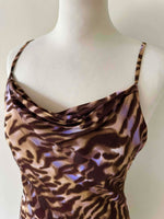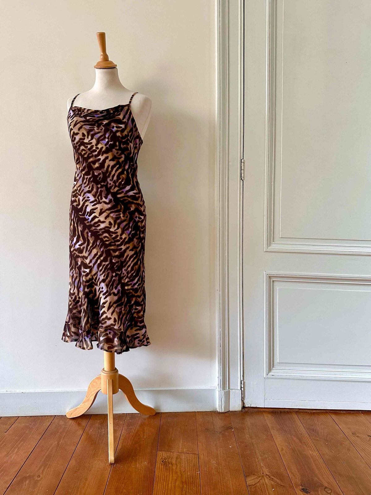 Prix unitaire parRobe nuisette léopard en mousseline viscose imprimée léopard brun, camel et touches de violet lilas, bretelles spaghettis, encolure drapée, bénitier, forme fit and flare, fabriquée en France, taille 36, portée ici sur un mannequin T36, aisselles 43 cm.