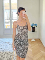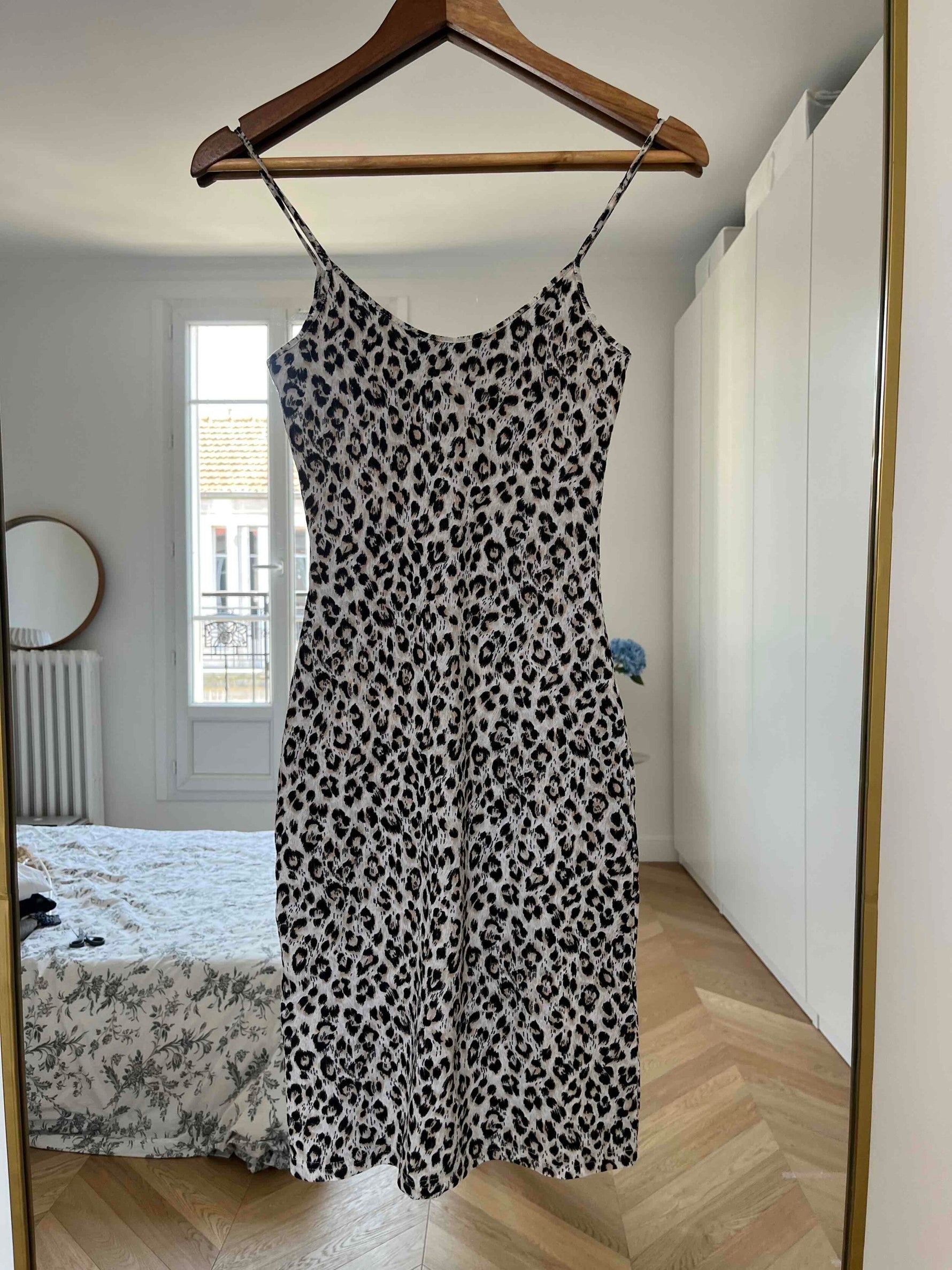 Prix unitaire parRobe en mesh léopard, moulante, tissu légèrement transparent et stretch, bretelle non ajustables, portée ici sur une T36 pour 1m64