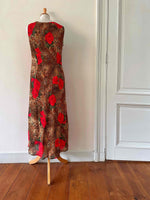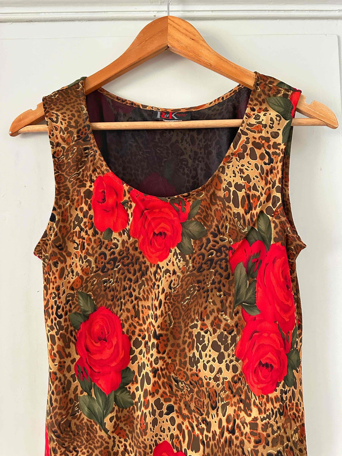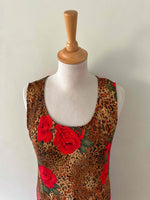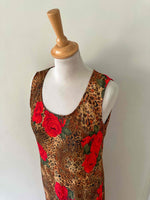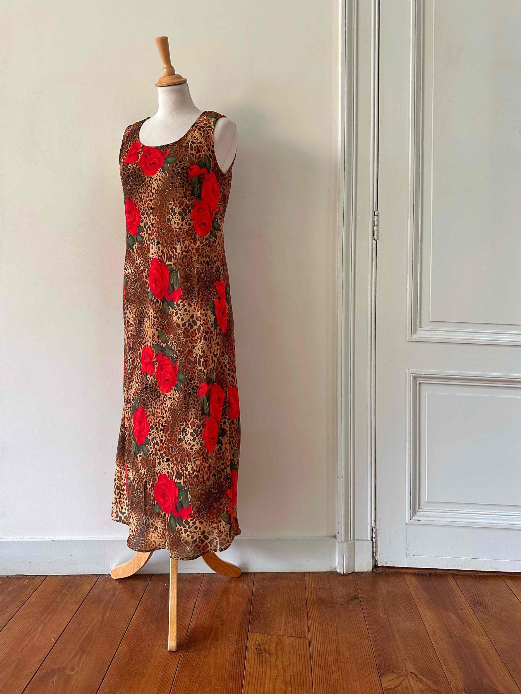 Prix unitaire parRobe léopard fleurie, en voile viscose doublée, imprimé léopard et roses rouges et vertes, forme fit and flare en biais, taille 36 et 38 portée ici sur un mannequin T36, aisselles 44cm.