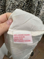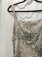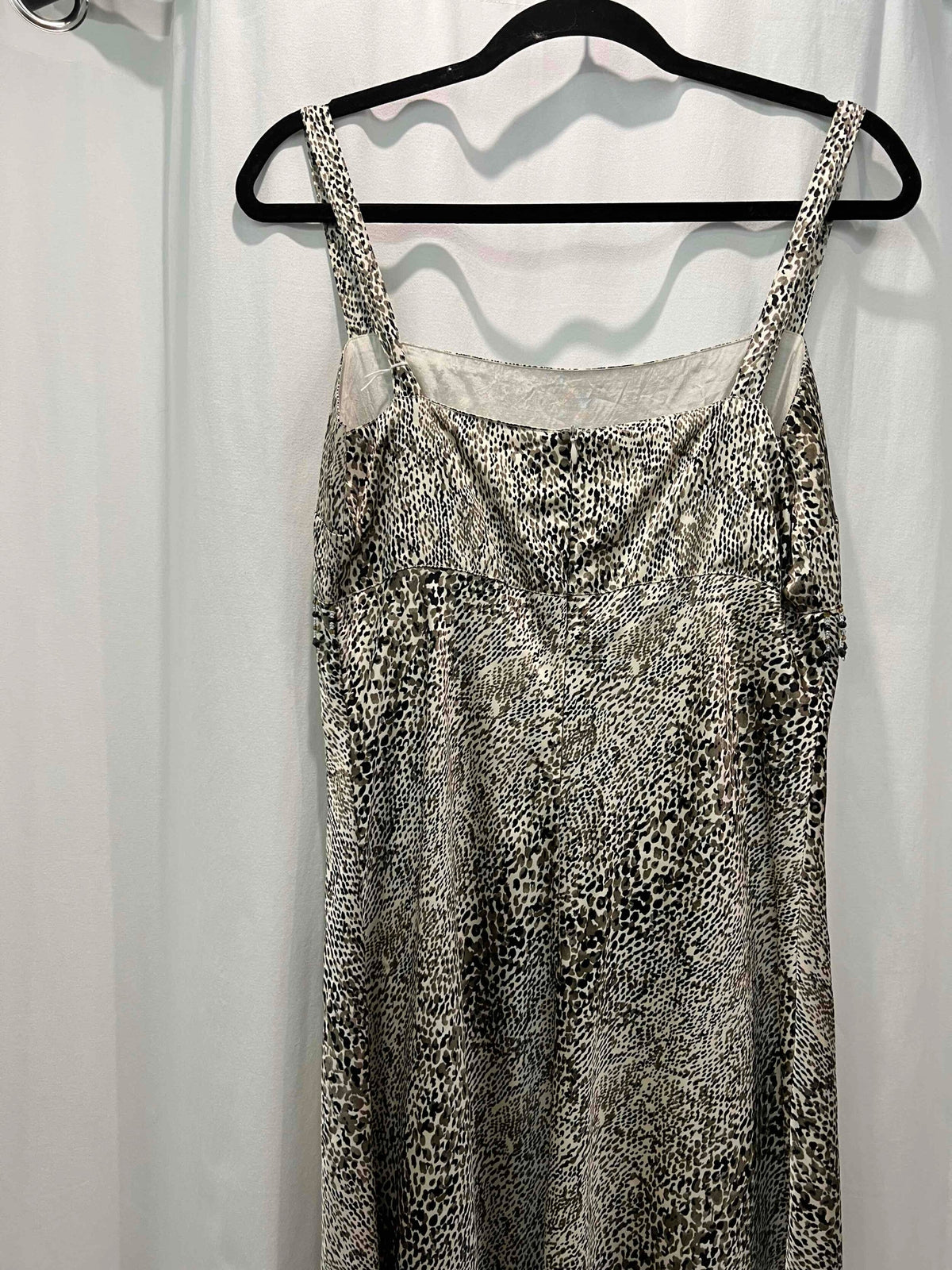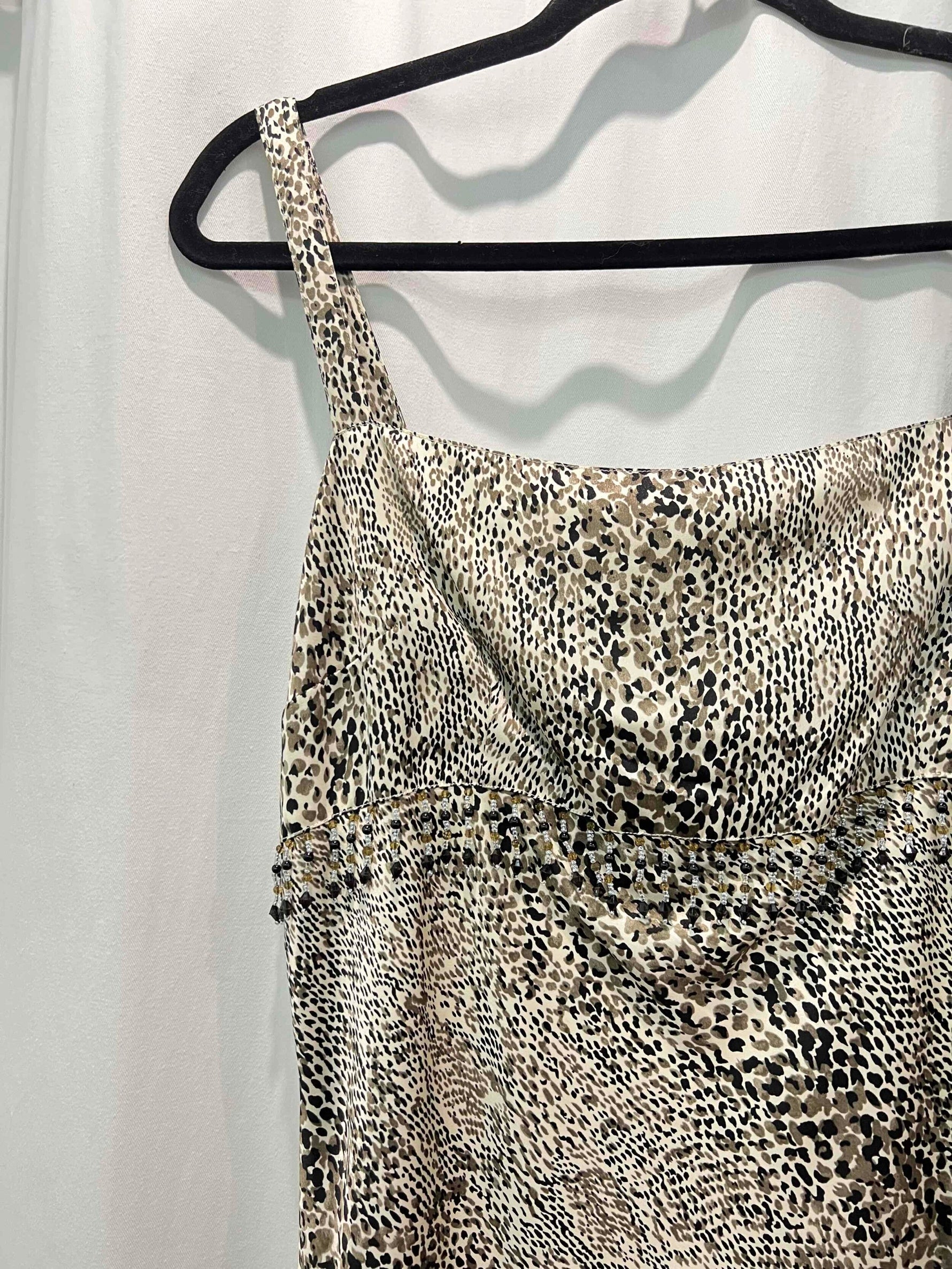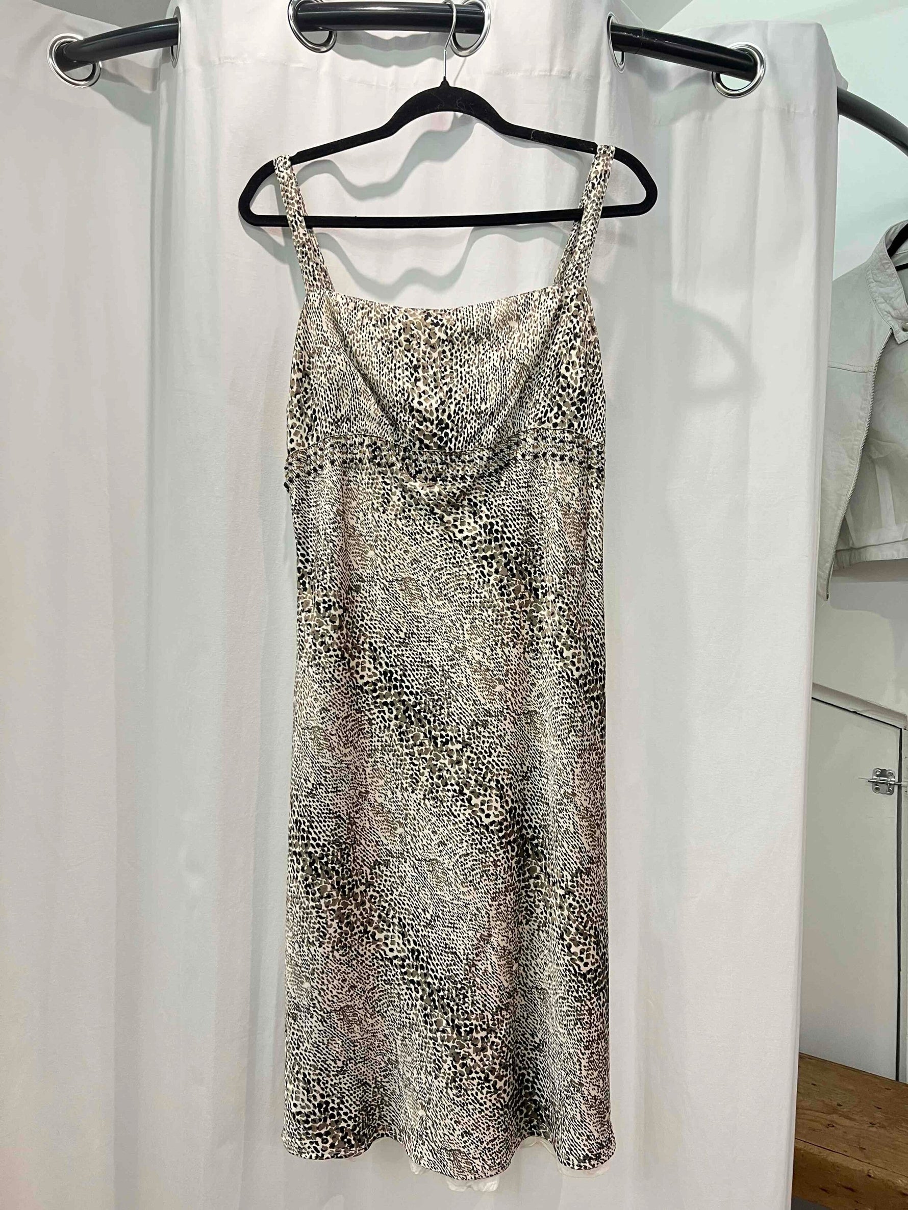 Prix unitaire parRobe sans manche motif léopard beige et kaki. Bretelles fines et détails de perles sous la poitrine. Entièrement doublée. Effet satiné, sarin de viscose. Années 90s. Longueur mi-mollet.