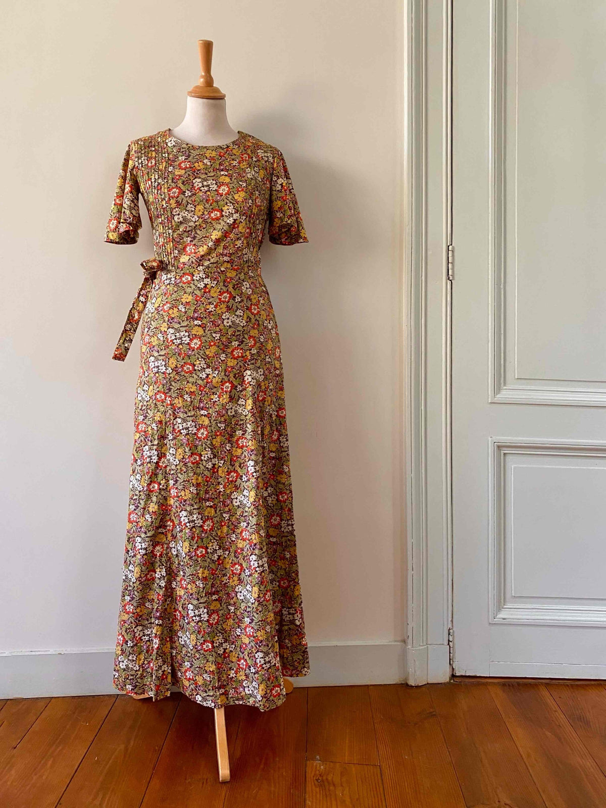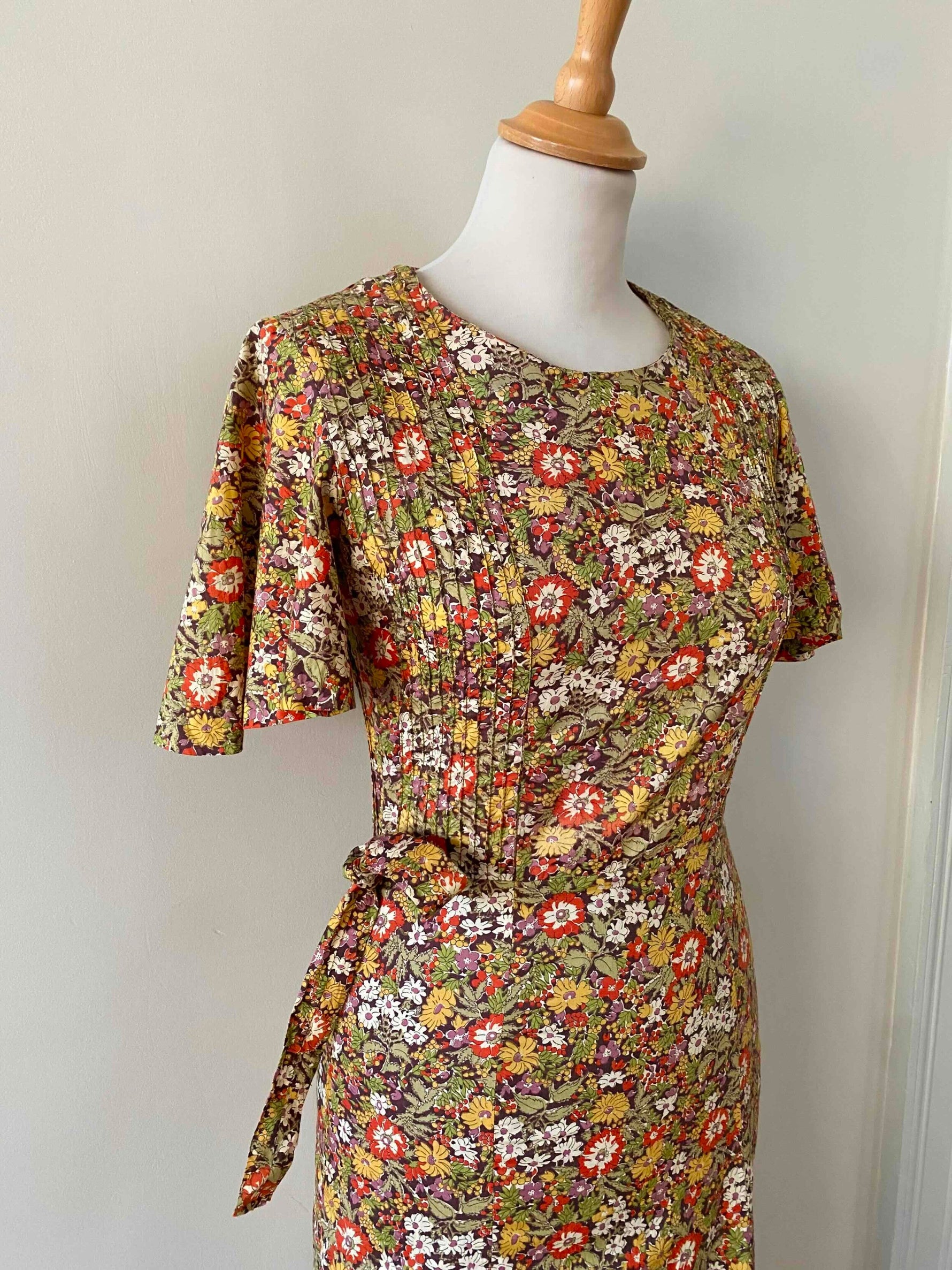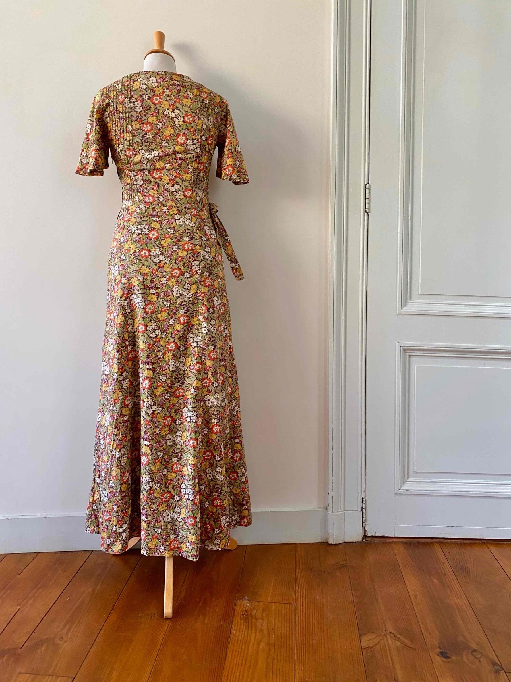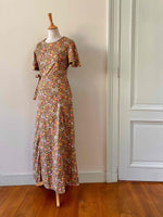 Prix unitaire parRobe liberty Cacharel, en coton imprimé fleurs liberty multicolores automnales, plastron plissé, manches gigots papillons, taille à nouer sur le côté, fermeture éclaire côté, longueur maxi, fabriquée en France, taille 34 portée ici sur un mannequin T36, aisselles 42cm.