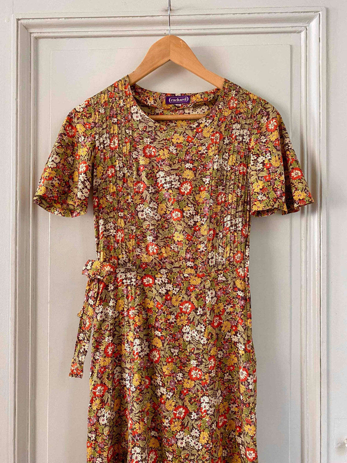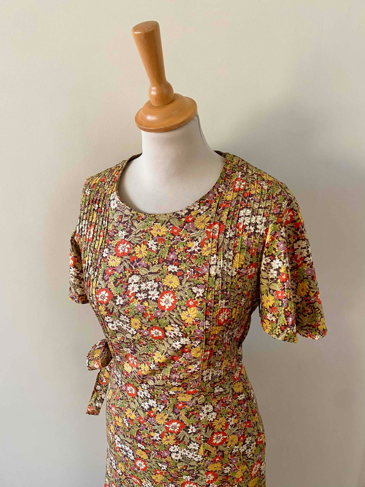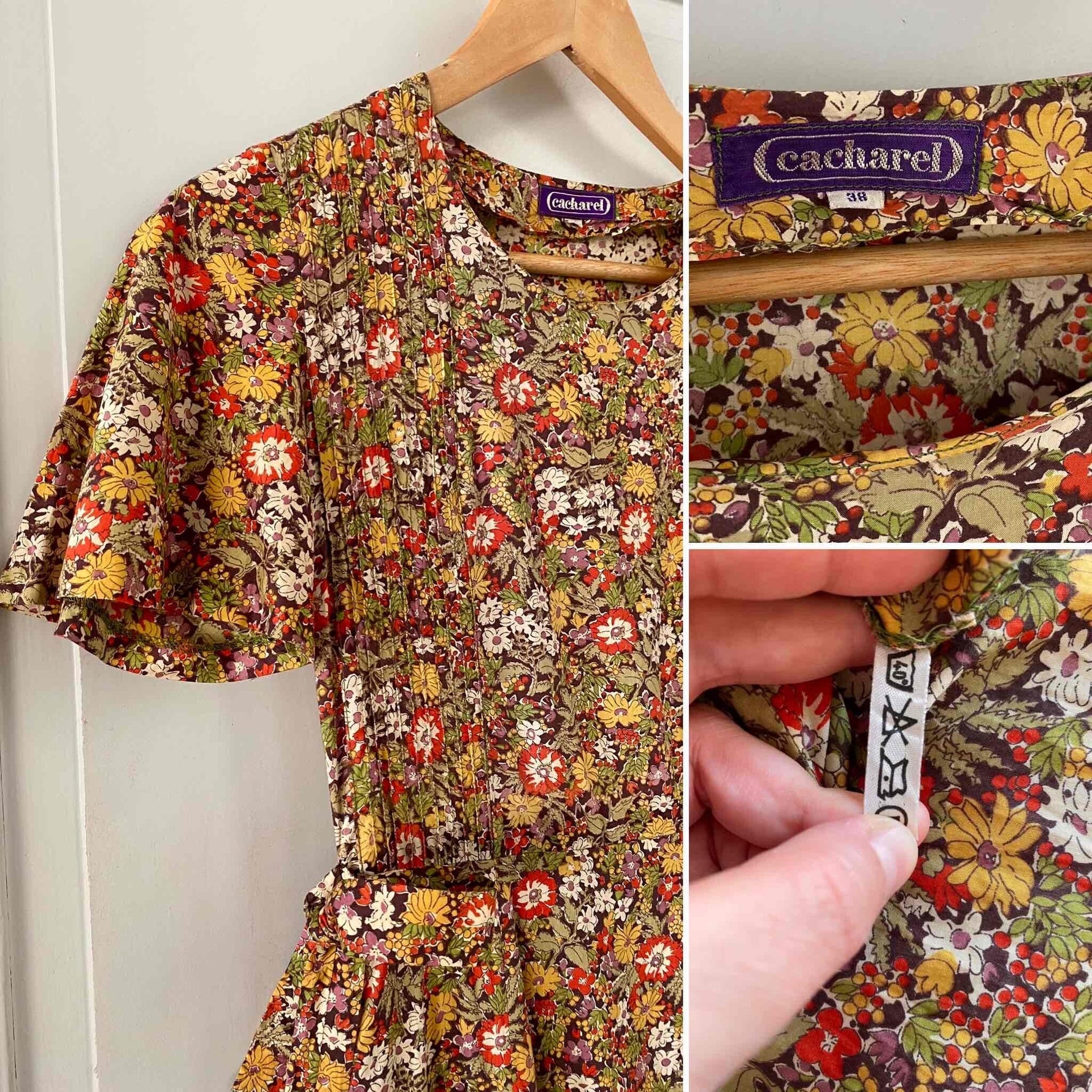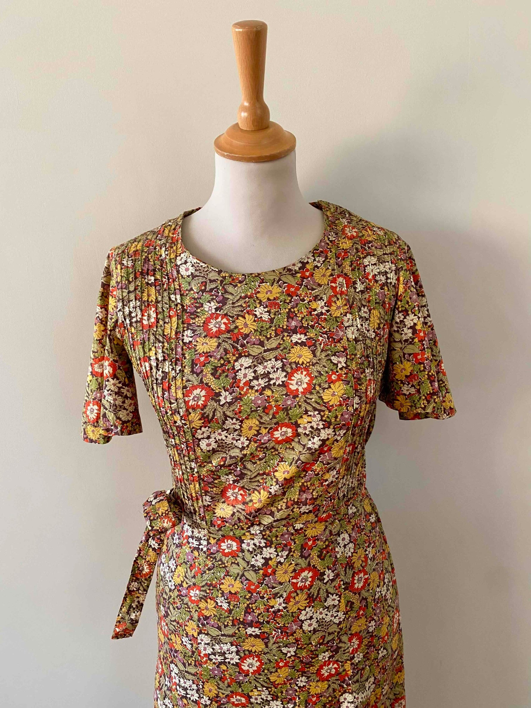 Prix unitaire parRobe liberty Cacharel, en coton imprimé fleurs liberty multicolores automnales, plastron plissé, manches gigots papillons, taille à nouer sur le côté, fermeture éclaire côté, longueur maxi, fabriquée en France, taille 34 portée ici sur un mannequin T36, aisselles 42cm.