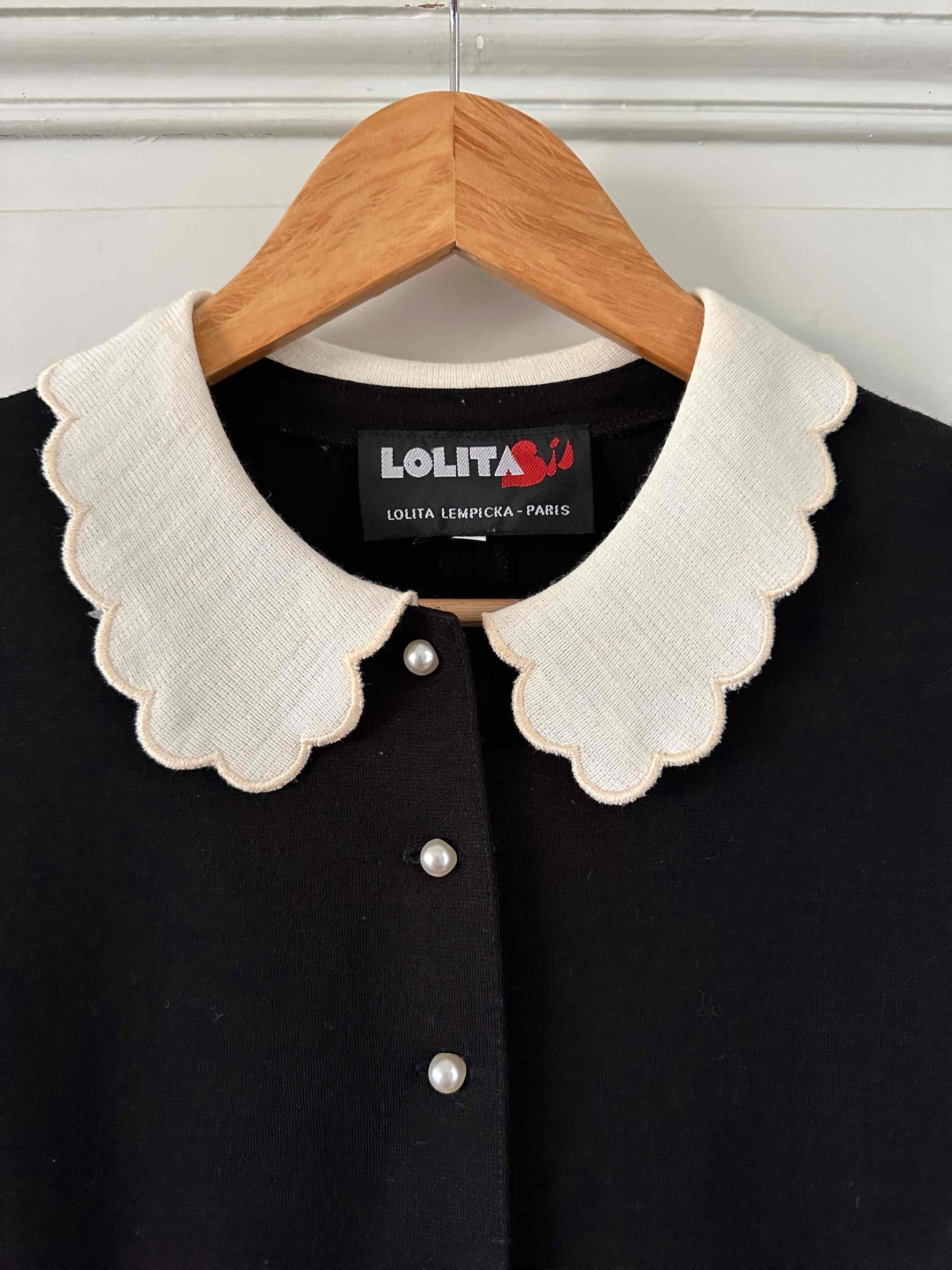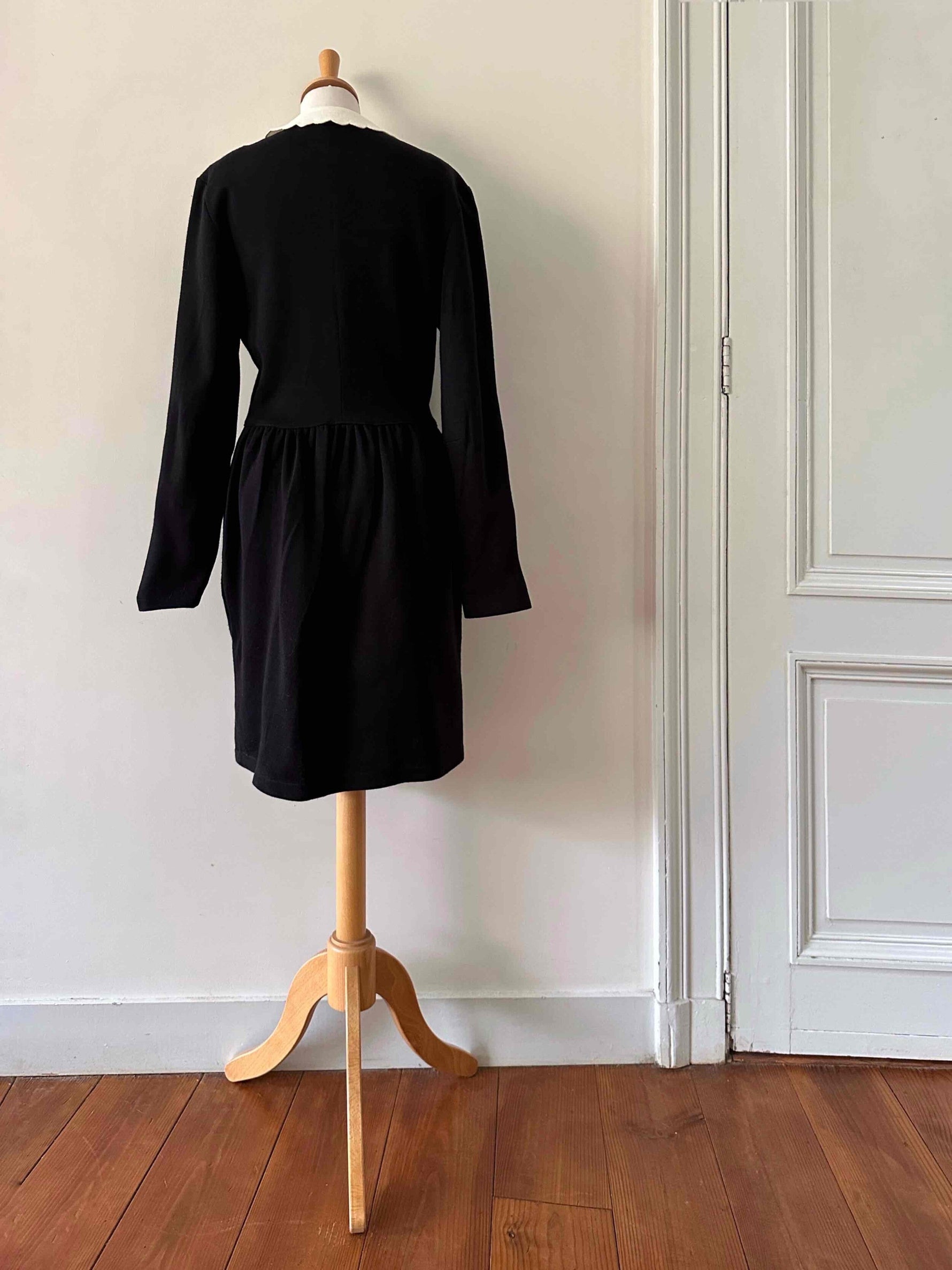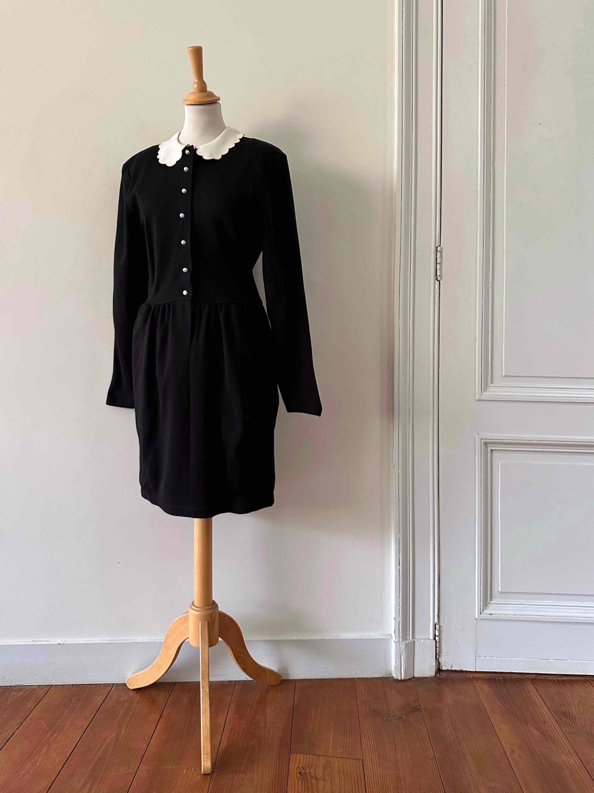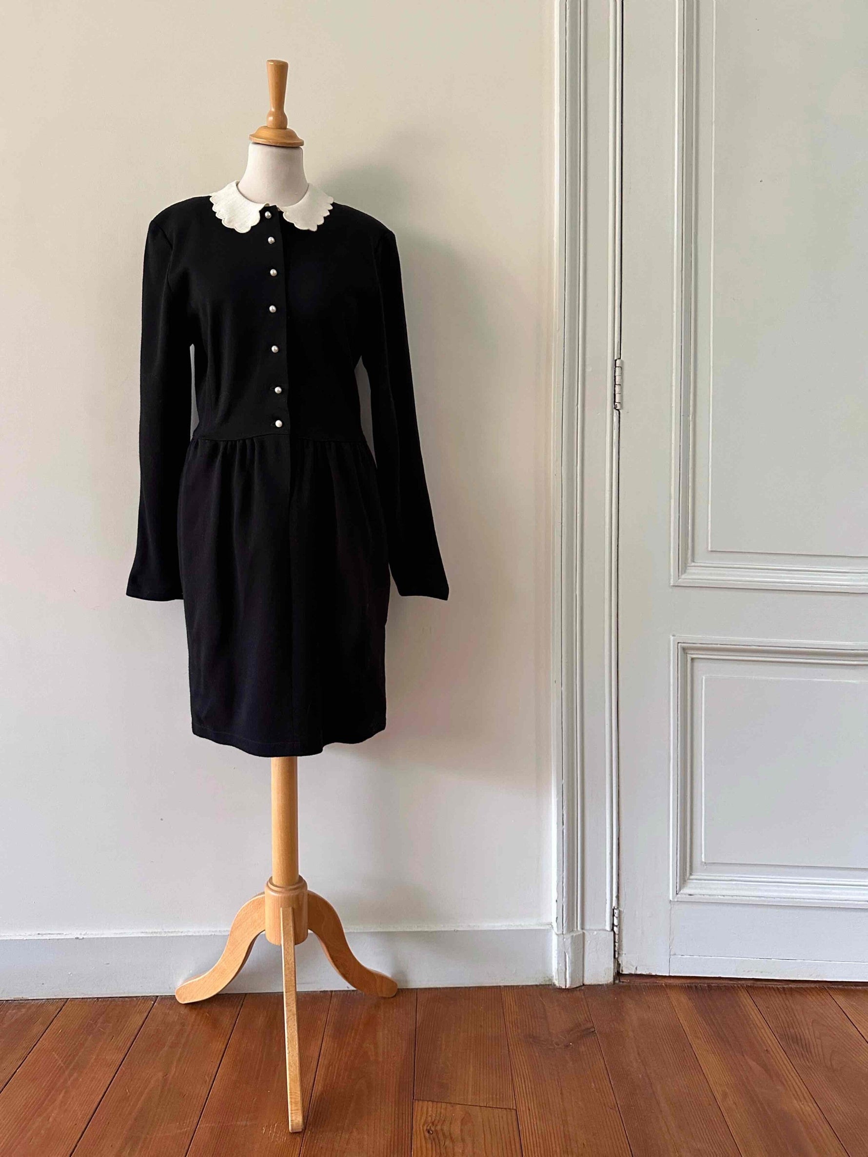 Prix unitaire parRobe Lolita Lempicka, en milano de laine peignée noir, col claudine festonné blanc, boutons perles navrées, fabriquée en France, taille 36 portée ici sur un mannequin T36.