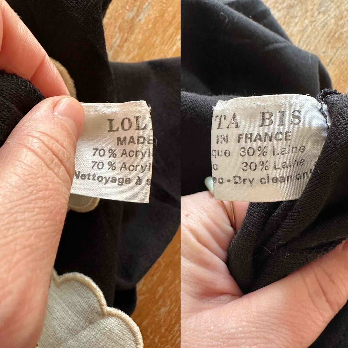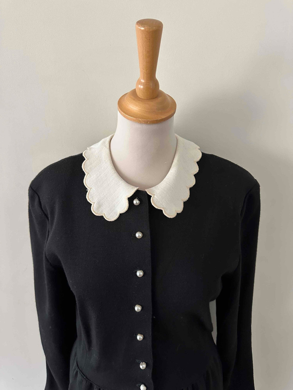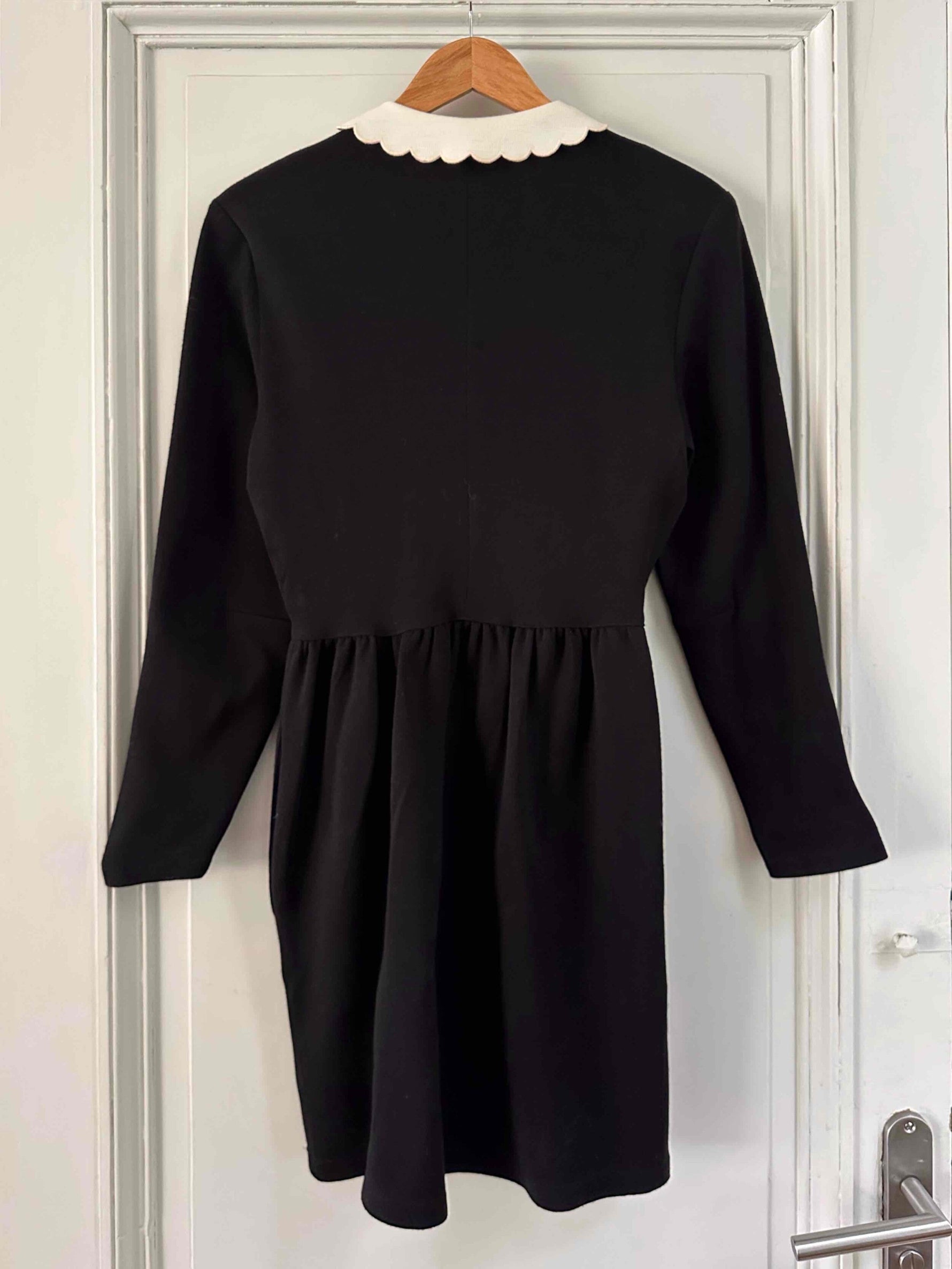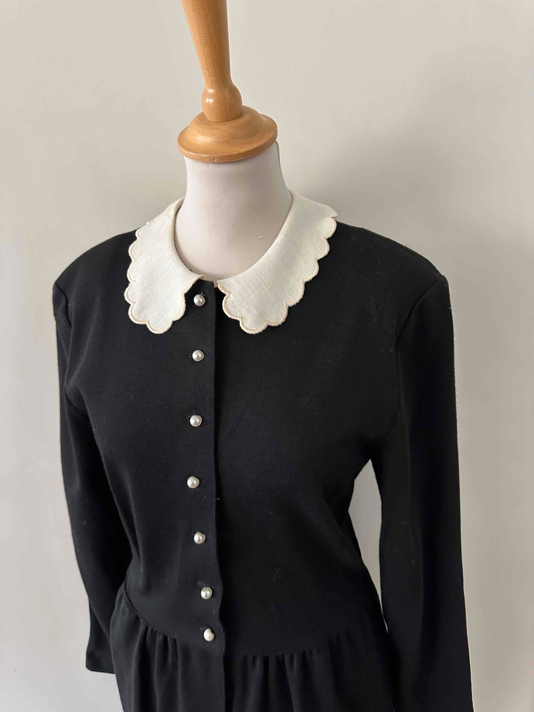 Prix unitaire parRobe Lolita Lempicka, en milano de laine peignée noir, col claudine festonné blanc, boutons perles navrées, fabriquée en France, taille 36 portée ici sur un mannequin T36.