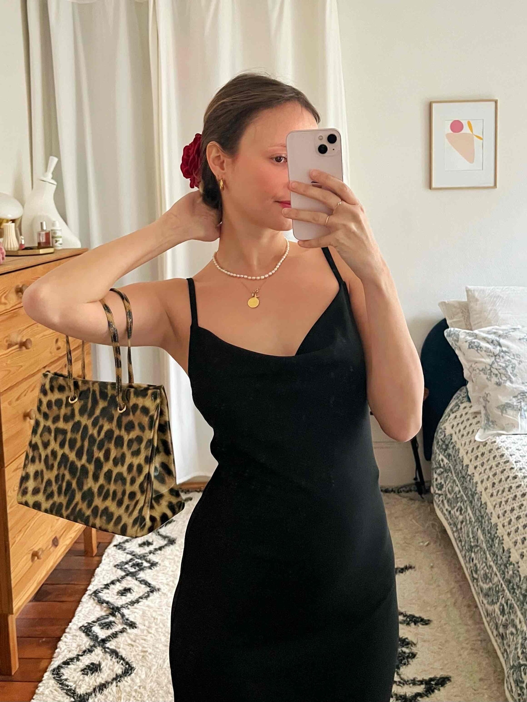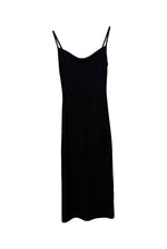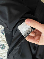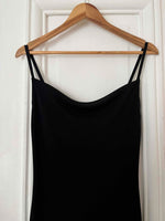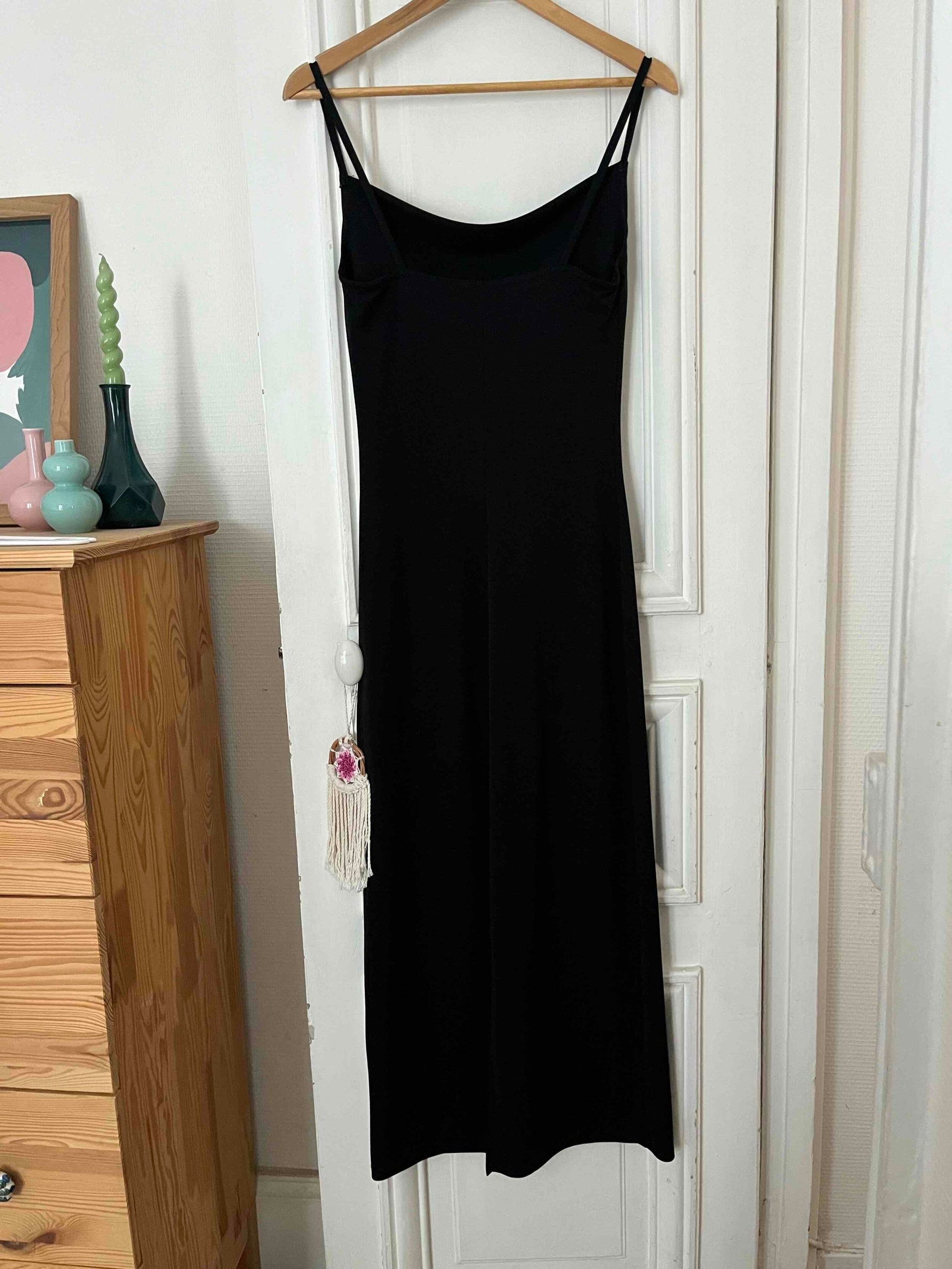 Prix unitaire parRobe longue, tissu noir stretch, col bénitier, bretelles non ajustables, fente à l’arrière de la robe, made in France. Portée ici sur une T36 pour 1m64