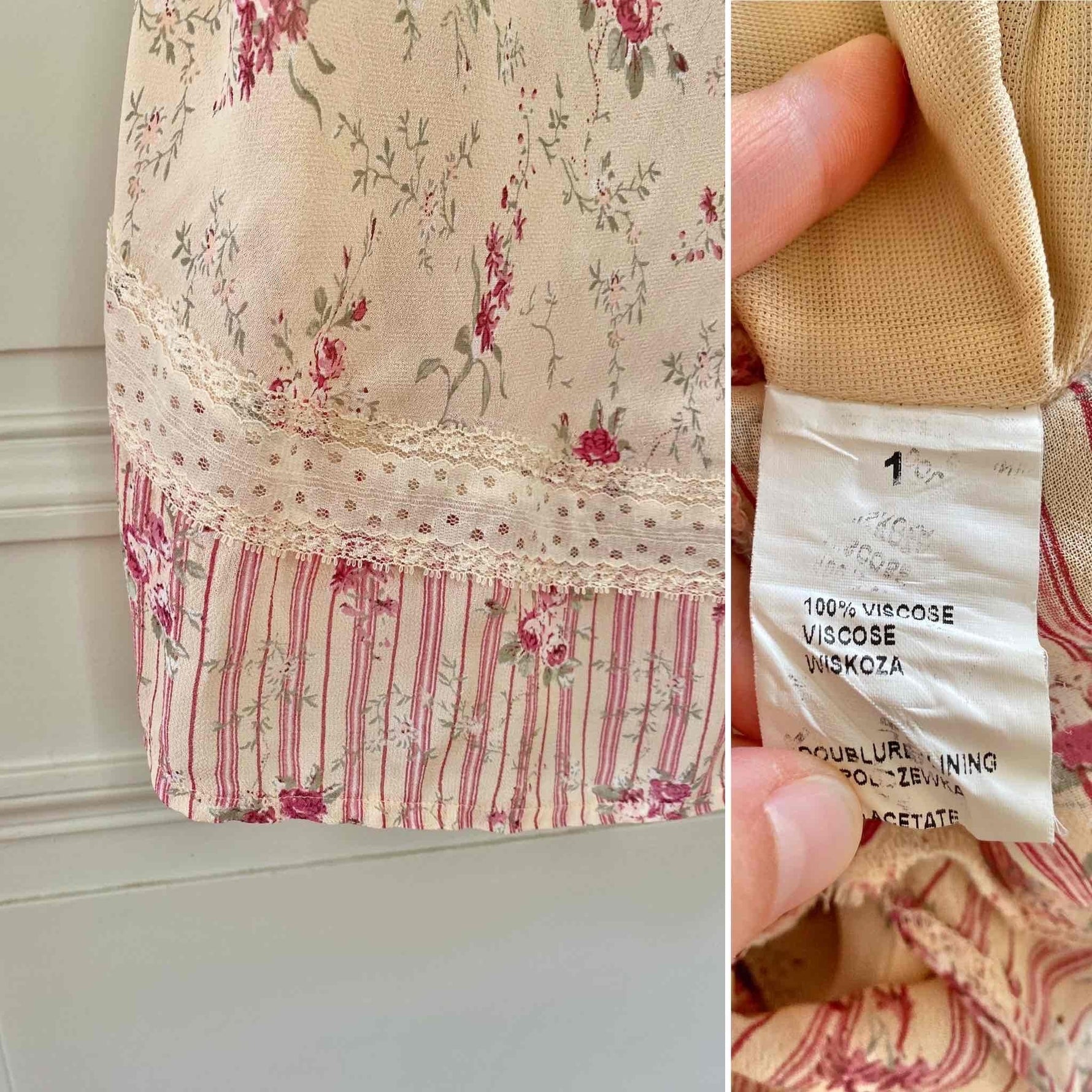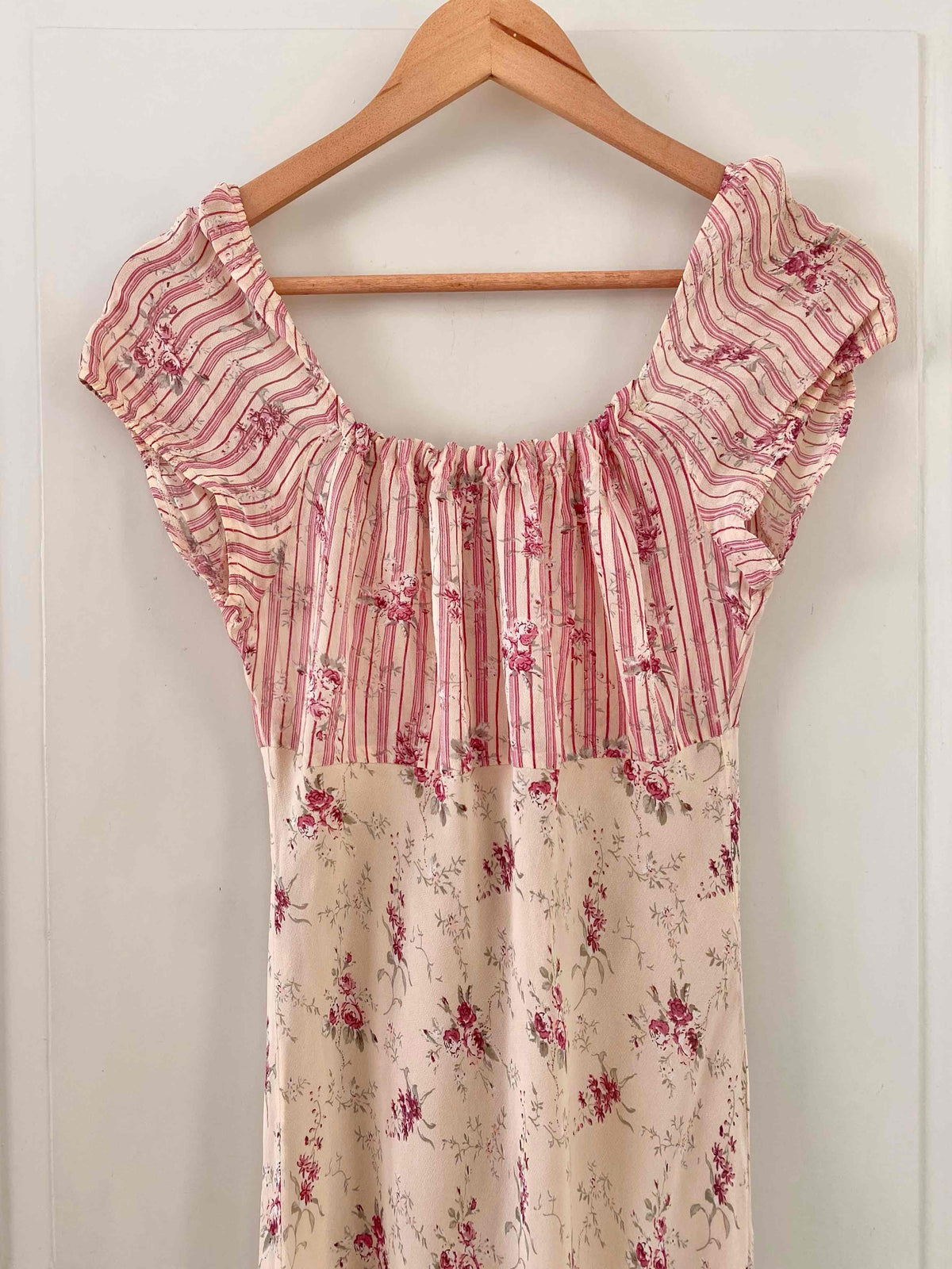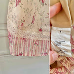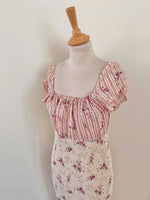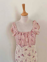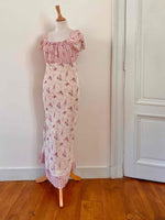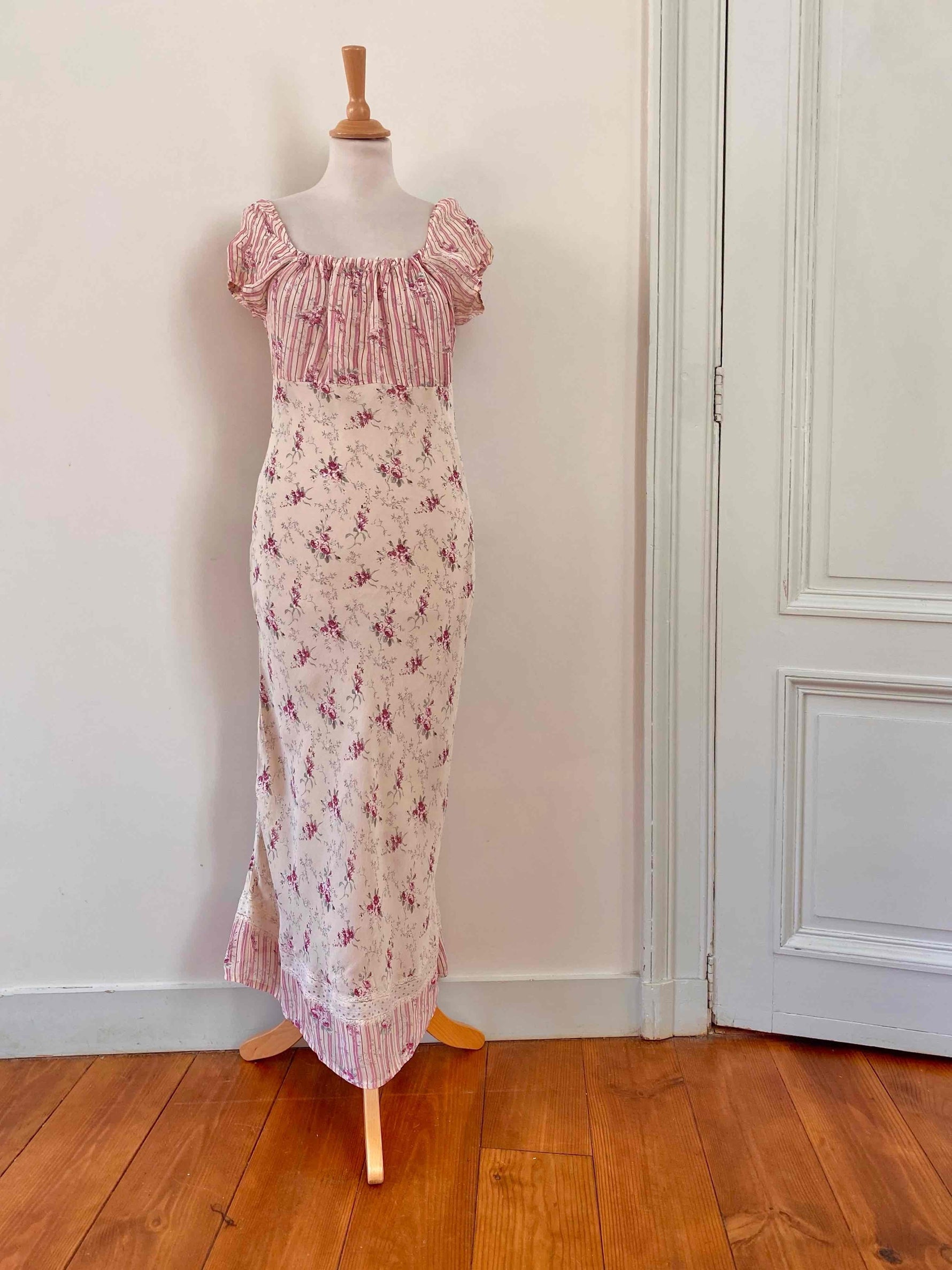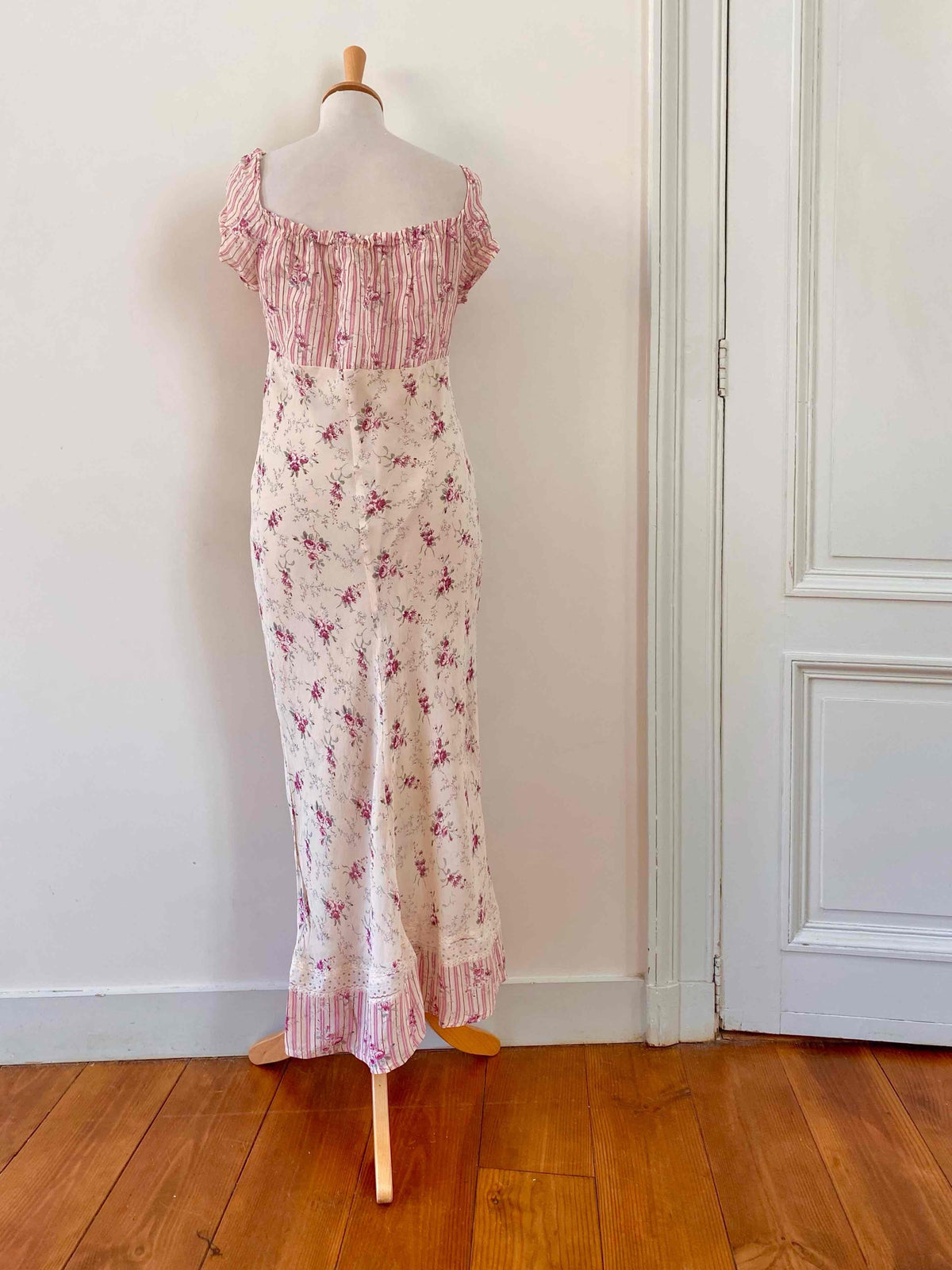 Prix unitaire parRobe longue à fleurs en voile viscose écru imprimé petites fleurs et rayures façon tapissières roses et vertes, dentelle en bas de robe, encolure corsage carrée et froncée élastique, manches ballons à porter open-shoulders, forme fit and flare en biais, fabriquée en France, taille 36 portée ici sur un mannequin T36, aisselles 43cm.