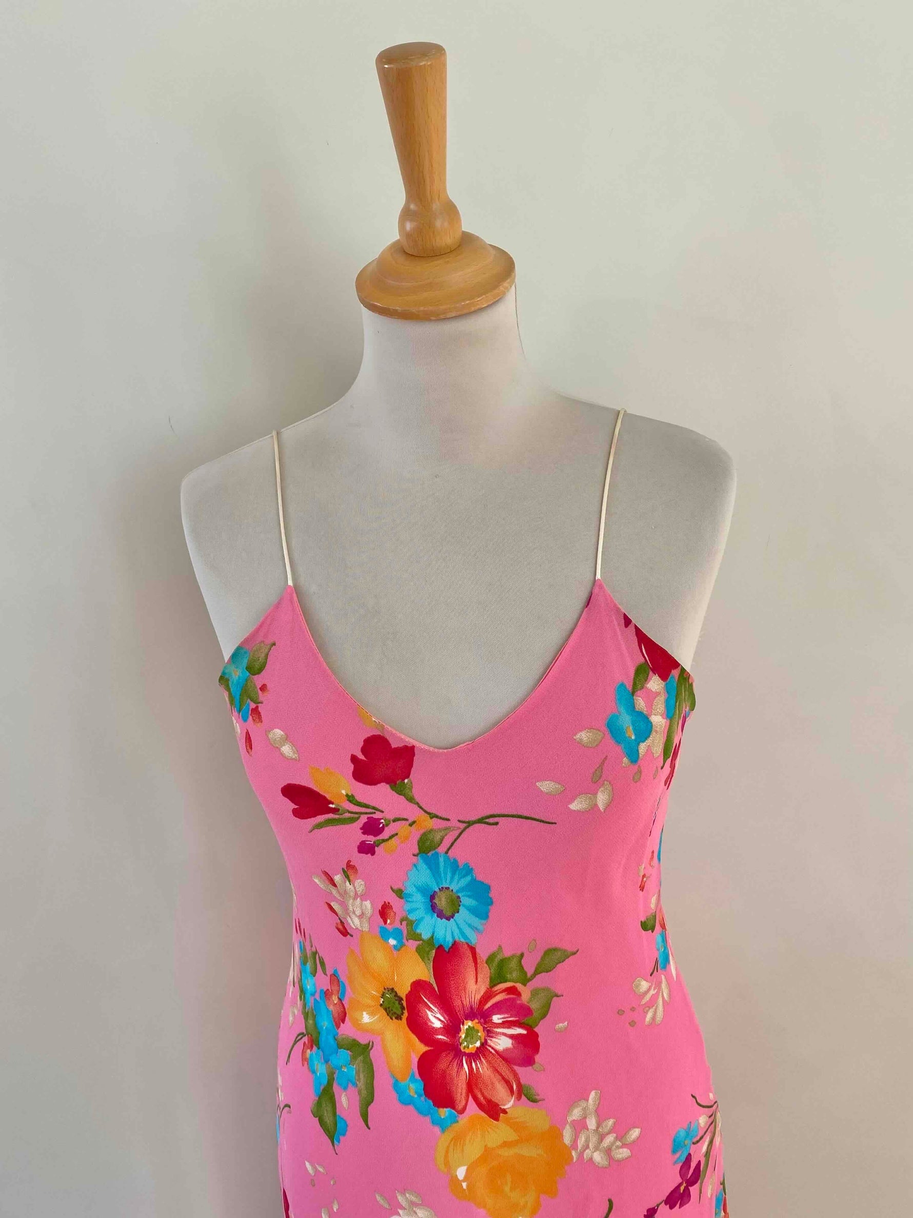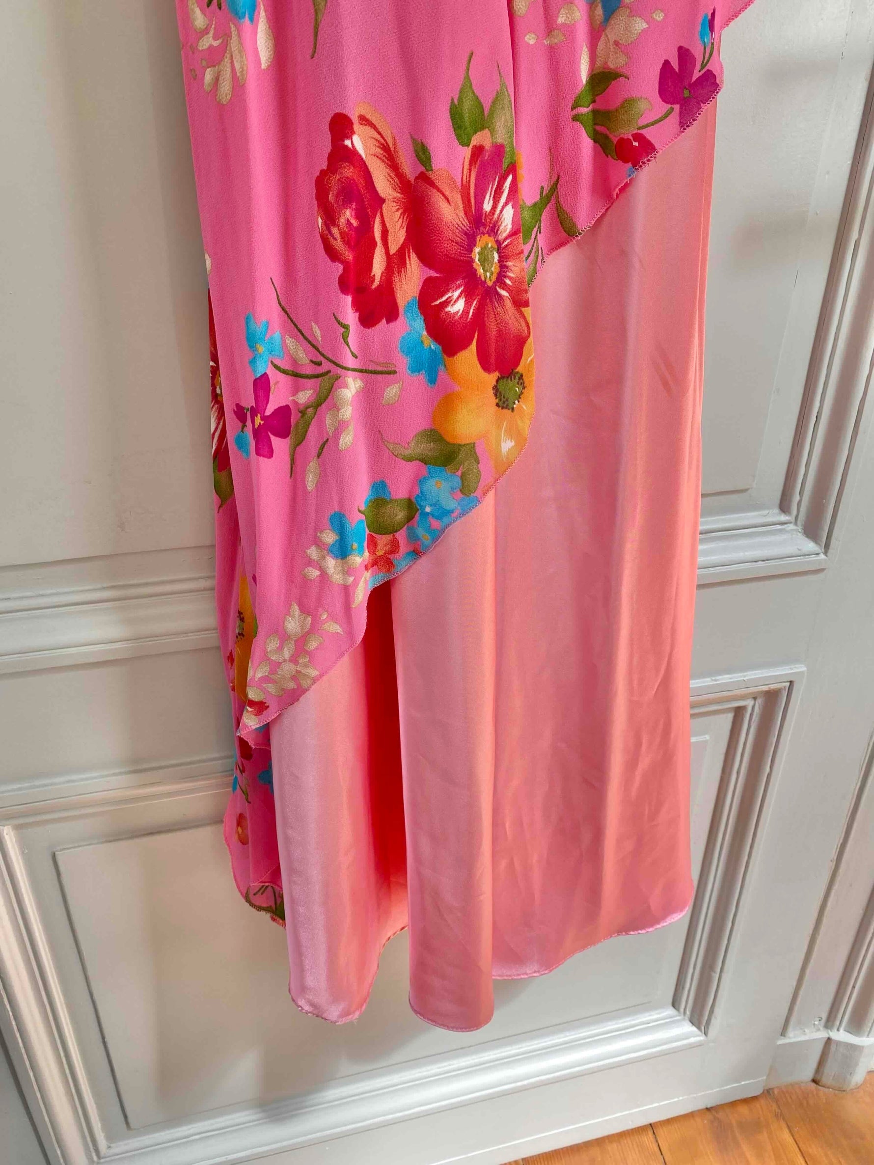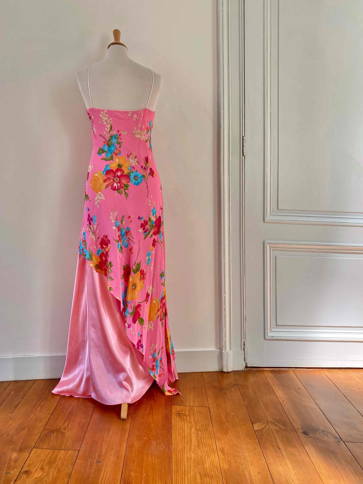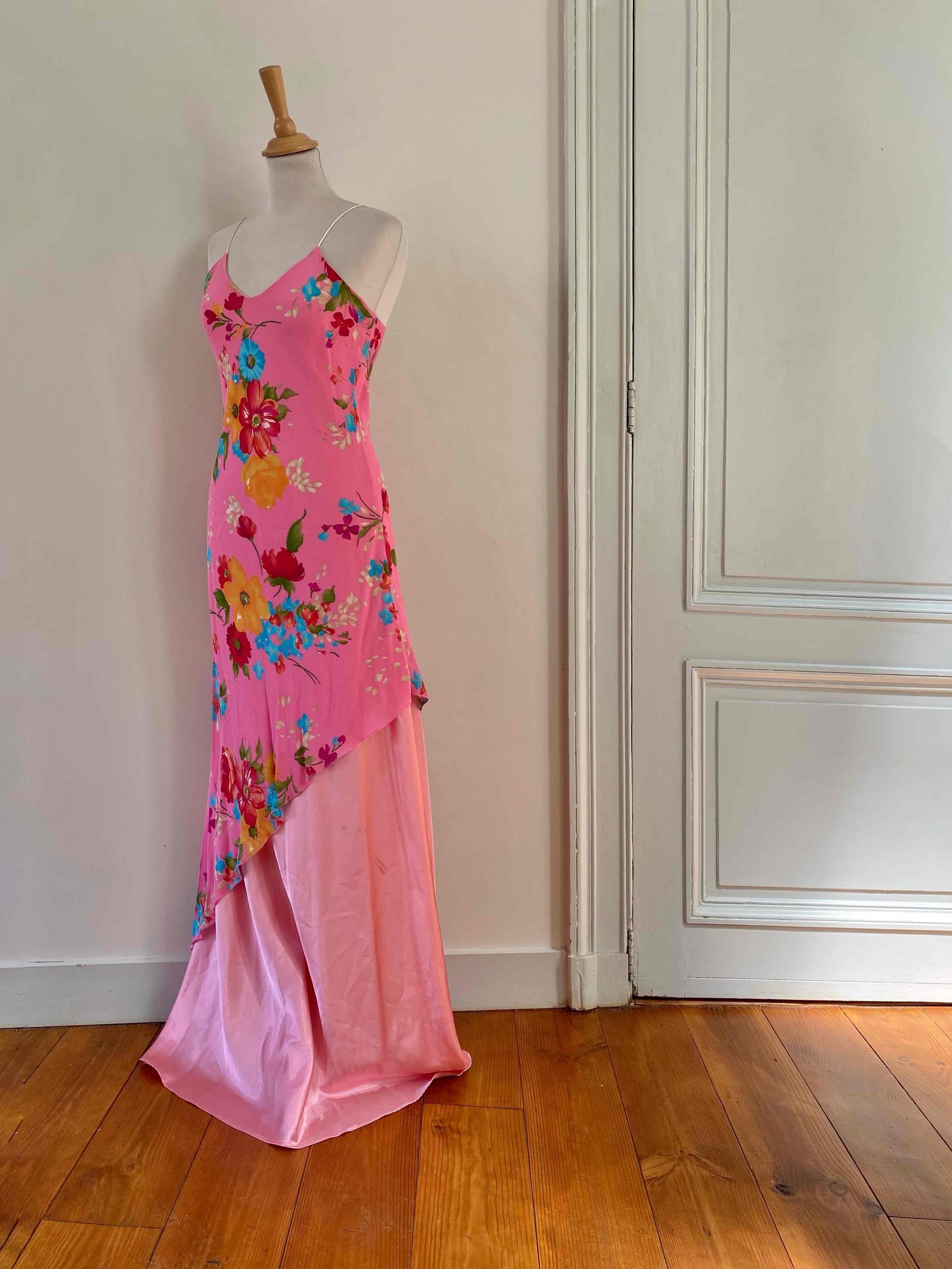 Prix unitaire parRobe longue à fleurs en voile viscose rose vif imprimée fleurs bleue, rouges, jaunes et vertes, doublée asymétrique en satin rose, bretelles spaghettis satinées, col V, forme fit and flare en biais, longueur maxi, fabriquée en France, taille 36 portée ici sur un mannequin T36, aisselles 43cm.