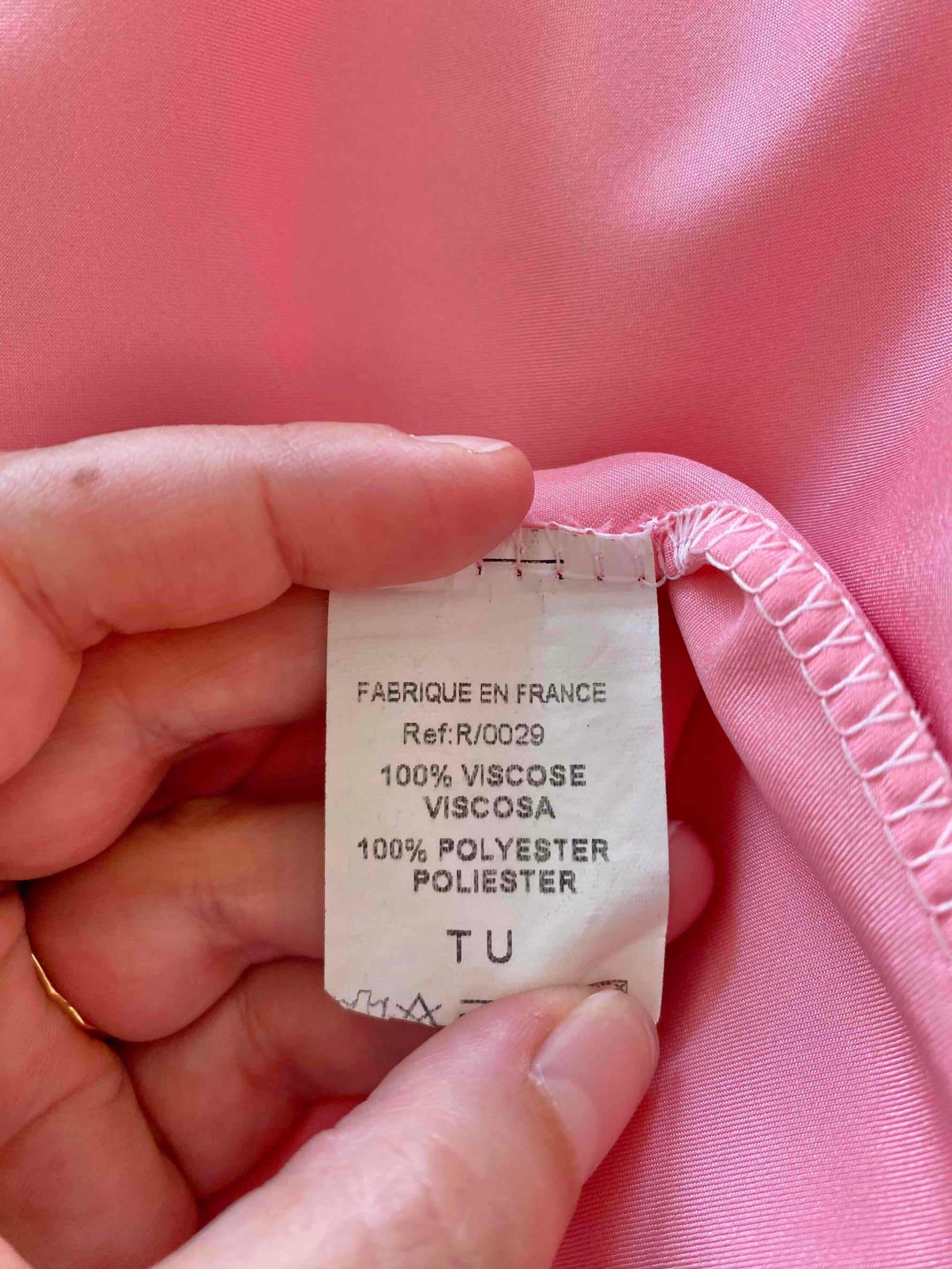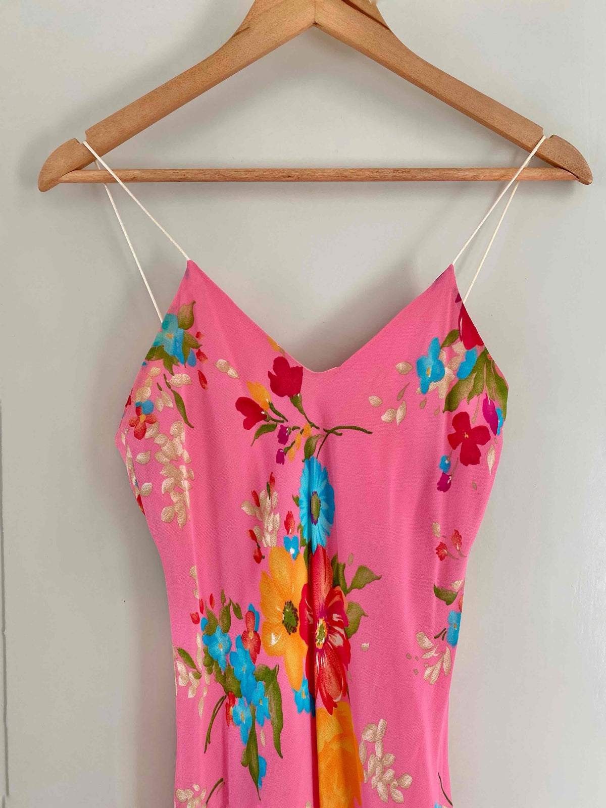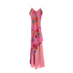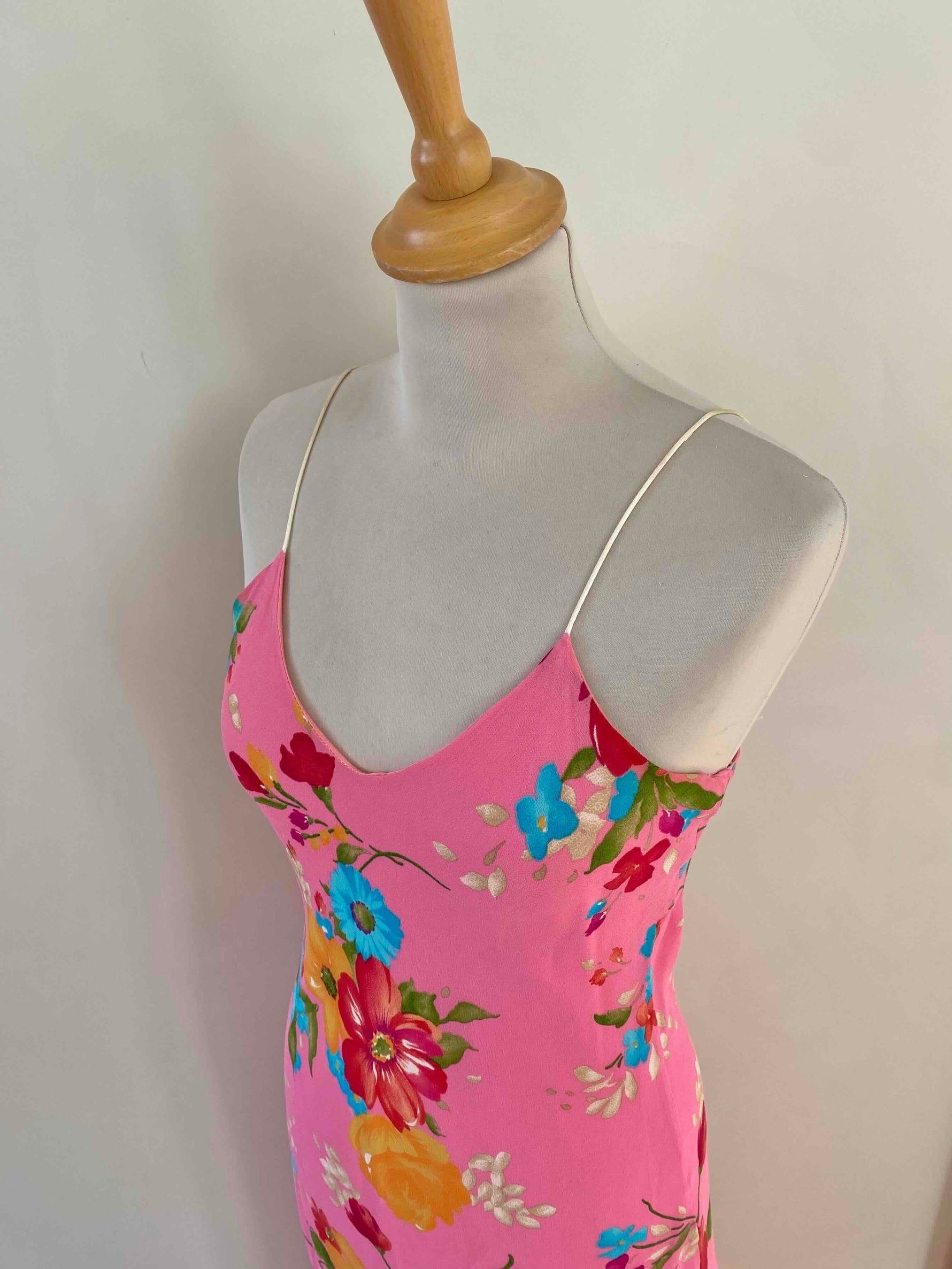 Prix unitaire parRobe longue à fleurs en voile viscose rose vif imprimée fleurs bleue, rouges, jaunes et vertes, doublée asymétrique en satin rose, bretelles spaghettis satinées, col V, forme fit and flare en biais, longueur maxi, fabriquée en France, taille 36 portée ici sur un mannequin T36, aisselles 43cm.
