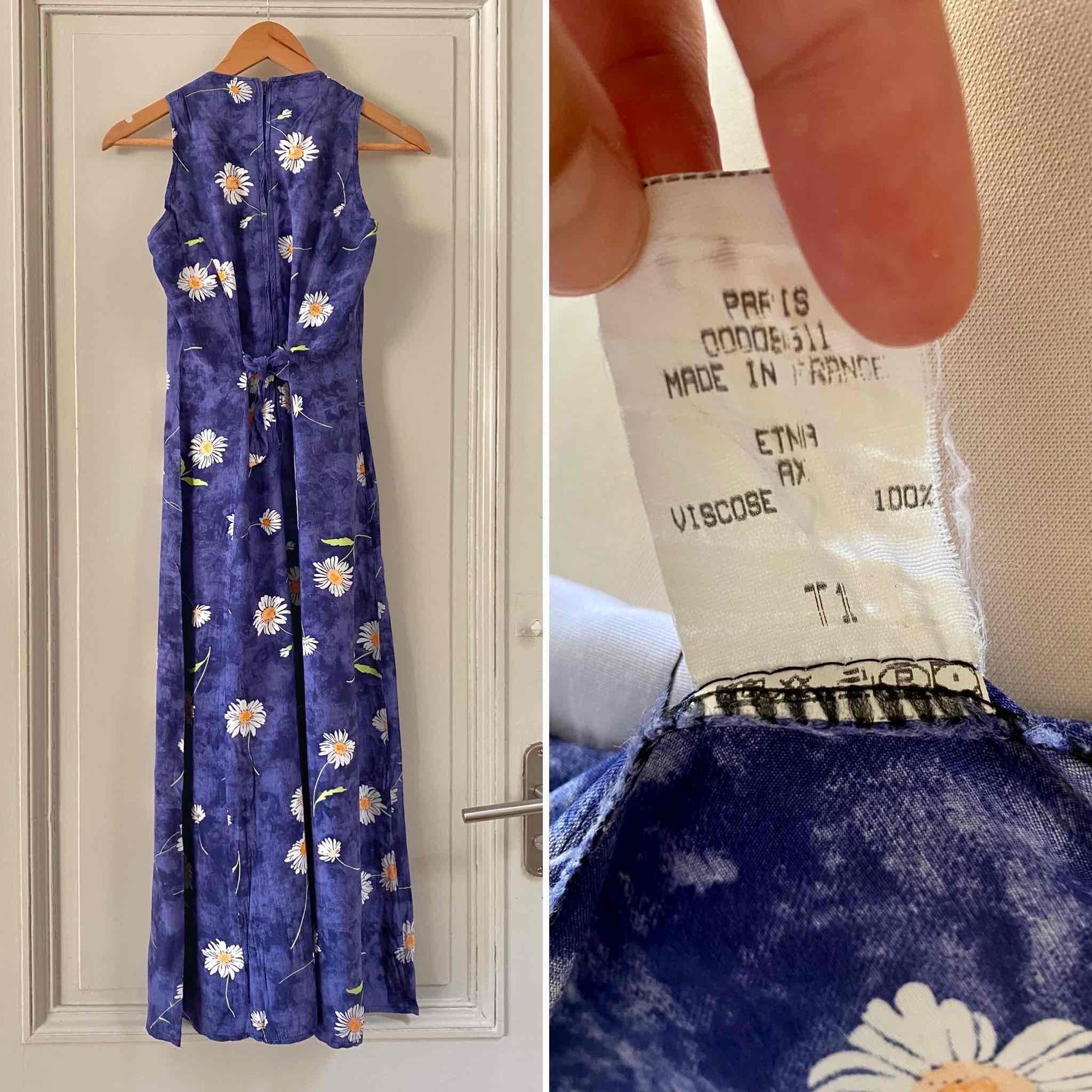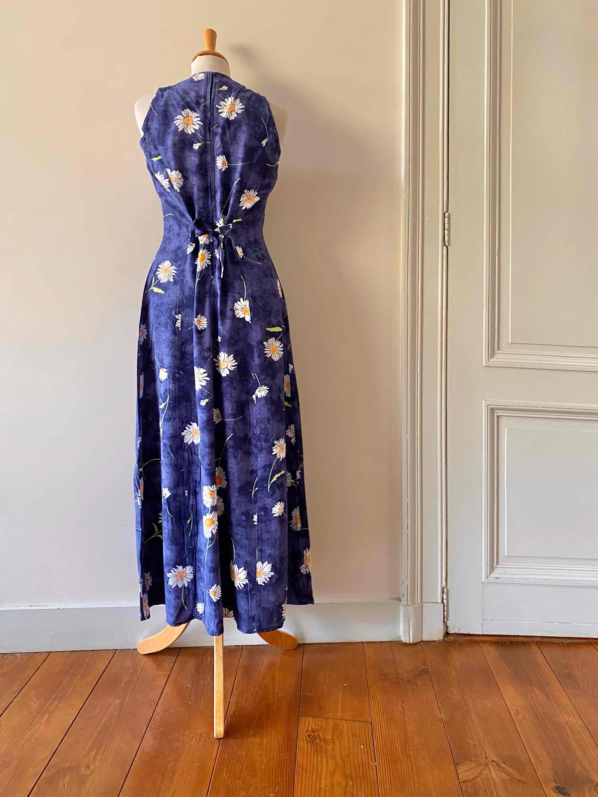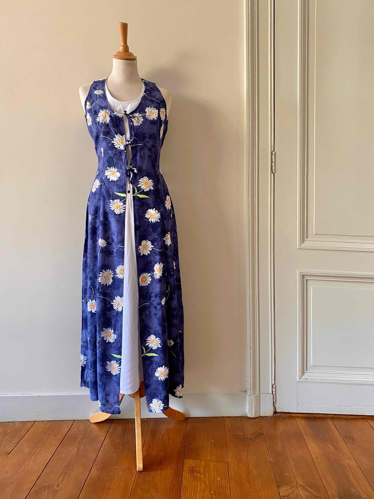 Prix unitaire parRobe longue à fleurs, en viscose bleue imprimée fleurs de marguerites blanches et jaunes, devant effet deux en un à nouettes, taille dos à nouer, fabriquée en France, taille 36 portée ici sur un mannequin T36, aisselles 44cm.