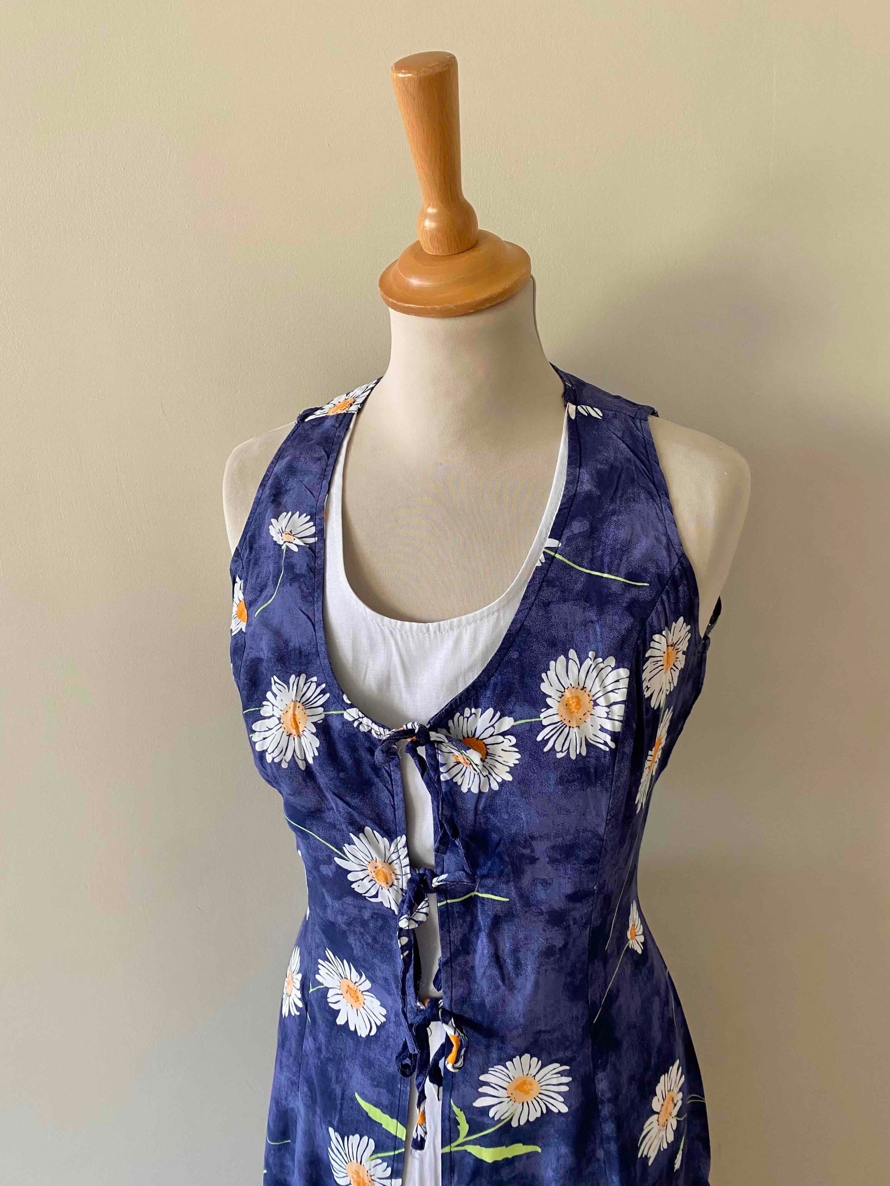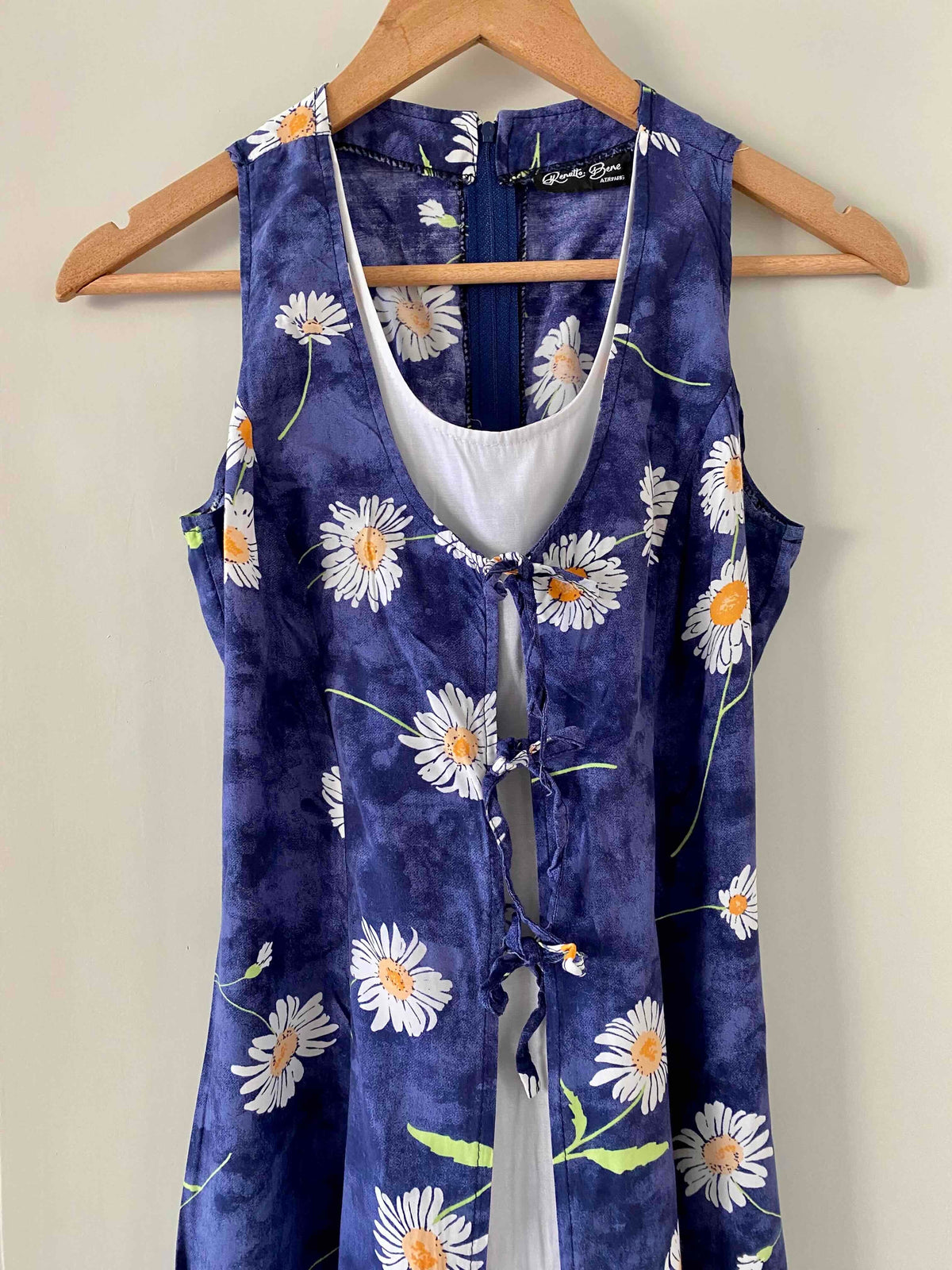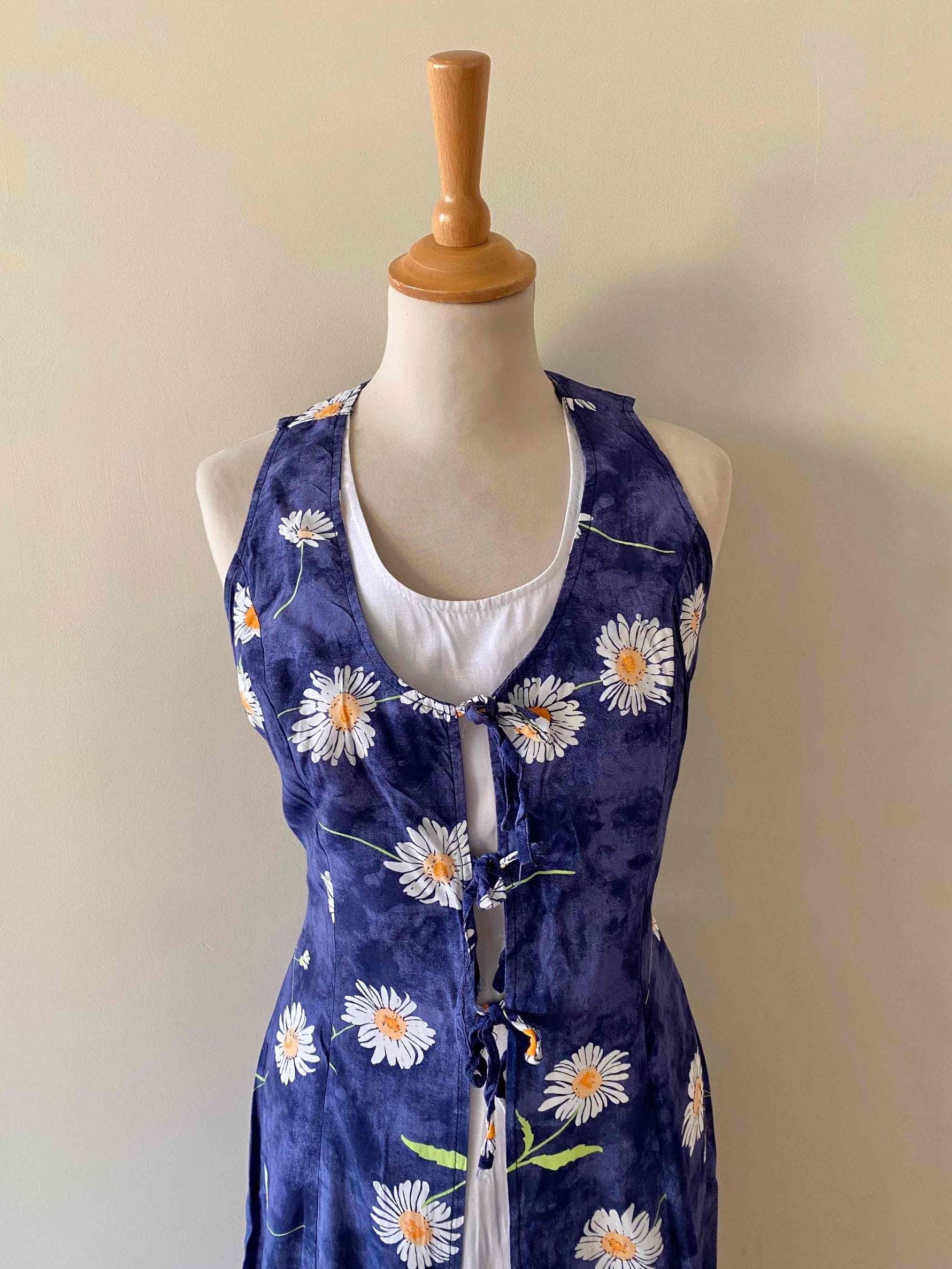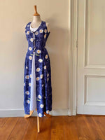 Prix unitaire parRobe longue à fleurs, en viscose bleue imprimée fleurs de marguerites blanches et jaunes, devant effet deux en un à nouettes, taille dos à nouer, fabriquée en France, taille 36 portée ici sur un mannequin T36, aisselles 44cm.