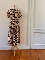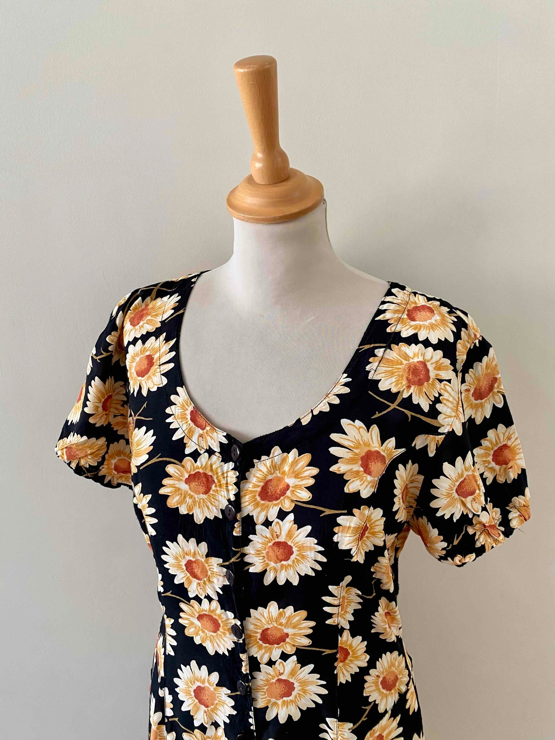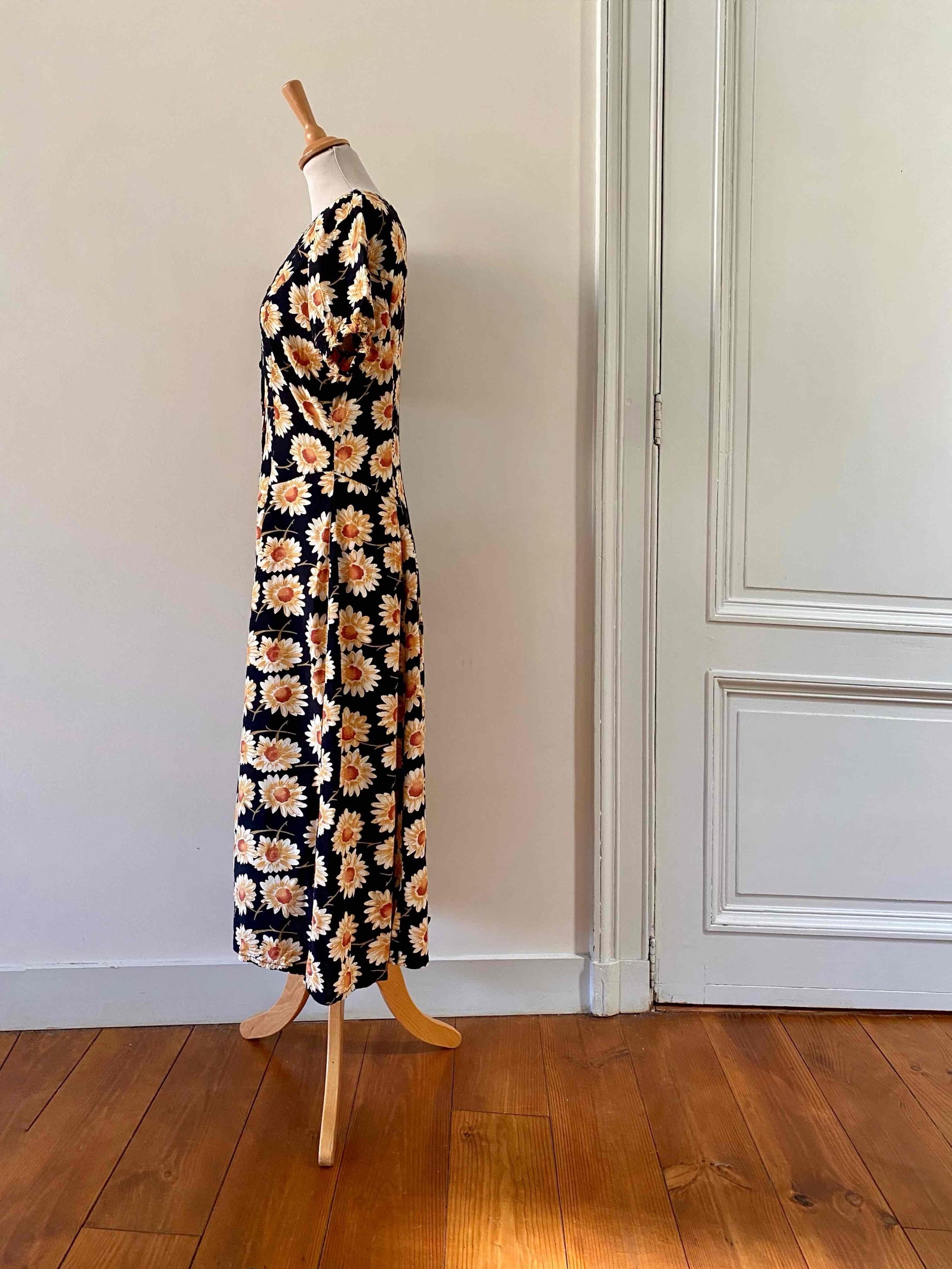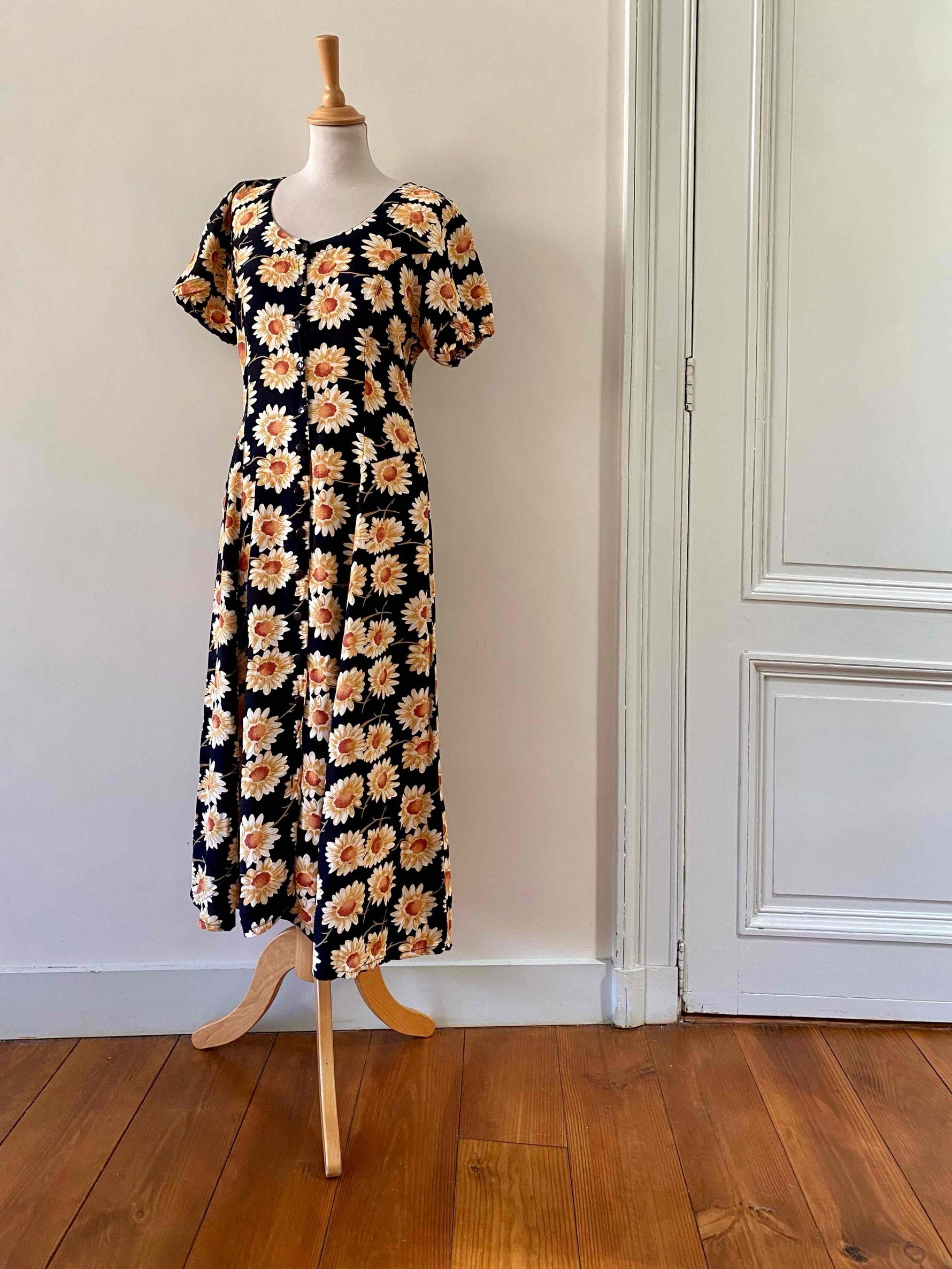 Prix unitaire parRobe longue à fleurs, en viscose noire imprimée marguerites blanches, oranges et jaunes, manches ballons élastiques, boutonnée devant, taille ceintrée, années 80’s, taille 36 et petit 38 portée ici sur un mannequin T36, aisselles 44cm.