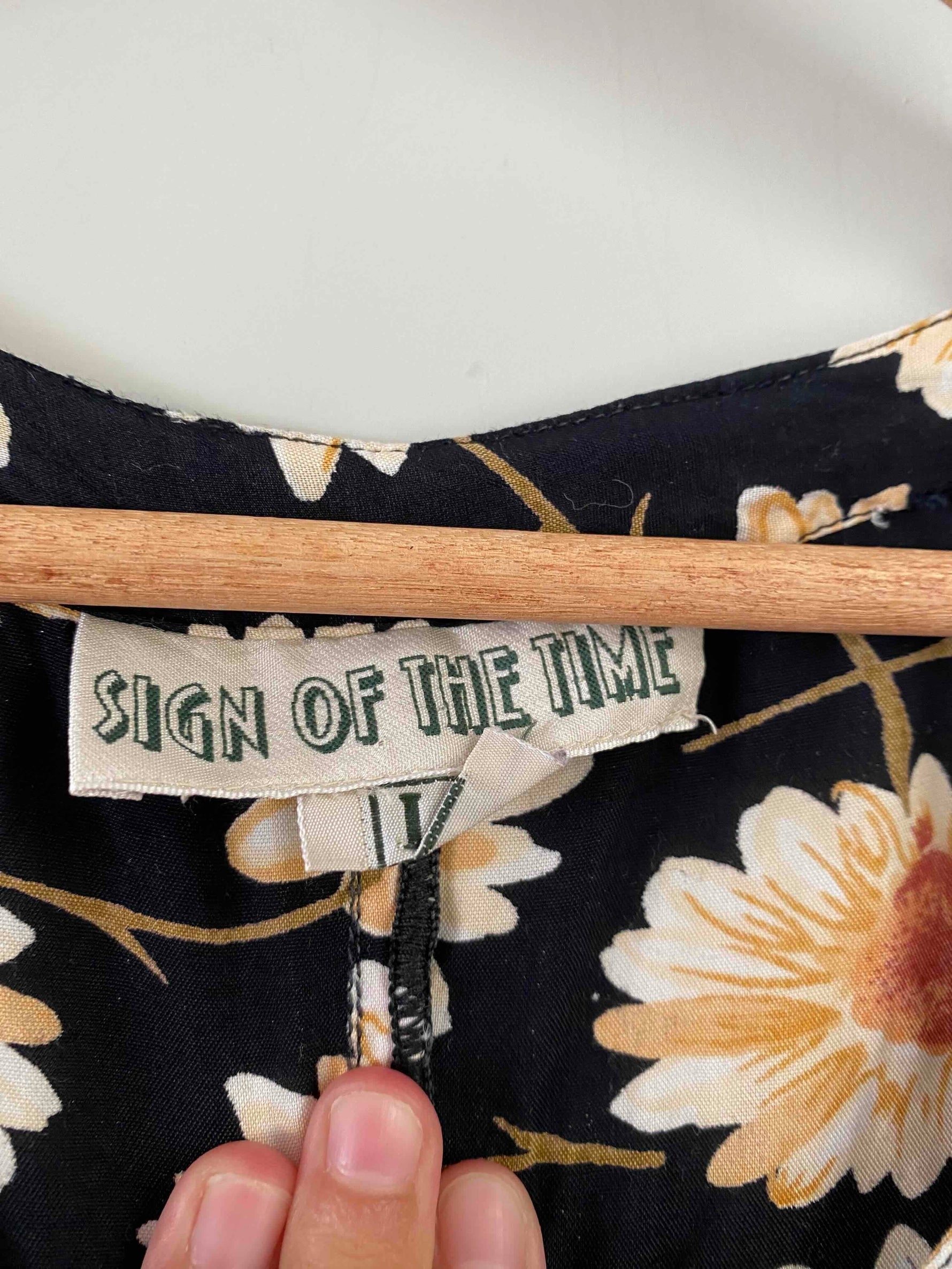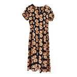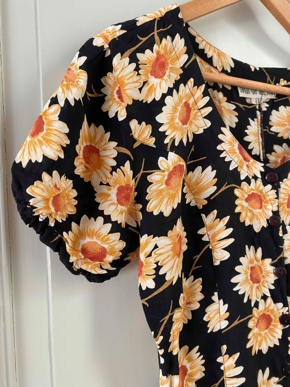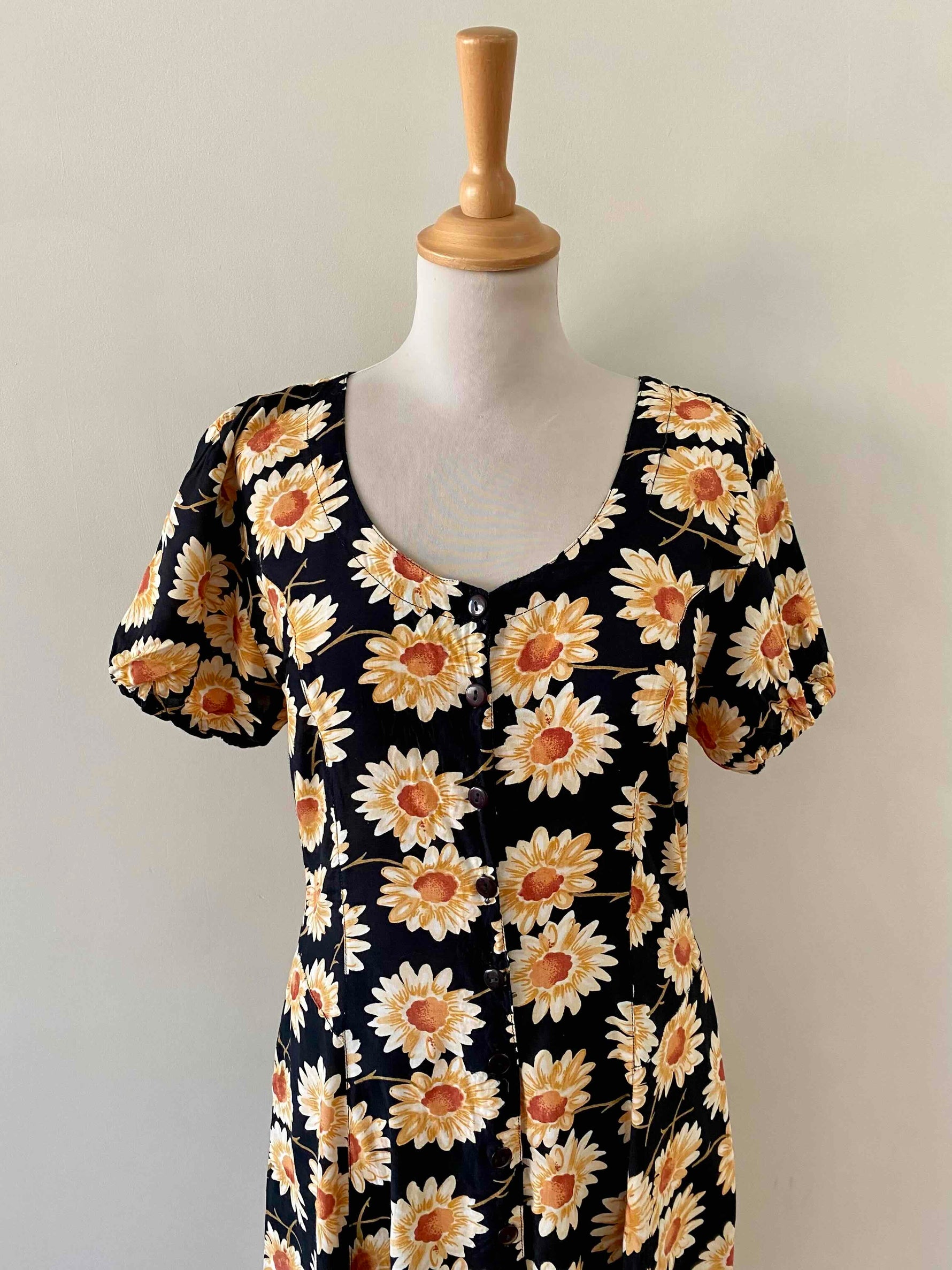 Prix unitaire parRobe longue à fleurs, en viscose noire imprimée marguerites blanches, oranges et jaunes, manches ballons élastiques, boutonnée devant, taille ceintrée, années 80’s, taille 36 et petit 38 portée ici sur un mannequin T36, aisselles 44cm.