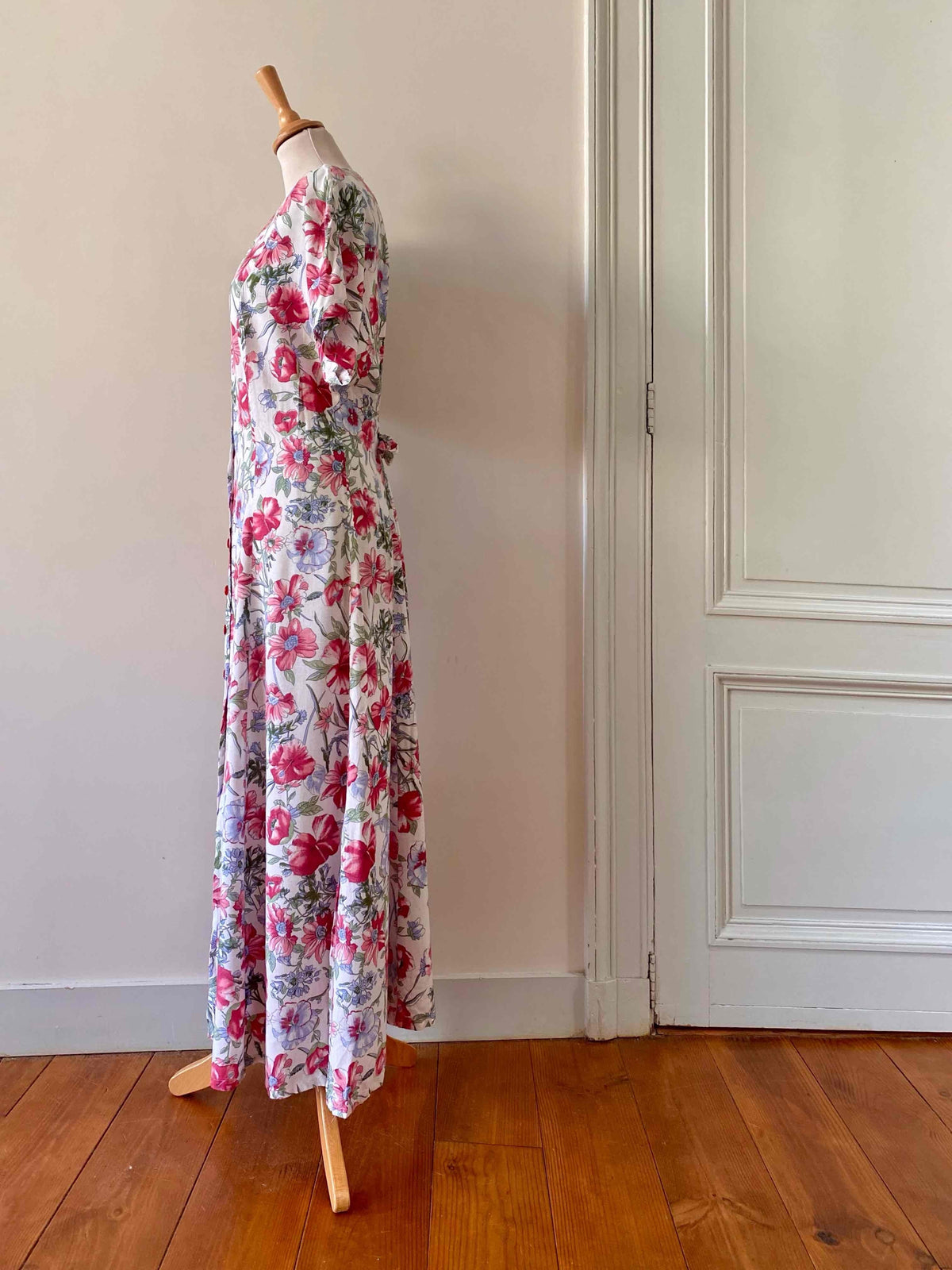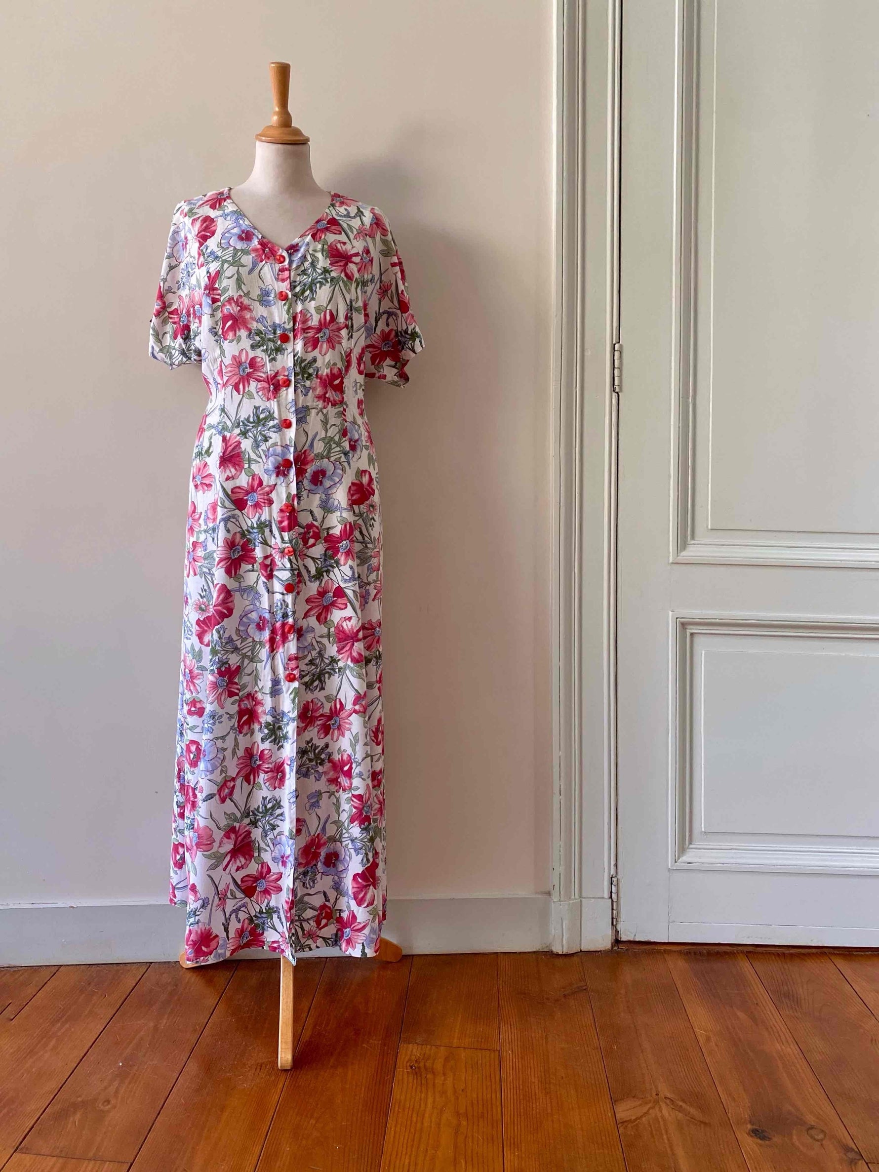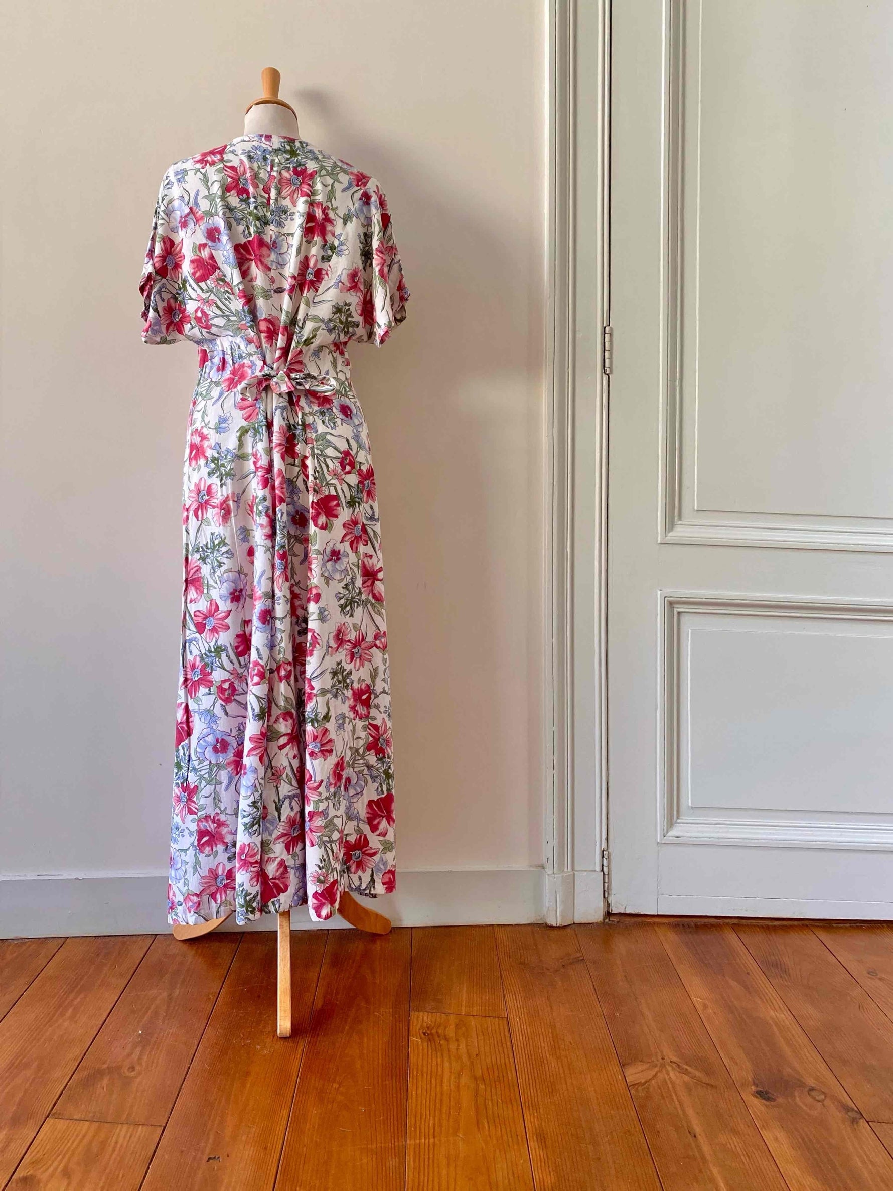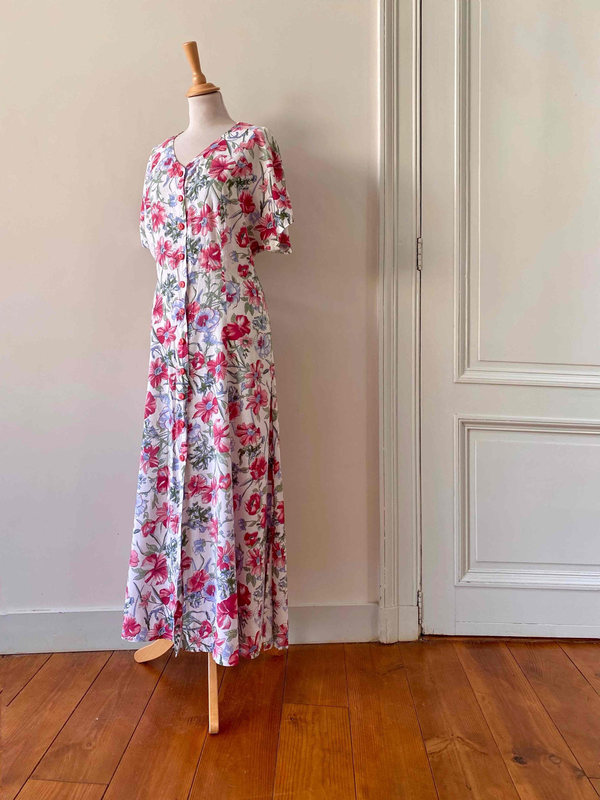 Prix unitaire parRobe longue à fleurs, en viscose blanche chinée beige, imprimée fleurs roses fuschias, pastel, bleu ciel et vertes, boutonnée, taille dos à nouer, années 80’s, taille 38 et 40 portée ici sur un mannequin T36, aisselles 47cm.