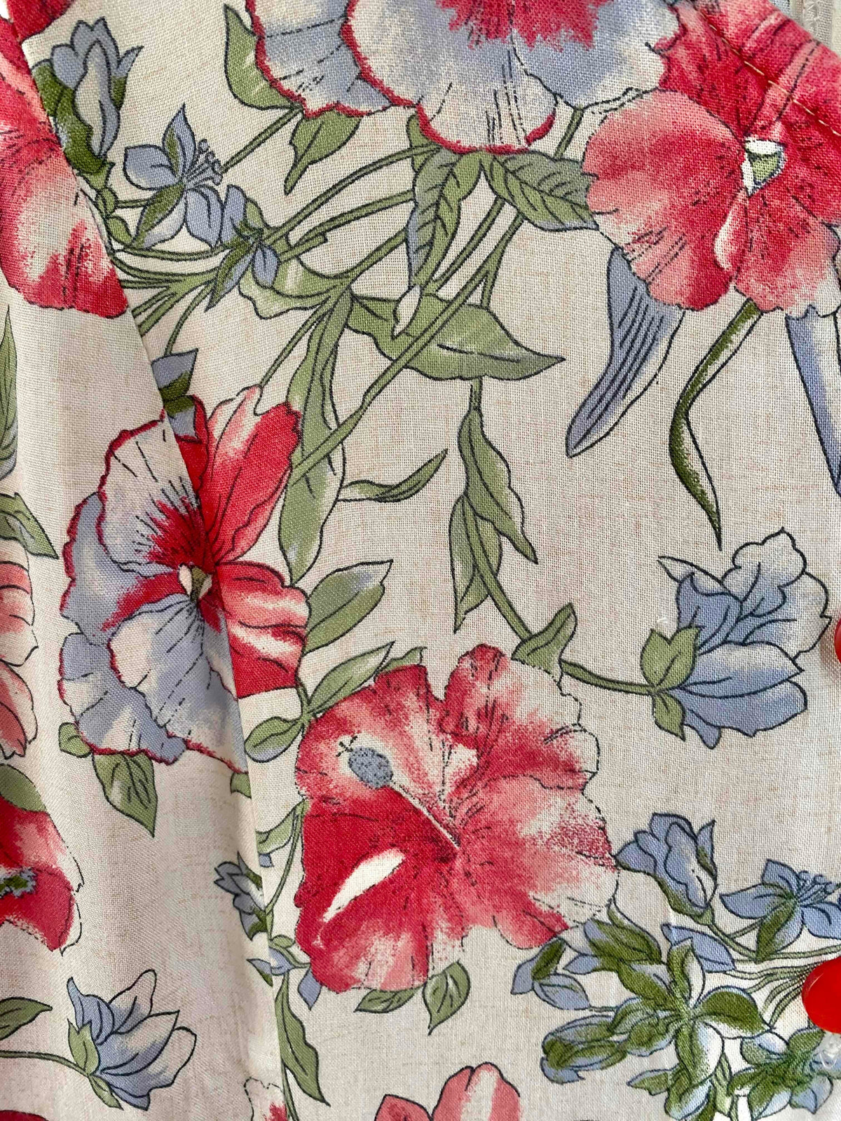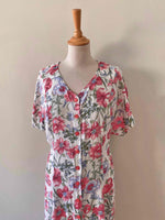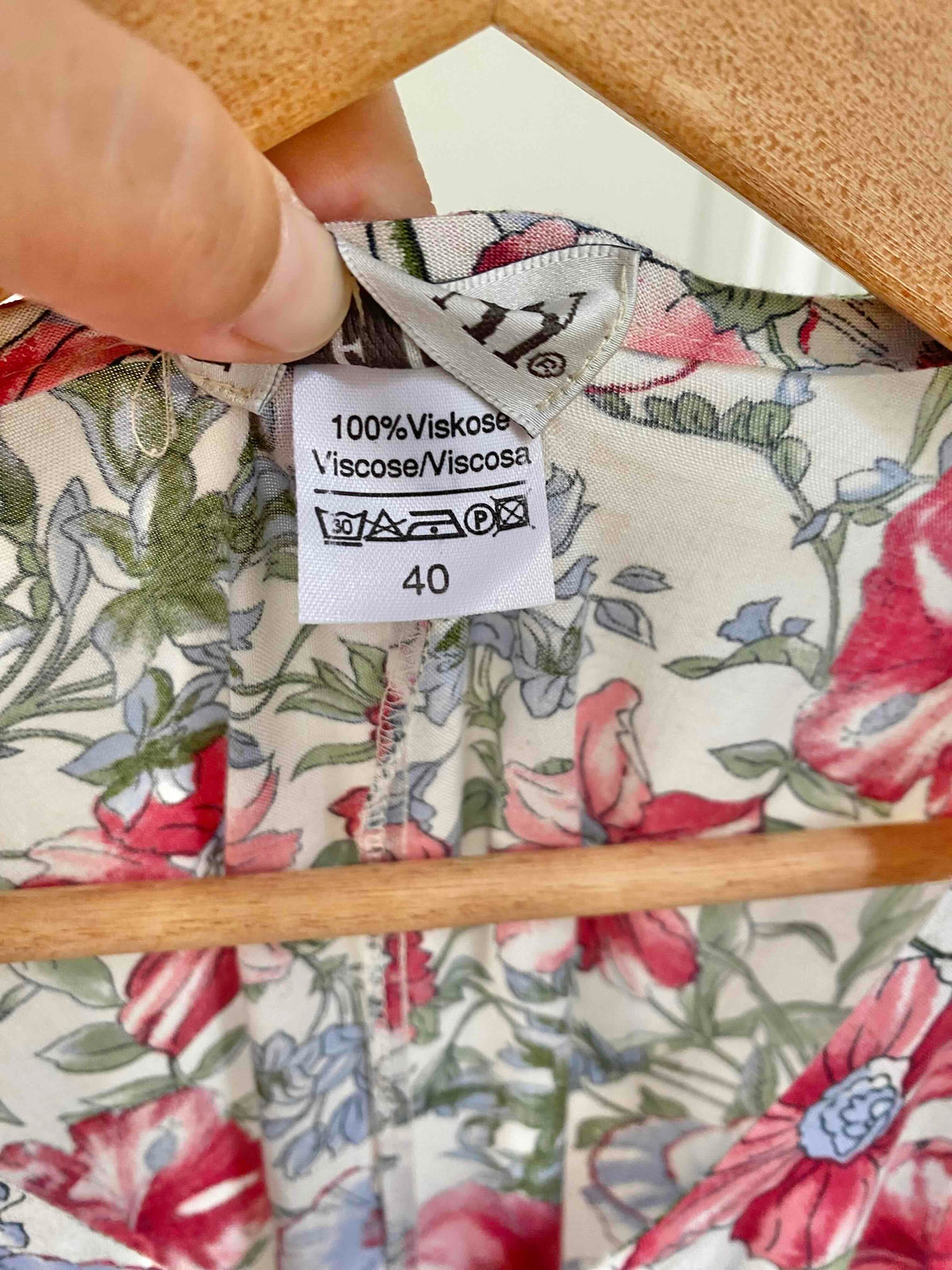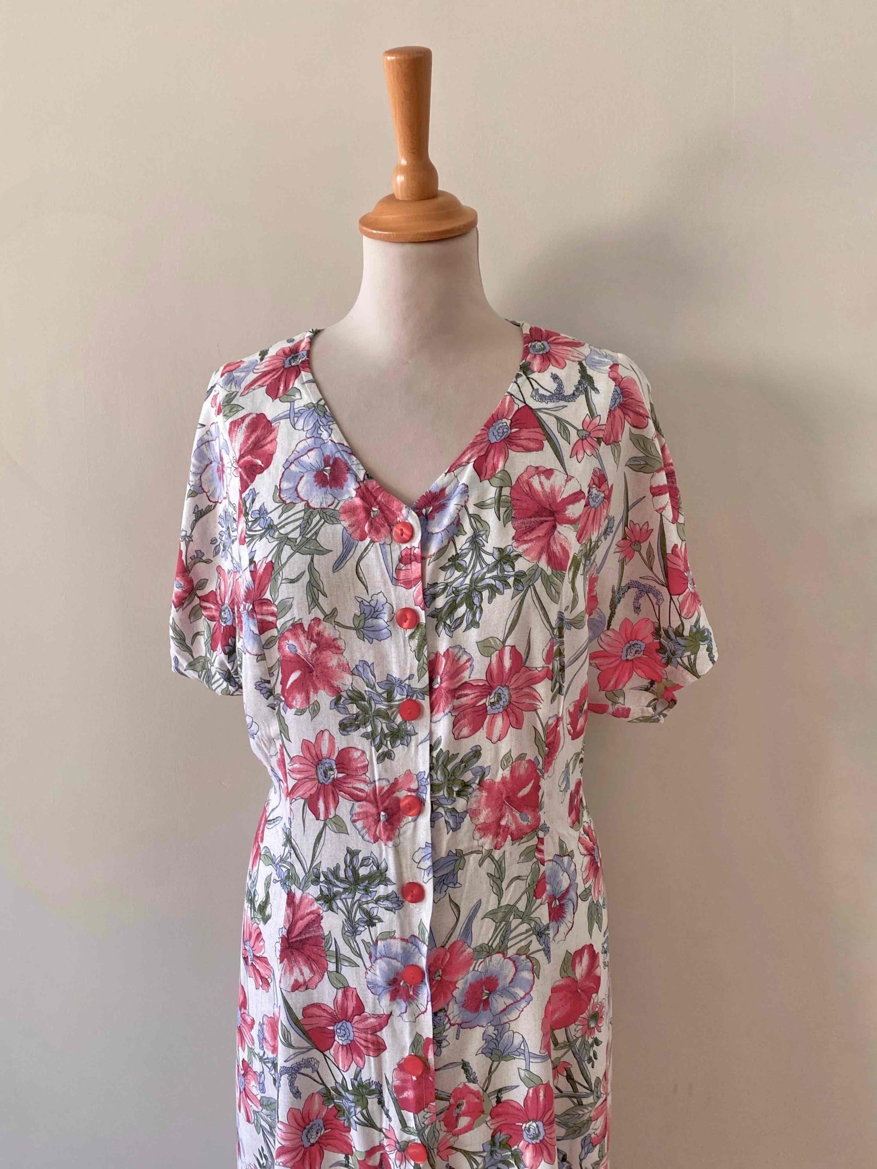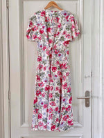 Prix unitaire parRobe longue à fleurs, en viscose blanche chinée beige, imprimée fleurs roses fuschias, pastel, bleu ciel et vertes, boutonnée, taille dos à nouer, années 80’s, taille 38 et 40 portée ici sur un mannequin T36, aisselles 47cm.