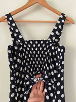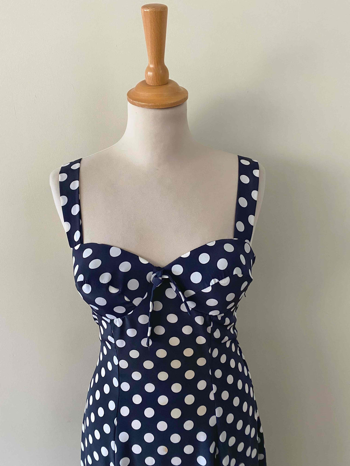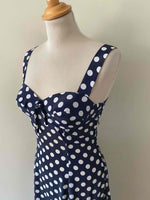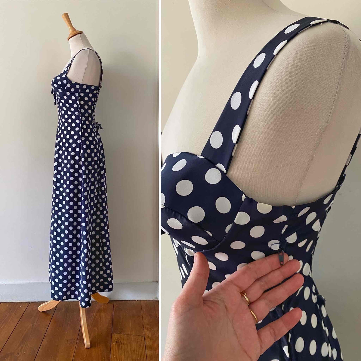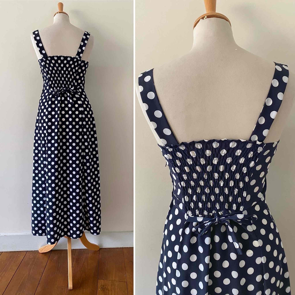 Prix unitaire parRobe longue à pois, en viscose bleue foncé imprimée pois blancs, poitrine corbeille à coques rembourrées fines esprit corsage, bretelles larges, dos smock élastique à nouer, fermeture éclaire côté, fabriquée en France, taille 36 portée ici sur un mannequin T36.