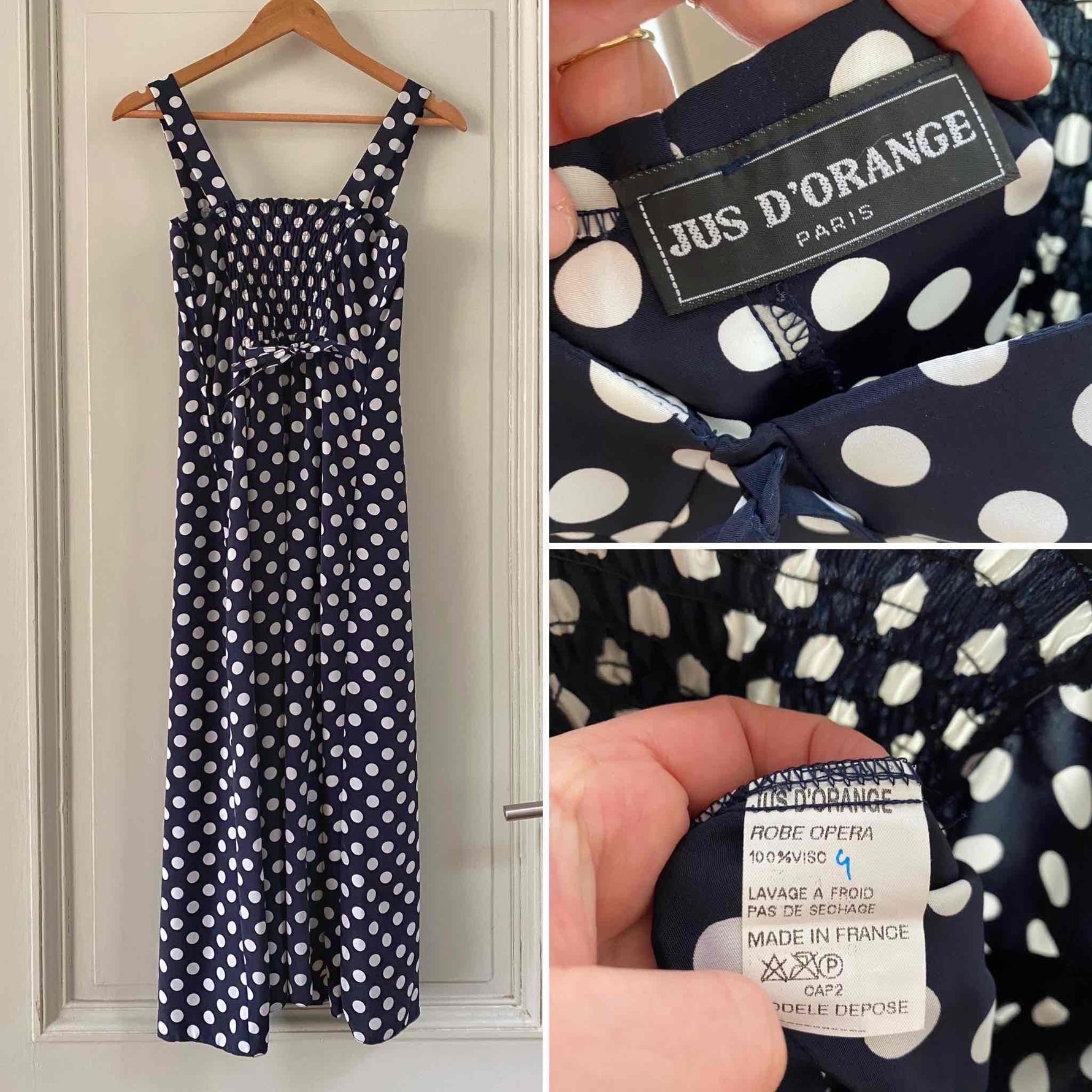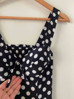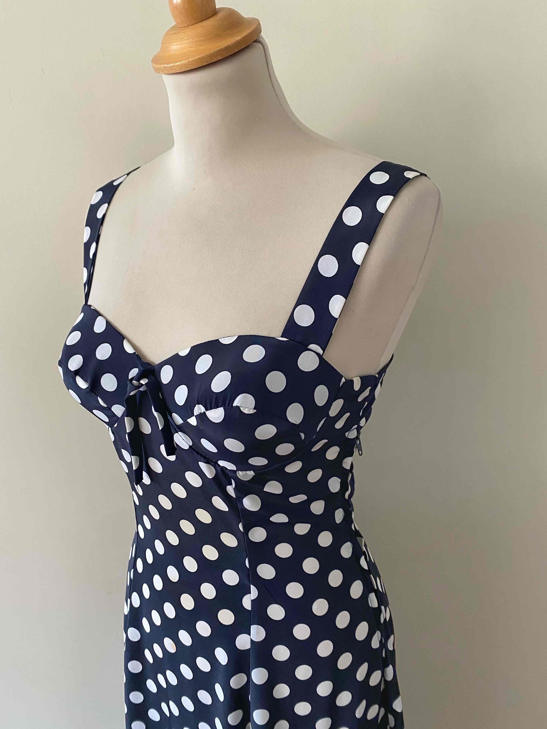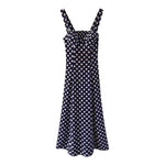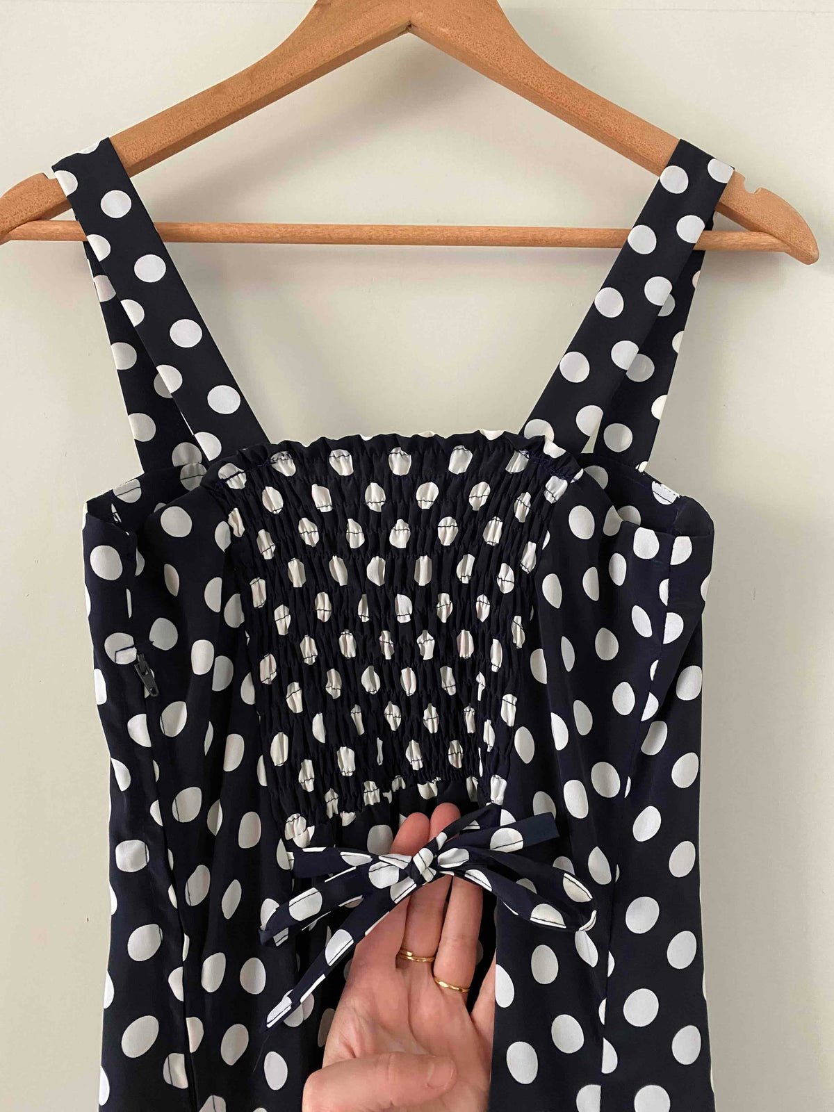 Prix unitaire parRobe longue à pois, en viscose bleue foncé imprimée pois blancs, poitrine corbeille à coques rembourrées fines esprit corsage, bretelles larges, dos smock élastique à nouer, fermeture éclaire côté, fabriquée en France, taille 36 portée ici sur un mannequin T36.