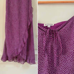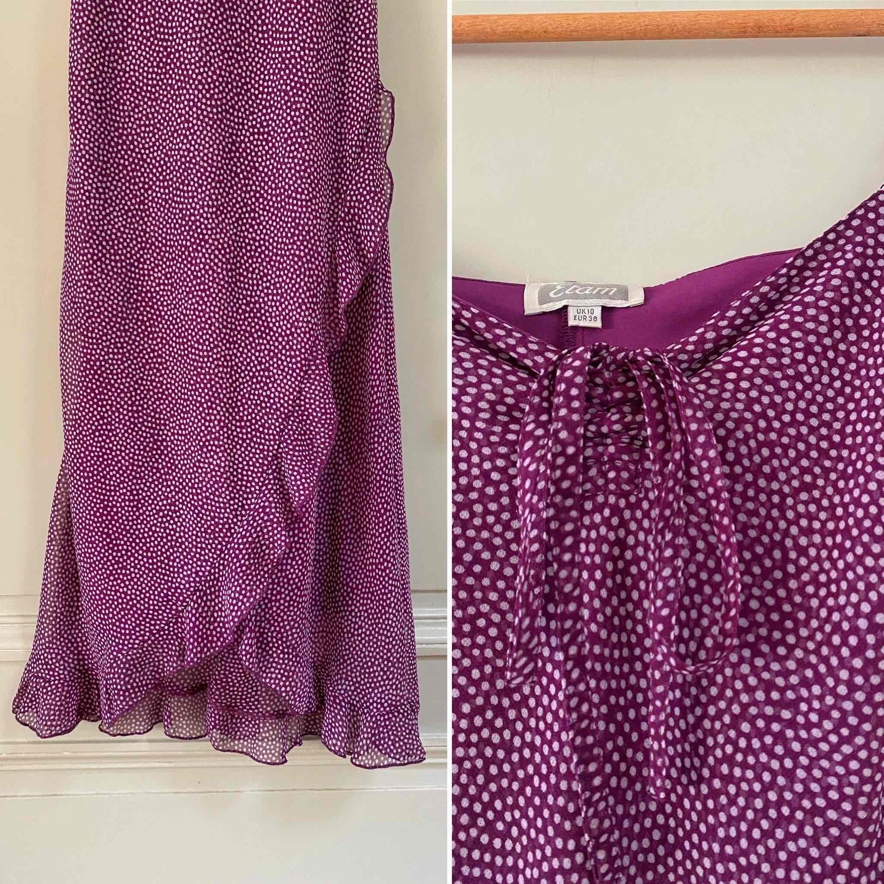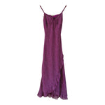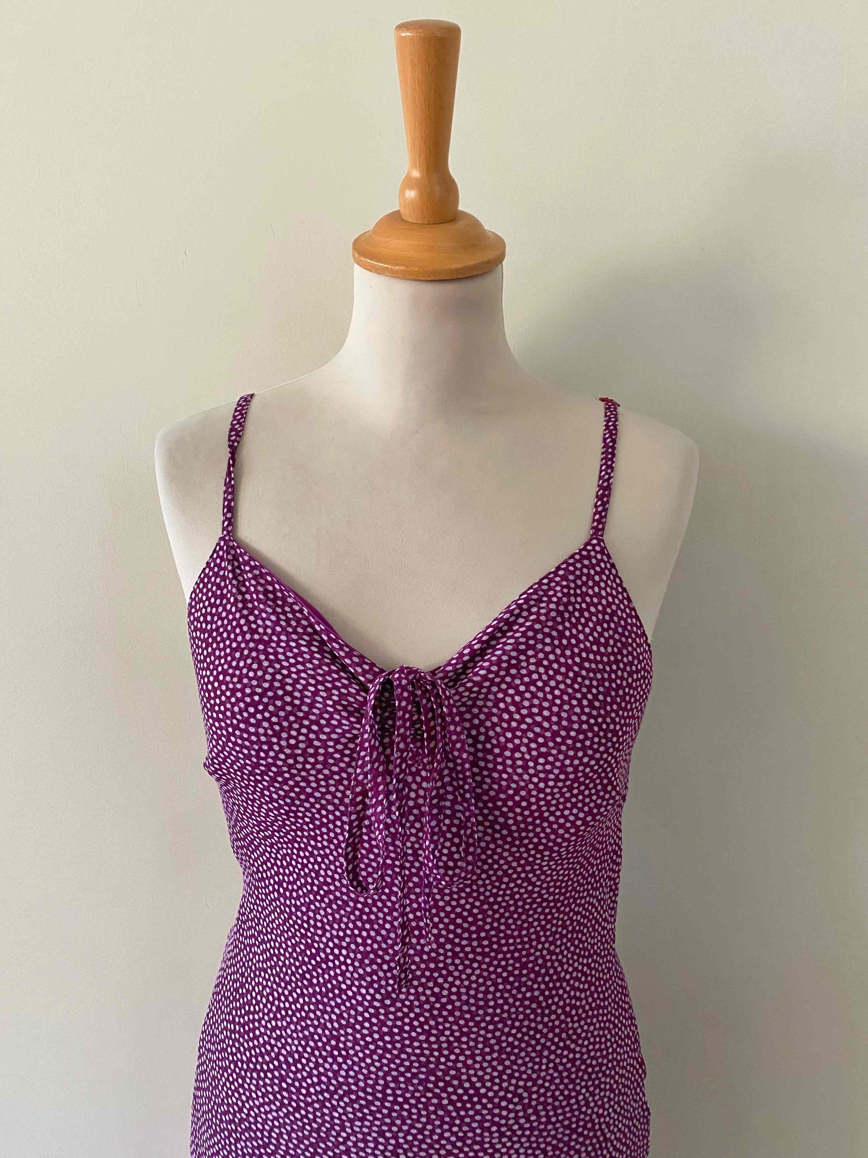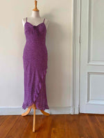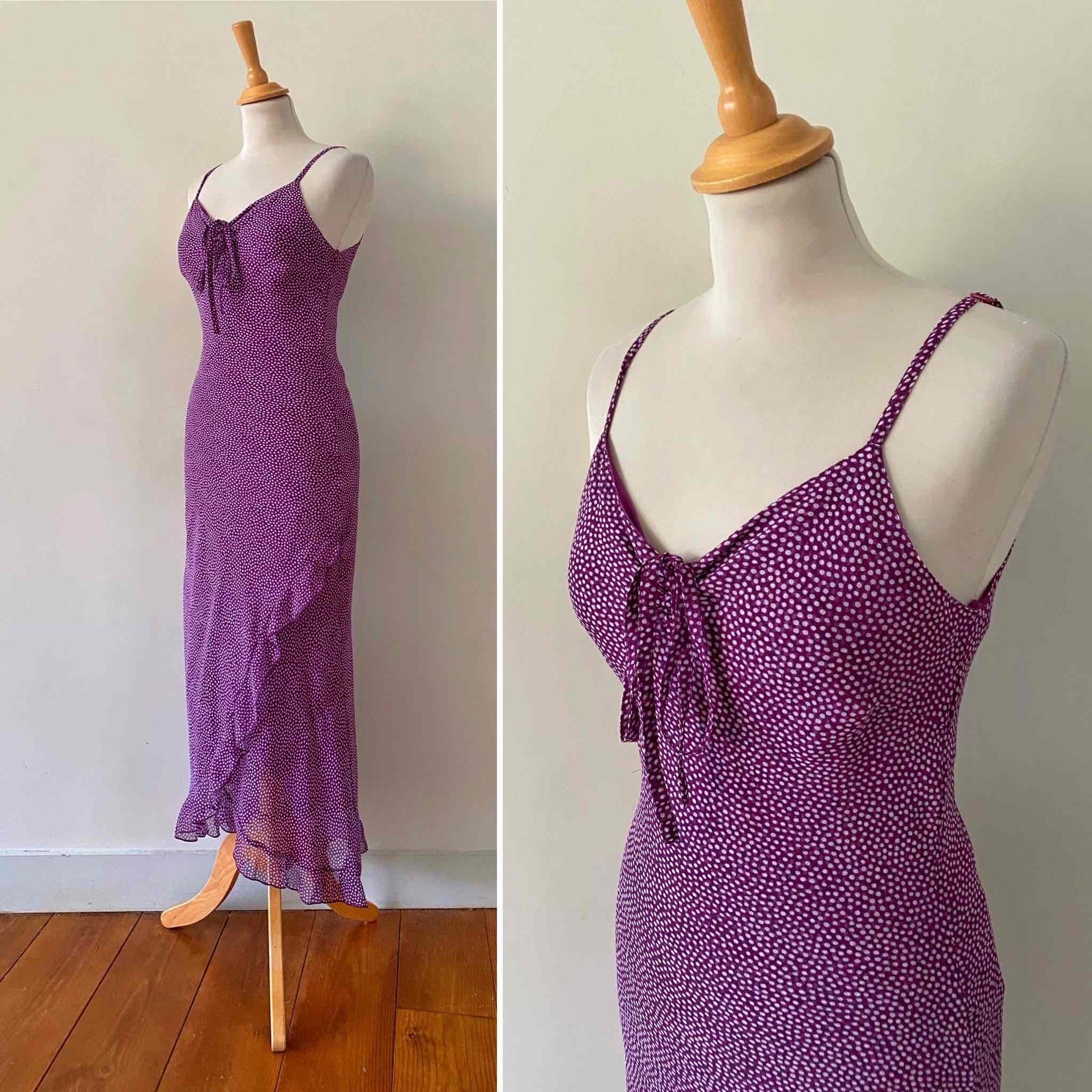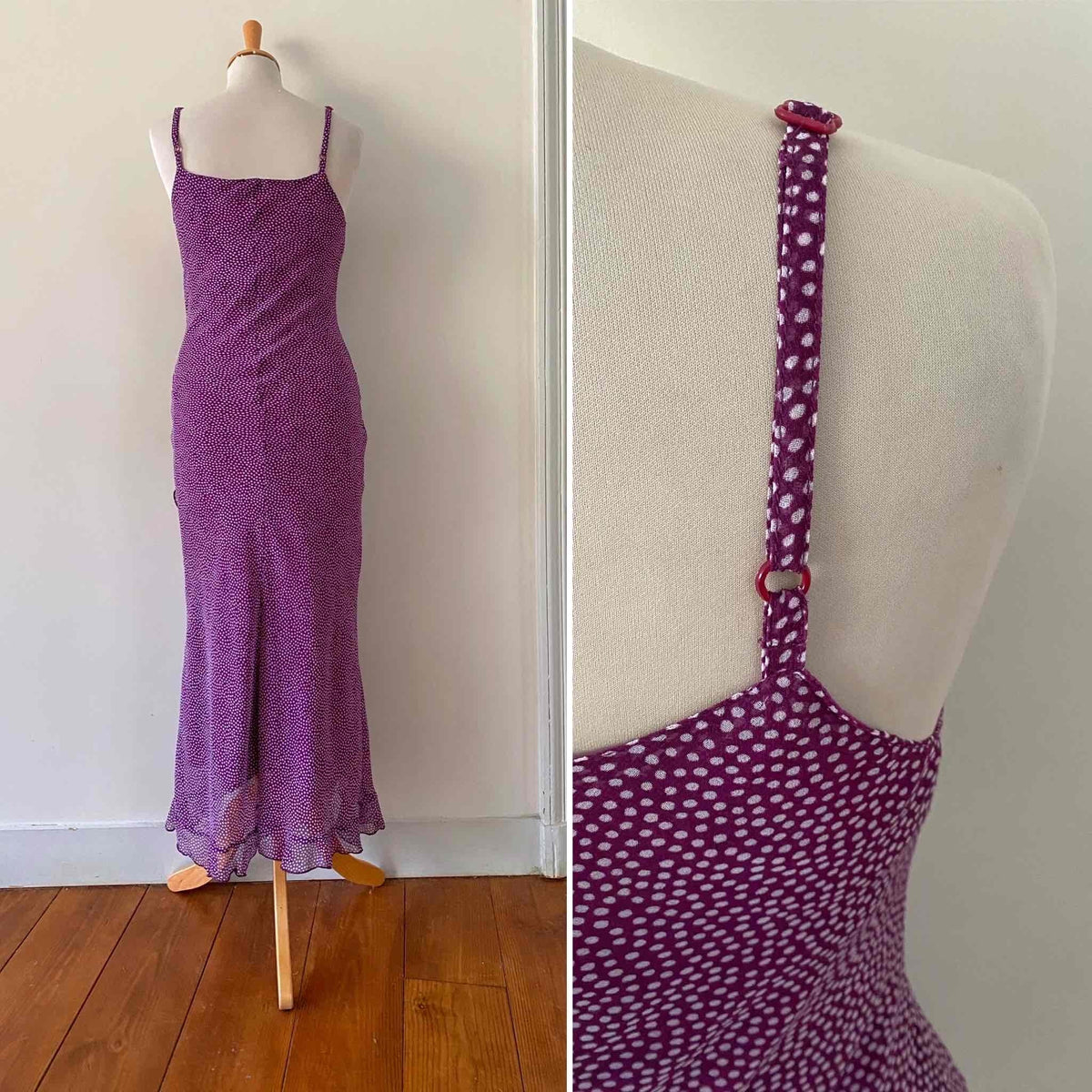 Prix unitaire parRobe longue à pois en voile viscose doublée violet prune imprimée petits pois blancs lilas, fines bretelles réglables, poitrine froncée à nouer, forme fit and flare en biais avec Volants asymétriques en bas, longueur maxi, années 90’s, taille 36 portée ici sur un mannequin T36, aisselles 43cm.