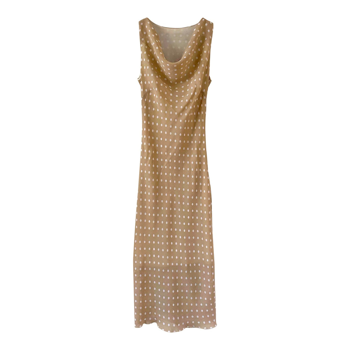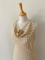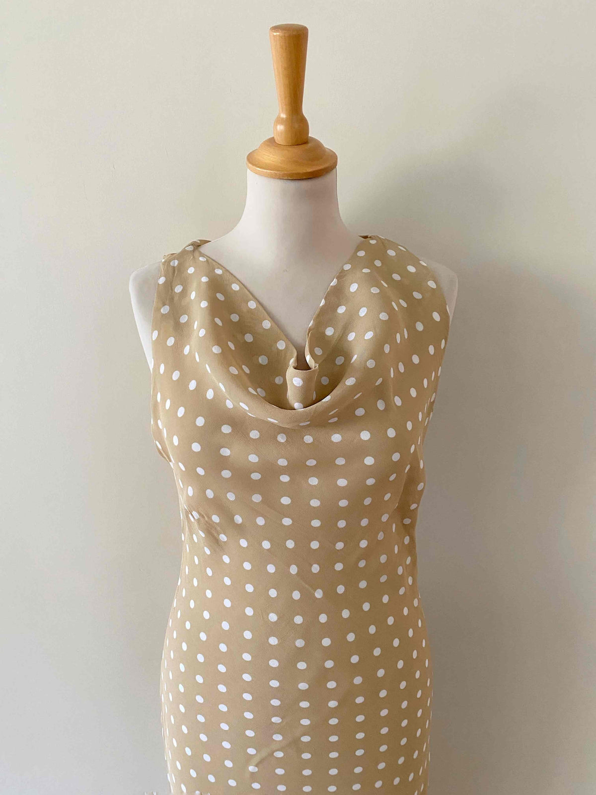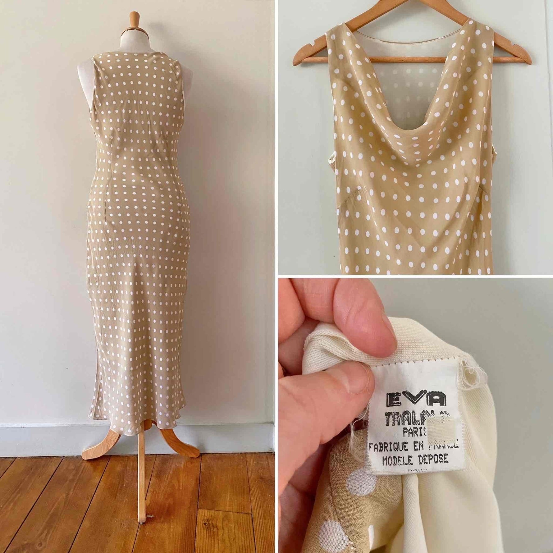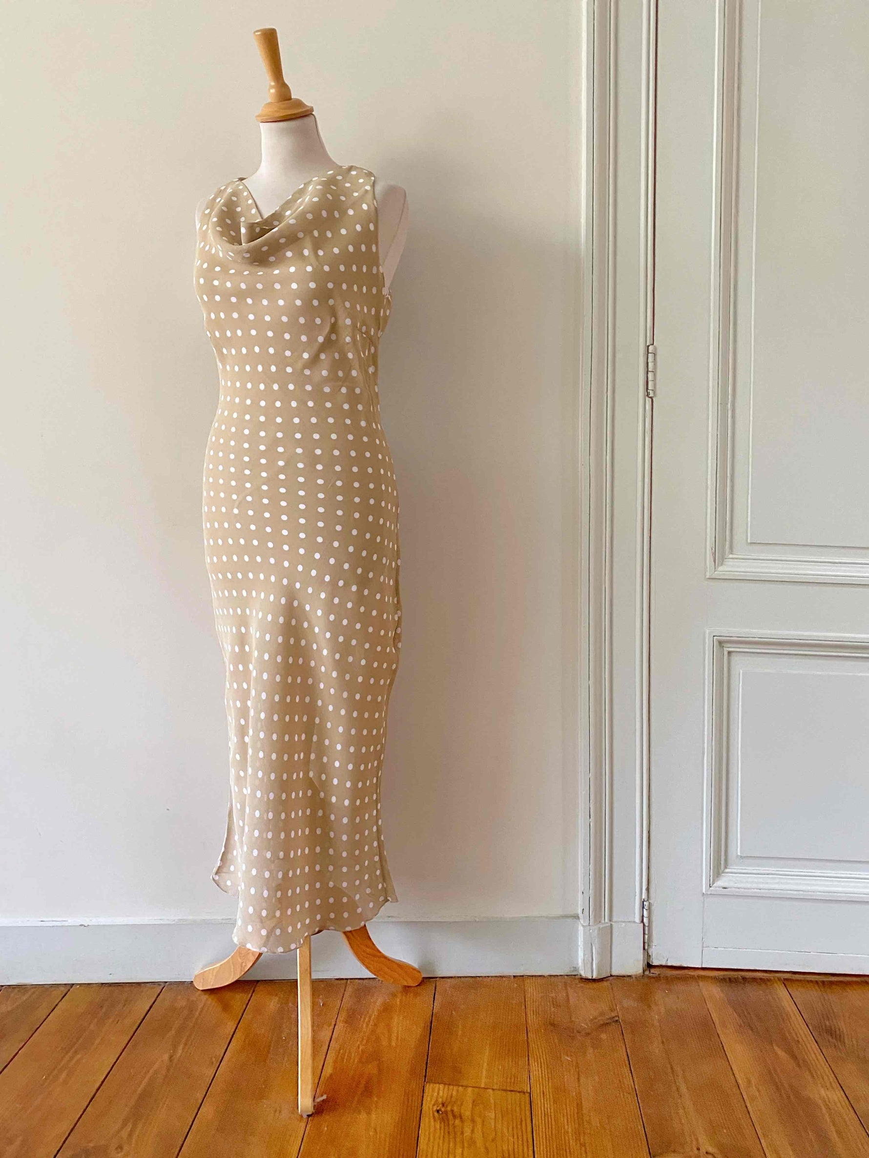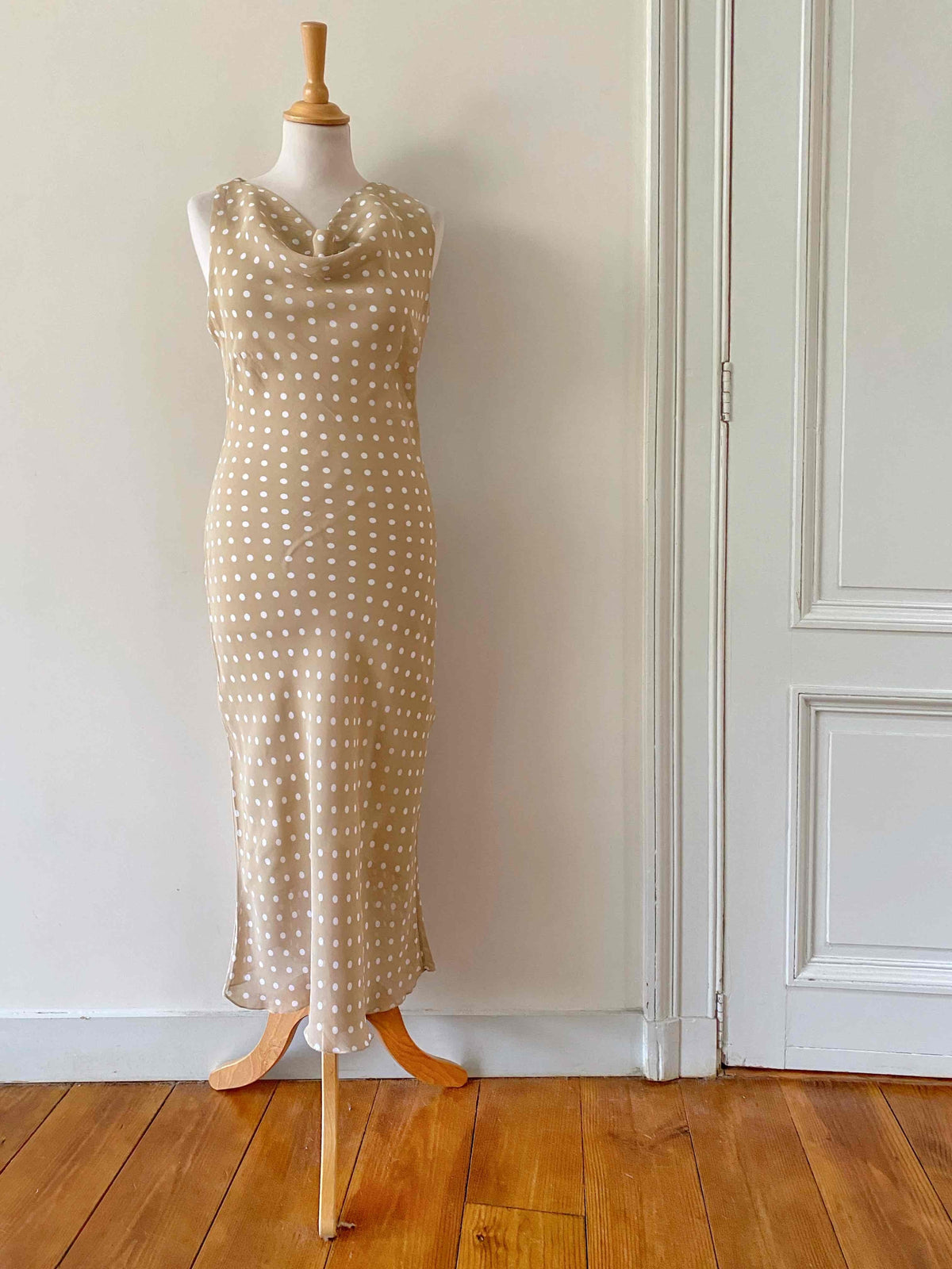 Prix unitaire parRobe longue à pois en voile viscose doublée camel beige imprimée pois blancs, col benitier, forme fit and flare en biais, fabriquée en France, taille 36 portée ici sur un mannequin T36.
