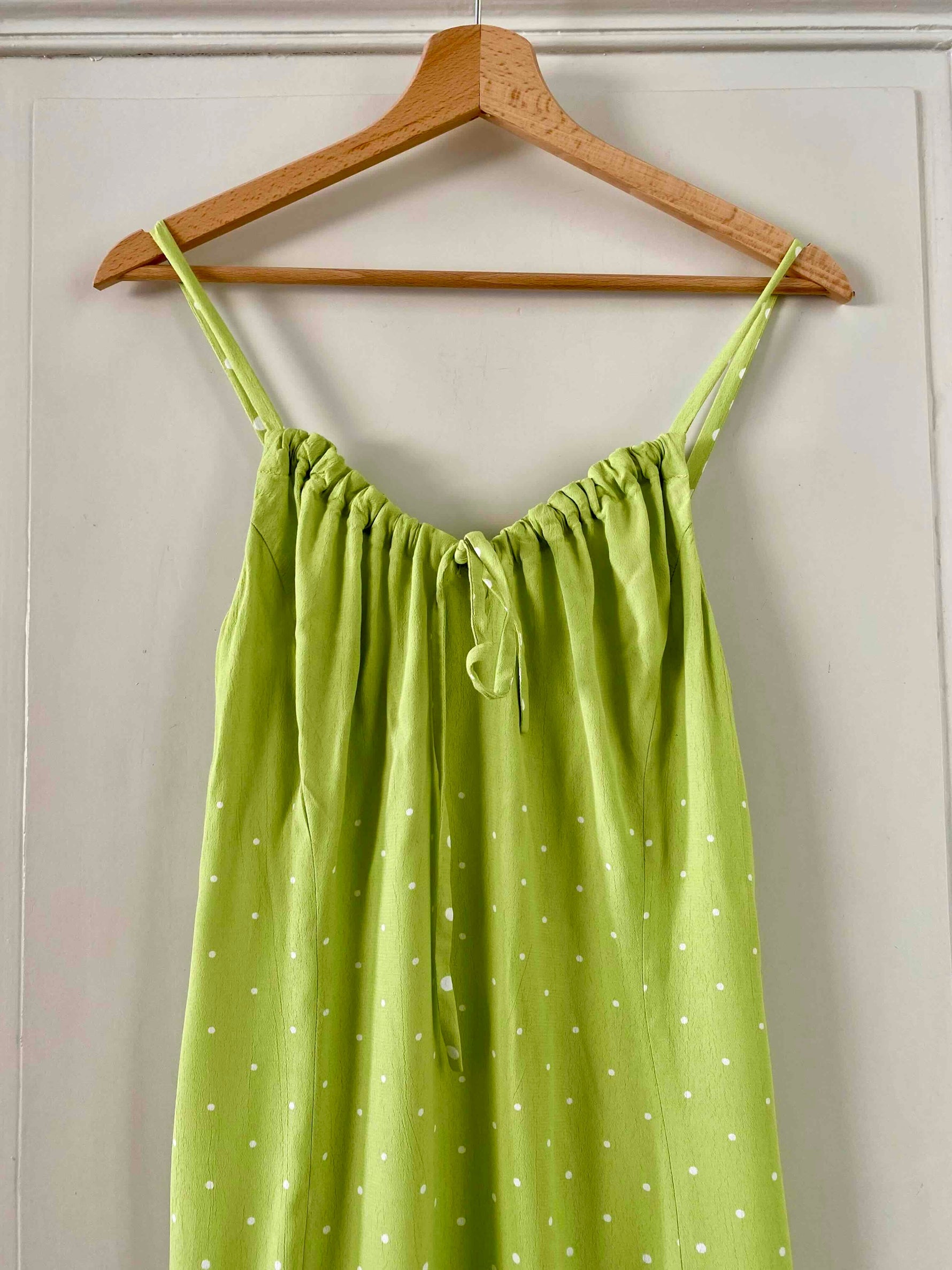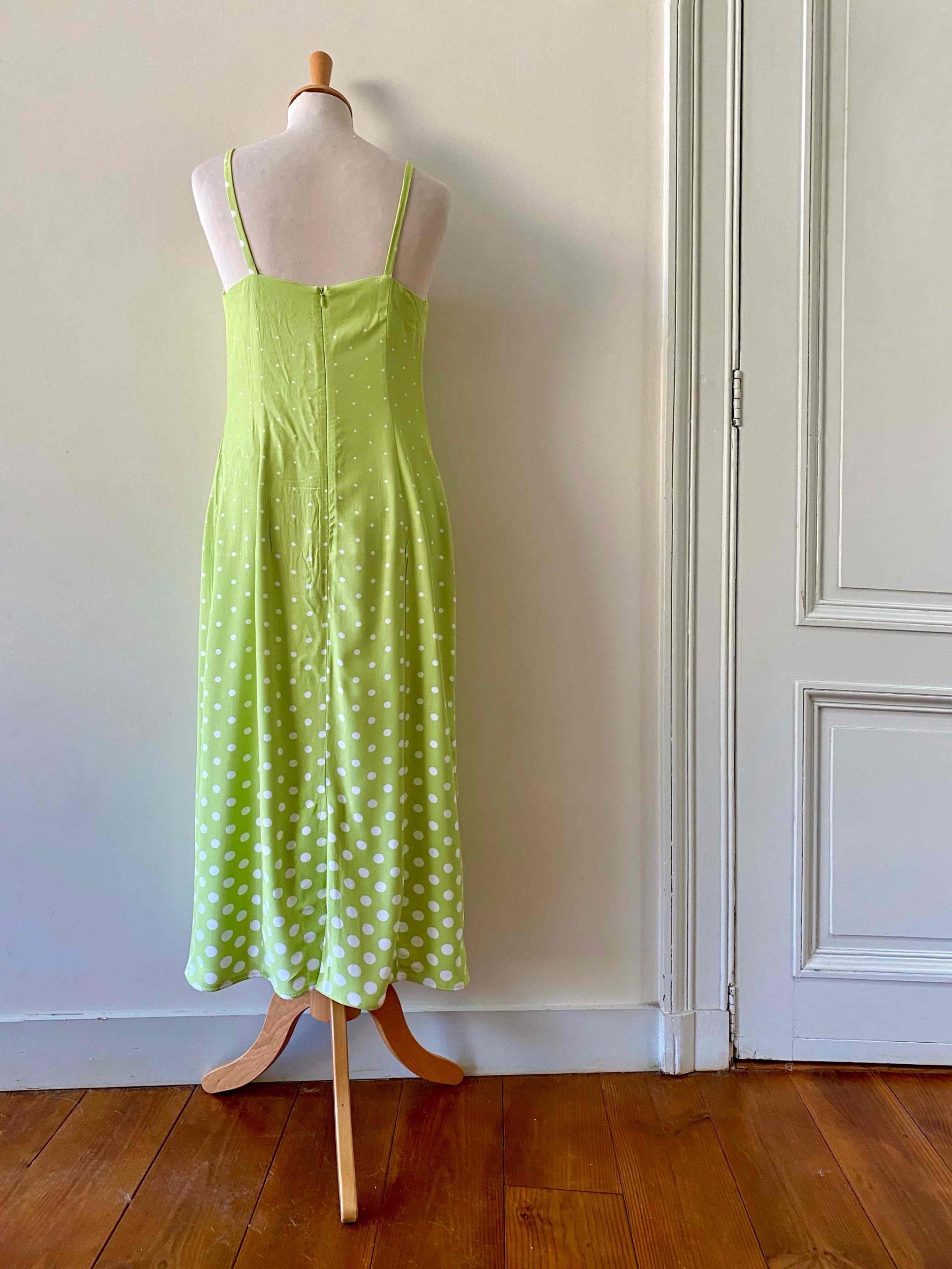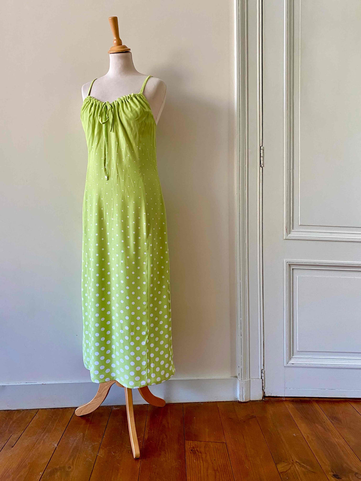 Prix unitaire parRobe longue à pois en viscose vert pistache imprimé pois blancs, bretelles spaghettis, poitrine froncée à nouer, fente au dos, fabriquée en France, taille actuelle 36 et petit 38 portée ici sur un mannequin T36, aisselles 43cm.