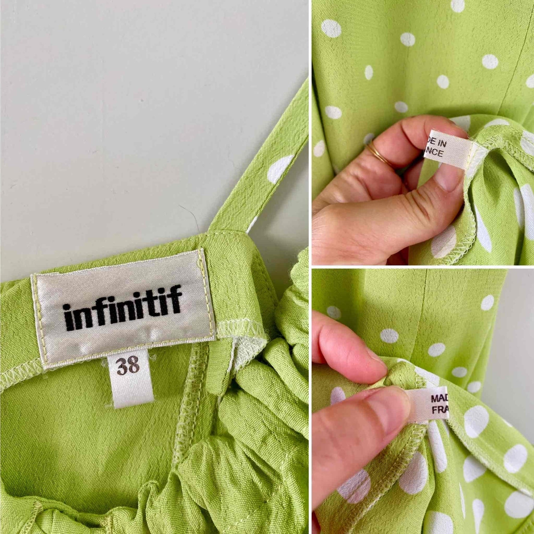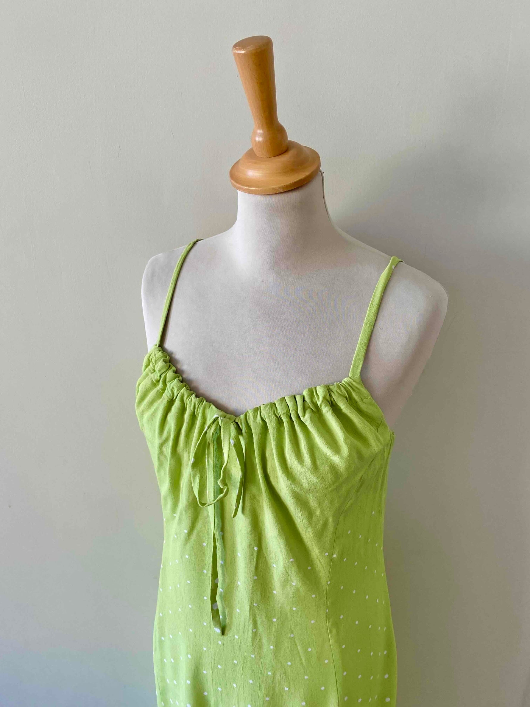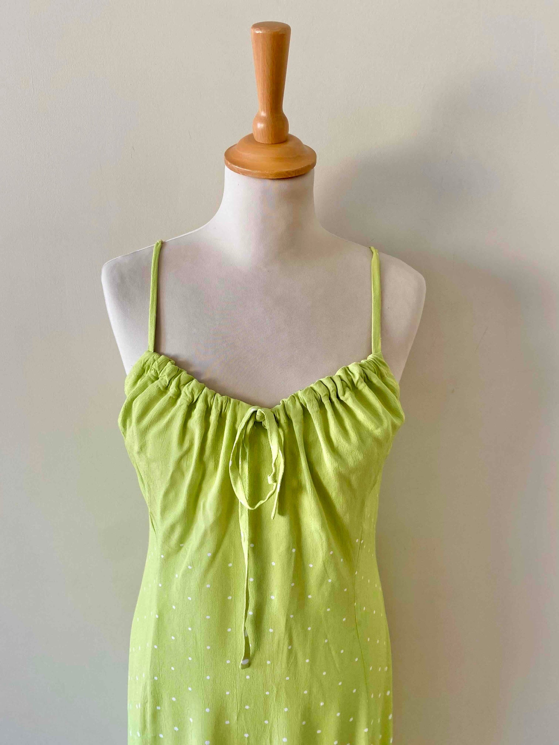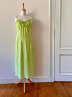 Prix unitaire parRobe longue à pois en viscose vert pistache imprimé pois blancs, bretelles spaghettis, poitrine froncée à nouer, fente au dos, fabriquée en France, taille actuelle 36 et petit 38 portée ici sur un mannequin T36, aisselles 43cm.