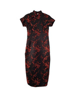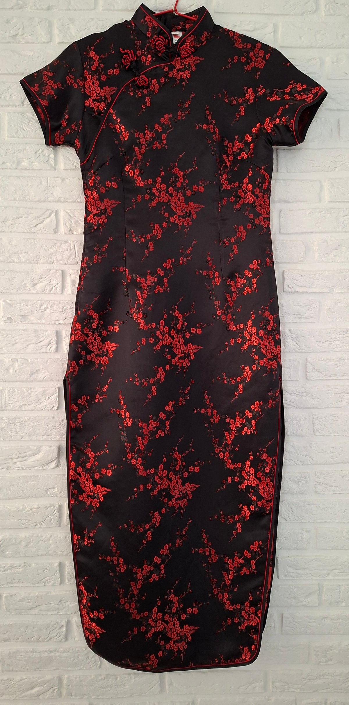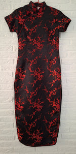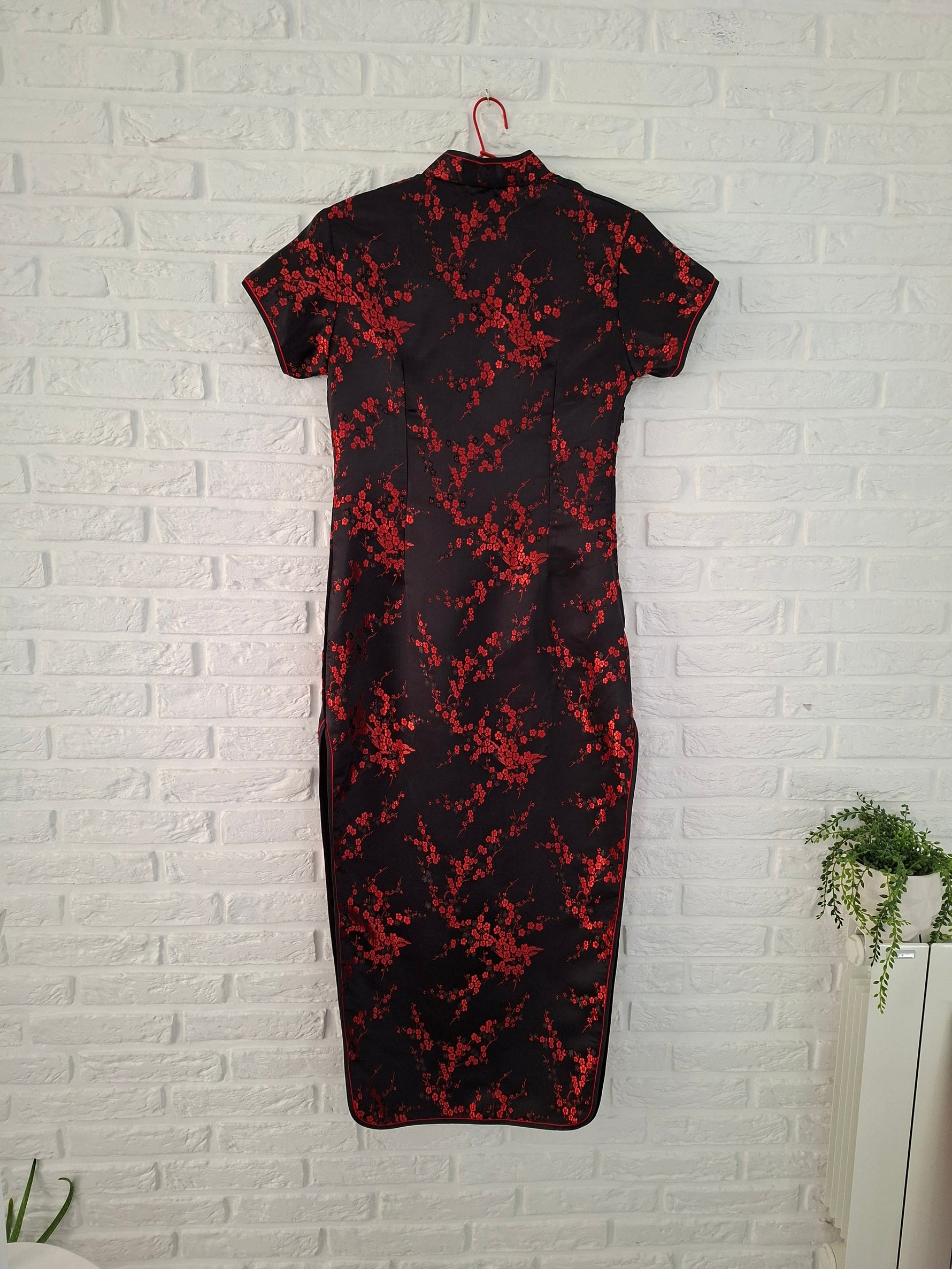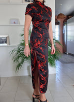 Prix unitaire parRobe longue asiatique A manches courtes. En viscose noir et fleurs rouges Col Mao. Fendue haut de chaque côté Zip et boutons chinois sur le côté Les mesures à plat Épaules 40cm Aisselles 39cm Taille 44cm Longueur 130cm