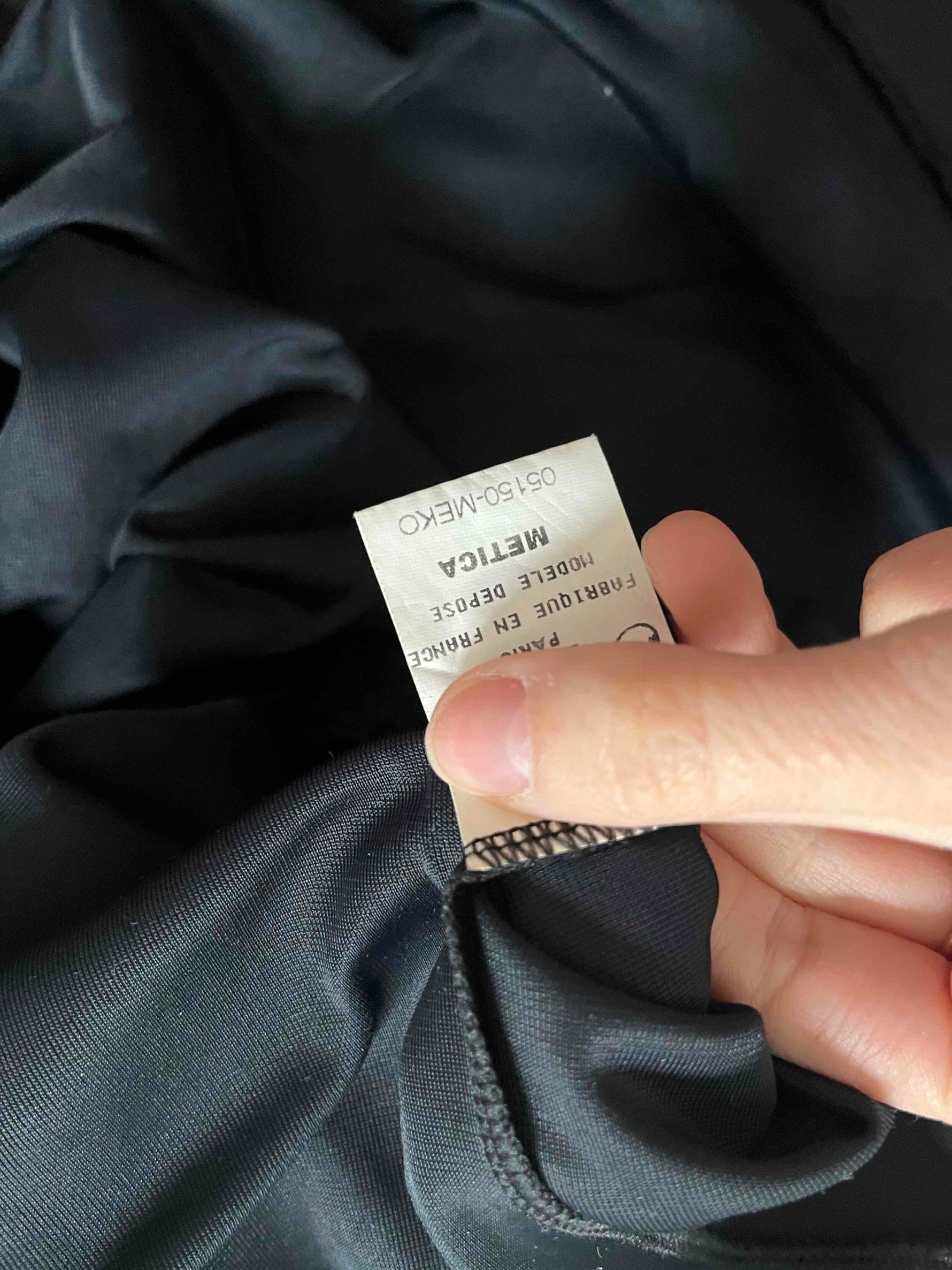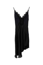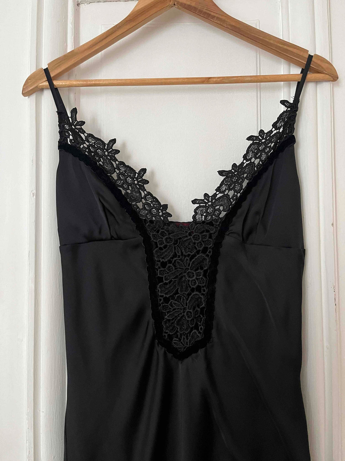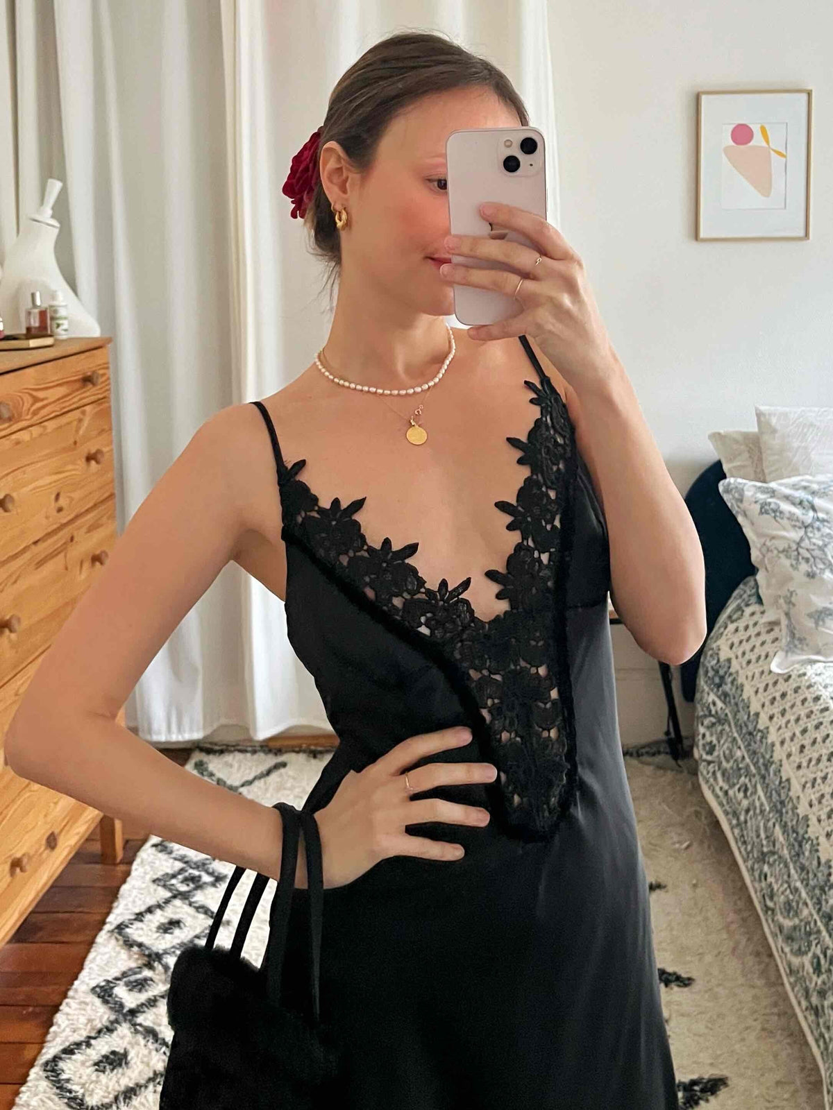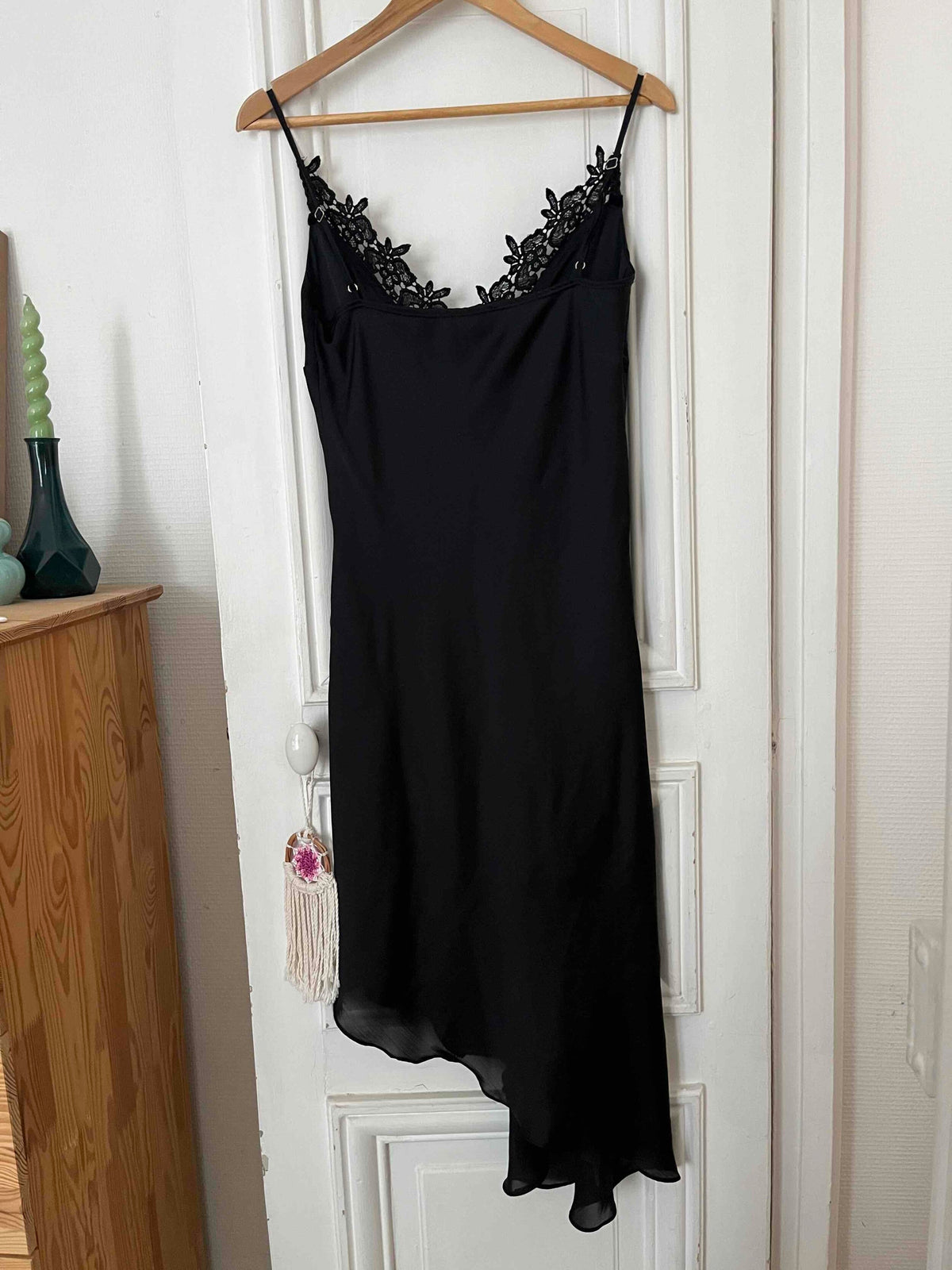 Prix unitaire parRobe noire, longueur asymétrique, décolleté en V orné de dentelle, bretelles ajustables, made in France, portée ici sur une T36 pour 1m64