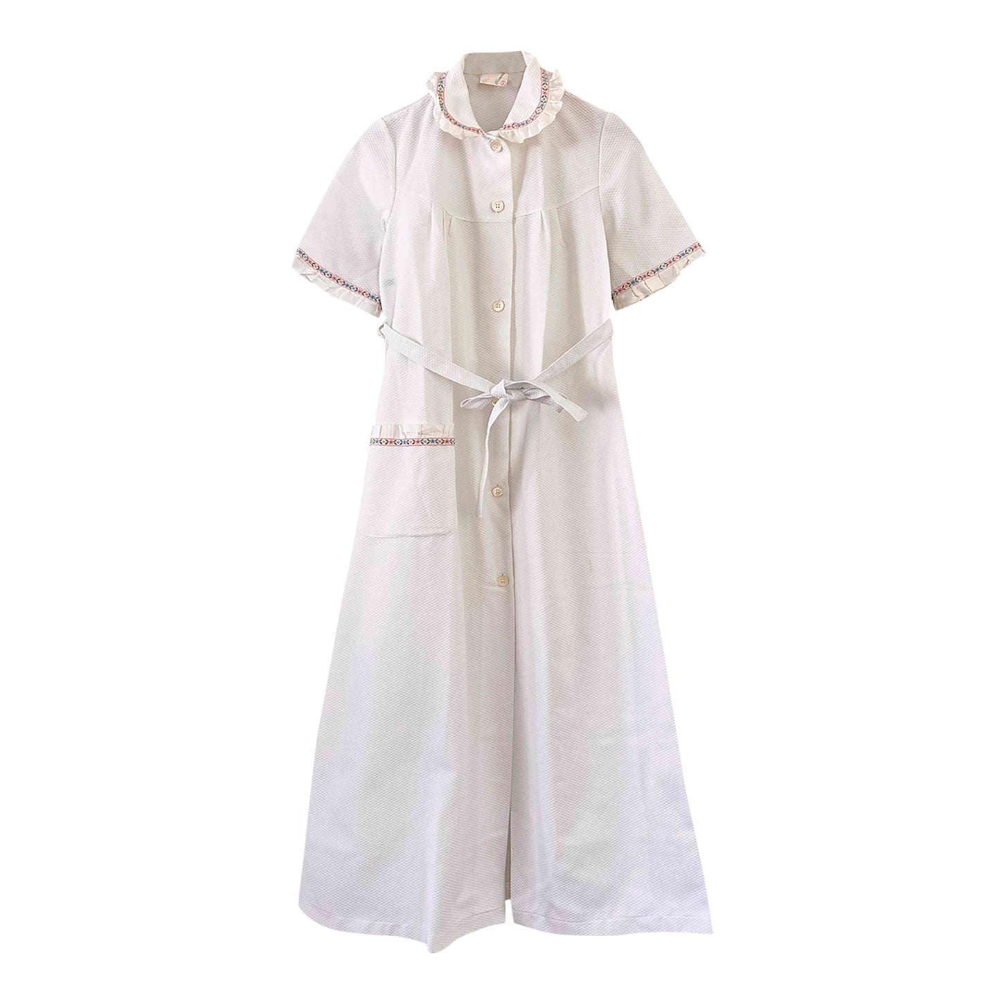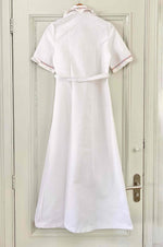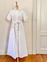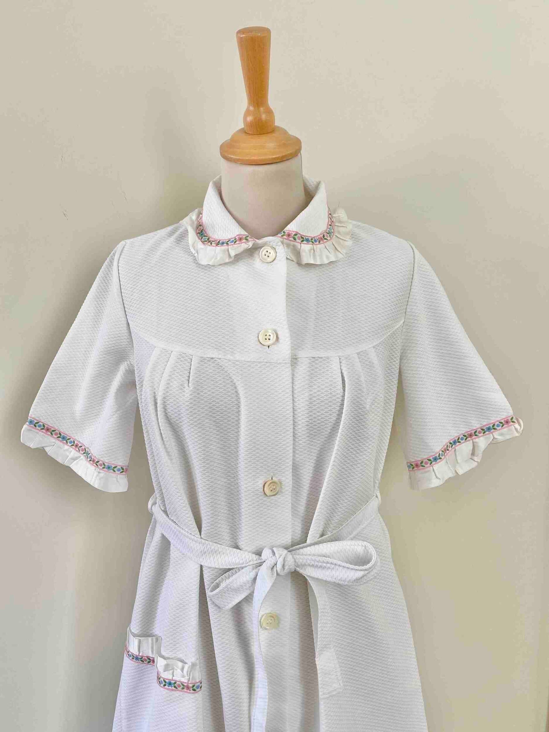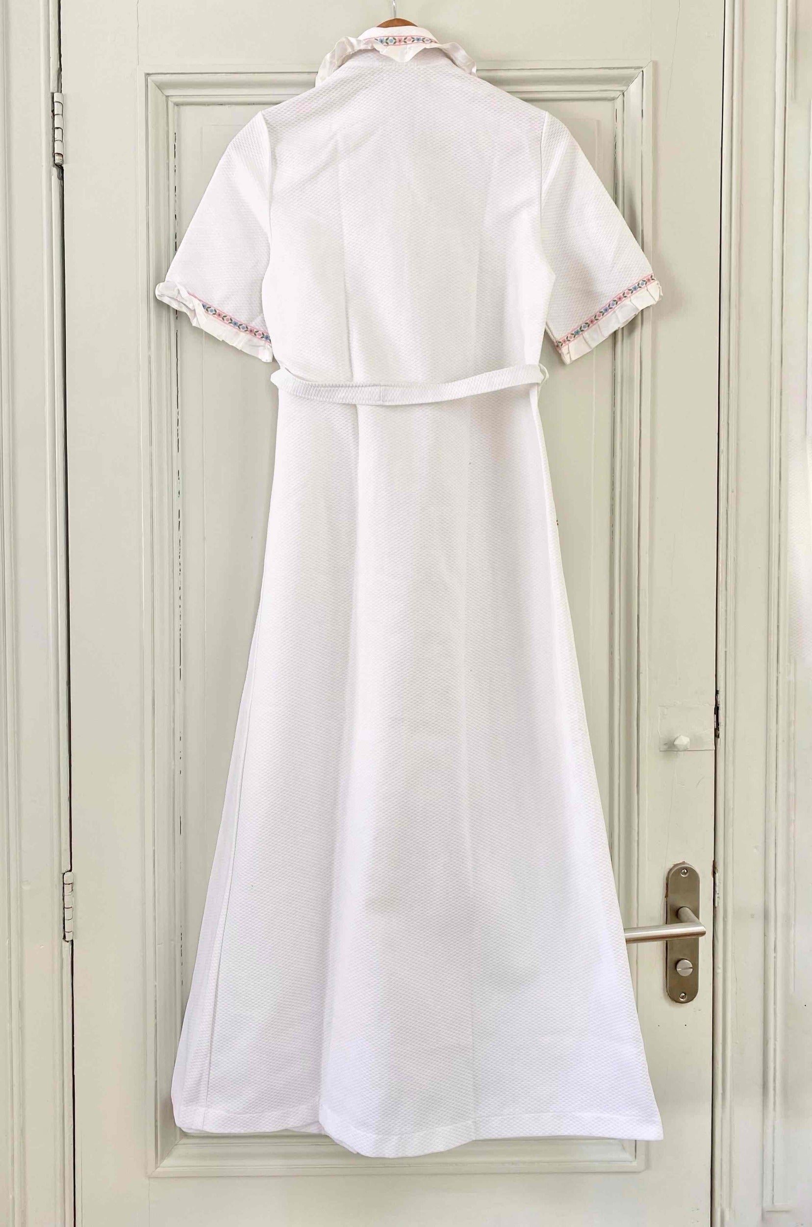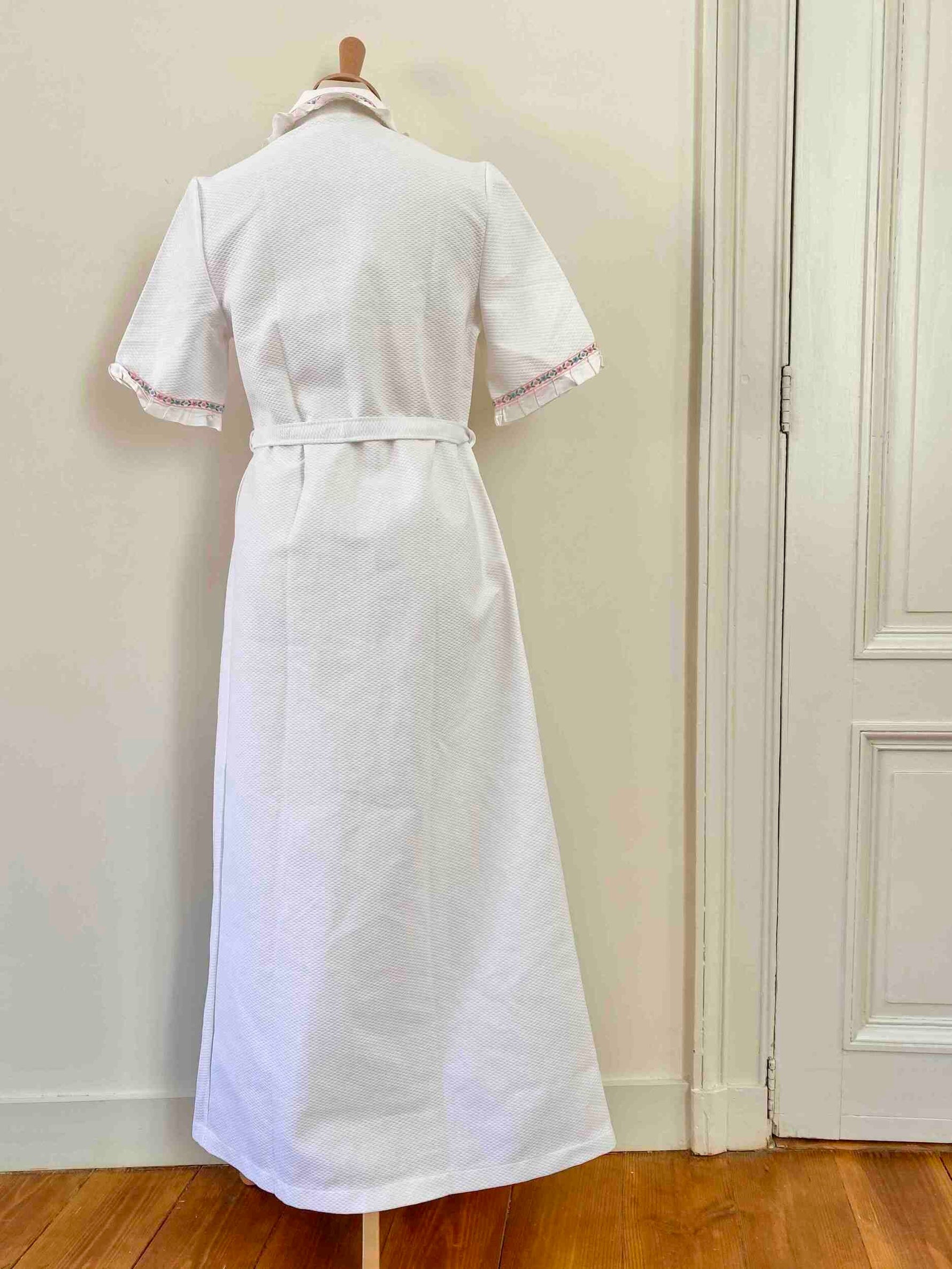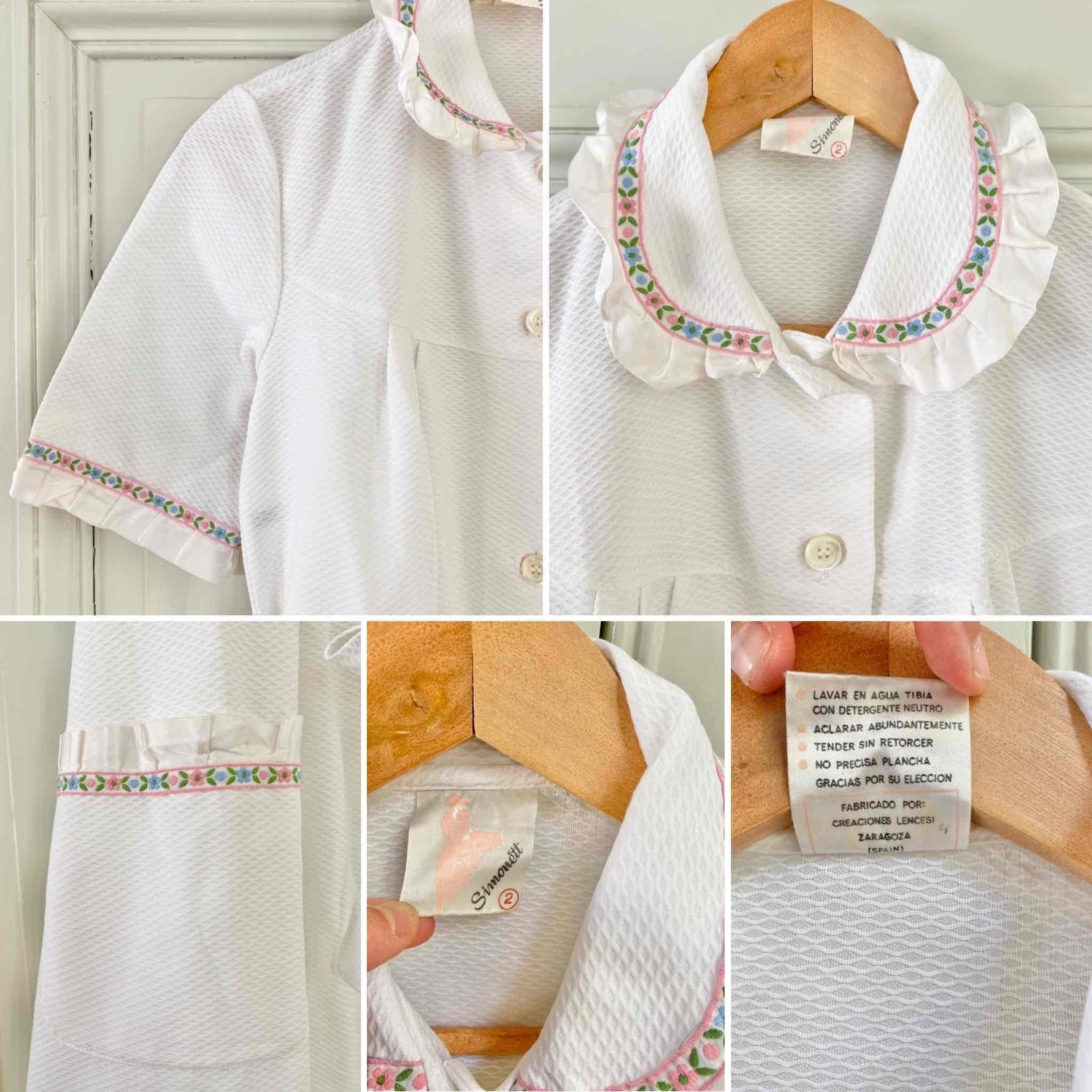 Prix unitaire parRobe Chemise Brodée en piqué de coton, galon brodé à fleurs bleue, roses et vert pastel layette, petits volants en satin, ceinture a nouer, boutonnée, fabriquée en Espagne, esprit Lingerie. Aisselles 44cm