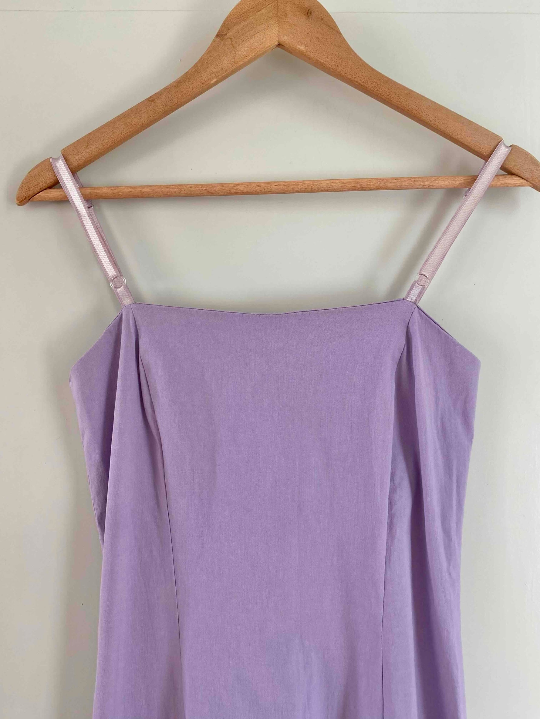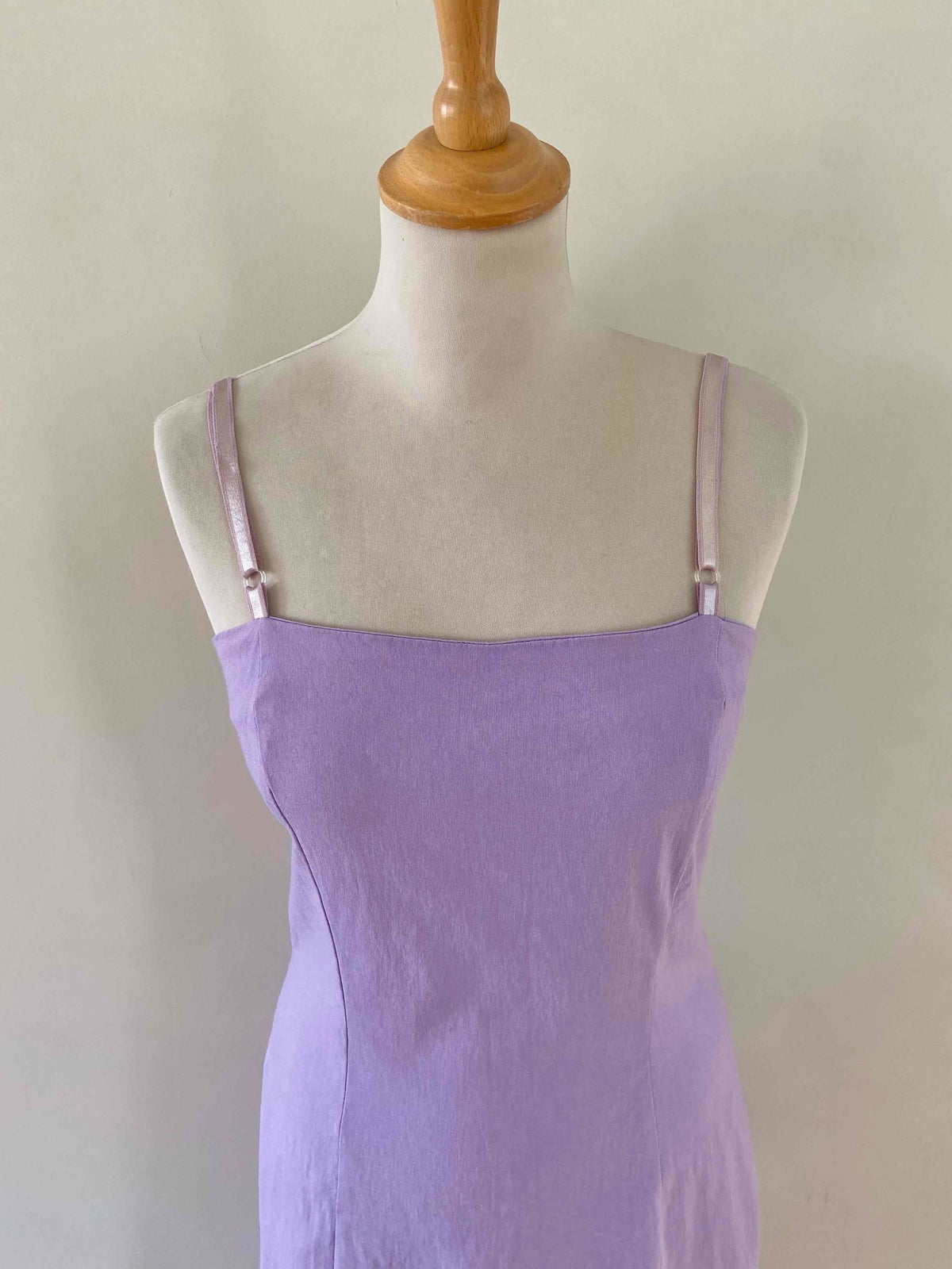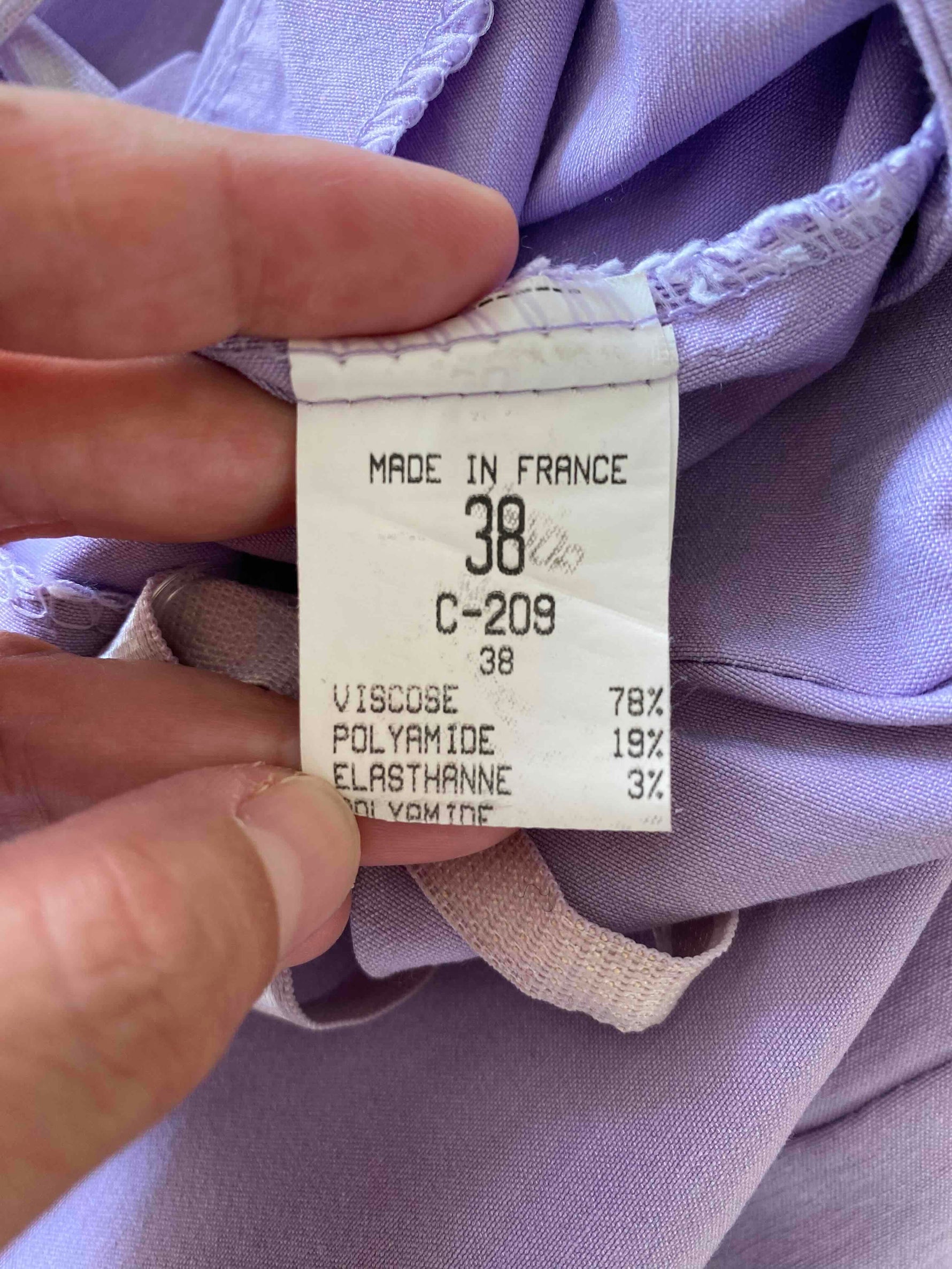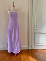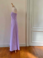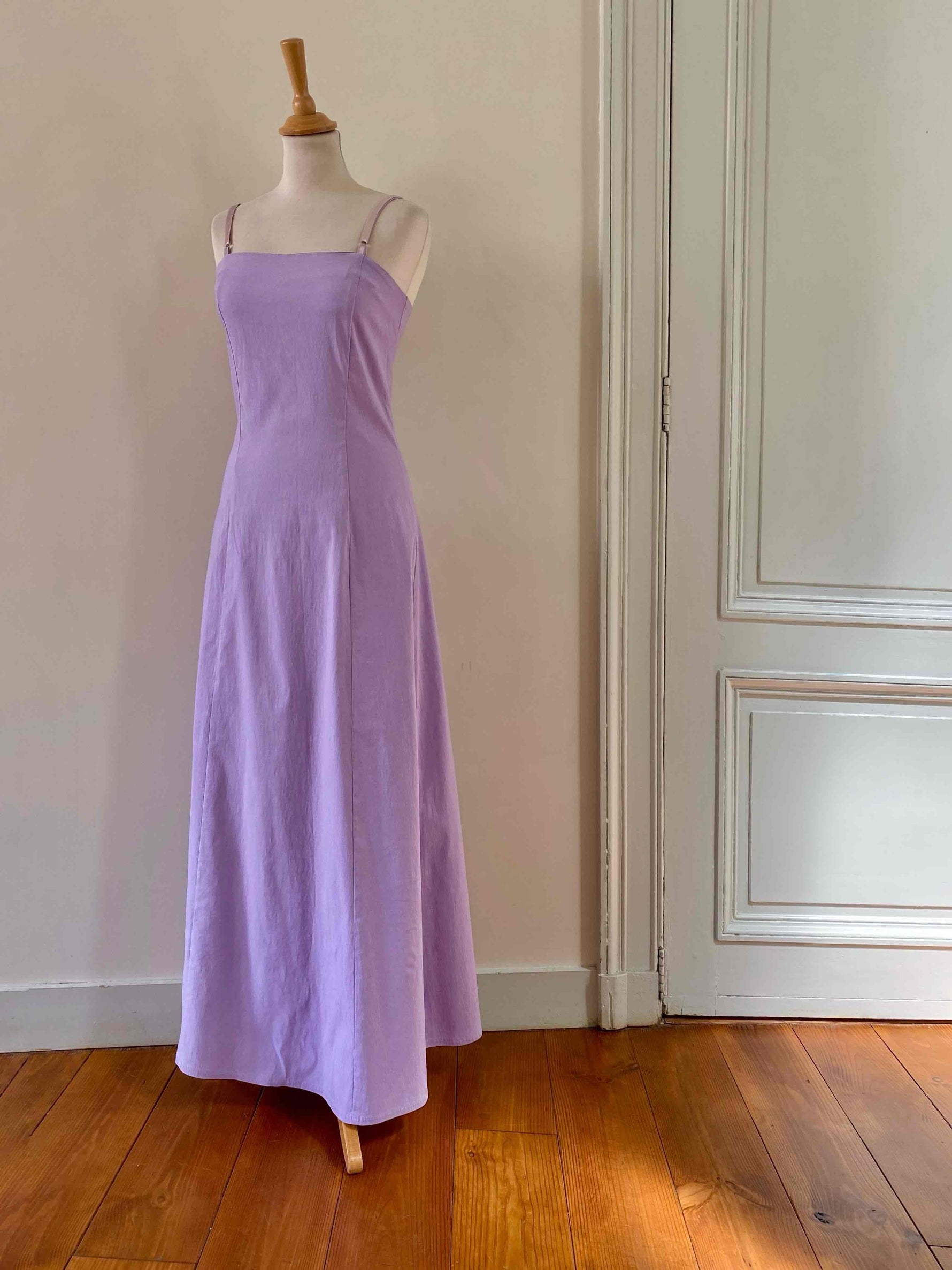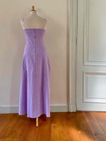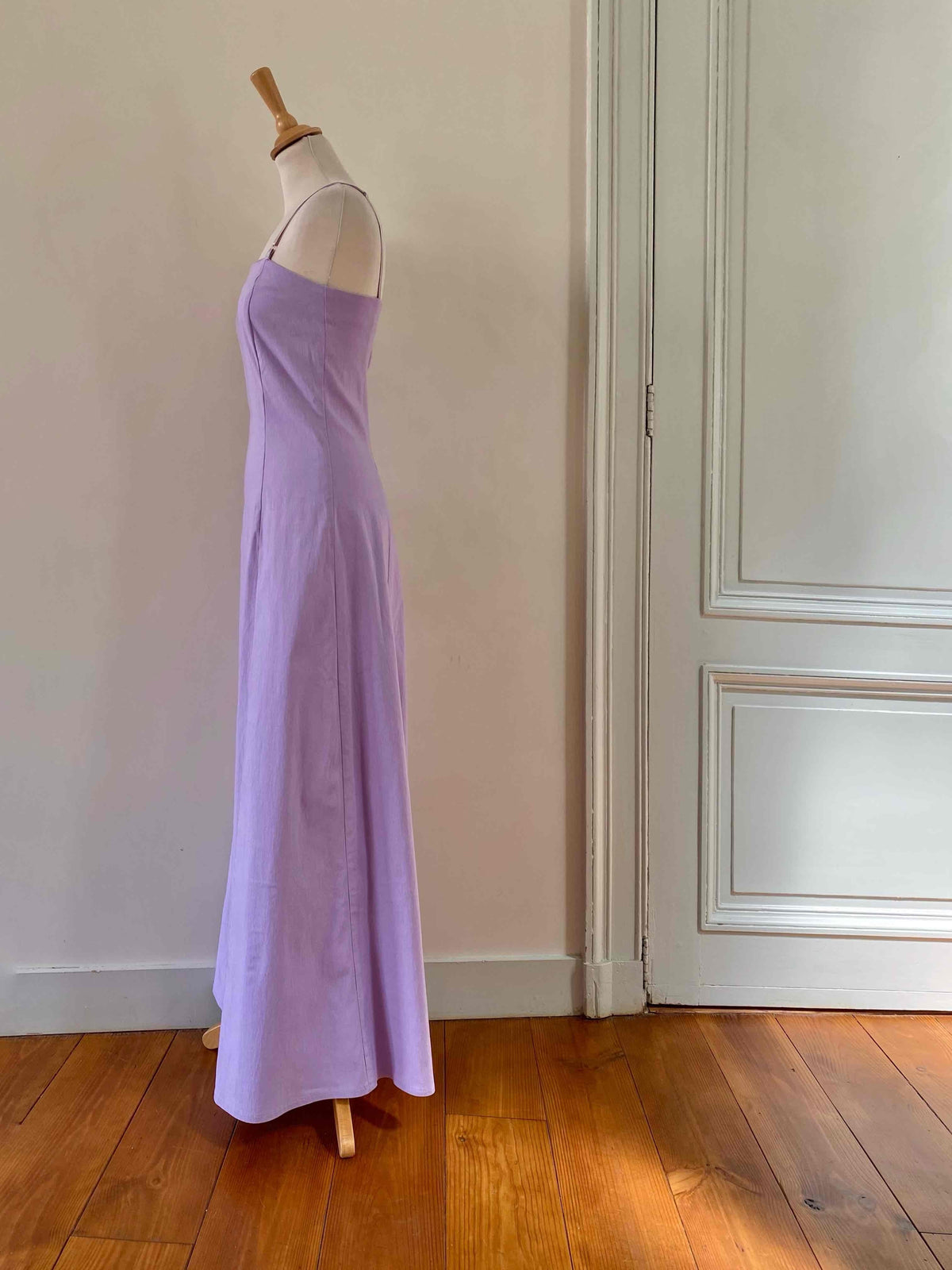 Prix unitaire parRobe longue bustier, en viscose et élasthanne lilas, matière gainante, bretelles élastiques réglables, fermeture éclaire au dos, bas évasé, fabriquée en France, taille 36 actuelle portée ici sur un mannequin T36, aisselles 43cm.